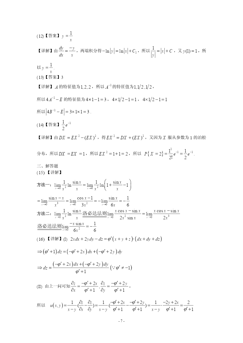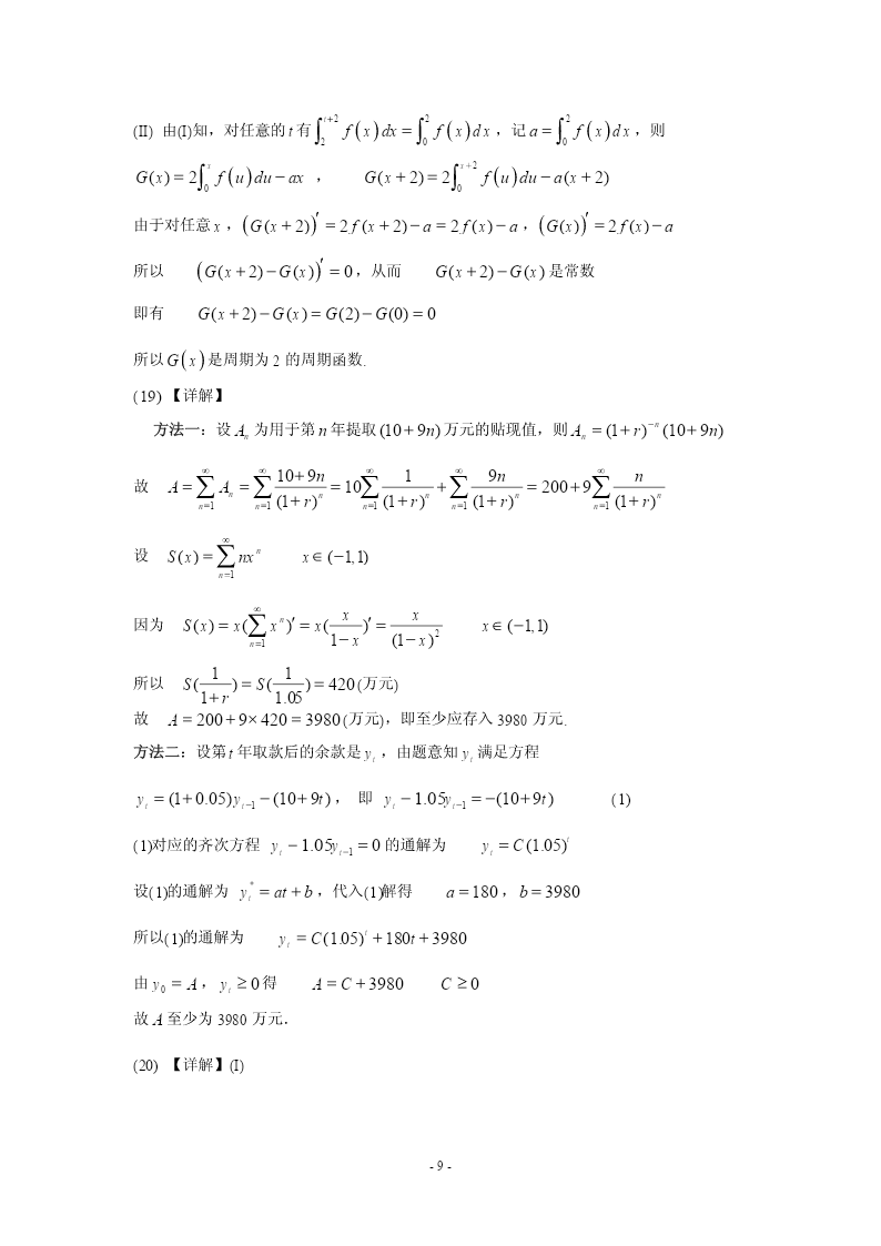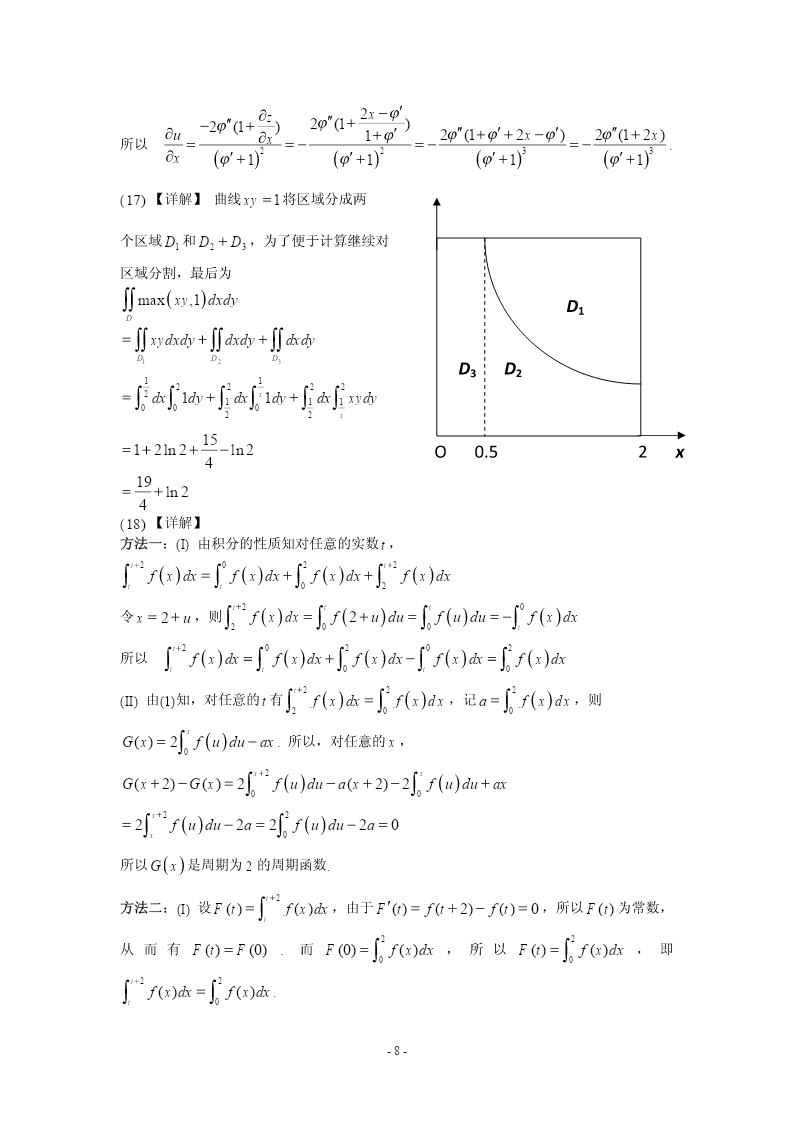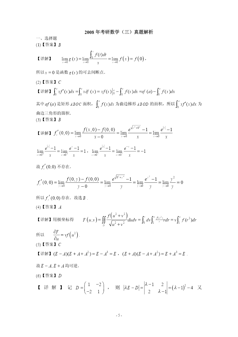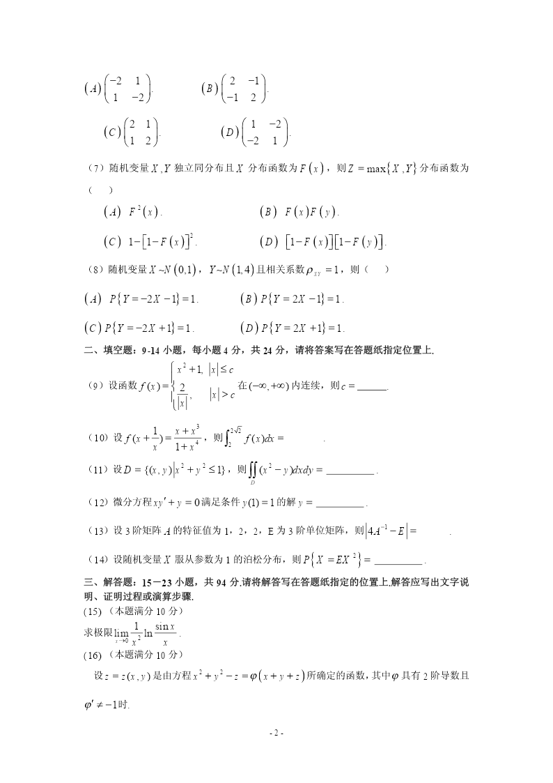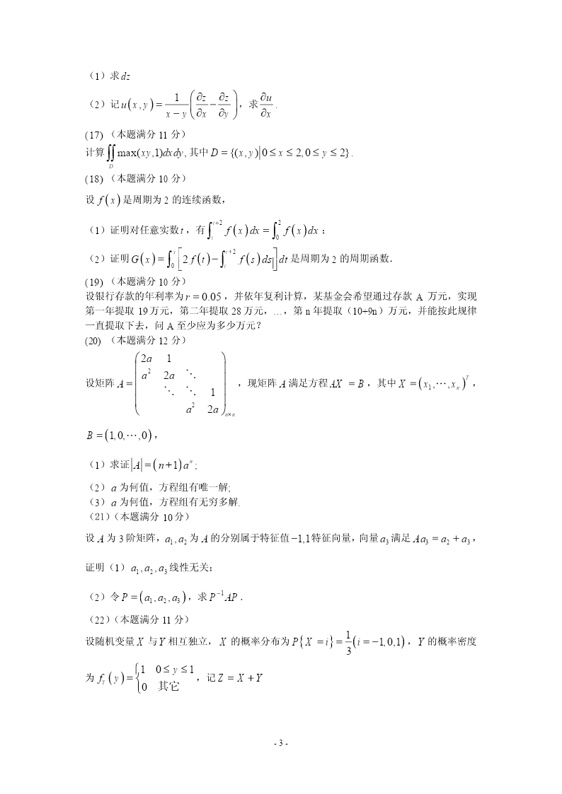 2008年全国硕士研究生入学统一考试数学三试题一、选择题:1~8小题,每小题4分,共32分,下列每小题给出的四个选项中,只有一项符合题目要求,把所选项前的字母填在题后的括号内.xf()tdt0(1)设函数f()x在区间[1,1]上连续,则x0是函数g()x的()xA跳跃间断点.B可去间断点.C无穷间断点.D振荡间断点.(2)曲线段方程为yf()x,函数f()x在区间[0,a]上有连续的导数,则定积分aaft()xdx等于()0A曲边梯形ABCD面积.B梯形ABCD面积.C曲边三角形ACD面积.D三角形ACD面积.24(3)已知f(,)xyexy,则(A)fx(0,0),fy(0,0)都存在(B)fx(0,0)不存在,fy(0,0)存在(C)fx(0,0)不存在,fy(0,0)不存在(D)fx(0,0),fy(0,0)都不存在f()x2y2F(4)设函数f连续,若f(,)uvdxdy,其中D为图中阴影部分,则22uvuDuvxy()vv(A)vf()u2(B)f()u2(C)vf()u(D)f()uuu(5)设A为阶非0矩阵E为阶单位矩阵若A30,则()AEA不可逆,EA不可逆.BEA不可逆,EA可逆.CEA可逆,EA可逆.DEA可逆,EA不可逆.12(6)设A则在实数域上域与A合同矩阵为()21-1-2121A.B.12122112C.D.1221(7)随机变量XY,独立同分布且X分布函数为Fx,则ZXYmax,分布函数为()AF2x.BFxFy.2C11Fx.D1Fx1Fy.(8)随机变量XN~0,1,YN~1,4且相关系数XY1,则()APYX211.BPYX211.CPYX211.DPYX211.二、填空题:9-14小题,每小题4分,共24分,请将答案写在答题纸指定位置上.x21,xc(9)设函数f()x2在(,)内连续,则c.,xcx31xx22(10)设f()x,则f(x)dx______.x1x42(11)设D{(x,y)x2y21},则()x2ydxdy.D(12)微分方程xyy0满足条件y(1)1的解y.(13)设3阶矩阵A的特征值为1,2,2,E为3阶单位矩阵,则4AE1_____.(14)设随机变量X服从参数为1的泊松分布,则PXEX2.三、解答题:15-23小题,共94分.请将解答写在答题纸指定的位置上.解答应写出文字说明、证明过程或演算步骤.(15)(本题满分10分)1sinx求极限limln.x0x2x(16)(本题满分10分)设zz(,)xy是由方程x2y2zxyz所确定的函数,其中具有2阶导数且1时.-2-(1)求dz1zzu(2)记ux,y,求.xyxyx(17)(本题满分11分)计算max(xy,1)dxdy,其中D{(x,y)0x2,0y2}.D(18)(本题满分10分)设fx是周期为2的连续函数,t22(1)证明对任意实数t,有fxdxfxdx;t0xt2(2)证明Gx2ftfsdsdt是周期为2的周期函数.0t(19)(本题满分10分)设银行存款的年利率为r0.05,并依年复利计算,某基金会希望通过存款A万元,实现第一年提取19万元,第二年提取28万元,…,第n年提取(10+9n)万元,并能按此规律一直提取下去,问A至少应为多少万元?(20)(本题满分12分)2a12a2aT设矩阵,现矩阵满足方程,其中,AAAXBXx1,,xn12a2annB1,0,,0,(1)求证An1an;(2)a为何值,方程组有唯一解;(3)a为何值,方程组有无穷多解.(21)(本题满分10分)