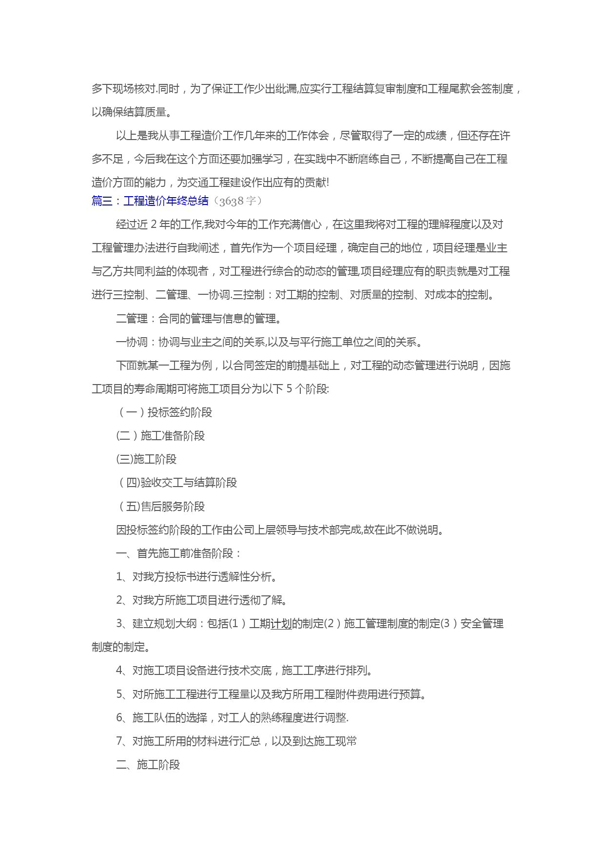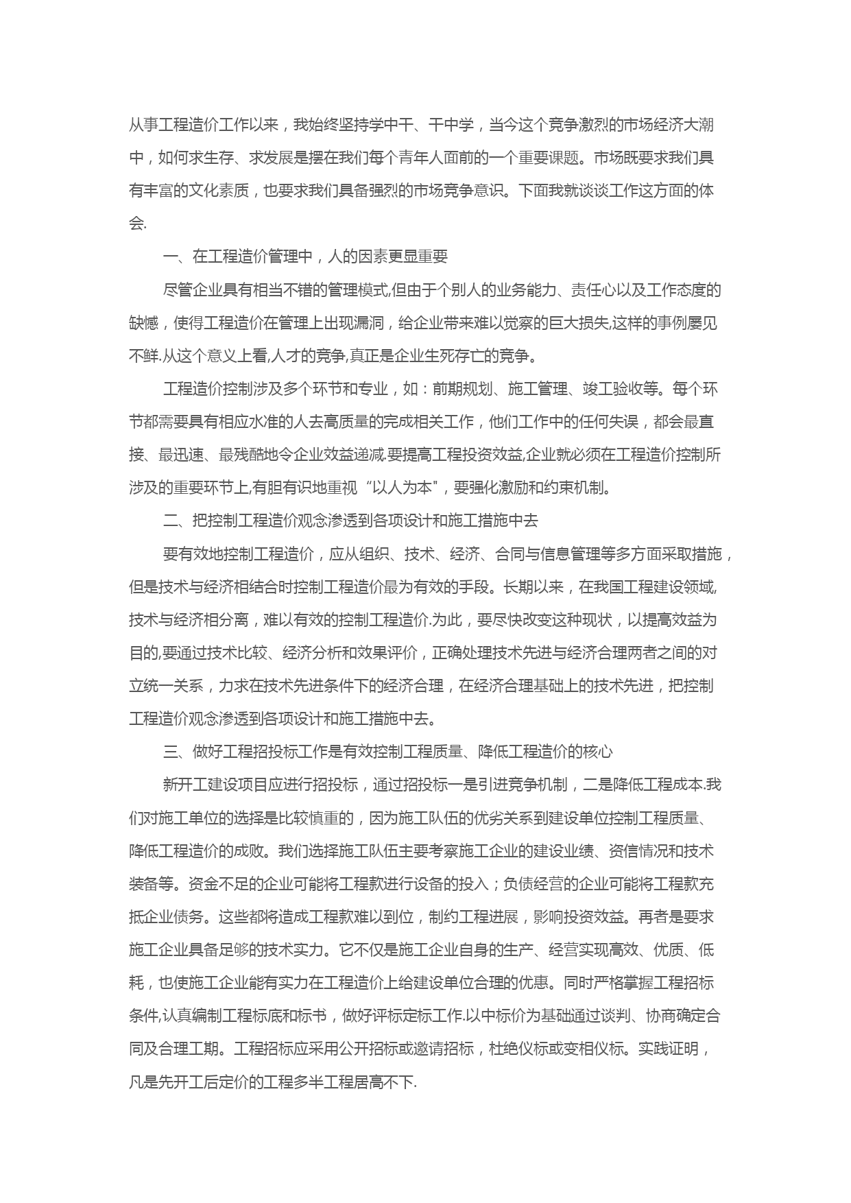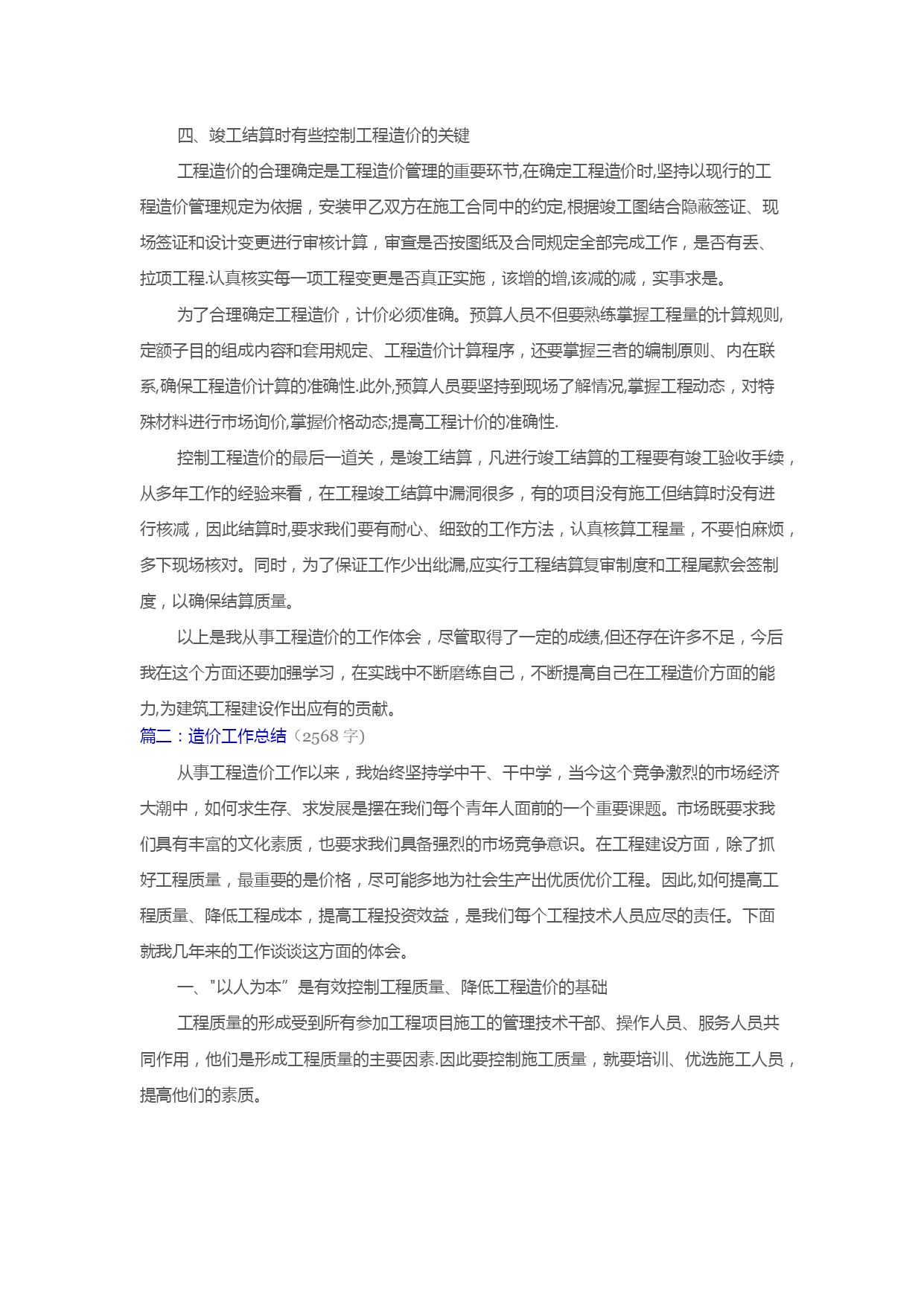 预算工作总结实用文档(实用文档,可以直接使用,可编辑优秀版资料,欢迎下载)从事工程造价工作以来,我始终坚持学中干、干中学,当今这个竞争激烈的市场经济大潮中,如何求生存、求发展是摆在我们每个青年人面前的一个重要课题。市场既要求我们具有丰富的文化素质,也要求我们具备强烈的市场竞争意识。下面我就谈谈工作这方面的体会.一、在工程造价管理中,人的因素更显重要尽管企业具有相当不错的管理模式,但由于个别人的业务能力、责任心以及工作态度的缺憾,使得工程造价在管理上出现漏洞,给企业带来难以觉察的巨大损失,这样的事例屡见不鲜.从这个意义上看,人才的竞争,真正是企业生死存亡的竞争。工程造价控制涉及多个环节和专业,如:前期规划、施工管理、竣工验收等。每个环节都需要具有相应水准的人去高质量的完成相关工作,他们工作中的任何失误,都会最直接、最迅速、最残酷地令企业效益递减.要提高工程投资效益,企业就必须在工程造价控制所涉及的重要环节上,有胆有识地重视“以人为本",要强化激励和约束机制。二、把控制工程造价观念渗透到各项设计和施工措施中去要有效地控制工程造价,应从组织、技术、经济、合同与信息管理等多方面采取措施,但是技术与经济相结合时控制工程造价最为有效的手段。长期以来,在我国工程建设领域,技术与经济相分离,难以有效的控制工程造价.为此,要尽快改变这种现状,以提高效益为目的,要通过技术比较、经济分析和效果评价,正确处理技术先进与经济合理两者之间的对立统一关系,力求在技术先进条件下的经济合理,在经济合理基础上的技术先进,把控制工程造价观念渗透到各项设计和施工措施中去。三、做好工程招投标工作是有效控制工程质量、降低工程造价的核心新开工建设项目应进行招投标,通过招投标一是引进竞争机制,二是降低工程成本.我们对施工单位的选择是比较慎重的,因为施工队伍的优劣关系到建设单位控制工程质量、降低工程造价的成败。我们选择施工队伍主要考察施工企业的建设业绩、资信情况和技术装备等。资金不足的企业可能将工程款进行设备的投入;负债经营的企业可能将工程款充抵企业债务。这些都将造成工程款难以到位,制约工程进展,影响投资效益。再者是要求施工企业具备足够的技术实力。它不仅是施工企业自身的生产、经营实现高效、优质、低耗,也使施工企业能有实力在工程造价上给建设单位合理的优惠。同时严格掌握工程招标条件,认真编制工程标底和标书,做好评标定标工作.以中标价为基础通过谈判、协商确定合同及合理工期。工程招标应采用公开招标或邀请招标,杜绝仪标或变相仪标。实践证明,凡是先开工后定价的工程多半工程居高不下.四、竣工结算时有些控制工程造价的关键工程造价的合理确定是工程造价管理的重要环节,在确定工程造价时,坚持以现行的工程造价管理规定为依据,安装甲乙双方在施工合同中的约定,根据竣工图结合隐蔽签证、现场签证和设计变更进行审核计算,审查是否按图纸及合同规定全部完成工作,是否有丢、拉项工程.认真核实每一项工程变更是否真正实施,该增的增,该减的减,实事求是。为了合理确定工程造价,计价必须准确。预算人员不但要熟练掌握工程量的计算规则,定额子目的组成内容和套用规定、工程造价计算程序,还要掌握三者的编制原则、内在联系,确保工程造价计算的准确性.此外,预算人员要坚持到现场了解情况,掌握工程动态,对特殊材料进行市场询价,掌握价格动态;提高工程计价的准确性.控制工程造价的最后一道关,是竣工结算,凡进行竣工结算的工程要有竣工验收手续,从多年工作的经验来看,在工程竣工结算中漏洞很多,有的项目没有施工但结算时没有进行核减,因此结算时,要求我们要有耐心、细致的工作方法,认真核算工程量,不要怕麻烦,多下现场核对。同时,为了保证工作少出纰漏,应实行工程结算复审制度和工程尾款会签制度,以确保结算质量。以上是我从事工程造价的工作体会,尽管取得了一定的成绩,但还存在许多不足,今后我在这个方面还要加强学习,在实践中不断磨练自己,不断提高自己在工程造价方面的能力,为建筑工程建设作出应有的贡献。篇二:造价工作总结(2568字)从事工程造价工作以来,我始终坚持学中干、干中学,当今这个竞争激烈的市场经济大潮中,如何求生存、求发展是摆在我们每个青年人面前的一个重要课题。市场既要求我们具有丰富的文化素质,也要求我们具备强烈的市场竞争意识。在工程建设方面,除了抓好工程质量,最重要的是价格,尽可能多地为社会生产出优质优价工程。因此,如何提高工程质量、降低工程成本,提高工程投资效益,是我们每个工程技术人员应尽的责任。下面就我几年来的工作谈谈这方面的体会。一、"以人为本”是有效控制工程质量、降低工程造价的基础工程质量的形成受到所有参加工程项目施工的管理技术干部、操作人员、服务人员共同作用,他们是形成工程质量的主要因素.因此要控制施工质量,就