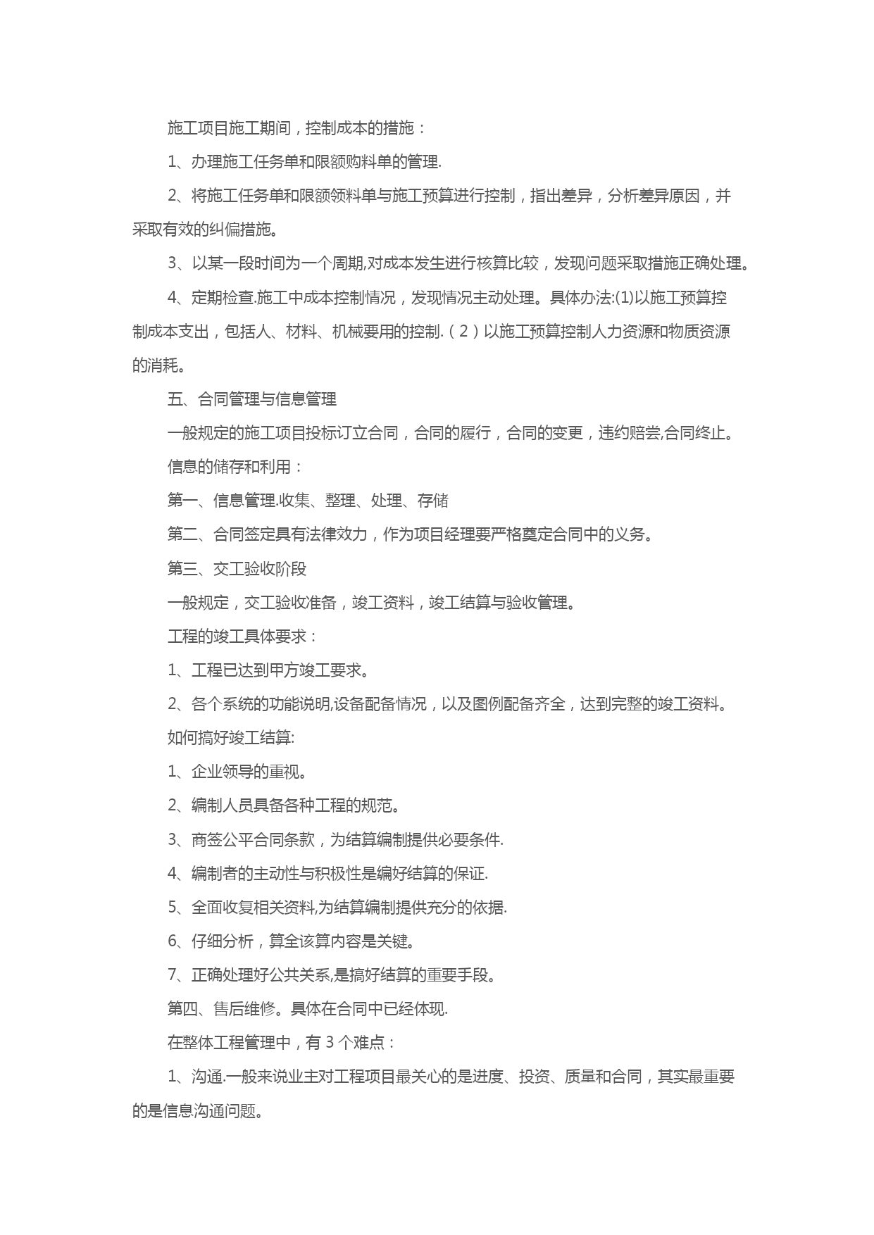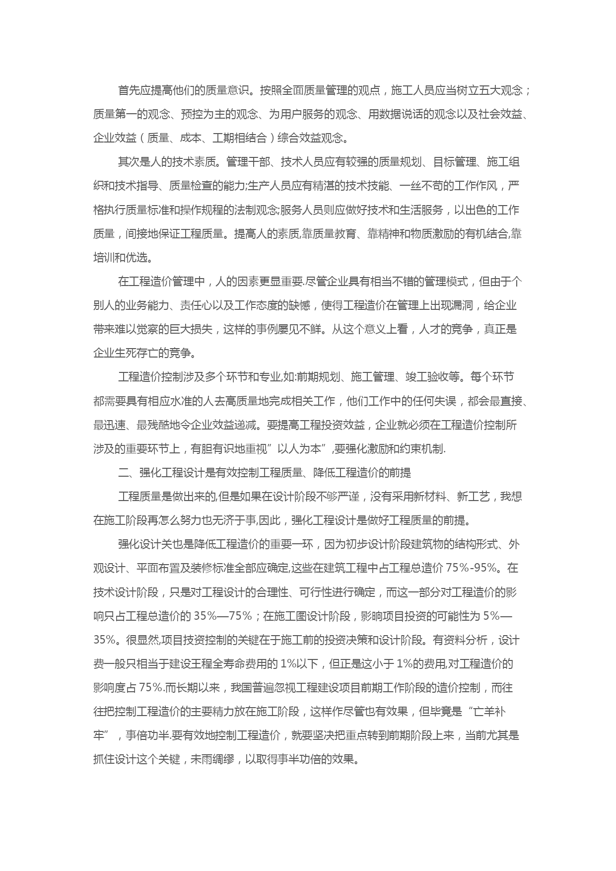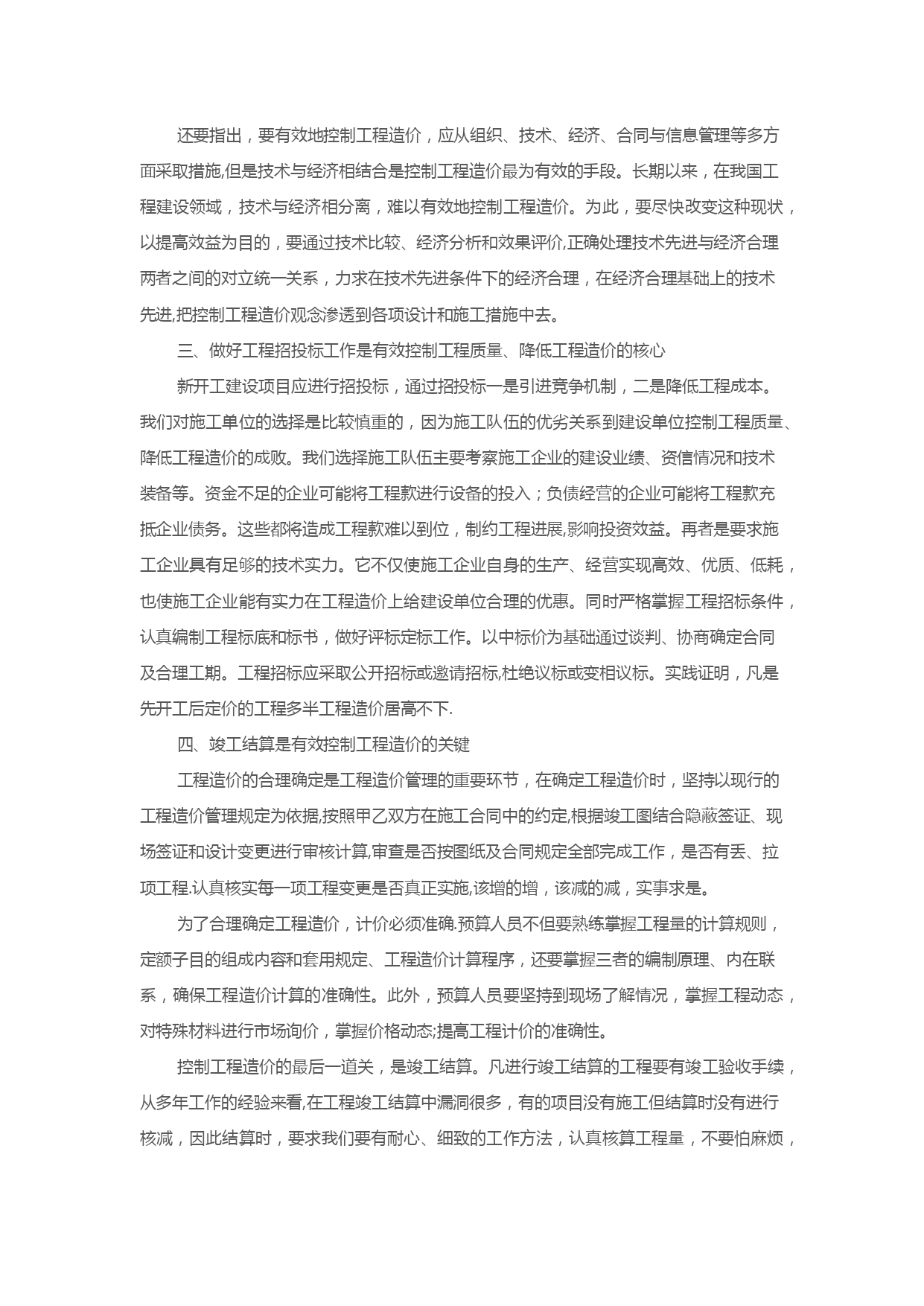 预算工作总结实用文档(实用文档,可以直接使用,可编辑优秀版资料,欢迎下载)从事工程造价工作以来,我始终坚持学中干、干中学,当今这个竞争激烈的市场经济大潮中,如何求生存、求发展是摆在我们每个青年人面前的一个重要课题。市场既要求我们具有丰富的文化素质,也要求我们具备强烈的市场竞争意识。下面我就谈谈工作这方面的体会.一、在工程造价管理中,人的因素更显重要尽管企业具有相当不错的管理模式,但由于个别人的业务能力、责任心以及工作态度的缺憾,使得工程造价在管理上出现漏洞,给企业带来难以觉察的巨大损失,这样的事例屡见不鲜.从这个意义上看,人才的竞争,真正是企业生死存亡的竞争。工程造价控制涉及多个环节和专业,如:前期规划、施工管理、竣工验收等。每个环节都需要具有相应水准的人去高质量的完成相关工作,他们工作中的任何失误,都会最直接、最迅速、最残酷地令企业效益递减.要提高工程投资效益,企业就必须在工程造价控制所涉及的重要环节上,有胆有识地重视“以人为本",要强化激励和约束机制。二、把控制工程造价观念渗透到各项设计和施工措施中去要有效地控制工程造价,应从组织、技术、经济、合同与信息管理等多方面采取措施,但是技术与经济相结合时控制工程造价最为有效的手段。长期以来,在我国工程建设领域,技术与经济相分离,难以有效的控制工程造价.为此,要尽快改变这种现状,以提高效益为目的,要通过技术比较、经济分析和效果评价,正确处理技术先进与经济合理两者之间的对立统一关系,力求在技术先进条件下的经济合理,在经济合理基础上的技术先进,把控制工程造价观念渗透到各项设计和施工措施中去。三、做好工程招投标工作是有效控制工程质量、降低工程造价的核心新开工建设项目应进行招投标,通过招投标一是引进竞争机制,二是降低工程成本.我们对施工单位的选择是比较慎重的,因为施工队伍的优劣关系到建设单位控制工程质量、降低工程造价的成败。我们选择施工队伍主要考察施工企业的建设业绩、资信情况和技术装备等。资金不足的企业可能将工程款进行设备的投入;负债经营的企业可能将工程款充抵企业债务。这些都将造成工程款难以到位,制约工程进展,影响投资效益。再者是要求施工企业具备足够的技术实力。它不仅是施工企业自身的生产、经营实现高效、优质、低耗,也使施工企业能有实力在工程造价上给建设单位合理的优惠。同时严格掌握工程招标条件,认真编制工程标底和标书,做好评标定标工作.以中标价为基础通过谈判、协商确定合同及合理工期。工程招标应采用公开招标或邀请招标,杜绝仪标或变相仪标。实践证明,凡是先开工后定价的工程多半工程居高不下.四、竣工结算时有些控制工程造价的关键工程造价的合理确定是工程造价管理的重要环节,在确定工程造价时,坚持以现行的工程造价管理规定为依据,安装甲乙双方在施工合同中的约定,根据竣工图结合隐蔽签证、现场签证和设计变更进行审核计算,审查是否按图纸及合同规定全部完成工作,是否有丢、拉项工程.认真核实每一项工程变更是否真正实施,该增的增,该减的减,实事求是。为了合理确定工程造价,计价必须准确。预算人员不但要熟练掌握工程量的计算规则,定额子目的组成内容和套用规定、工程造价计算程序,还要掌握三者的编制原则、内在联系,确保工程造价计算的准确性.此外,预算人员要坚持到现场了解情况,掌握工程动态,对特殊材料进行市场询价,掌握价格动态;提高工程计价的准确性.控制工程造价的最后一道关,是竣工结算,凡进行竣工结算的工程要有竣工验收手续,从多年工作的经验来看,在工程竣工结算中漏洞很多,有的项目没有施工但结算时没有进行核减,因此结算时,要求我们要有耐心、细致的工作方法,认真核算工程量,不要怕麻烦,多下现场核对。同时,为了保证工作少出纰漏,应实行工程结算复审制度和工程尾款会签制度,以确保结算质量。以上是我从事工程造价的工作体会,尽管取得了一定的成绩,但还存在许多不足,今后我在这个方面还要加强学习,在实践中不断磨练自己,不断提高自己在工程造价方面的能力,为建筑工程建设作出应有的贡献。篇二:造价工作总结(2568字)从事工程造价工作以来,我始终坚持学中干、干中学,当今这个竞争激烈的市场经济大潮中,如何求生存、求发展是摆在我们每个青年人面前的一个重要课题。市场既要求我们具有丰富的文化素质,也要求我们具备强烈的市场竞争意识。在工程建设方面,除了抓好工程质量,最重要的是价格,尽可能多地为社会生产出优质优价工程。因此,如何提高工程质量、降低工程成本,提高工程投资效益,是我们每个工程技术人员应尽的责任。下面就我几年来的工作谈谈这方面的体会。一、"以人为本”是有效控制工程质量、降低工程造价的基础工程质量的形成受到所有参加工程项目施工的管理技术干部、操作人员、服务人员共同作用,他们是形成工程质量的主要因素.因此要控制施工质量,就