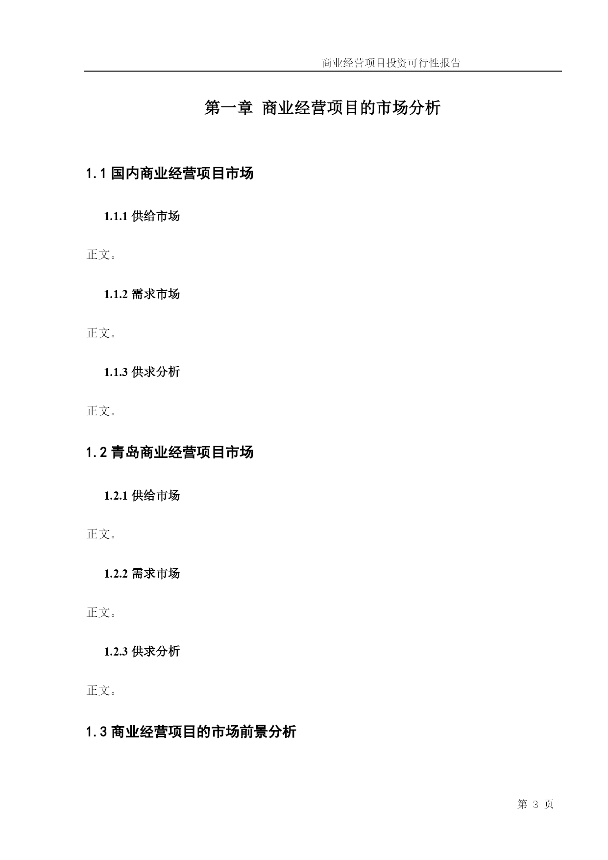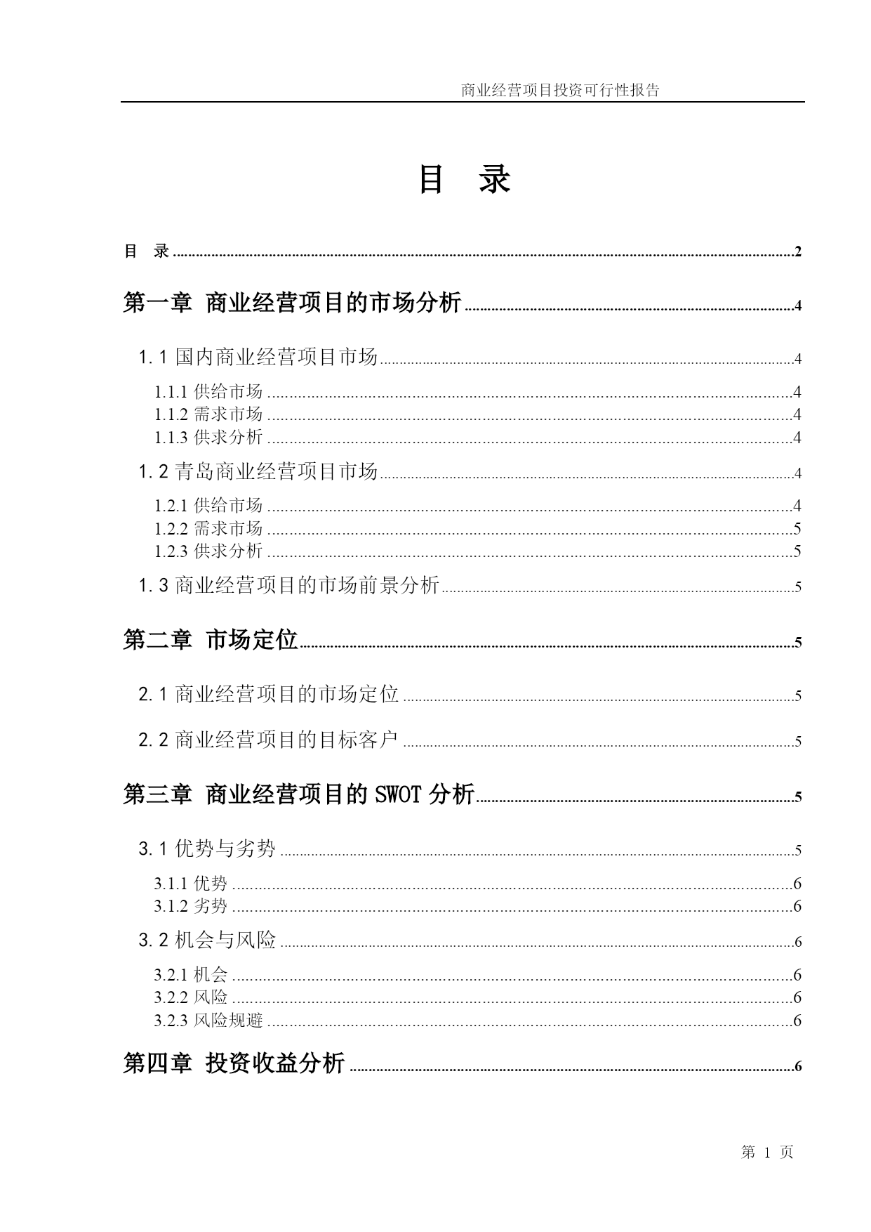 商业经营项目投资可行性报告PAGE第PAGE9页共NUMPAGES10页第PAGE9页范本,范文,模板,管理工具下载商业经营项目投资可行性报告(模板)目录TOC\o"1-3"\h\zHYPERLINK\l"_Toc56055326"目录PAGEREF_Toc56055326\h2HYPERLINK\l"_Toc56055327"第一章商业经营项目的市场分析PAGEREF_Toc56055327\h4HYPERLINK\l"_Toc56055328"1.1国内商业经营项目市场PAGEREF_Toc56055328\h4HYPERLINK\l"_Toc56055329"1.1.1供给市场PAGEREF_Toc56055329\h4HYPERLINK\l"_Toc56055330"1.1.2需求市场PAGEREF_Toc56055330\h4HYPERLINK\l"_Toc56055331"1.1.3供求分析PAGEREF_Toc56055331\h4HYPERLINK\l"_Toc56055332"1.2青岛商业经营项目市场PAGEREF_Toc56055332\h4HYPERLINK\l"_Toc56055333"1.2.1供给市场PAGEREF_Toc56055333\h4HYPERLINK\l"_Toc56055334"1.2.2需求市场PAGEREF_Toc56055334\h5HYPERLINK\l"_Toc56055335"1.2.3供求分析PAGEREF_Toc56055335\h5HYPERLINK\l"_Toc56055336"1.3商业经营项目的市场前景分析PAGEREF_Toc56055336\h5HYPERLINK\l"_Toc56055337"第二章市场定位PAGEREF_Toc56055337\h5HYPERLINK\l"_Toc56055338"2.1商业经营项目的市场定位PAGEREF_Toc56055338\h5HYPERLINK\l"_Toc56055339"2.2商业经营项目的目标客户PAGEREF_Toc56055339\h5HYPERLINK\l"_Toc56055340"第三章商业经营项目的SWOT分析PAGEREF_Toc56055340\h5HYPERLINK\l"_Toc56055341"3.1优势与劣势PAGEREF_Toc56055341\h5HYPERLINK\l"_Toc56055342"3.1.1优势PAGEREF_Toc56055342\h6HYPERLINK\l"_Toc56055343"3.1.2劣势PAGEREF_Toc56055343\h6HYPERLINK\l"_Toc56055344"3.2机会与风险PAGEREF_Toc56055344\h6HYPERLINK\l"_Toc56055345"3.2.1机会PAGEREF_Toc56055345\h6HYPERLINK\l"_Toc56055346"3.2.2风险PAGEREF_Toc56055346\h6HYPERLINK\l"_Toc56055347"3.2.3风险规避PAGEREF_Toc56055347\h6HYPERLINK\l"_Toc56055348"第四章投资收益分析PAGEREF_Toc56055348\h6HYPERLINK\l"_Toc56055349"第五章商业经营项目规划PAGEREF_Toc56055349\h7HYPERLINK\l"_Toc56055350"5.1选址PAGEREF_Toc56055350\h7HYPERLINK\l"_Toc56055351"5.1.1选址要求PAGEREF_Toc56055351\h7HYPERLINK\l"_Toc56055352"5.1.2目标地址PAGEREF_Toc56055352\h7HYPERLINK\l"_Toc56055353"5.2视觉识别系统PAGEREF_Toc56055353\h7HYPERLINK\l"_Toc56055354"5.2.1店面及大堂布置PAGEREF_Toc56055354\h