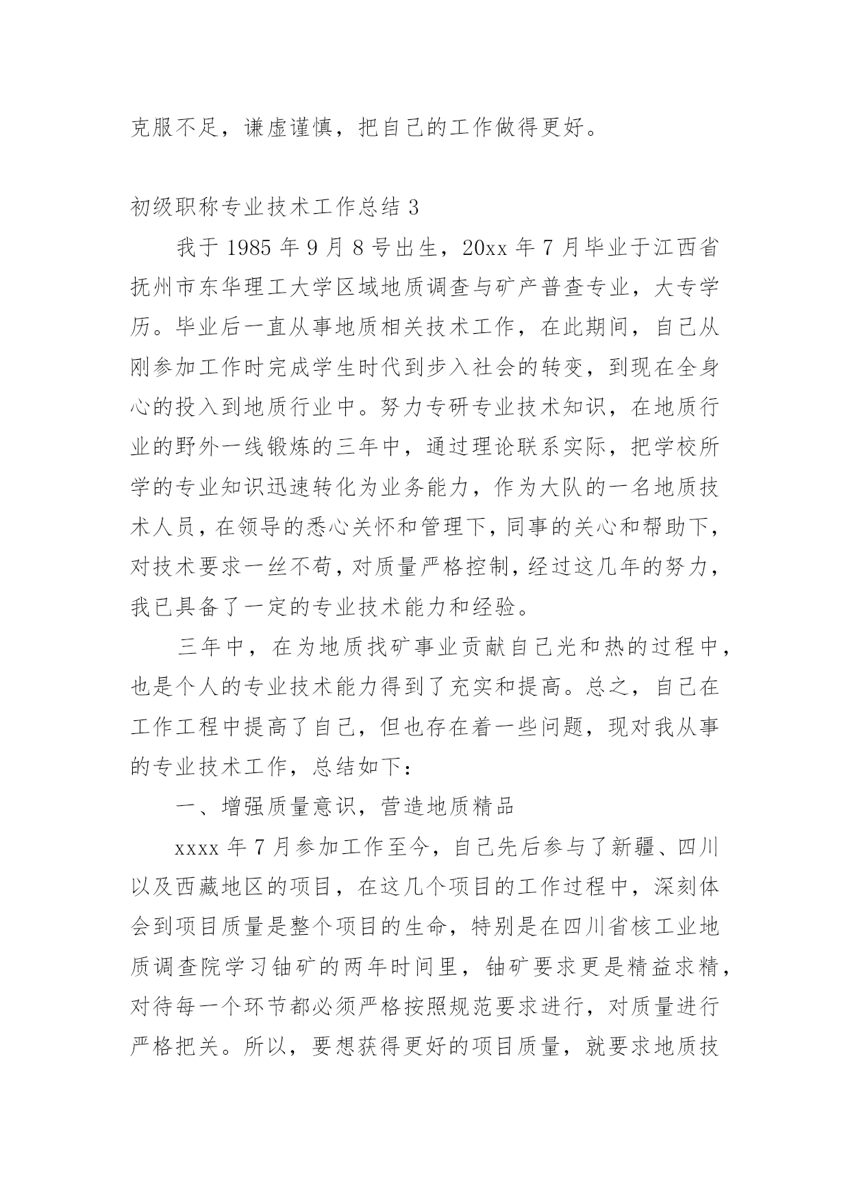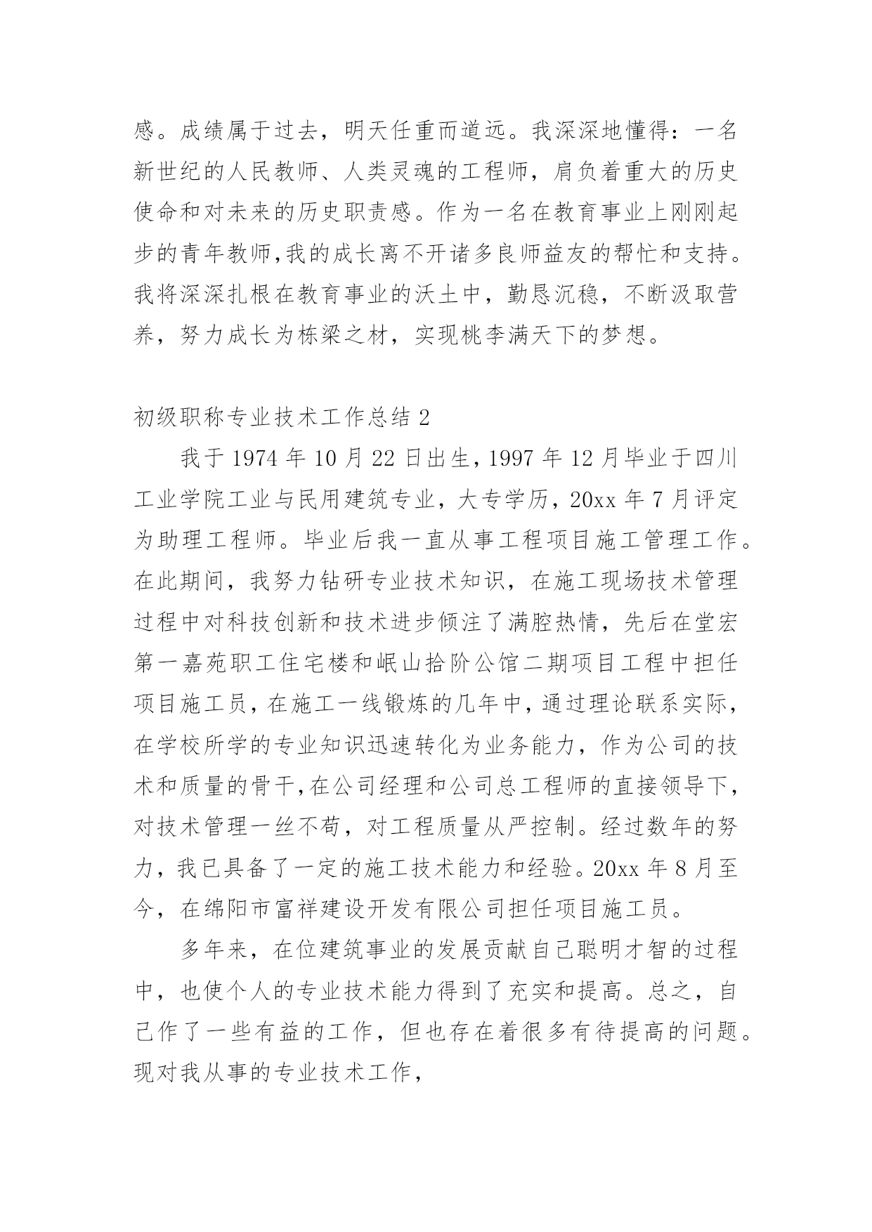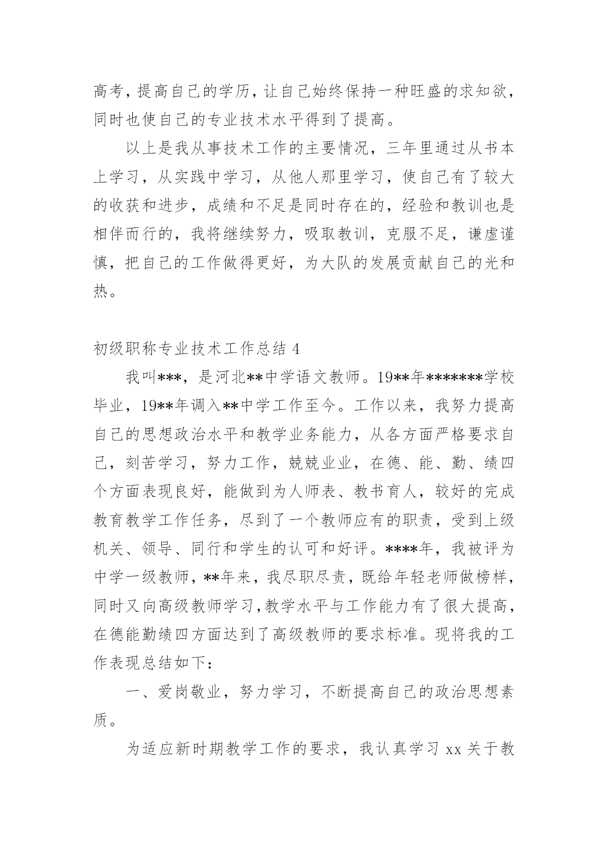 初级职称专业技术工作总结初级职称专业技术工作总结11篇总结在一个时期、一个年度、一个阶段对学习和工作生活等情况加以回顾和分析的一种书面材料,它能使我们及时找出错误并改正,是时候写一份总结了。那么如何把总结写出新花样呢?下面是小编精心整理的初级职称专业技术工作总结,供大家参考借鉴,希望可以帮助到有需要的朋友。初级职称专业技术工作总结1本人20xx年12月透过教师招聘考试,被分配到三合小学任教。在这一年半的教学中,我先在大井小学任教数学语文,因为学生少,年级多采用的是复式班教学法,后在学校领导的安排下到中心小学任教一年级数学,学前班语文。在学校领导、同事的帮忙下,我在自我的本职工作中取得了很大进步,现将任教以来的工作作出如下总结。一、用心追求思想进步,不断提高师德修养。本人思想上用心要求上进,热爱社会主义社会,热爱中国共产党,忠于党的教育事业,热爱学生,事业心强、职责心强,注重为人师表,用心提高自我的思想理论修养和专业学术修养。任职以来,服从学校安排,认真执行学校的各项制度。二、做好教育教学工作,努力提高教学质量。要提高教学质量,关键是上好课。为了上好课,我做了下方的工作:1、课前准备:备好课。2、认真钻研教材,对教材的基本思想、基本概念,每句话、每个字都弄清楚,了解教材的结构,重点与难点,掌握知识的逻辑,能运用自如,明白应补充哪些资料,怎样才能教好。3、了解学生原有的知识技能的质量,他们的兴趣、需要、方法、习惯,学习新知识可能会有哪些困难,采取相应的预防措施。4、思考教法,解决如何把已掌握的教材传授给学生,包括如何组织教材、如何安排每节课的活动。5、课堂上的状况。组织好课堂教学,关注全体学生,注意信息反馈,调动学生的有意注意,使其持续相对稳定性,同时,激发学生的情感,使他们产生愉悦的心境,创造良好的.课堂气氛,课堂语言简洁明了,克服了以前重复的毛病,课堂提问面向全体学生,注意引发学生学数学的兴趣,课堂上讲练结合,布置好家庭作业,作业少而精,减轻学生的负担。6、要提高教学质量,还要做好课后辅导工作,小学生爱动、好玩,缺乏自控潜力,常在学习上不能按时完成作业,有的学生抄袭作业,针对这种问题,就要抓好学生的思想教育,并使这一工作惯彻到对学生的学习指导中去,还要做好对学生学习的辅导和帮忙工作,尤其在后进生的转化上,对后进生努力做到从友善开始,比如,握握他的手,摸摸他的头,或帮忙整理衣服。从赞美着手,所有的人都渴望得到别人的理解和尊重,所以,和差生交谈时,对他的处境、想法表示深刻的理解和尊重。7、用心参与听课、评课,虚心向同行学习教学方法,博采众长,提高教学水平。8、热爱学生,平等的对待每一个学生,让他们都感受到老师的关心,良好的师生关系促进了学生的学习。三、做好班主任工作,培养新一代的人才。班主任工作是管理人的工作。班主任所应对的是朝气蓬勃,有思想,有感情,自我表现欲较强的学生群体。因此,班主任在工作中既要有宏观的群体管理,又要有微观的个性发展指导。在班级管理中,我也带领学生创造丰富多彩的班级文化,充分展示学生的一技之长,发展学生个性,培养学生才能。开展丰富多彩的活动,寓教于乐,使学生在活动中主动用心地自我发展。同时,活动为每一个学生带给思考、创造、表现及成功的机会。我还定期召开主题班会、组织知识竞赛、辩论赛、演讲赛。充分利用黑板报、设计表扬栏、展示栏等,让学生自我组织、自我管理、自我发展。透过丰富多彩的活动培养学生的实践潜力。四、任劳任怨,完成学校其他工作。我在工作之余,把自我在教学中反思、案例、收获等收集起来,并记录一些自我的工作过程、生活故事、思想历程,精选和积累了自我最为需要的信息资源,并用心与其他教师在博客上进行交流、讨论在教学中存在的问题。五、加强反思,及时总结教学得失。反思本学年的工作,在取得成绩的同时,也在思量着自我在工作中的不足。不足有以下几点:1、对数学教学的理论学习还不够深入,需要进行反思,教学水平提高速度缓慢。2、教育科研在教学实践中的应用还不到位,研究做得不够细和实,没到达自我心中的目标。3、数学教学中有特色、有创意的东西还不够多,今后还要努力找出一些自我在数学教学的特色点。4、工作的用心性不够高,主动性不够强,有惰性思想。这也有待于今后工作中的进一步改正和加强。六、继往开来,开创新的天地。鉴于自我在本学年的各方面表现以及在工作中存在的诸多不足,我今后的努力方向是:1、加强自身基本功的训练,个性是课堂教学潜力的训练。做到精讲精练,注重对学生潜力的培养。2、对后进生多些关心,多点爱心,再多一些耐心,使他们在各方面有更大进步。3、加强学生行为习惯方面的教育,使学生不仅仅在课堂上集中注意力学习,课下也要能严格约束自我。4、在教学上下功夫,努力使班级学生的成绩在原有的基础上有更大的进步。一份春华,一份秋实,在本学期