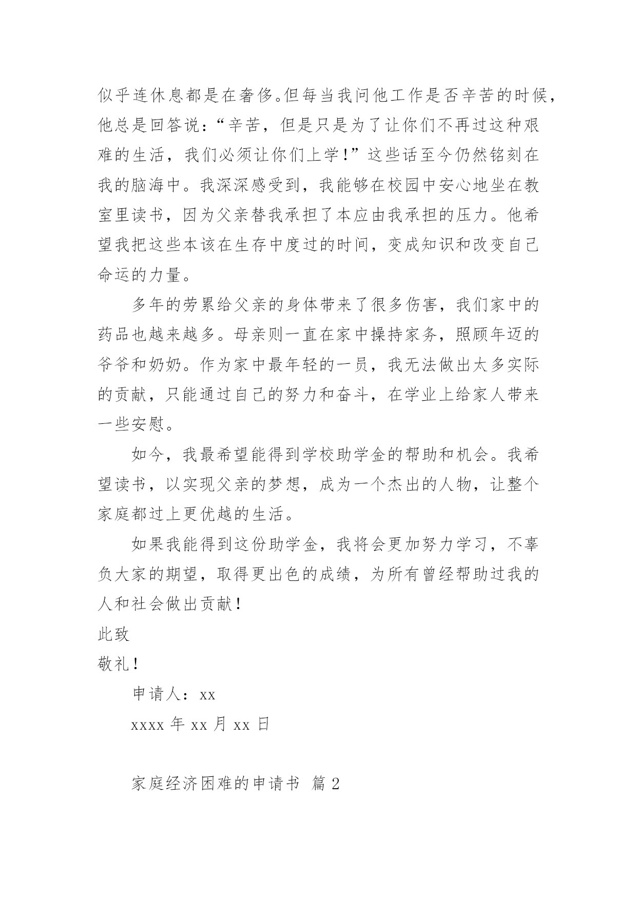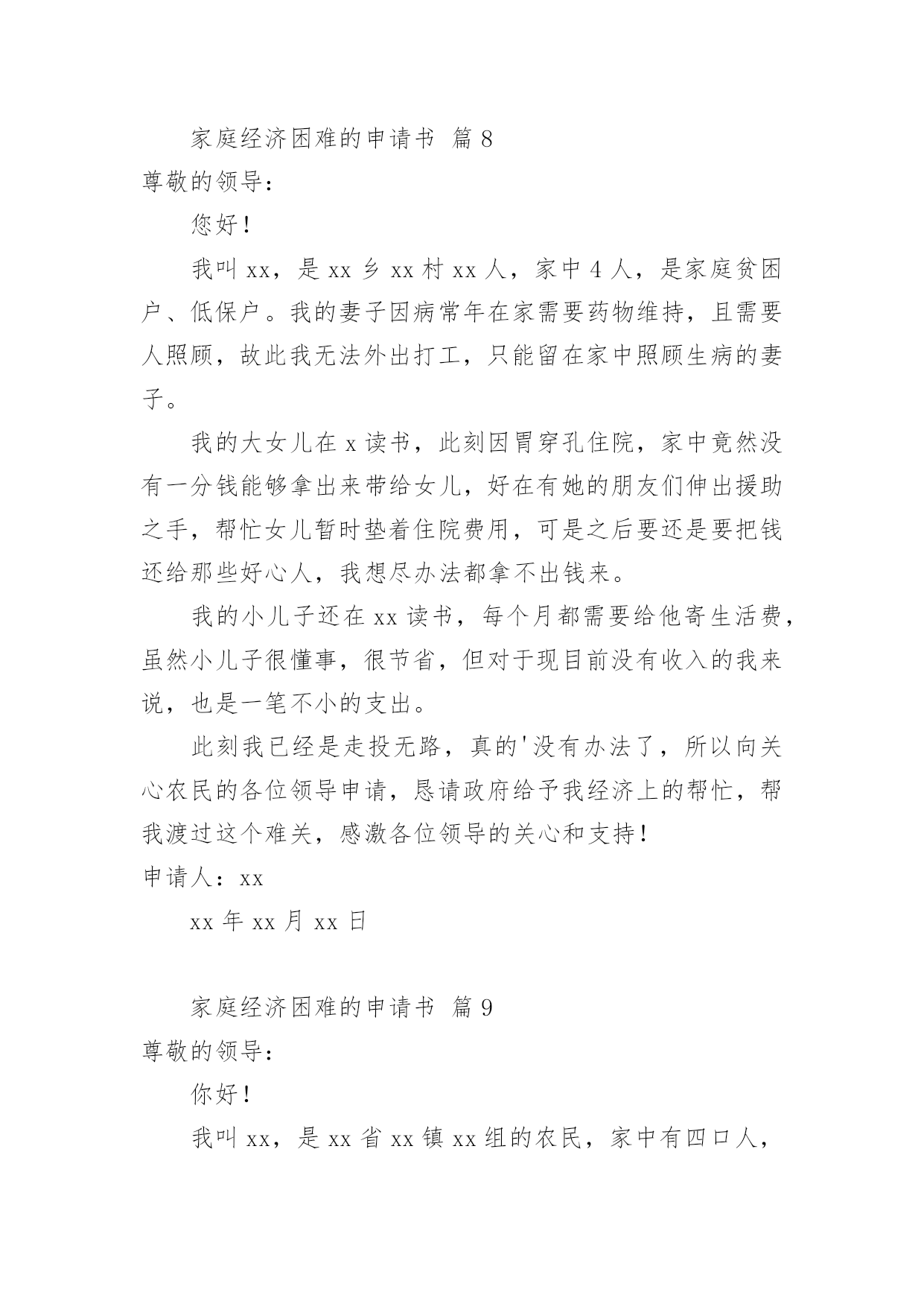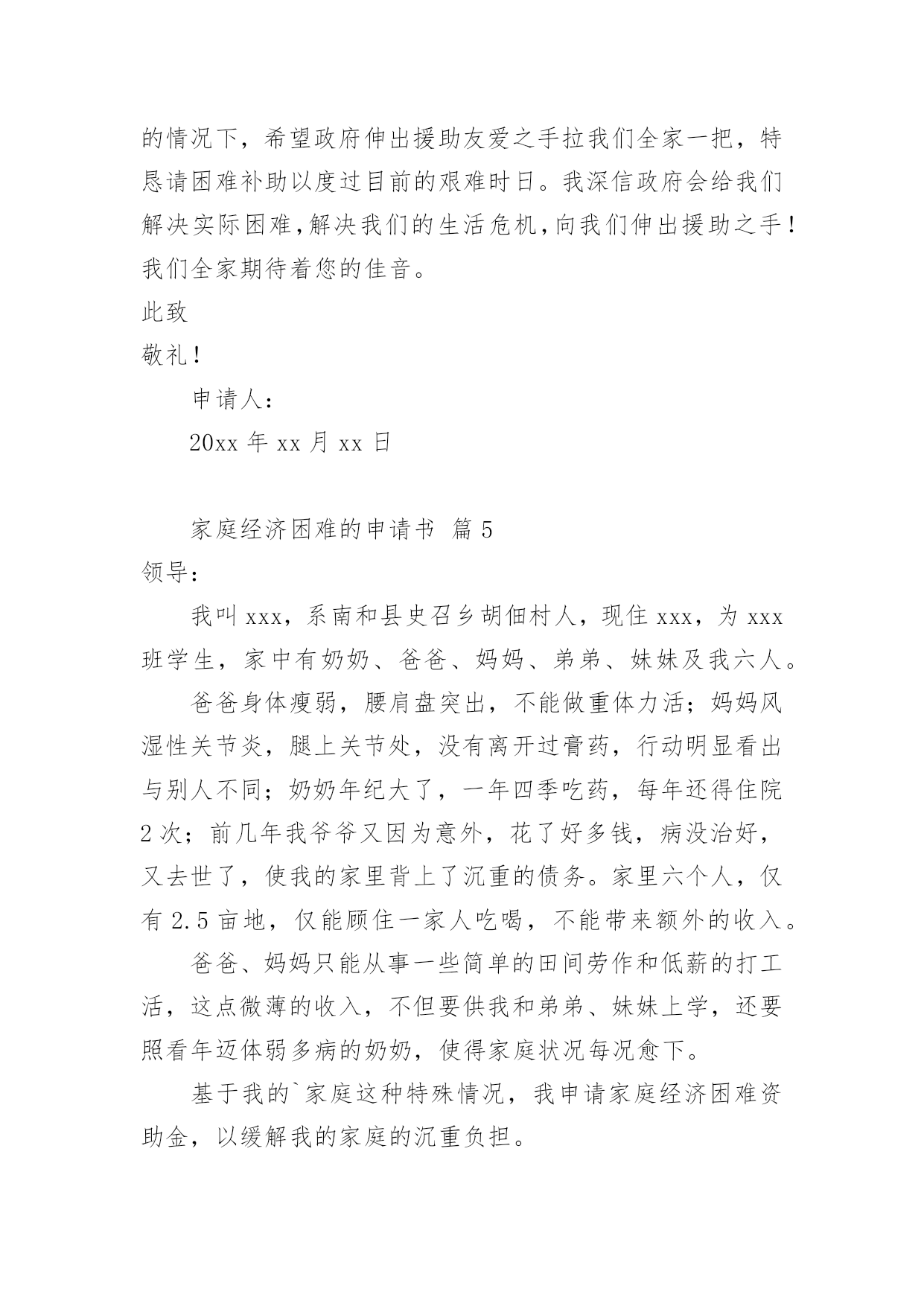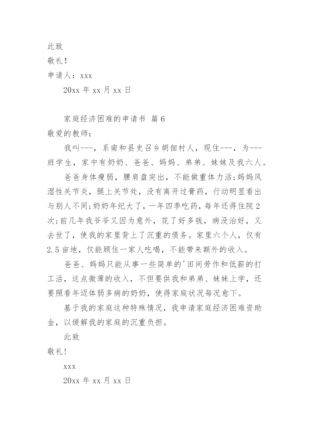 家庭经济困难的申请书随着社会在进步,申请书出现的次数越来越多,申请书是我们平时提出请求的一种书信。但是你知道怎样才能写的好吗?以下是小编为大家收集的家庭经济困难的申请书,欢迎阅读,希望大家能够喜欢。家庭经济困难的申请书篇1尊敬的领导:您好!我是一名来自xx中学xx班的贫困高中生xxx。通过班主任的指点,我了解到学校有一项名为困难学生助学金的项目。接到这个好消息,我感到受到了温暖和希望,也从中得到了感激之情。作为一名来自贫困家庭的学生,我很想向学校申请这项助学金。我在下文中将描述我目前的家庭情况,望您了解。我家位于xx县的xx村,祖祖辈辈都靠务农为生。我的父亲通过在农闲时间里进行农民工工作后认识到,只有掌握知识才能让我们家走出山村、摆脱贫困。在当今竞争激烈的社会,知识就是我的唯一财富,也是我唯一可以与他人竞争的东西。但在家庭经济困难的情况下,想要上学获得知识真的`是一件非常艰难的事情。但我们还是决定要让我上学。父亲的生活变得十分艰辛,忙得没有空闲时间。在我心中,父亲总是仿佛没有停下来过,似乎连休息都是在奢侈。但每当我问他工作是否辛苦的时候,他总是回答说:“辛苦,但是只是为了让你们不再过这种艰难的生活,我们必须让你们上学!”这些话至今仍然铭刻在我的脑海中。我深深感受到,我能够在校园中安心地坐在教室里读书,因为父亲替我承担了本应由我承担的压力。他希望我把这些本该在生存中度过的时间,变成知识和改变自己命运的力量。多年的劳累给父亲的身体带来了很多伤害,我们家中的药品也越来越多。母亲则一直在家中操持家务,照顾年迈的爷爷和奶奶。作为家中最年轻的一员,我无法做出太多实际的贡献,只能通过自己的努力和奋斗,在学业上给家人带来一些安慰。如今,我最希望能得到学校助学金的帮助和机会。我希望读书,以实现父亲的梦想,成为一个杰出的人物,让整个家庭都过上更优越的生活。如果我能得到这份助学金,我将会更加努力学习,不辜负大家的期望,取得更出色的成绩,为所有曾经帮助过我的人和社会做出贡献!此致敬礼!申请人:xxxxxx年xx月xx日家庭经济困难的申请书篇2尊敬的政府部门:我是即将xx校读书的一名学生xx,因家庭经济困难,特申请贫困生。我来自四川内江的一个贫苦家庭,父母都是老实本分的农民,每一天早出晚归,勤勤恳恳,可是由于近几年天灾不断,家里庄稼几乎不能满足我们的`需求,父母只能外出打工,建筑工地又常常拖欠工资,再加上前几年靠贷款修的房子,生活更是雪上加霜。我还有一个正在读小学的妹妹也需要用钱,加上我上学高额学费,,使我们家庭难以承受,父母为了使家庭的生活水平好点,常常在外面打小工,努力挣钱,望着父母那一天天瘦下的身躯,我看在眼里痛在心里,望着妈妈那有黑变白的头发,望着爸爸那魁梧的身躯越来越瘦弱,我恨自我不能长大,为父母排忧解难,减轻家庭负担。当我即将走进校门,听说国家对贫困学生有补助政策,十分高兴期望能得到补助,减轻家庭负担,所以我申请了贫困补助。其实贫困给了我对生活的一种信念,古人常说:“人穷志不穷”“穷且益坚”。我想我自我不会被贫困击倒,并且会更加努力,来改变我们的现状,所以我期望得到政府部门的补助,缓解一点经济压力。最终我想说:感激我们的党,感激我们的政府有这么好的政策,我会用今日的汗水浇筑明天的辉煌,来回报我们的社会。此致敬礼!申请人:xxxx年xx月xx日家庭经济困难的申请书篇3尊敬幼儿园领导:我叫xxx,男,现年xx周岁,出生于xxxx年xx月20日,家住王庄镇侯庄村第二组。现在城关二小幼儿园学前大班四班上学。我家共六口人:我、爸爸、妈妈、姐姐、奶奶和80多岁姥姥,妈妈自幼失去了久病的父亲,爸爸从四川落户到我家,姥姥年老多病,奶奶身体不好,爸爸是主要劳力,仅靠种植几亩薄地维持生活。不幸的.是在今年4月29日,爸爸在家干活时,从木柴堆上摔下,由于家贫,没有及时正规治疗,只在私人诊所作了简单治疗,后病情愈加严重,到西安交大第二附属医院检查,右腿两根筋腱撕裂扯断,需立即手术,花费五万多元欠帐,如今还不能自理,家里正常生活全乱套了。特申请20xx年秋季家庭经济困难幼儿补助金。申请人:xxx20xx年xx月xx日家庭经济困难的申请书篇4敬爱的学校领导:我是信息xx级网络技师班学生莫xx,因家庭经济困难,特申请贫困生。我非常感谢国家对我们贫困生的资助和关爱,我现在十分需要领导、学校、国家帮助我,让我能有幸和其他的同学一起顺利完成学业。我是一个平凡的学生,出生于一个贫穷的小山村,那也是一个偏僻的地方,更是一个交通闭塞的地方。能够从这样贫瘠的土地上走出来,是我最大的幸运,更是我谨记教诲,努力拼搏的结果。在庆幸的同时,也增添了父母的皱纹和苦难。由于我的爸爸妈妈都是农民,他们因为我高兴,更加为我而担忧。高兴之余巨额的学费却让他们吃不香,睡不好。我家没有什么收入,父母为