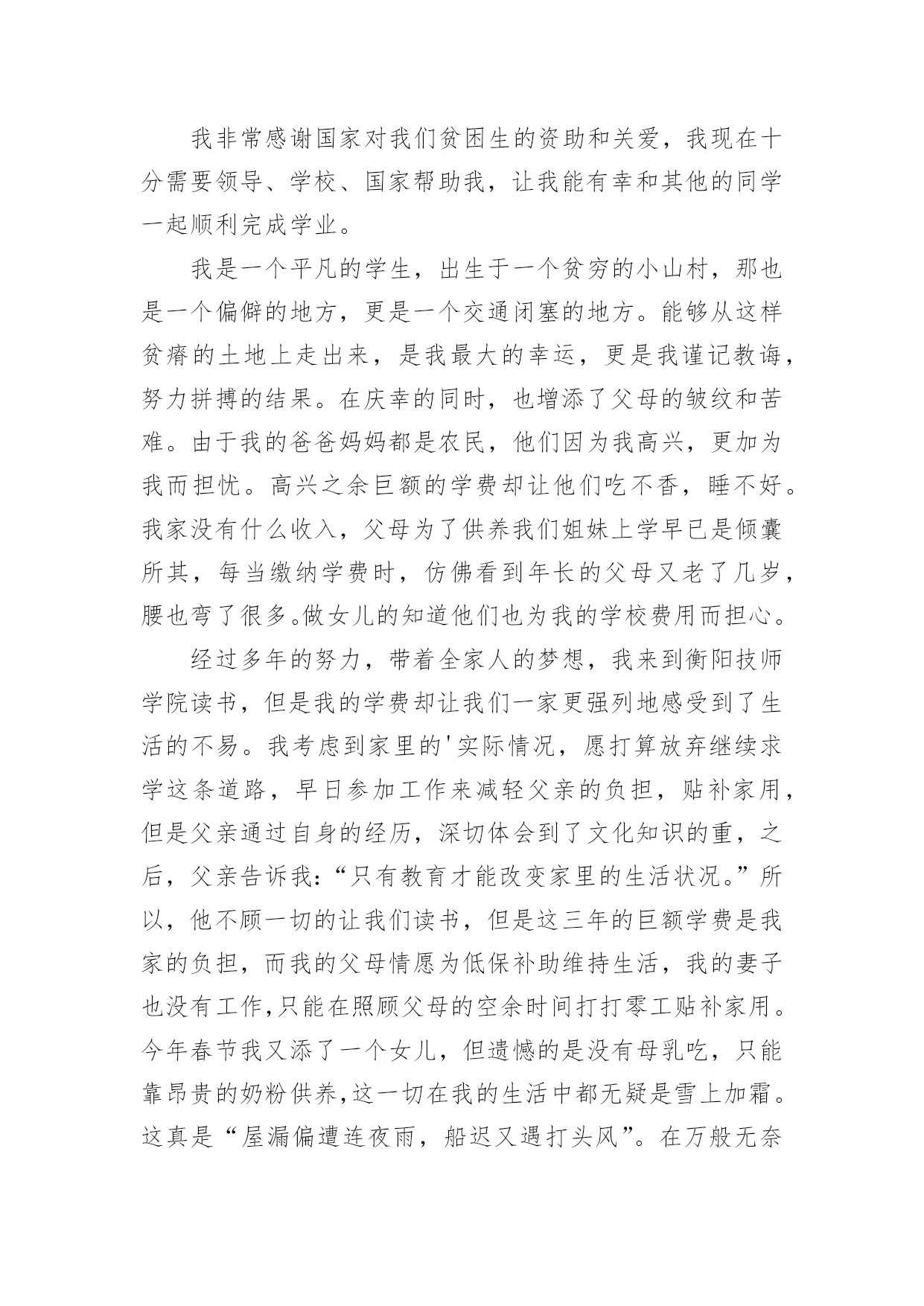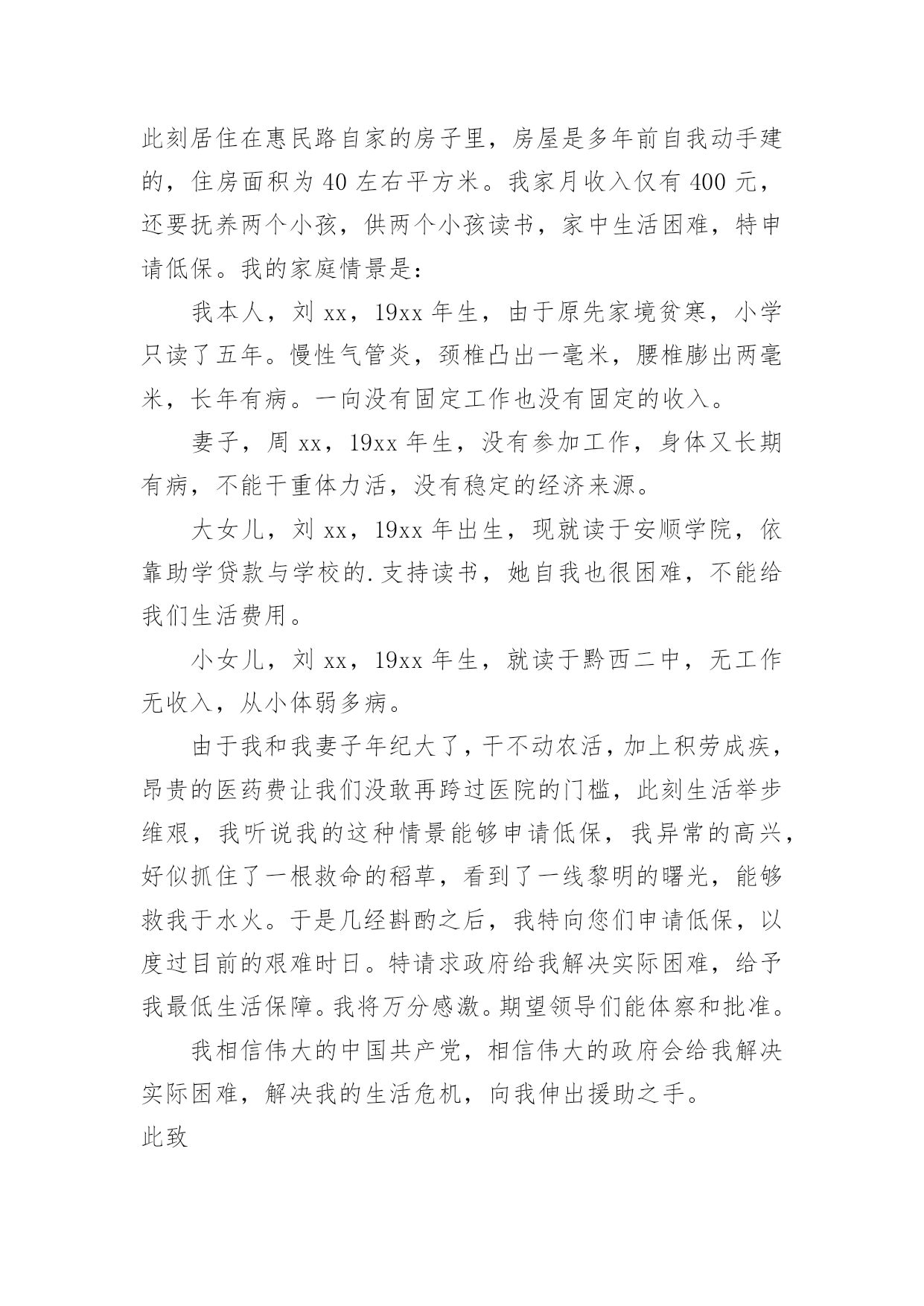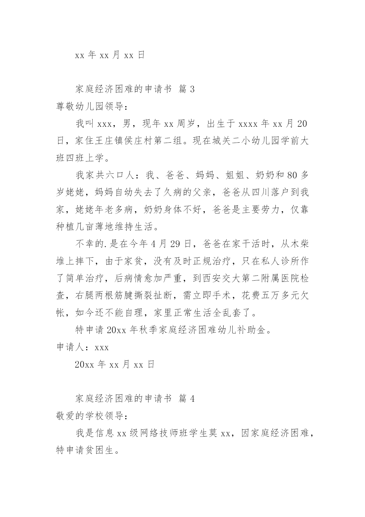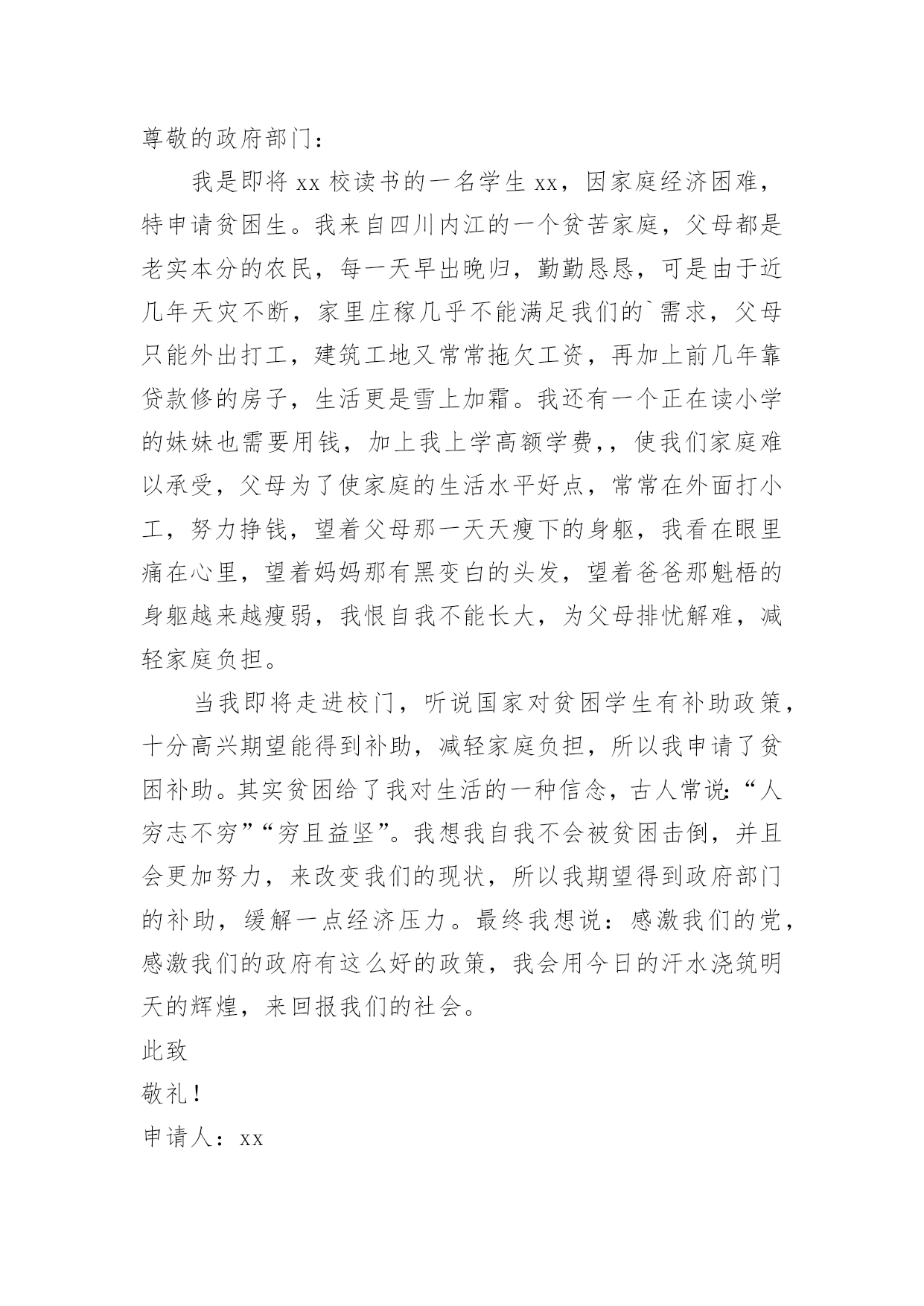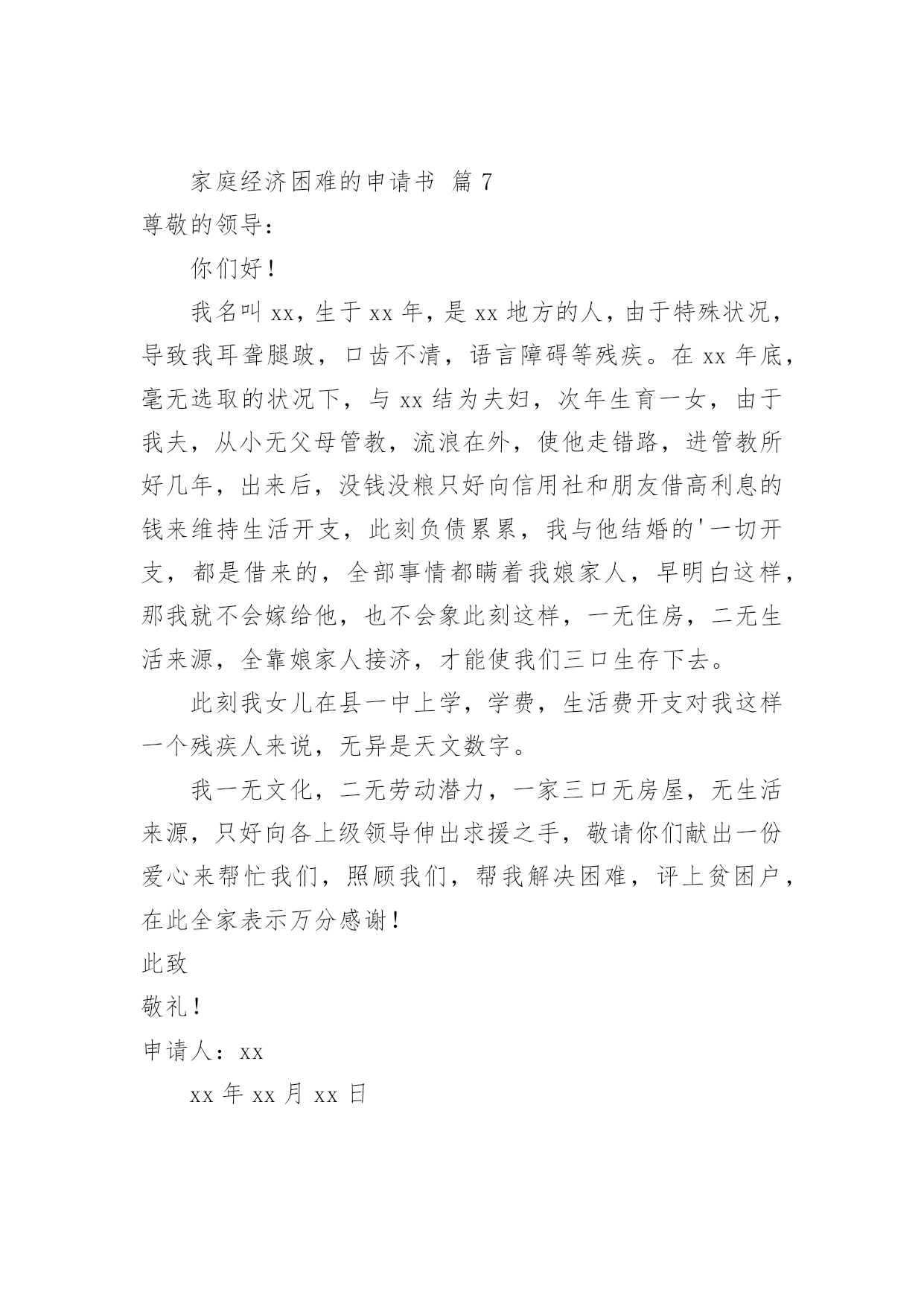 家庭经济困难的申请书随着社会在进步,申请书出现的次数越来越多,申请书是我们平时提出请求的一种书信。但是你知道怎样才能写的好吗?以下是小编为大家收集的家庭经济困难的申请书,欢迎阅读,希望大家能够喜欢。家庭经济困难的申请书篇1尊敬的领导:您好!我是一名来自xx中学xx班的贫困高中生xxx。通过班主任的指点,我了解到学校有一项名为困难学生助学金的项目。接到这个好消息,我感到受到了温暖和希望,也从中得到了感激之情。作为一名来自贫困家庭的学生,我很想向学校申请这项助学金。我在下文中将描述我目前的家庭情况,望您了解。我家位于xx县的xx村,祖祖辈辈都靠务农为生。我的父亲通过在农闲时间里进行农民工工作后认识到,只有掌握知识才能让我们家走出山村、摆脱贫困。在当今竞争激烈的社会,知识就是我的唯一财富,也是我唯一可以与他人竞争的东西。但在家庭经济困难的情况下,想要上学获得知识真的`是一件非常艰难的事情。但我们还是决定要让我上学。父亲的生活变得十分艰辛,忙得没有空闲时间。在我心中,父亲总是仿佛没有停下来过,似乎连休息都是在奢侈。但每当我问他工作是否辛苦的时候,他总是回答说:“辛苦,但是只是为了让你们不再过这种艰难的生活,我们必须让你们上学!”这些话至今仍然铭刻在我的脑海中。我深深感受到,我能够在校园中安心地坐在教室里读书,因为父亲替我承担了本应由我承担的压力。他希望我把这些本该在生存中度过的时间,变成知识和改变自己命运的力量。多年的劳累给父亲的身体带来了很多伤害,我们家中的药品也越来越多。母亲则一直在家中操持家务,照顾年迈的爷爷和奶奶。作为家中最年轻的一员,我无法做出太多实际的贡献,只能通过自己的努力和奋斗,在学业上给家人带来一些安慰。如今,我最希望能得到学校助学金的帮助和机会。我希望读书,以实现父亲的梦想,成为一个杰出的人物,让整个家庭都过上更优越的生活。如果我能得到这份助学金,我将会更加努力学习,不辜负大家的期望,取得更出色的成绩,为所有曾经帮助过我的人和社会做出贡献!此致敬礼!申请人:xxxxxx年xx月xx日家庭经济困难的申请书篇2尊敬的政府部门:我是即将xx校读书的一名学生xx,因家庭经济困难,特申请贫困生。我来自四川内江的一个贫苦家庭,父母都是老实本分的农民,每一天早出晚归,勤勤恳恳,可是由于近几年天灾不断,家里庄稼几乎不能满足我们的`需求,父母只能外出打工,建筑工地又常常拖欠工资,再加上前几年靠贷款修的房子,生活更是雪上加霜。我还有一个正在读小学的妹妹也需要用钱,加上我上学高额学费,,使我们家庭难以承受,父母为了使家庭的生活水平好点,常常在外面打小工,努力挣钱,望着父母那一天天瘦下的身躯,我看在眼里痛在心里,望着妈妈那有黑变白的头发,望着爸爸那魁梧的身躯越来越瘦弱,我恨自我不能长大,为父母排忧解难,减轻家庭负担。当我即将走进校门,听说国家对贫困学生有补助政策,十分高兴期望能得到补助,减轻家庭负担,所以我申请了贫困补助。其实贫困给了我对生活的一种信念,古人常说:“人穷志不穷”“穷且益坚”。我想我自我不会被贫困击倒,并且会更加努力,来改变我们的现状,所以我期望得到政府部门的补助,缓解一点经济压力。最终我想说:感激我们的党,感激我们的政府有这么好的政策,我会用今日的汗水浇筑明天的辉煌,来回报我们的社会。此致敬礼!申请人:xxxx年xx月xx日家庭经济困难的申请书篇3尊敬幼儿园领导:我叫xxx,男,现年xx周岁,出生于xxxx年xx月20日,家住王庄镇侯庄村第二组。现在城关二小幼儿园学前大班四班上学。我家共六口人:我、爸爸、妈妈、姐姐、奶奶和80多岁姥姥,妈妈自幼失去了久病的父亲,爸爸从四川落户到我家,姥姥年老多病,奶奶身体不好,爸爸是主要劳力,仅靠种植几亩薄地维持生活。不幸的.是在今年4月29日,爸爸在家干活时,从木柴堆上摔下,由于家贫,没有及时正规治疗,只在私人诊所作了简单治疗,后病情愈加严重,到西安交大第二附属医院检查,右腿两根筋腱撕裂扯断,需立即手术,花费五万多元欠帐,如今还不能自理,家里正常生活全乱套了。特申请20xx年秋季家庭经济困难幼儿补助金。申请人:xxx20xx年xx月xx日家庭经济困难的申请书篇4敬爱的学校领导:我是信息xx级网络技师班学生莫xx,因家庭经济困难,特申请贫困生。我非常感谢国家对我们贫困生的资助和关爱,我现在十分需要领导、学校、国家帮助我,让我能有幸和其他的同学一起顺利完成学业。我是一个平凡的学生,出生于一个贫穷的小山村,那也是一个偏僻的地方,更是一个交通闭塞的地方。能够从这样贫瘠的土地上走出来,是我最大的幸运,更是我谨记教诲,努力拼搏的结果。在庆幸的同时,也增添了父母的皱纹和苦难。由于我的爸爸妈妈都是农民,他们因为我高兴,更加为我而担忧。高兴之余巨额的学费却让他们吃不香,睡不好。我家没有什么收入,父母为