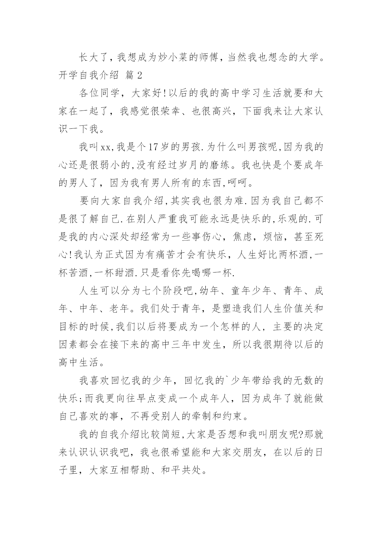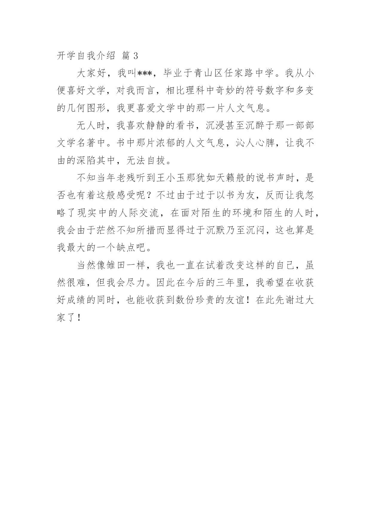 开学自我介绍【精华】开学自我介绍3篇当来到的一个陌生的地方时,我们总少不了要向他人介绍自己,用自我介绍往往可以让他人有一定的了解。相信许多人会觉得自我介绍很难写吧,下面是小编为大家收集的开学自我介绍3篇,欢迎大家借鉴与参考,希望对大家有所帮助。开学自我介绍篇1大家好,我是__,因为刚好出生在雨天,老爸又刚好姓夏,于是"下雨天"就首发出场了,而且妈妈也希望我如雨后春笋、天天向上哦!呵呵后来因为一部分人实在不忍心在晴朗的天气里叫我雨天,为避免引起"混乱",就只好舍弃了这个颇有个性的简单名字,退而成"小名"了。我的大名也简单,其实就一个"翌"字,因为我出生的日子刚好是爸爸妈妈结婚2周年纪念日的第二日。"夏翌"谐音宁波话"暇意",大家希望我暇暇意意,呵呵,有点嫌"翌"字太文绉绉,就把它给拆了,一分为二成羽立了。大家都说我是个阳光女孩,因为我是开心果啊。我老是坐不住,呵呵,能跟小椅子成为好朋友,是老师和爸爸妈妈现在的心愿。我喜欢跳舞,但能跟着音乐自己起舞,不用按老师的要求练基本功;我喜欢画画,但是信手涂鸦,把小朋友的脸画成绿色也没关系;我喜欢溜冰,但最有趣的还是约上三五好友,一起练习如何摔跤……长大了,我想成为炒小菜的师傅,当然我也想念的大学。开学自我介绍篇2各位同学,大家好!以后的我的高中学习生活就要和大家在一起了,我感觉很荣幸、也很高兴,下面我来让大家认识一下我。我叫xx,我是个17岁的男孩.为什么叫男孩呢,因为我的心还是很弱小的,没有经过岁月的磨练。我也快是个要成年的男人了,因为我有男人所有的东西,呵呵。要向大家自我介绍,其实我也很为难.因为我自己都不是很了解自己.在别人严重我可能永远是快乐的,乐观的.可是我的内心深处却经常为一些事伤心,焦虑,烦恼,甚至死心!我认为正式因为有痛苦才会有快乐,人生好比两杯酒,一杯苦酒,一杯甜酒.只是看你先喝哪一杯.人生可以分为七个阶段吧,幼年、童年少年、青年、成年、中年、老年。我们处于青年,是塑造我们人生价值关和目标的时候,我们以后将要成为一个怎样的人,主要的决定因素都会在接下来的高中三年中发生,所以我很期待以后的高中生活。我喜欢回忆我的少年,回忆我的`少年带给我的无数的快乐;而我更向往早点变成一个成年人,因为成年了就能做自己喜欢的事,不再受别人的牵制和约束。我的自我介绍比较简短,大家是否想和我叫朋友呢?那就来认识认识我吧,我也很希望能和大家交朋友,在以后的日子里,大家互相帮助、和平共处。开学自我介绍篇3大家好,我叫***,毕业于青山区任家路中学。我从小便喜好文学,对我而言,相比理科中奇妙的符号数字和多变的几何图形,我更喜爱文学中的那一片人文气息。无人时,我喜欢静静的看书,沉浸甚至沉醉于那一部部文学名著中。书中那片浓郁的人文气息,沁人心脾,让我不由的深陷其中,无法自拔。不知当年老残听到王小玉那犹如天籁般的说书声时,是否也有着这般感受呢?不过由于过于以书为友,反而让我忽略了现实中的人际交流,在面对陌生的环境和陌生的人时,我会由于茫然不知所措而显得过于沉默乃至沉闷,这也算是我最大的一个缺点吧。当然像雏田一样,我也一直在试着改变这样的自己,虽然很难,但我会尽力。因此在今后的三年里,我希望在收获好成绩的同时,也能收获到数份珍贵的友谊!在此先谢过大家了!