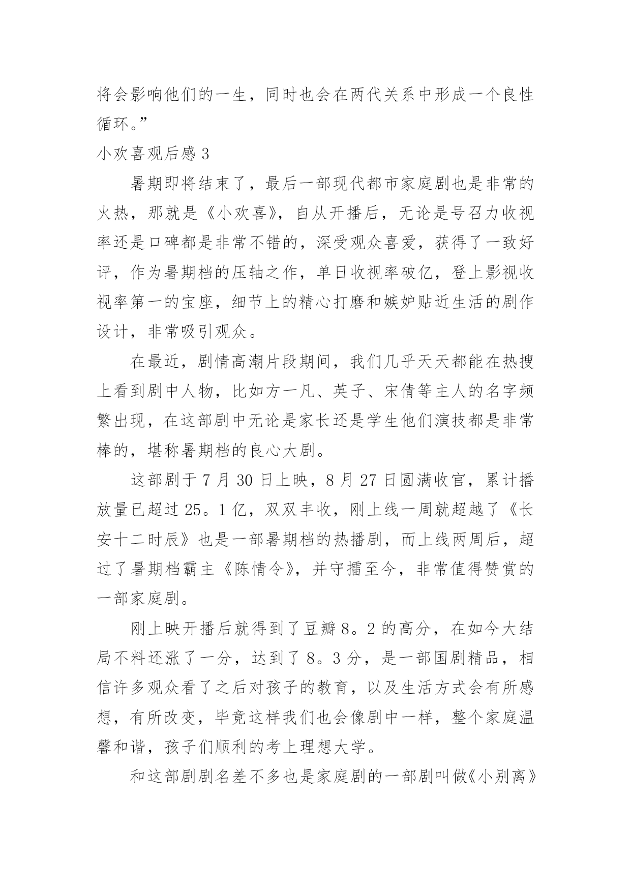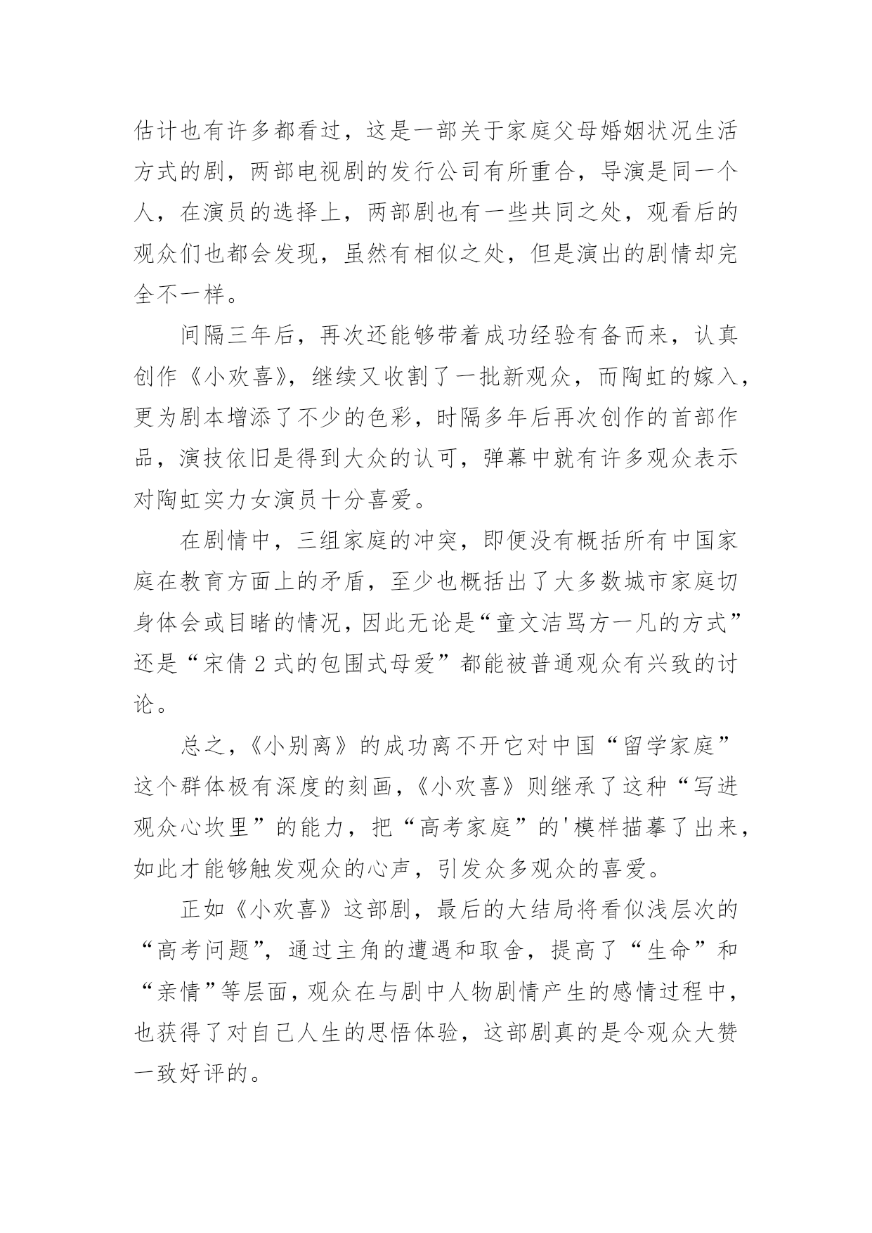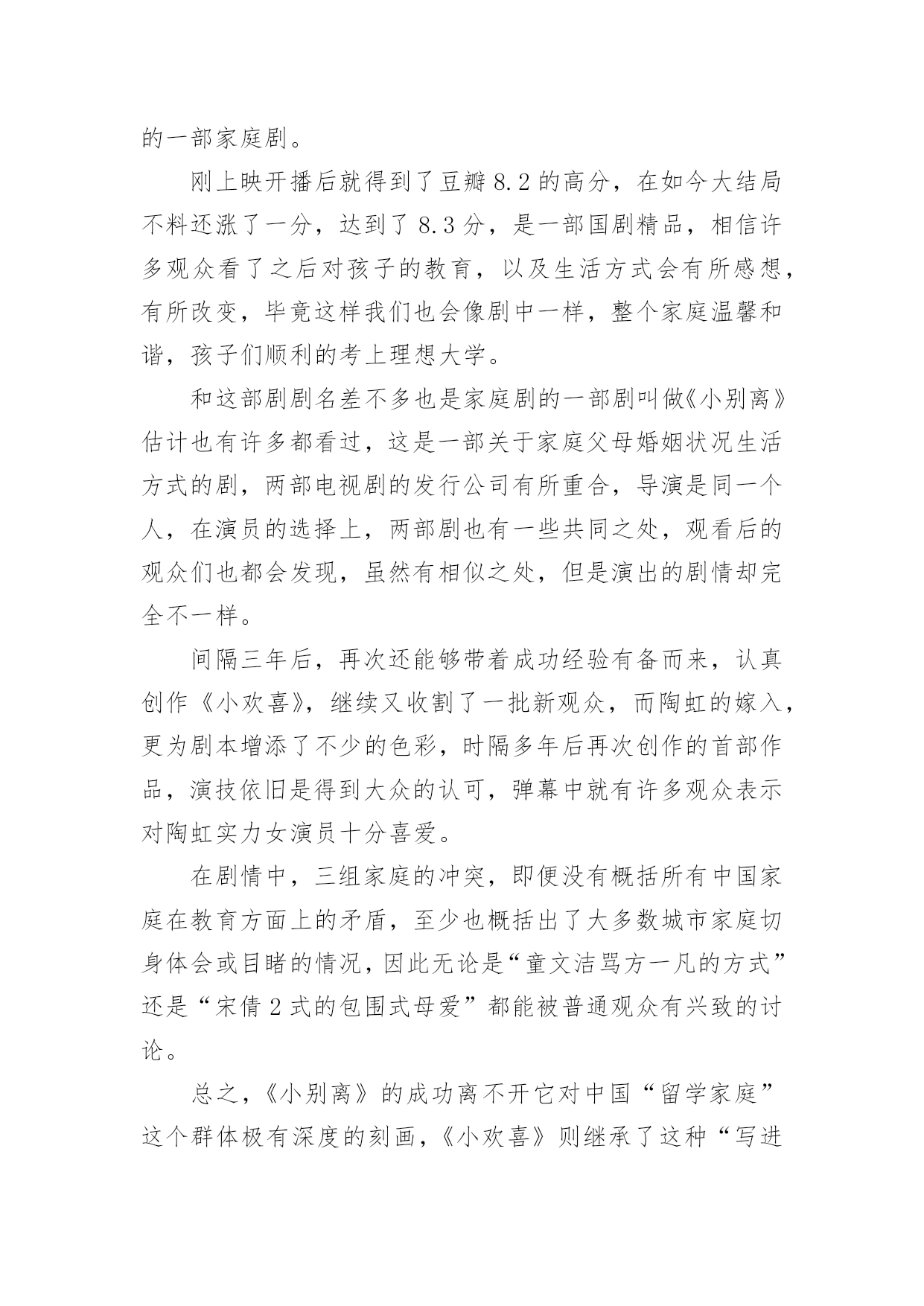 小欢喜观后感小欢喜观后感认真观看完一部影视作品以后,相信大家一定领会了不少东西,是时候静下心来好好写写观后感了。那么你会写观后感吗?下面是小编整理的小欢喜观后感,欢迎阅读,希望大家能够喜欢。小欢喜观后感1暑期即将结束了,最后一部现代都市家庭剧也是非常的火热,那就是《小欢喜》,自从开播后,无论是号召力收视率还是口碑都是非常不错的,深受观众喜爱,获得了一致好评,作为暑期档的压轴之作,单日收视率破亿,登上影视收视率第一的宝座,细节上的精心打磨和嫉妒贴近生活的剧作设计,非常吸引观众。在最近,剧情高潮片段期间,我们几乎天天都能在热搜上看到剧中人物,比如方一凡、英子、宋倩等主人的名字频繁出现,在这部剧中无论是家长还是学生他们演技都是非常棒的,堪称暑期档的良心大剧。这部剧于7月30日上映,8月27日圆满收官,累计播放量已超过25.1亿,双双丰收,刚上线一周就超越了《长安十二时辰》也是一部暑期档的.热播剧,而上线两周后,超过了暑期档霸主《陈情令》,并守擂至今,非常值得赞赏的一部家庭剧。刚上映开播后就得到了豆瓣8.2的高分,在如今大结局不料还涨了一分,达到了8.3分,是一部国剧精品,相信许多观众看了之后对孩子的教育,以及生活方式会有所感想,有所改变,毕竟这样我们也会像剧中一样,整个家庭温馨和谐,孩子们顺利的考上理想大学。和这部剧剧名差不多也是家庭剧的一部剧叫做《小别离》估计也有许多都看过,这是一部关于家庭父母婚姻状况生活方式的剧,两部电视剧的发行公司有所重合,导演是同一个人,在演员的选择上,两部剧也有一些共同之处,观看后的观众们也都会发现,虽然有相似之处,但是演出的剧情却完全不一样。间隔三年后,再次还能够带着成功经验有备而来,认真创作《小欢喜》,继续又收割了一批新观众,而陶虹的嫁入,更为剧本增添了不少的色彩,时隔多年后再次创作的首部作品,演技依旧是得到大众的认可,弹幕中就有许多观众表示对陶虹实力女演员十分喜爱。在剧情中,三组家庭的冲突,即便没有概括所有中国家庭在教育方面上的矛盾,至少也概括出了大多数城市家庭切身体会或目睹的情况,因此无论是“童文洁骂方一凡的方式”还是“宋倩2式的包围式母爱”都能被普通观众有兴致的讨论。总之,《小别离》的成功离不开它对中国“留学家庭”这个群体极有深度的刻画,《小欢喜》则继承了这种“写进观众心坎里”的能力,把“高考家庭”的模样描摹了出来,如此才能够触发观众的心声,引发众多观众的喜爱。正如《小欢喜》这部剧,最后的大结局将看似浅层次的“高考问题”,通过主角的遭遇和取舍,提高了“生命”和“亲情”等层面,观众在与剧中人物剧情产生的感情过程中,也获得了对自己人生的思悟体验,这部剧真的是令观众大赞一致好评的。小欢喜观后感2由鲁引弓原著,黄磊任总编剧,黄磊、海清、陶虹、王砚辉、咏梅领衔主演的现实主义题材剧《小欢喜》今晚登陆东方卫视。作为20xx年热播话题剧《小别离》的续作,《小欢喜》延续前作温暖现实主义生活流,主创团队在原作的基础上,历时三年进行实地考察和调研,采访了数百户真实高考家庭。《小欢喜》围绕了方家、乔家、季家三组不同背景下的家庭为备战高考所发生的一系列故事,多维度探讨和挖掘了教育、两代关系等时下备受关注的现实议题。昨天,该剧主创亮相开播发布会,身为总编剧,黄磊将自己的这部作品定义为温暖现实主义,因为他觉得在大多数人的真实生活里,其实没有什么太曲折、惊险的东西,以及极端的情节,“我们在一个很和平的年代,在这个时代大家过的都是很平和的`生活状态,但是生活里面也会有那些小小的波澜,小小的曲折,孩子要上学,怎么找一个更好的工作,怎么样可以收入更高一些,而这些小小的东西,就足够支撑一部戏。”所以黄磊认为《小欢喜》是部很朴实的戏,三个家庭,一个普通家庭,一个离异家庭,还有一个是中层干部的家庭,“不管哪一个样式的家庭,都要回到最朴实的生活,看熊孩子们怎么样去跟爸爸妈妈斗智斗勇。”《小欢喜》由《小别离》原班主创历时三年打造,方圆和童文洁这对家喻户晓的荧屏伴侣,即将在这部剧中展开全新的人生旅程。作为典型的“虎妈猫爸”家庭,方圆幽默达观,亲和力满分;而童文洁则在职场上精致干练,在家中又将“严母”的形象展现得淋漓尽致。发布会现场,与《小别离》团队再次合作,黄磊感慨颇多,“《小别离》结束后,我们当时就针对是否拍摄续集做了很多探讨和议论,后来我想何不拍一个高考题材的作品,方圆和童文洁夫妇不变,他们从一个故事延续到另一个故事,这样的设定会让观众既熟悉又陌生。另外我们在《小欢喜》这部剧中也做了一些配合和调整,为这两部剧设定了一些有趣的连接。”在黄磊看来,方圆和童文洁就像中国万千父母的缩影,“他们代表了最普通中国家庭。”此前在《小欢喜》的制作特辑中,黄磊表示,这部剧更多地是聚焦父母的自我成长和蜕变,剧中的很多剧情都是他身处当下有感而发,“父母通常会