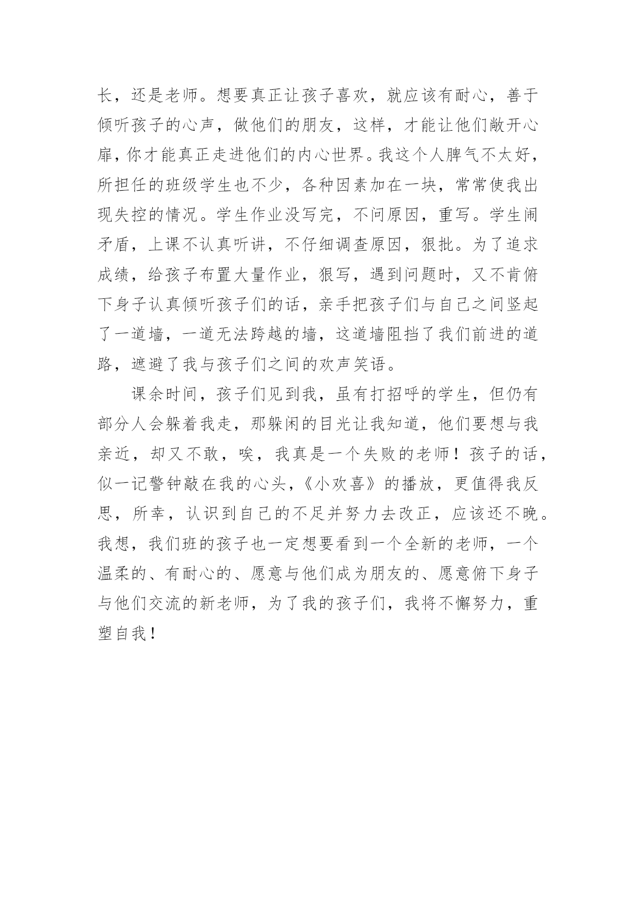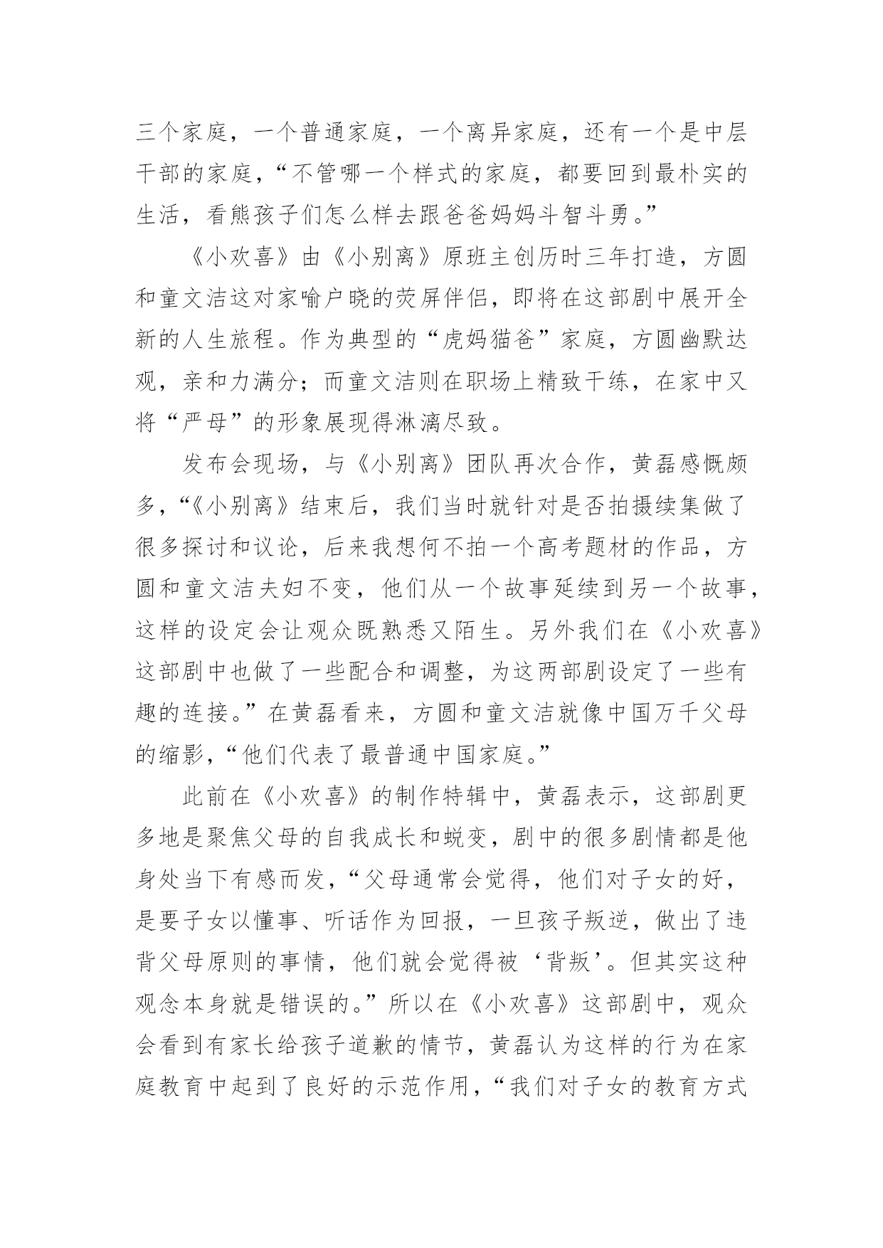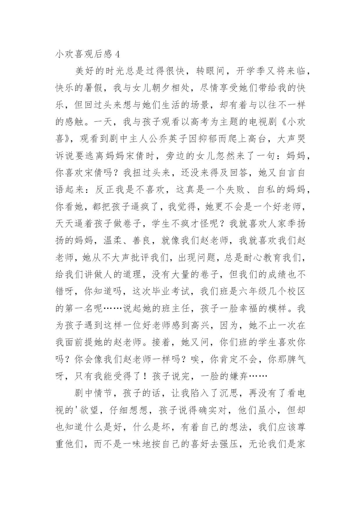 小欢喜观后感小欢喜观后感认真观看完一部影视作品以后,相信大家一定领会了不少东西,是时候静下心来好好写写观后感了。那么你会写观后感吗?下面是小编整理的小欢喜观后感,欢迎阅读,希望大家能够喜欢。小欢喜观后感1暑期即将结束了,最后一部现代都市家庭剧也是非常的火热,那就是《小欢喜》,自从开播后,无论是号召力收视率还是口碑都是非常不错的,深受观众喜爱,获得了一致好评,作为暑期档的压轴之作,单日收视率破亿,登上影视收视率第一的宝座,细节上的精心打磨和嫉妒贴近生活的剧作设计,非常吸引观众。在最近,剧情高潮片段期间,我们几乎天天都能在热搜上看到剧中人物,比如方一凡、英子、宋倩等主人的名字频繁出现,在这部剧中无论是家长还是学生他们演技都是非常棒的,堪称暑期档的良心大剧。这部剧于7月30日上映,8月27日圆满收官,累计播放量已超过25.1亿,双双丰收,刚上线一周就超越了《长安十二时辰》也是一部暑期档的.热播剧,而上线两周后,超过了暑期档霸主《陈情令》,并守擂至今,非常值得赞赏的一部家庭剧。刚上映开播后就得到了豆瓣8.2的高分,在如今大结局不料还涨了一分,达到了8.3分,是一部国剧精品,相信许多观众看了之后对孩子的教育,以及生活方式会有所感想,有所改变,毕竟这样我们也会像剧中一样,整个家庭温馨和谐,孩子们顺利的考上理想大学。和这部剧剧名差不多也是家庭剧的一部剧叫做《小别离》估计也有许多都看过,这是一部关于家庭父母婚姻状况生活方式的剧,两部电视剧的发行公司有所重合,导演是同一个人,在演员的选择上,两部剧也有一些共同之处,观看后的观众们也都会发现,虽然有相似之处,但是演出的剧情却完全不一样。间隔三年后,再次还能够带着成功经验有备而来,认真创作《小欢喜》,继续又收割了一批新观众,而陶虹的嫁入,更为剧本增添了不少的色彩,时隔多年后再次创作的首部作品,演技依旧是得到大众的认可,弹幕中就有许多观众表示对陶虹实力女演员十分喜爱。在剧情中,三组家庭的冲突,即便没有概括所有中国家庭在教育方面上的矛盾,至少也概括出了大多数城市家庭切身体会或目睹的情况,因此无论是“童文洁骂方一凡的方式”还是“宋倩2式的包围式母爱”都能被普通观众有兴致的讨论。总之,《小别离》的成功离不开它对中国“留学家庭”这个群体极有深度的刻画,《小欢喜》则继承了这种“写进观众心坎里”的能力,把“高考家庭”的模样描摹了出来,如此才能够触发观众的心声,引发众多观众的喜爱。正如《小欢喜》这部剧,最后的大结局将看似浅层次的“高考问题”,通过主角的遭遇和取舍,提高了“生命”和“亲情”等层面,观众在与剧中人物剧情产生的感情过程中,也获得了对自己人生的思悟体验,这部剧真的是令观众大赞一致好评的。小欢喜观后感2由鲁引弓原著,黄磊任总编剧,黄磊、海清、陶虹、王砚辉、咏梅领衔主演的现实主义题材剧《小欢喜》今晚登陆东方卫视。作为20xx年热播话题剧《小别离》的续作,《小欢喜》延续前作温暖现实主义生活流,主创团队在原作的基础上,历时三年进行实地考察和调研,采访了数百户真实高考家庭。《小欢喜》围绕了方家、乔家、季家三组不同背景下的家庭为备战高考所发生的一系列故事,多维度探讨和挖掘了教育、两代关系等时下备受关注的现实议题。昨天,该剧主创亮相开播发布会,身为总编剧,黄磊将自己的这部作品定义为温暖现实主义,因为他觉得在大多数人的真实生活里,其实没有什么太曲折、惊险的东西,以及极端的情节,“我们在一个很和平的年代,在这个时代大家过的都是很平和的`生活状态,但是生活里面也会有那些小小的波澜,小小的曲折,孩子要上学,怎么找一个更好的工作,怎么样可以收入更高一些,而这些小小的东西,就足够支撑一部戏。”所以黄磊认为《小欢喜》是部很朴实的戏,三个家庭,一个普通家庭,一个离异家庭,还有一个是中层干部的家庭,“不管哪一个样式的家庭,都要回到最朴实的生活,看熊孩子们怎么样去跟爸爸妈妈斗智斗勇。”《小欢喜》由《小别离》原班主创历时三年打造,方圆和童文洁这对家喻户晓的荧屏伴侣,即将在这部剧中展开全新的人生旅程。作为典型的“虎妈猫爸”家庭,方圆幽默达观,亲和力满分;而童文洁则在职场上精致干练,在家中又将“严母”的形象展现得淋漓尽致。发布会现场,与《小别离》团队再次合作,黄磊感慨颇多,“《小别离》结束后,我们当时就针对是否拍摄续集做了很多探讨和议论,后来我想何不拍一个高考题材的作品,方圆和童文洁夫妇不变,他们从一个故事延续到另一个故事,这样的设定会让观众既熟悉又陌生。另外我们在《小欢喜》这部剧中也做了一些配合和调整,为这两部剧设定了一些有趣的连接。”在黄磊看来,方圆和童文洁就像中国万千父母的缩影,“他们代表了最普通中国家庭。”此前在《小欢喜》的制作特辑中,黄磊表示,这部剧更多地是聚焦父母的自我成长和蜕变,剧中的很多剧情都是他身处当下有感而发,“父母通常会