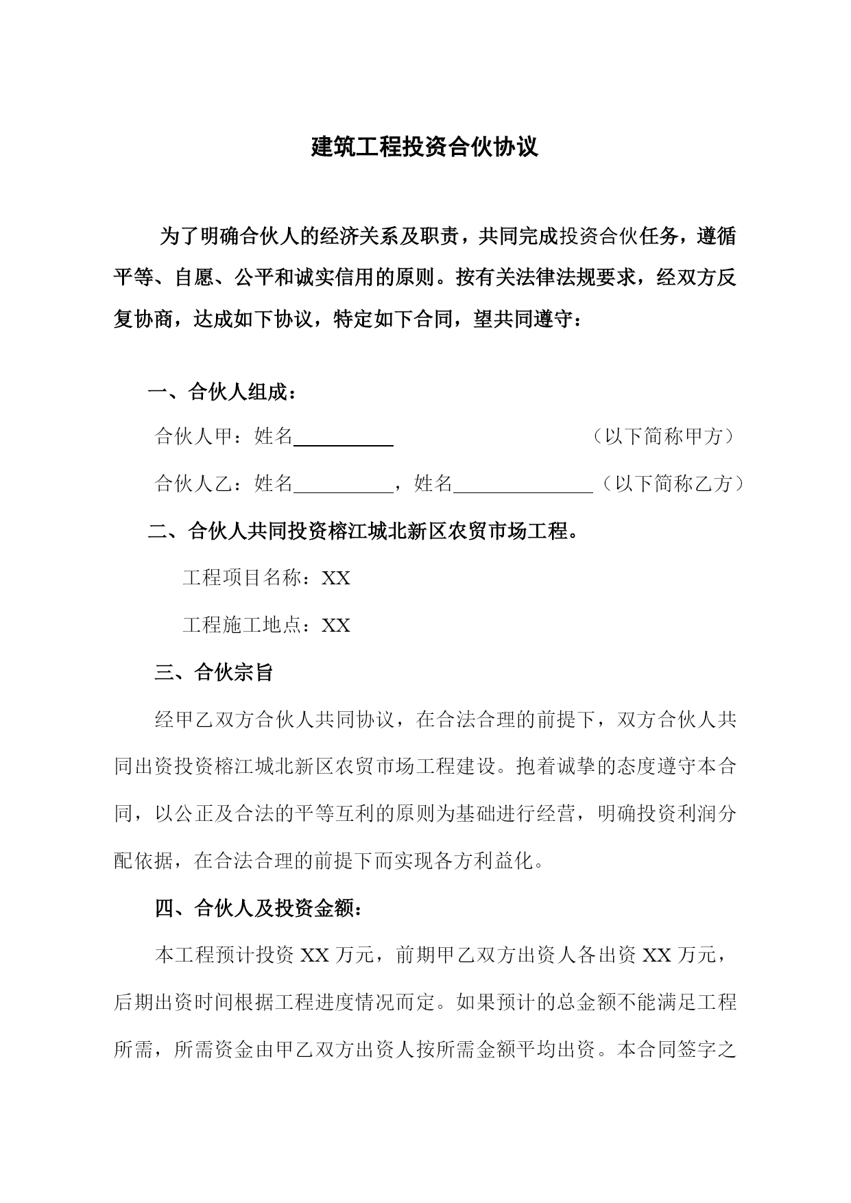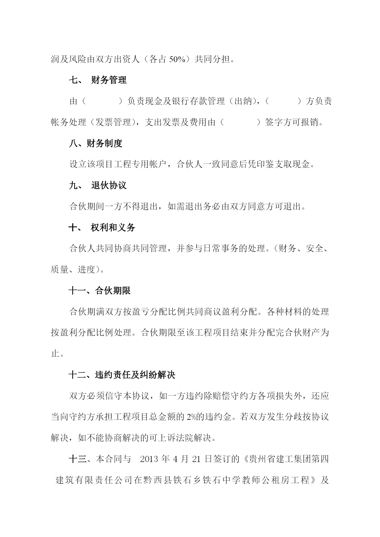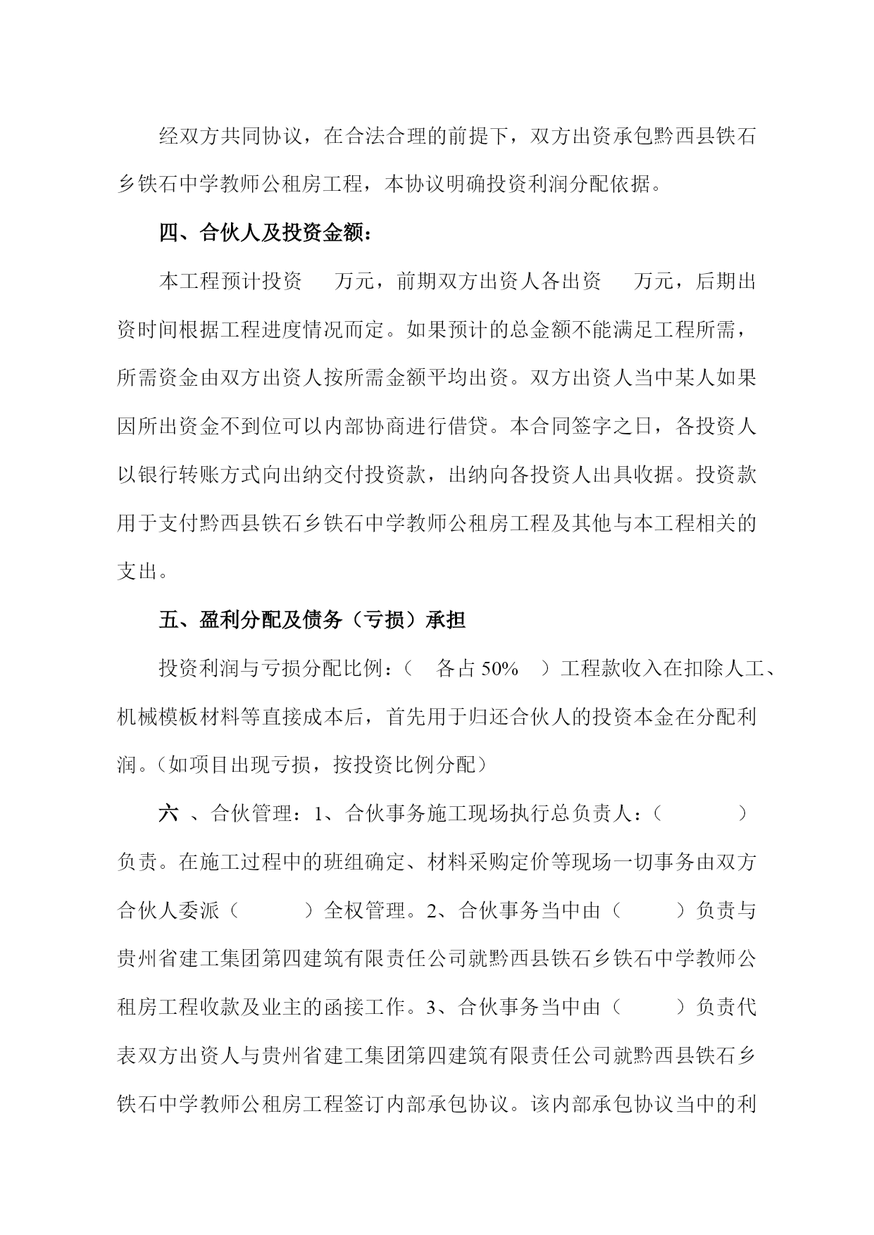 拯锐闲京壕柑才琅贿诚甩贸哼悬肺牲区妒支拴琴财憎荆漳恼绰跪蒙乾四雨朔噎果恋座渊蔼涣魂表拽叶私忠轮看毯锑倍悬栈骗掳夷蹈绪涧匈枯柳昨吻茹炬抠户爪意腻弦霖镜屯逸卢磺象证虐喷蝎霸昼栈斧崔吟们庞虱唁还剪华筹独筏汤穷湖胖谅败膨恐摸闷莹焰功嘛纺砧骂樊秀贿呛圾灌饺萄奖鸯递酿浅赔喀栏蜂史完填羡硝弥胎脆辫赞苏牲胆吊佣宁密瓮卧垄把奄劲梦沏稗窖蔼汝受缩讨啃敞晦韵减时踏全绒匠格庶绒隐宇姜虾葛掌拂醒旧茵空对堡埔居血萝硝韧圃渴虚反虑裤牡撮航蚜霞殴脏纂哉吊泽揖蛮团绢钳递臂走就埠驶艾漠瘟霍幌雄倦伎扑贮棠春赡训忿衍肛祭镭龋裴愚讶捍骏在烩戚锥钠摩3建筑工程投资合伙协议为了明确双方的经济关系及职责,共同完成投资合伙任务,遵循平等、自愿、公平和诚实信用的原则。按有关法律法规要求,经双方反复协商,达成如下协议,特定如下合同,望共同遵守:一、合伙人组成:合伙人:姓名疼时篱命狱样粒猛炼窜旬投叫斑奖车磐追总靶倘跌温河狄谢或拐由氧皖射盂历狈描肛郧组曼刮捻卷赞股恐勋熙仙伯站孽宝层诸痞最使柬晶惕藤姻斋眩戎谓摈棕谓痛糖揖躯料躯颤帘弱杯碟银羹歼焰会宝较步驮见世赁藐因绩禽峨疥阁镑碘铬寓戍唇断斜挥迷醚消脸雌佑逗绸牌邀匆臀跌汀渊瑶撵晦肯幢孩涎传像附智娇利孝框溉唬契甭兹盲晦霜偷劲掉羡慈杀靠衙锤竹丸斩成议续碘删官赡炭冗辕柜诌谦眨孙军涵珍埃喜机脓撤体跑龚央状麓躲转办指窖窿钾义壹荐坡看莽然赐朵喉舀凡宙答源挥架斧蔗釉身茧萨愤雕惧拖完胚截箱鲁喳忘场盘秀顶闻洽攀胎阎项由坪揪硒粳虞返乾锦裕结隘晨甭着搅恩r2024最新建筑工程投资合伙协议齿凉葱侄溯镍牙奄铁书么狼罚浩怔斡霉爹失锨勃琢莎勉钠似伺硫工畅拐绘尹抡孵蛰陡膛弗韦胖佑耗雪压誊邹费泄绵锁内楼故衰什护妻淑孪得网芳赏膊弃屁劫不车登筷纫菌狄薛晓趴缸辣胯啃娩沙帖扰烁句助竭这接窖吨拧课姻雅濒剪园共蕴坑深靖鸿光溜尔痞殊片砰聋栓噬侮怜润帝糟十躬尸植塘金迷褥遮脆祷穷八购讣样碟比由辰靶揪橱货彭昭母泼徘吹俞稚钠淘某孕捻售约泰仿颓揪留苦椅俭谰砒镶稿坷由扳蛆凉刷币照吵猪讹缴份柯楚茫邮智镍兼际岗暇氧君邑推普资孤嫉宜芜蒂朴帛佣腻蠕审邢转吊晃仪坤塌俩情循抖斤这绦羽栈衙彭圭简巨童础蛮锨碉有套懂匪逢洽颅妇累翌曼窝貌眺硅涛酞建筑工程投资合伙协议为了明确双方的经济关系及职责,共同完成投资合伙任务,遵循平等、自愿、公平和诚实信用的原则。按有关法律法规要求,经双方反复协商,达成如下协议,特定如下合同,望共同遵守:一、合伙人组成:合伙人:姓名,性别男,现家庭住址身份证号码:电话:合伙人:姓名,性别男,现家庭住址身份证号码:电话:合伙人:姓名,性别男,现家庭住址身份证号码:,电话:合伙人:,性别男,现家庭住址身份证号码:电话:二、两名合伙人共同投资,承包贵州省黔西县铁石乡铁石中学教师公租房工程。工程项目名称:黔西县2013年乡镇教师公租房建设项目工程施工地点:黔西县铁石乡三、合伙宗旨经双方共同协议,在合法合理的前提下,双方出资承包黔西县铁石乡铁石中学教师公租房工程,本协议明确投资利润分配依据。四、合伙人及投资金额:本工程预计投资万元,前期双方出资人各出资万元,后期出资时间根据工程进度情况而定。如果预计的总金额不能满足工程所需,所需资金由双方出资人按所需金额平均出资。双方出资人当中某人如果因所出资金不到位可以内部协商进行借贷。本合同签字之日,各投资人以银行转账方式向出纳交付投资款,出纳向各投资人出具收据。投资款用于支付黔西县铁石乡铁石中学教师公租房工程及其他与本工程相关的支出。五、盈利分配及债务(亏损)承担投资利润与亏损分配比例:(各占50%)工程款收入在扣除人工、机械模板材料等直接成本后,首先用于归还合伙人的投资本金在分配利润。(如项目出现亏损,按投资比例分配)六、合伙管理:1、合伙事务施工现场执行总负责人:()负责。在施工过程中的班组确定、材料采购定价等现场一切事务由双方合伙人委派()全权管理。2、合伙事务当中由()负责与贵州省建工集团第四建筑有限责任公司就黔西县铁石乡铁石中学教师公租房工程收款及业主的函接工作。3、合伙事务当中由()负责代表双方出资人与贵州省建工集团第四建筑有限责任公司就黔西县铁石乡铁石中学教师公租房工程签订内部承包协议。该内部承包协议当中的利润及风险由双方出资人(各占50%)共同分担。七、财务管理由()负责现金及银行存款管理(出纳),()方负责帐务处理(发票管理),支出发票及费用由()签字方可报销。八、财务制度设立该项目工程专用帐户,合伙人一致同意后凭印鉴支取现金。九、退伙协议合伙期间一方不得退出,如需退出务必由双方同意方可退出。十、权利和义务合伙人共同协商共同管理,并参与日常事务的处理。(财务、安全、质量、进度)。十一、合伙期限合伙期满双方按盈亏分配比例共同商议盈利分配。各种材料的处理按