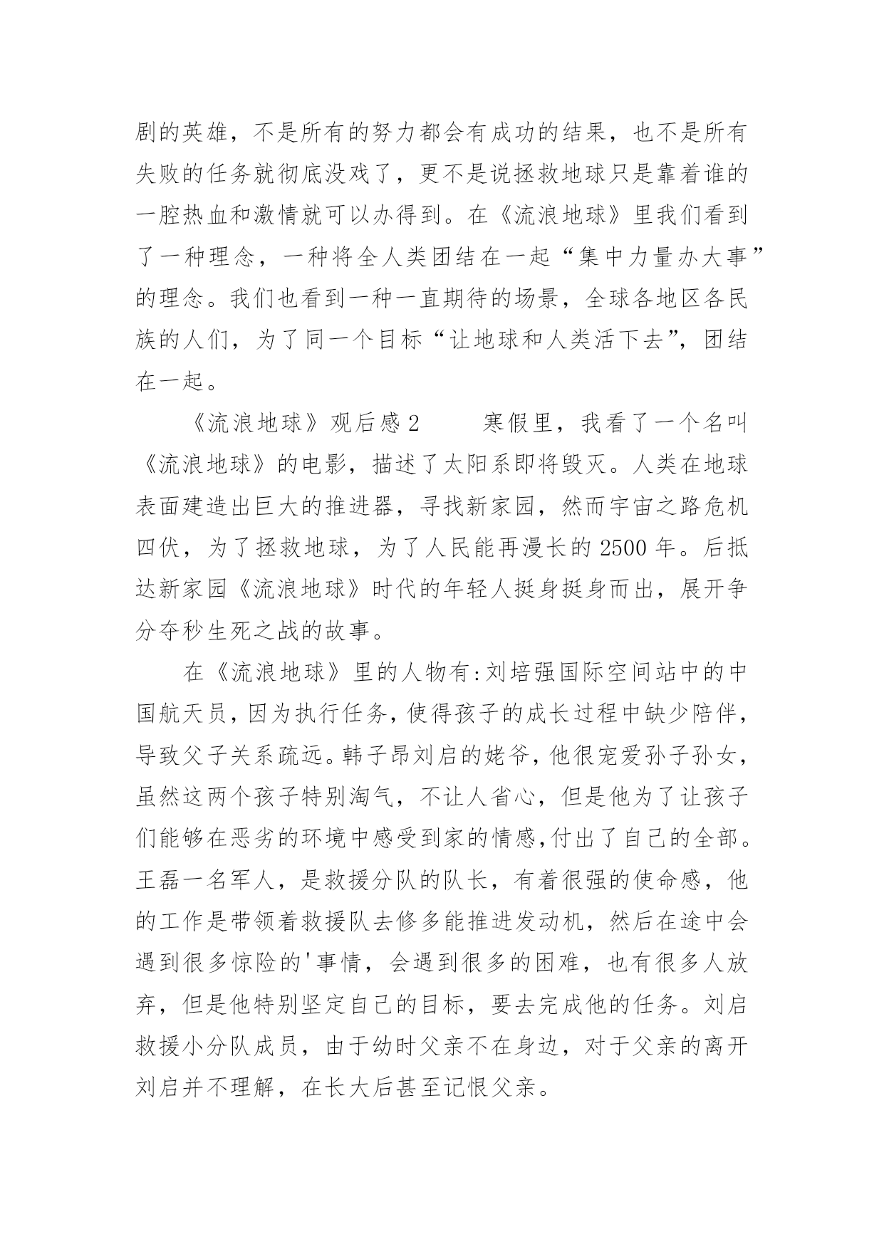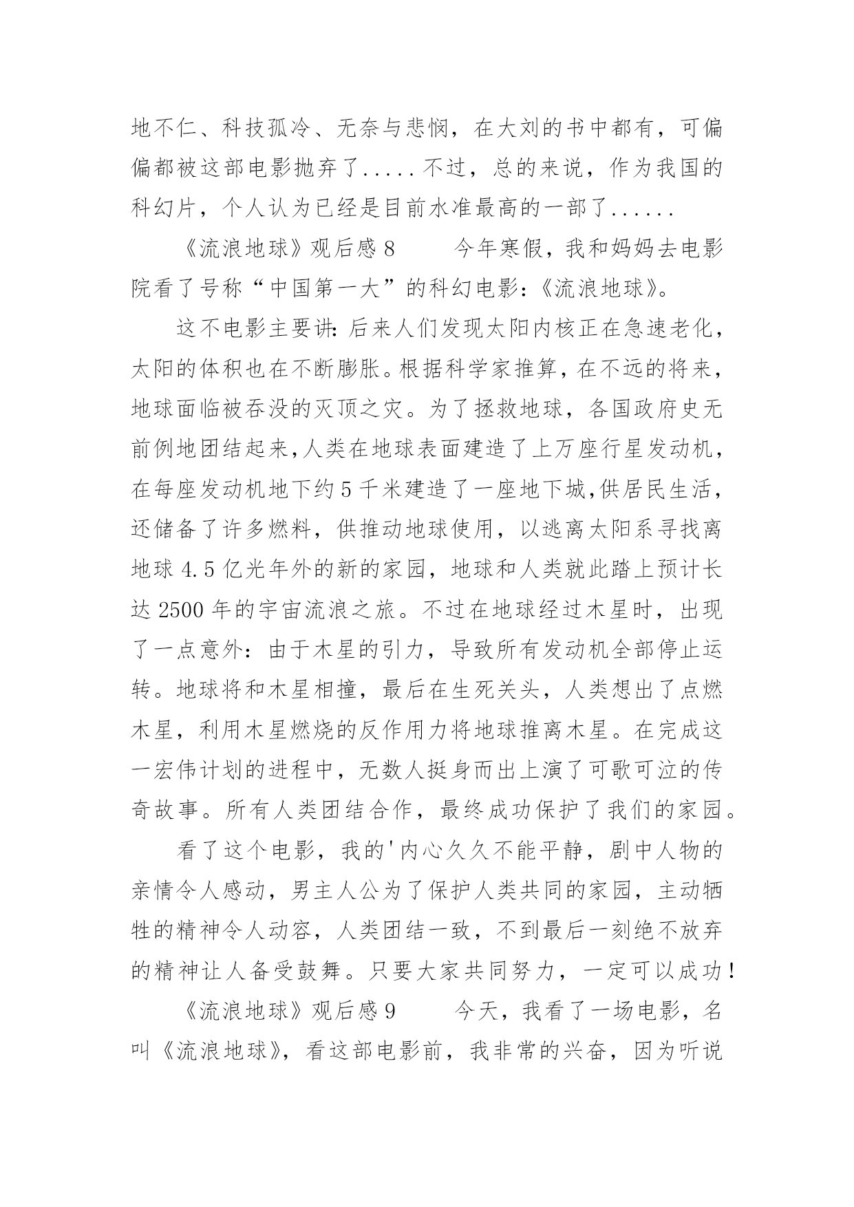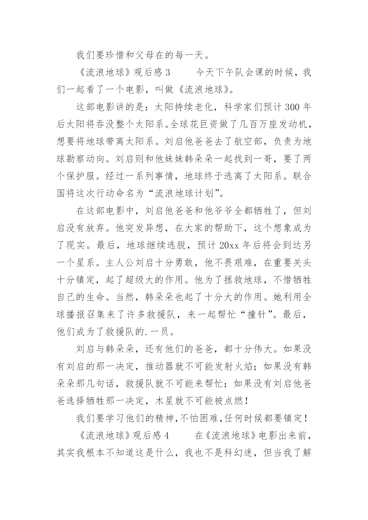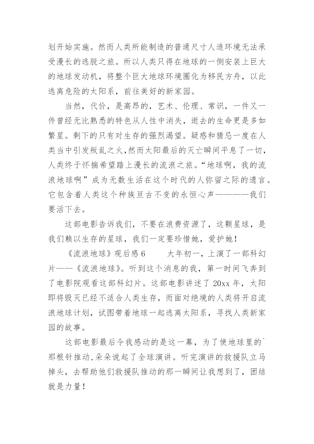 《流浪地球》观后感《流浪地球》观后感认真看完一部作品以后,相信大家的视野一定开拓了不少吧,这时候,最关键的观后感怎么能落下!现在你是否对观后感一筹莫展呢?以下是小编为大家整理的《流浪地球》观后感,欢迎大家分享。《流浪地球》观后感1太棒了!刘慈欣的小说终于拍成电影啦!大年初二,我和爸爸妈妈一起观看了国产第一部科幻电影《流浪地球》,心情十分激动。《流浪地球》讲了一个脑洞十分大的故事。未来的某一天,人们发现太阳在急速老化,快要炸了,人类唯一生存的办法就是逃离太阳系。最近的适合居住的星系是4.2光年外的比邻星(哦,也就是三体人的故乡)于是,人类建造了1万个行星发动机,遍布世界各地,这样就能把地球推离太阳系。但是把地球搬家的步骤很繁琐,总体需要五个步骤,人们把这五步分别称为刹车时代、逃逸时代、流浪时代Ⅰ(加速)、流浪时代Ⅱ(减速)、新太阳时代—这就是“流浪地球计划。”完成这个计划需要经过2500年的时间,整整100代人。人类为了生存,艰难前行。但危险马上来临了……我们是否有勇气,带着地球去流浪?影片的'最后这句话让我感动流泪:不论人类历史导向何处,我们决定,选择希望!看完影片后会发现,原来,不是所有的主角都是贯穿全剧的英雄,不是所有的努力都会有成功的结果,也不是所有失败的任务就彻底没戏了,更不是说拯救地球只是靠着谁的一腔热血和激情就可以办得到。在《流浪地球》里我们看到了一种理念,一种将全人类团结在一起“集中力量办大事”的理念。我们也看到一种一直期待的场景,全球各地区各民族的人们,为了同一个目标“让地球和人类活下去”,团结在一起。《流浪地球》观后感2寒假里,我看了一个名叫《流浪地球》的电影,描述了太阳系即将毁灭。人类在地球表面建造出巨大的推进器,寻找新家园,然而宇宙之路危机四伏,为了拯救地球,为了人民能再漫长的2500年。后抵达新家园《流浪地球》时代的年轻人挺身挺身而出,展开争分夺秒生死之战的故事。在《流浪地球》里的人物有:刘培强国际空间站中的中国航天员,因为执行任务,使得孩子的成长过程中缺少陪伴,导致父子关系疏远。韩子昂刘启的姥爷,他很宠爱孙子孙女,虽然这两个孩子特别淘气,不让人省心,但是他为了让孩子们能够在恶劣的环境中感受到家的情感,付出了自己的全部。王磊一名军人,是救援分队的队长,有着很强的使命感,他的工作是带领着救援队去修多能推进发动机,然后在途中会遇到很多惊险的'事情,会遇到很多的困难,也有很多人放弃,但是他特别坚定自己的目标,要去完成他的任务。刘启救援小分队成员,由于幼时父亲不在身边,对于父亲的离开刘启并不理解,在长大后甚至记恨父亲。我们要珍惜和父母在的每一天。《流浪地球》观后感3今天下午队会课的时候,我们一起看了一个电影,叫做《流浪地球》。这部电影讲的是:太阳持续老化,科学家们预计300年后太阳将吞没整个太阳系。全球花巨资做了几百万座发动机,想要将地球带离太阳系。刘启他爸爸去了航空部,负责为地球勘察动向。刘启则和他妹妹韩朵朵一起找到一哥,要了两个保护服。经过一系列事情,地球终于逃离了太阳系。联合国将这次行动命名为“流浪地球计划”。在这部电影中,刘启他爸爸和他爷爷全都牺牲了,但刘启没有放弃。他突发异想,在大家的帮助下,这个想象成为了现实。最后,地球继续逃脱,预计20xx年后将会到达另一个星系。主人公刘启十分勇敢,他不畏艰难,在重要关头十分镇定,起了超级大的作用。他为了拯救地球,不惜牺牲自己的生命。当然,韩朵朵也起了十分大的作用。她利用全球播报召集来了许多救援队,来一起帮忙“撞针”。最后,他们成为了救援队的.一员。刘启与韩朵朵,还有他们的爸爸,都十分伟大。如果没有刘启的那一决定,推动器就不可能发射火焰;如果没有韩朵朵那几句话,救援队就不可能来帮忙;如果没有刘启他爸爸选择牺牲那一决定,木星就不可能被点燃!我们要学习他们的精神,不怕困难,任何时候都要镇定!《流浪地球》观后感4在《流浪地球》电影出来前,其实我根本不知道这是什么,我也不是科幻迷,但当我了解了其中的故事后,却有了强烈观看它的欲望。在《流浪地球》上映时,我可以说是见证了大型的双标现场,网上很多人不知道怎么回事,把《流浪地球》的不合理科技细节一个个的喷,然而对于那些外国科幻片的不合理细节却视而不见,有人问起,也含糊过去,还有很多人,一看见吴京就给电影打低分,说什么又是中国人的自吹自擂,我估计这些都是外国的间谍吧,中国也不需要这种垃圾。其实《流浪地球》可以说是中国真正意义上的第一部科幻片,它的思想内核都是紧紧贴合中国人的价值观念。这是我去电影院看过的最贵的一场电影,因为我买的是最贵的票,表达一下自己的支持,在看的`时候,心里总是会有一些感动,像是那段新年音乐,人们对于家的牵挂,亲情的羁绊,这是一种不同于外国科幻所传达的无形理念。看了《流浪地球》,我很满意,当然,也希望中国科