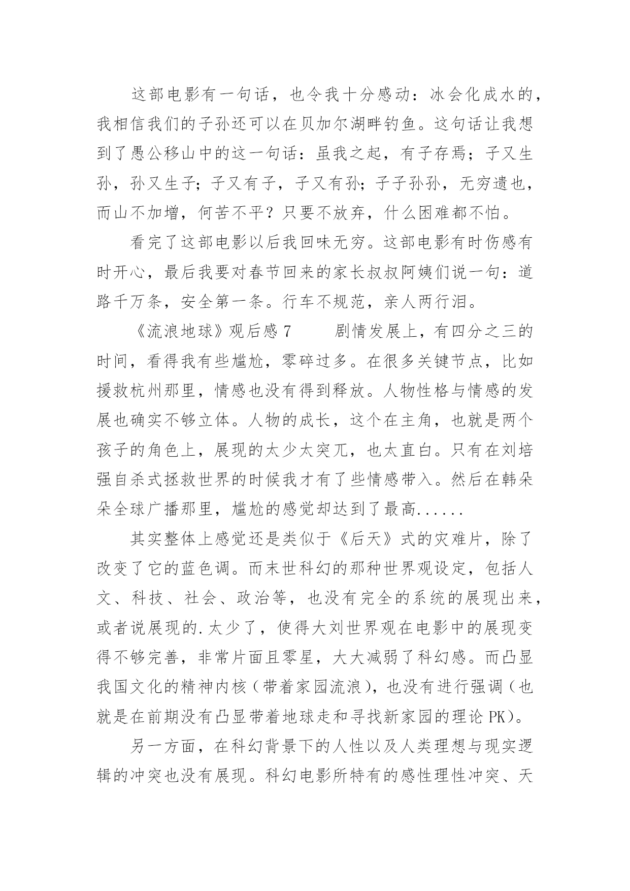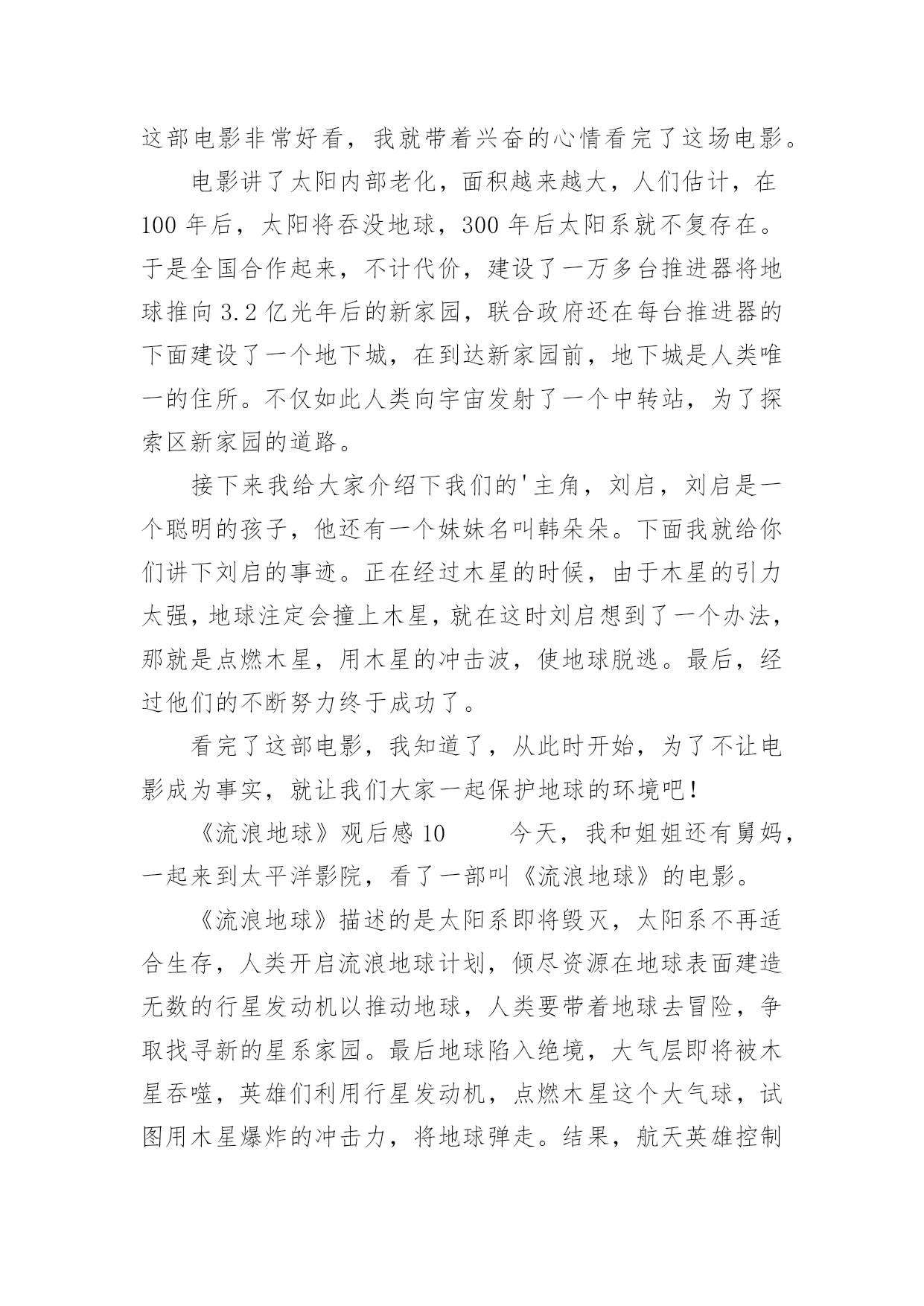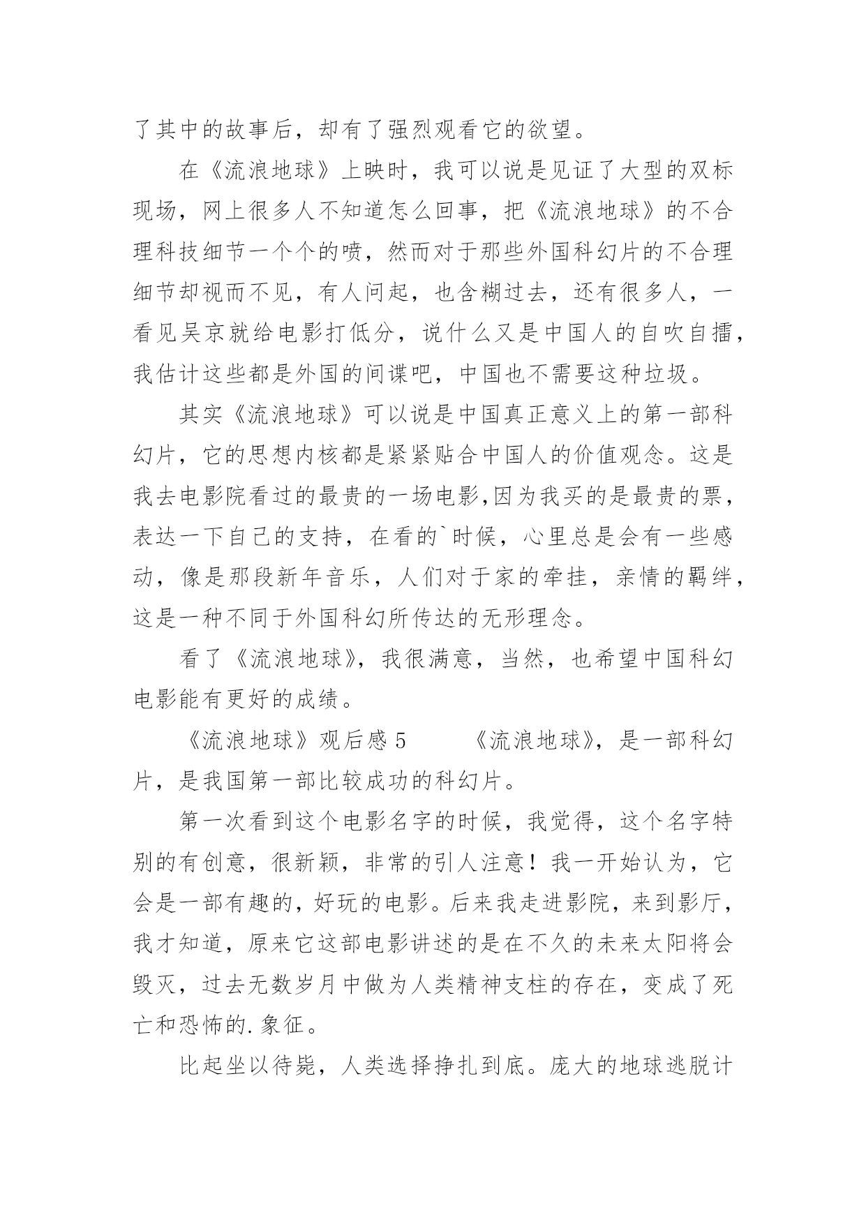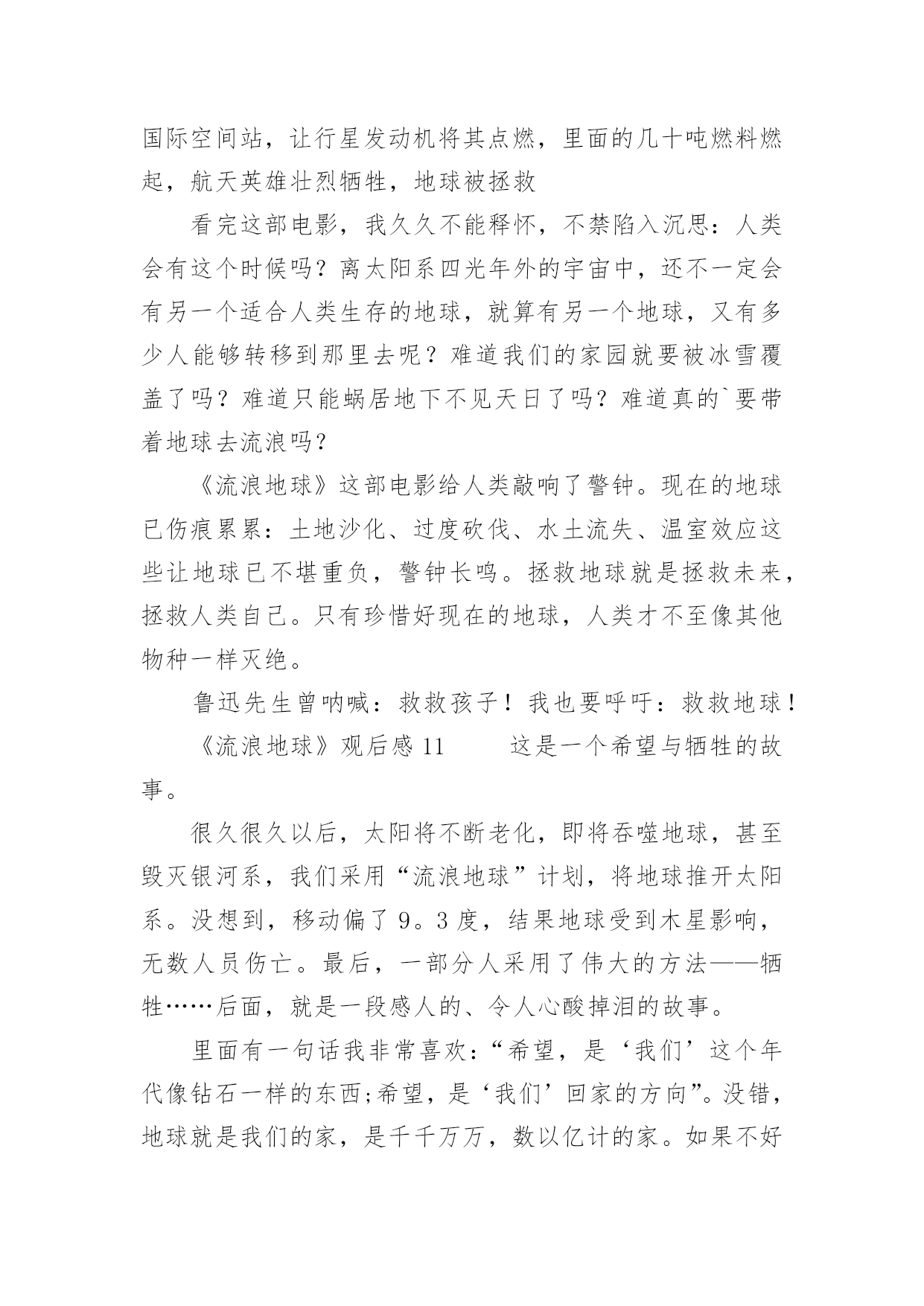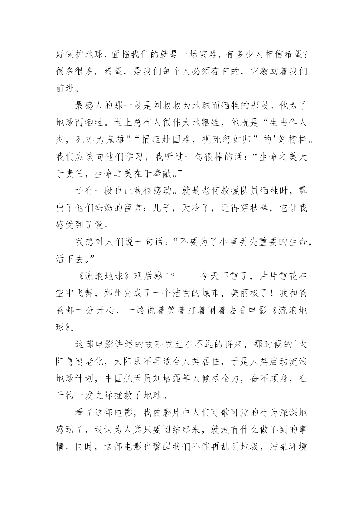 《流浪地球》观后感《流浪地球》观后感认真看完一部作品以后,相信大家的视野一定开拓了不少吧,这时候,最关键的观后感怎么能落下!现在你是否对观后感一筹莫展呢?以下是小编为大家整理的《流浪地球》观后感,欢迎大家分享。《流浪地球》观后感1太棒了!刘慈欣的小说终于拍成电影啦!大年初二,我和爸爸妈妈一起观看了国产第一部科幻电影《流浪地球》,心情十分激动。《流浪地球》讲了一个脑洞十分大的故事。未来的某一天,人们发现太阳在急速老化,快要炸了,人类唯一生存的办法就是逃离太阳系。最近的适合居住的星系是4.2光年外的比邻星(哦,也就是三体人的故乡)于是,人类建造了1万个行星发动机,遍布世界各地,这样就能把地球推离太阳系。但是把地球搬家的步骤很繁琐,总体需要五个步骤,人们把这五步分别称为刹车时代、逃逸时代、流浪时代Ⅰ(加速)、流浪时代Ⅱ(减速)、新太阳时代—这就是“流浪地球计划。”完成这个计划需要经过2500年的时间,整整100代人。人类为了生存,艰难前行。但危险马上来临了……我们是否有勇气,带着地球去流浪?影片的'最后这句话让我感动流泪:不论人类历史导向何处,我们决定,选择希望!看完影片后会发现,原来,不是所有的主角都是贯穿全剧的英雄,不是所有的努力都会有成功的结果,也不是所有失败的任务就彻底没戏了,更不是说拯救地球只是靠着谁的一腔热血和激情就可以办得到。在《流浪地球》里我们看到了一种理念,一种将全人类团结在一起“集中力量办大事”的理念。我们也看到一种一直期待的场景,全球各地区各民族的人们,为了同一个目标“让地球和人类活下去”,团结在一起。《流浪地球》观后感2寒假里,我看了一个名叫《流浪地球》的电影,描述了太阳系即将毁灭。人类在地球表面建造出巨大的推进器,寻找新家园,然而宇宙之路危机四伏,为了拯救地球,为了人民能再漫长的2500年。后抵达新家园《流浪地球》时代的年轻人挺身挺身而出,展开争分夺秒生死之战的故事。在《流浪地球》里的人物有:刘培强国际空间站中的中国航天员,因为执行任务,使得孩子的成长过程中缺少陪伴,导致父子关系疏远。韩子昂刘启的姥爷,他很宠爱孙子孙女,虽然这两个孩子特别淘气,不让人省心,但是他为了让孩子们能够在恶劣的环境中感受到家的情感,付出了自己的全部。王磊一名军人,是救援分队的队长,有着很强的使命感,他的工作是带领着救援队去修多能推进发动机,然后在途中会遇到很多惊险的'事情,会遇到很多的困难,也有很多人放弃,但是他特别坚定自己的目标,要去完成他的任务。刘启救援小分队成员,由于幼时父亲不在身边,对于父亲的离开刘启并不理解,在长大后甚至记恨父亲。我们要珍惜和父母在的每一天。《流浪地球》观后感3今天下午队会课的时候,我们一起看了一个电影,叫做《流浪地球》。这部电影讲的是:太阳持续老化,科学家们预计300年后太阳将吞没整个太阳系。全球花巨资做了几百万座发动机,想要将地球带离太阳系。刘启他爸爸去了航空部,负责为地球勘察动向。刘启则和他妹妹韩朵朵一起找到一哥,要了两个保护服。经过一系列事情,地球终于逃离了太阳系。联合国将这次行动命名为“流浪地球计划”。在这部电影中,刘启他爸爸和他爷爷全都牺牲了,但刘启没有放弃。他突发异想,在大家的帮助下,这个想象成为了现实。最后,地球继续逃脱,预计20xx年后将会到达另一个星系。主人公刘启十分勇敢,他不畏艰难,在重要关头十分镇定,起了超级大的作用。他为了拯救地球,不惜牺牲自己的生命。当然,韩朵朵也起了十分大的作用。她利用全球播报召集来了许多救援队,来一起帮忙“撞针”。最后,他们成为了救援队的.一员。刘启与韩朵朵,还有他们的爸爸,都十分伟大。如果没有刘启的那一决定,推动器就不可能发射火焰;如果没有韩朵朵那几句话,救援队就不可能来帮忙;如果没有刘启他爸爸选择牺牲那一决定,木星就不可能被点燃!我们要学习他们的精神,不怕困难,任何时候都要镇定!《流浪地球》观后感4在《流浪地球》电影出来前,其实我根本不知道这是什么,我也不是科幻迷,但当我了解了其中的故事后,却有了强烈观看它的欲望。在《流浪地球》上映时,我可以说是见证了大型的双标现场,网上很多人不知道怎么回事,把《流浪地球》的不合理科技细节一个个的喷,然而对于那些外国科幻片的不合理细节却视而不见,有人问起,也含糊过去,还有很多人,一看见吴京就给电影打低分,说什么又是中国人的自吹自擂,我估计这些都是外国的间谍吧,中国也不需要这种垃圾。其实《流浪地球》可以说是中国真正意义上的第一部科幻片,它的思想内核都是紧紧贴合中国人的价值观念。这是我去电影院看过的最贵的一场电影,因为我买的是最贵的票,表达一下自己的支持,在看的`时候,心里总是会有一些感动,像是那段新年音乐,人们对于家的牵挂,亲情的羁绊,这是一种不同于外国科幻所传达的无形理念。看了《流浪地球》,我很满意,当然,也希望中国科