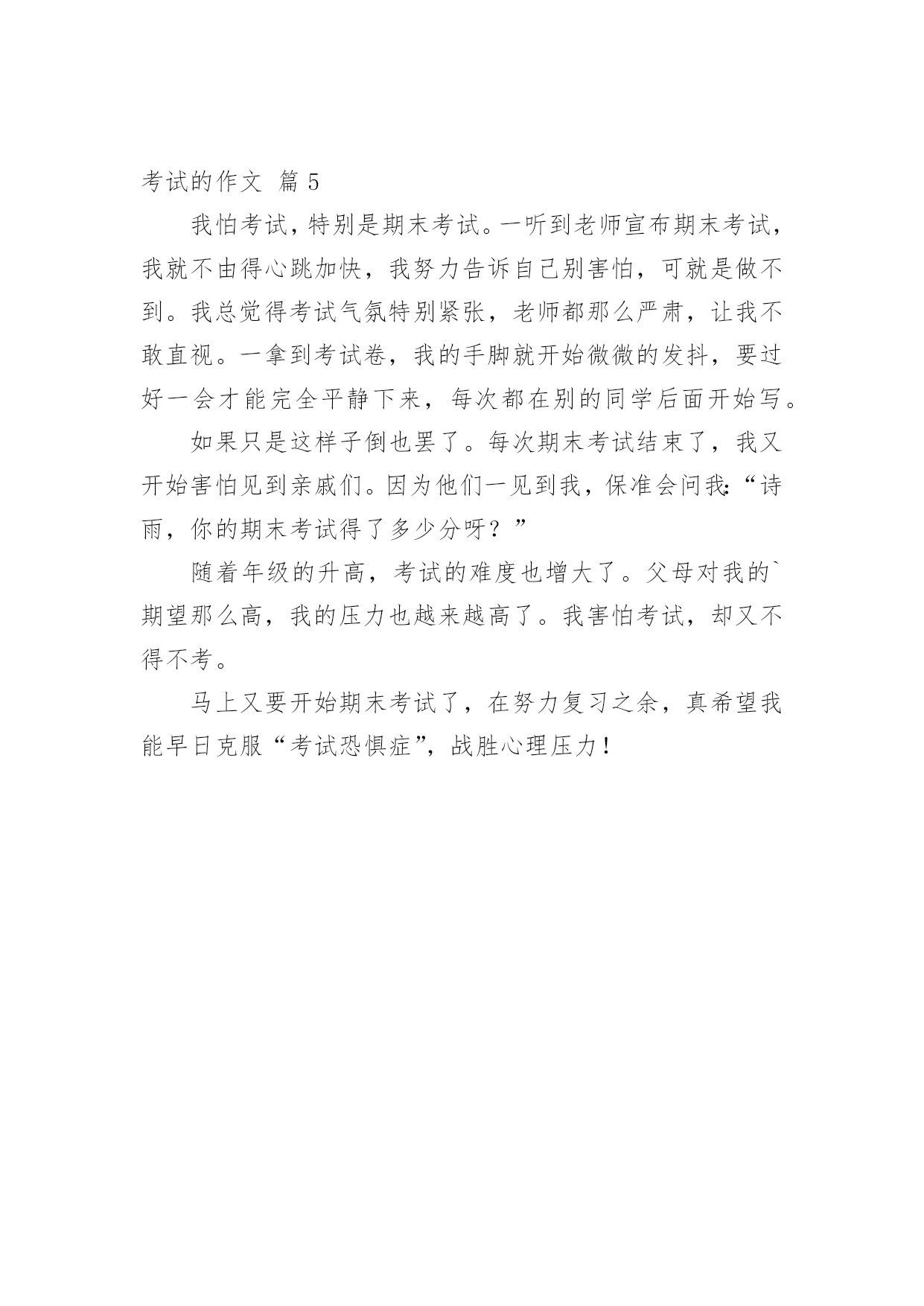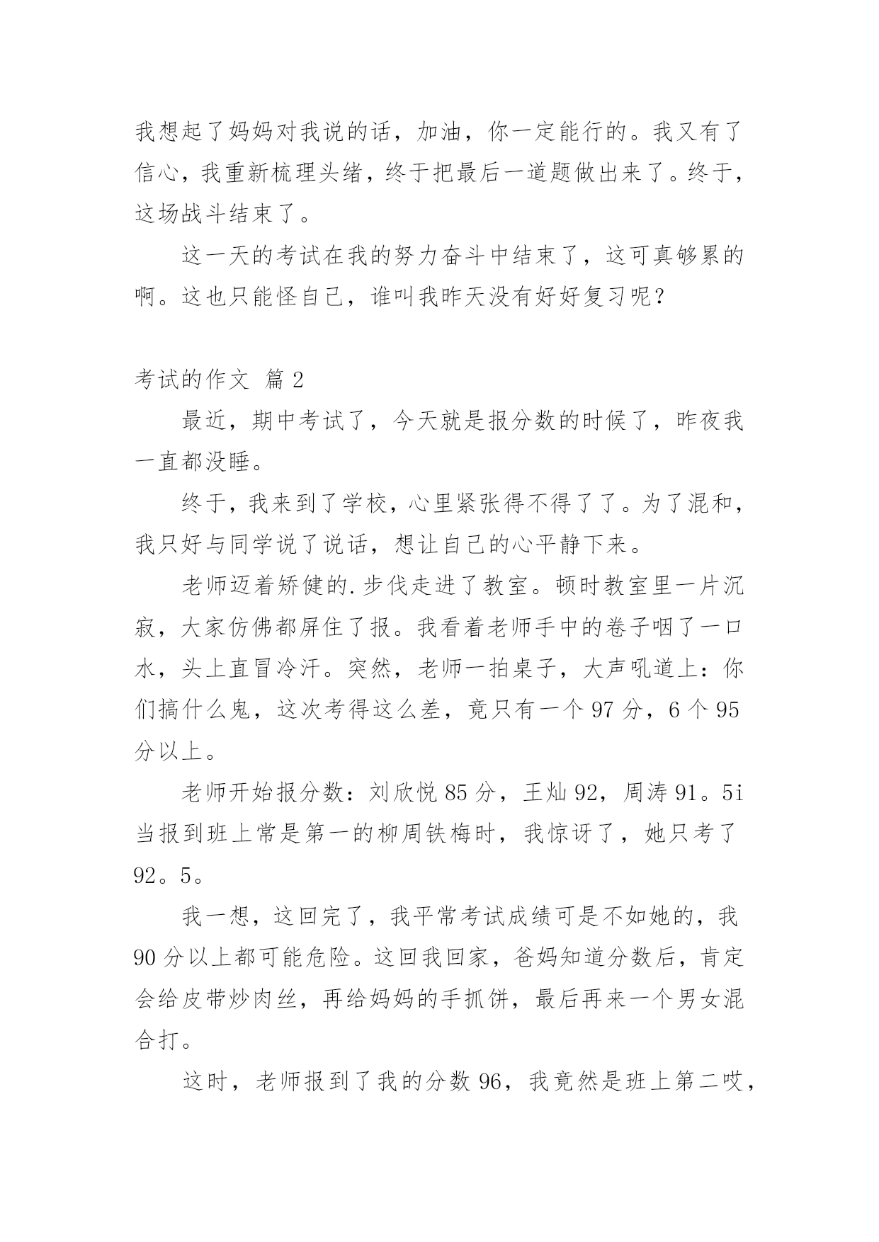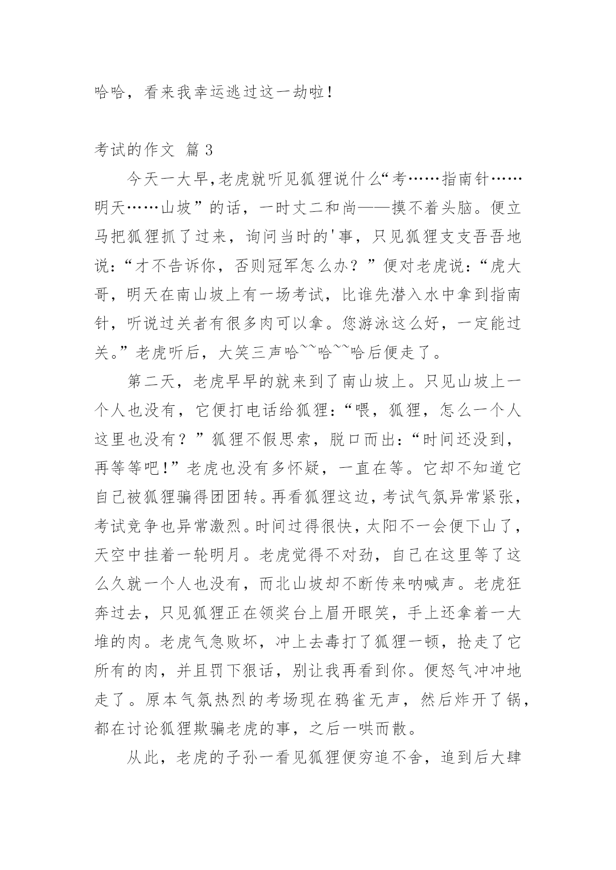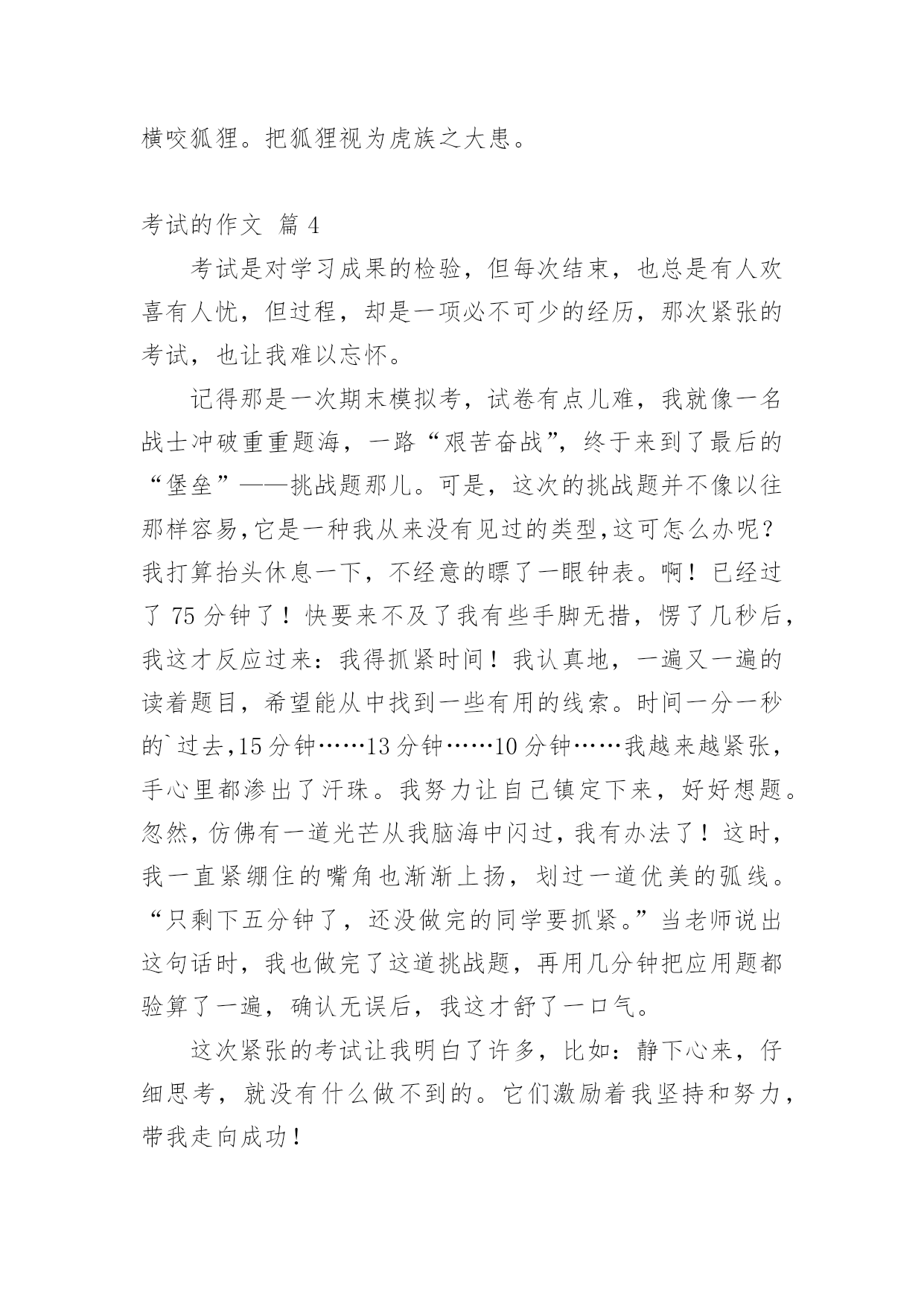 考试的作文考试的作文(实用)在学习、工作或生活中,大家都写过作文吧,作文是从内部言语向外部言语的过渡,即从经过压缩的简要的、自己能明白的语言,向开展的、具有规范语法结构的、能为他人所理解的外部语言形式的转化。怎么写作文才能避免踩雷呢?下面是小编为大家收集的考试的作文5篇,仅供参考,欢迎大家阅读。考试的作文篇1我经历过了许多事情,但是在我的记忆长河里,许多事情都已经淡忘了,只有那一件事令我记忆犹新。那一天,刚好要摸底考试。本来老师提前说了的,要我们回去好好复习,可是我却忘记了。我在路上努力的想着,把昨天玩游戏的时间补回来,我祈求时间老人走慢一点,可是,时间老人偏偏和我作对,平常半个小时才走完的路,今天一下子就走完了。我怀着忐忑不安的心情来到学校,走进教室。我看见同学们有的在看书,有的在聊天,有的在追赶打闹。要考试了,我的心怦怦地跳着,监考老师是一个和蔼的女老师,我的心稍微放松了一点,试卷发下来了,前面的几题简单,后面的`题目越做越难,我得到的都是俩角模棱的答案,我终于做到最后一题了,我着么也想不出来,我紧张极了,这时候,我想起了妈妈对我说的话,加油,你一定能行的。我又有了信心,我重新梳理头绪,终于把最后一道题做出来了。终于,这场战斗结束了。这一天的考试在我的努力奋斗中结束了,这可真够累的啊。这也只能怪自己,谁叫我昨天没有好好复习呢?考试的作文篇2最近,期中考试了,今天就是报分数的时候了,昨夜我一直都没睡。终于,我来到了学校,心里紧张得不得了了。为了混和,我只好与同学说了说话,想让自己的心平静下来。老师迈着矫健的.步伐走进了教室。顿时教室里一片沉寂,大家仿佛都屏住了报。我看着老师手中的卷子咽了一口水,头上直冒冷汗。突然,老师一拍桌子,大声吼道上:你们搞什么鬼,这次考得这么差,竟只有一个97分,6个95分以上。老师开始报分数:刘欣悦85分,王灿92,周涛91。5i当报到班上常是第一的柳周铁梅时,我惊讶了,她只考了92。5。我一想,这回完了,我平常考试成绩可是不如她的,我90分以上都可能危险。这回我回家,爸妈知道分数后,肯定会给皮带炒肉丝,再给妈妈的手抓饼,最后再来一个男女混合打。这时,老师报到了我的分数96,我竟然是班上第二哎,哈哈,看来我幸运逃过这一劫啦!考试的作文篇3今天一大早,老虎就听见狐狸说什么“考……指南针……明天……山坡”的话,一时丈二和尚——摸不着头脑。便立马把狐狸抓了过来,询问当时的'事,只见狐狸支支吾吾地说:“才不告诉你,否则冠军怎么办?”便对老虎说:“虎大哥,明天在南山坡上有一场考试,比谁先潜入水中拿到指南针,听说过关者有很多肉可以拿。您游泳这么好,一定能过关。”老虎听后,大笑三声哈~~哈~~哈后便走了。第二天,老虎早早的就来到了南山坡上。只见山坡上一个人也没有,它便打电话给狐狸:“喂,狐狸,怎么一个人这里也没有?”狐狸不假思索,脱口而出:“时间还没到,再等等吧!”老虎也没有多怀疑,一直在等。它却不知道它自己被狐狸骗得团团转。再看狐狸这边,考试气氛异常紧张,考试竞争也异常激烈。时间过得很快,太阳不一会便下山了,天空中挂着一轮明月。老虎觉得不对劲,自己在这里等了这么久就一个人也没有,而北山坡却不断传来呐喊声。老虎狂奔过去,只见狐狸正在领奖台上眉开眼笑,手上还拿着一大堆的肉。老虎气急败坏,冲上去毒打了狐狸一顿,抢走了它所有的肉,并且罚下狠话,别让我再看到你。便怒气冲冲地走了。原本气氛热烈的考场现在鸦雀无声,然后炸开了锅,都在讨论狐狸欺骗老虎的事,之后一哄而散。从此,老虎的子孙一看见狐狸便穷追不舍,追到后大肆横咬狐狸。把狐狸视为虎族之大患。考试的作文篇4考试是对学习成果的检验,但每次结束,也总是有人欢喜有人忧,但过程,却是一项必不可少的经历,那次紧张的考试,也让我难以忘怀。记得那是一次期末模拟考,试卷有点儿难,我就像一名战士冲破重重题海,一路“艰苦奋战”,终于来到了最后的“堡垒”——挑战题那儿。可是,这次的挑战题并不像以往那样容易,它是一种我从来没有见过的类型,这可怎么办呢?我打算抬头休息一下,不经意的瞟了一眼钟表。啊!已经过了75分钟了!快要来不及了我有些手脚无措,愣了几秒后,我这才反应过来:我得抓紧时间!我认真地,一遍又一遍的读着题目,希望能从中找到一些有用的线索。时间一分一秒的`过去,15分钟……13分钟……10分钟……我越来越紧张,手心里都渗出了汗珠。我努力让自己镇定下来,好好想题。忽然,仿佛有一道光芒从我脑海中闪过,我有办法了!这时,我一直紧绷住的嘴角也渐渐上扬,划过一道优美的弧线。“只剩下五分钟了,还没做完的同学要抓紧。”当老师说出这句话时,我也做完了这道挑战题,再用几分钟把应用题都验算了一遍,确认无误后,我这才舒了一口气。这次紧张的考试让我明白了许多,比如:静下心来,仔细思考,就没有什么做不到的。它们