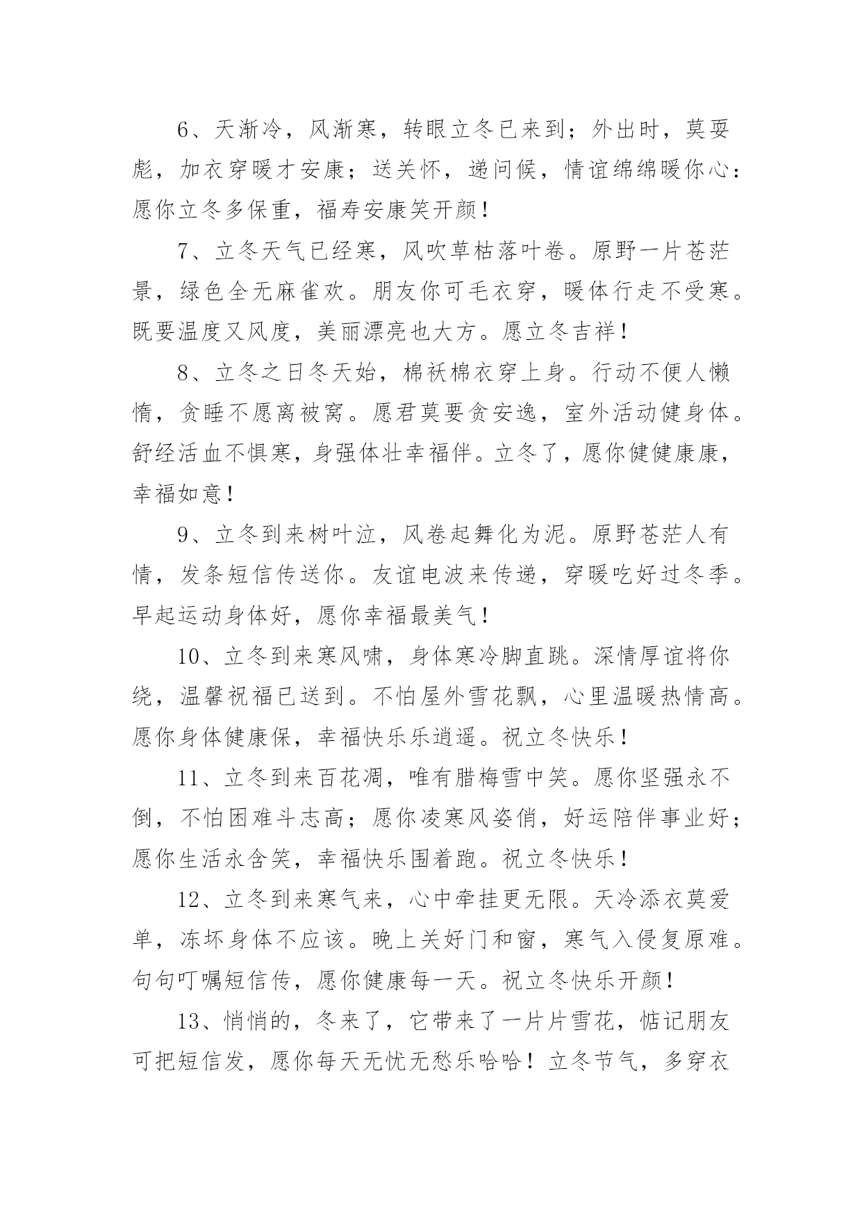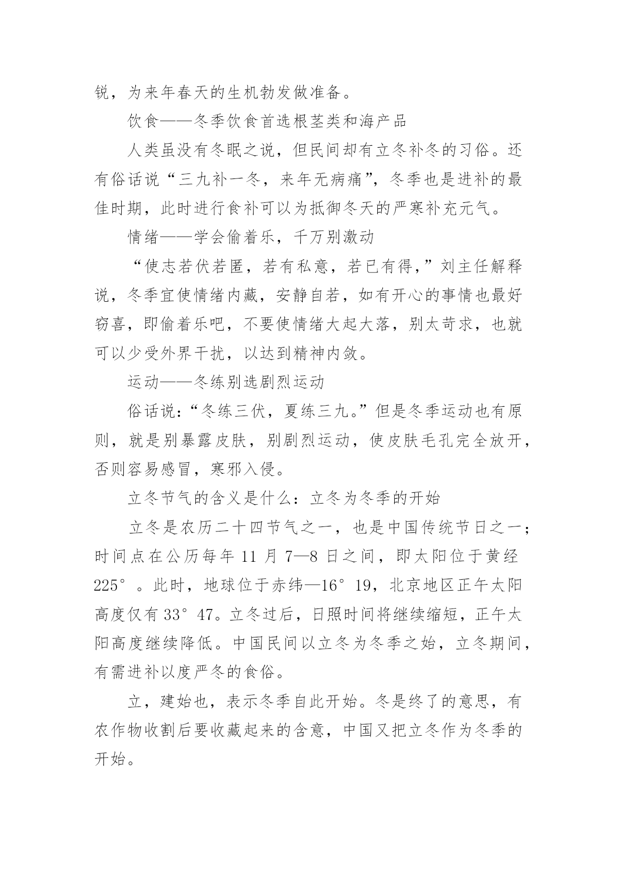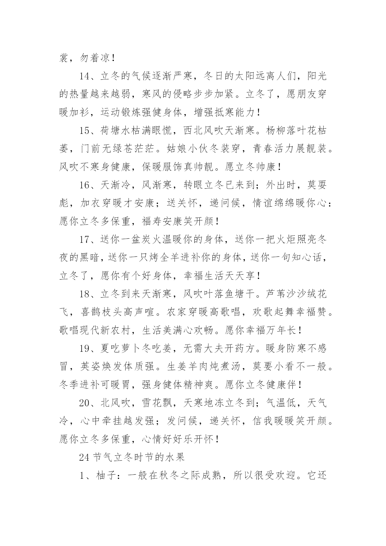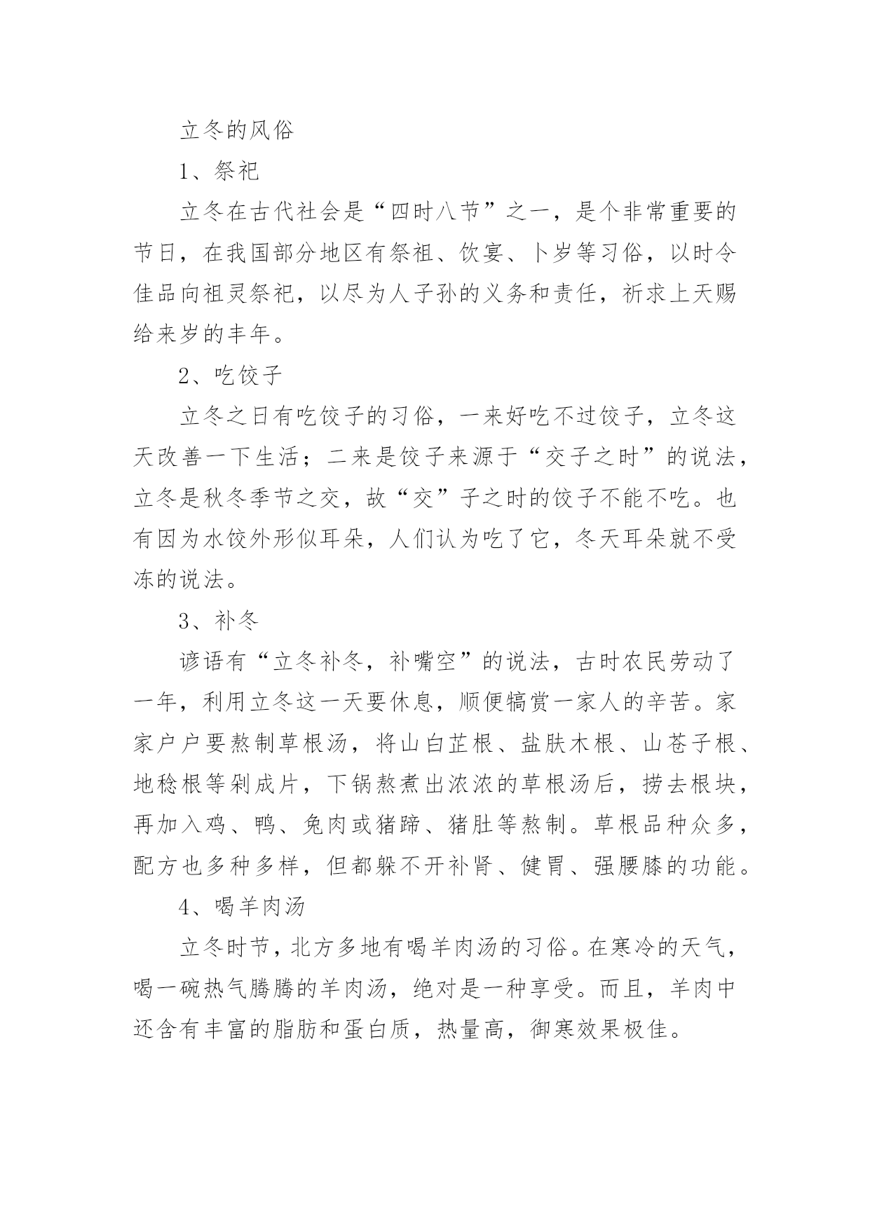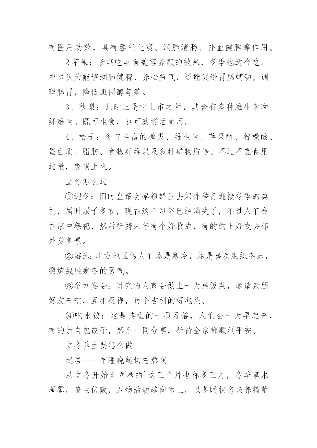 立冬手抄报资料立冬手抄报资料在学习和工作中,大家一定没少看到经典的手抄报吧,手抄报要求字体要清楚、美观大方。那么什么样的手抄报才是好的手抄报呢?以下是小编收集整理的立冬手抄报资料,希望能够帮助到大家。立冬手抄报资料立冬节气祝福语1、天冷云为裳,地冷叶盖上,鸟冷南迁忙,立冬又来访,风起气温降,友情做针线,祝福化棉衫,丝丝暖心田,祝你身体健!2、岁月如风,从秋走到冬。雨雪不能把你的好运掩藏,冰霜无法将你的快乐封冻,又是立冬到,送你一件幸福霓裳,愿你暖意融融!3、草青黄,寒风狂,叶落树两旁;花带露,月如霜,夜雨思念长;立冬到,你登场,今晚帮你来暖床;别误会,我说的是热水袋!4、北风是寒的,驱不散炽热的情感;天气是冷的,挡不住纯厚的情谊;立冬到了,阻不断心灵的问候。惟愿你时刻安好,心情好好,天天幸福!5、聆听冬的步履,落叶飘红了思绪;流水替我寄语,幸福正在等你;清霜冷絮铺地,凝聚美好情意;当问候轻轻响起,声声祝福传递。立冬送你无尽惬意!6、天渐冷,风渐寒,转眼立冬已来到;外出时,莫耍彪,加衣穿暖才安康;送关怀,递问候,情谊绵绵暖你心:愿你立冬多保重,福寿安康笑开颜!7、立冬天气已经寒,风吹草枯落叶卷。原野一片苍茫景,绿色全无麻雀欢。朋友你可毛衣穿,暖体行走不受寒。既要温度又风度,美丽漂亮也大方。愿立冬吉祥!8、立冬之日冬天始,棉袄棉衣穿上身。行动不便人懒惰,贪睡不愿离被窝。愿君莫要贪安逸,室外活动健身体。舒经活血不惧寒,身强体壮幸福伴。立冬了,愿你健健康康,幸福如意!9、立冬到来树叶泣,风卷起舞化为泥。原野苍茫人有情,发条短信传送你。友谊电波来传递,穿暖吃好过冬季。早起运动身体好,愿你幸福最美气!10、立冬到来寒风啸,身体寒冷脚直跳。深情厚谊将你绕,温馨祝福已送到。不怕屋外雪花飘,心里温暖热情高。愿你身体健康保,幸福快乐乐逍遥。祝立冬快乐!11、立冬到来百花凋,唯有腊梅雪中笑。愿你坚强永不倒,不怕困难斗志高;愿你凌寒风姿俏,好运陪伴事业好;愿你生活永含笑,幸福快乐围着跑。祝立冬快乐!12、立冬到来寒气来,心中牵挂更无限。天冷添衣莫爱单,冻坏身体不应该。晚上关好门和窗,寒气入侵复原难。句句叮嘱短信传,愿你健康每一天。祝立冬快乐开颜!13、悄悄的,冬来了,它带来了一片片雪花,惦记朋友可把短信发,愿你每天无忧无愁乐哈哈!立冬节气,多穿衣裳,勿着凉!14、立冬的气候逐渐严寒,冬日的太阳远离人们,阳光的热量越来越弱,寒风的侵略步步加紧。立冬了,愿朋友穿暖加衫,运动锻炼强健身体,增强抵寒能力!15、荷塘水枯满眼慌,西北风吹天渐寒。杨柳落叶花枯萎,门前无绿苍茫茫。姑娘小伙冬装穿,青春活力展靓装。风吹不寒身健康,保暖服饰真帅靓。愿立冬帅康!16、天渐冷,风渐寒,转眼立冬已来到;外出时,莫耍彪,加衣穿暖才安康;送关怀,递问候,情谊绵绵暖你心:愿你立冬多保重,福寿安康笑开颜!17、送你一盆炭火温暖你的身体,送你一把火炬照亮冬夜的黑暗,送你一只烤全羊进补你的身体,送你一句知心话,立冬了,愿你有个好身体,幸福生活天天享!18、立冬到来天渐寒,风吹叶落鱼塘干。芦苇沙沙绒花飞,喜鹊枝头高声喧。农家穿暖高歌唱,欢歌起舞幸福赞。歌唱现代新农村,生活美满心欢畅。愿你幸福万年长!19、夏吃萝卜冬吃姜,无需大夫开药方。暖身防寒不感冒,英姿焕发体质强。生姜羊肉炖煮汤,莫要小看不一般。冬季进补可暖胃,强身健体精神爽。愿你立冬健康伴!20、北风吹,雪花飘,天寒地冻立冬到;气温低,天气冷,心中牵挂越发强;发问候,递关怀,信我暖暖笑开颜。愿你立冬多保重,心情好好乐开怀!24节气立冬时节的水果1、柚子:一般在秋冬之际成熟,所以很受欢迎。它还有医用功效,具有理气化痰、润肺清肠、补血健脾等作用。2苹果:长期吃具有美容养颜的效果,冬季也适合吃。中医认为能够润肺健脾、养心益气,还能促进胃肠蠕动,调理肠胃,降低胆固醇等等。3、秋梨:此时正是它上市之际,其含有多种维生素和纤维素。既可生食,也可蒸煮后食用。4、桔子:含有丰富的糖类、维生素、苹果酸、柠檬酸、蛋白质、脂肪、食物纤维以及多种矿物质等。不过不宜食用过量,警惕上火。立冬怎么过①迎冬:旧时皇帝会率领群臣去郊外举行迎接冬季的典礼,届时赐予冬衣,现在这个习俗已经消失了,不过人们会在家中祭祀,然后祈祷来年有个好收成,有的约上好友去郊外赏冬景。②游泳:北方地区的人们越是寒冷,越是喜欢组织冬泳,锻炼战胜寒冬的勇气。③举办宴会:讲究的人家会做上一大桌饭菜,邀请亲朋好友来吃,互相祝福,讨个吉利的好兆头。④吃水饺:这是典型的一项习俗,人们会一大早起来,有的亲自包饺子,然后一同分享,祈祷全家都顺利平安。立冬养生要怎么做起居——早睡晚起切忌熬夜从立冬开始至立春的`这三个月也称冬三月,冬季草木凋零,蛰虫伏藏,万物活动趋向休止,以冬眠状态来养精蓄锐,为来年春天的
