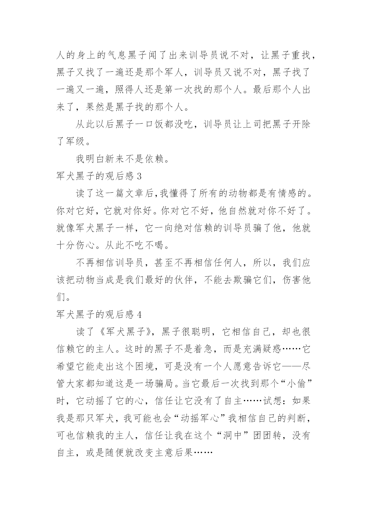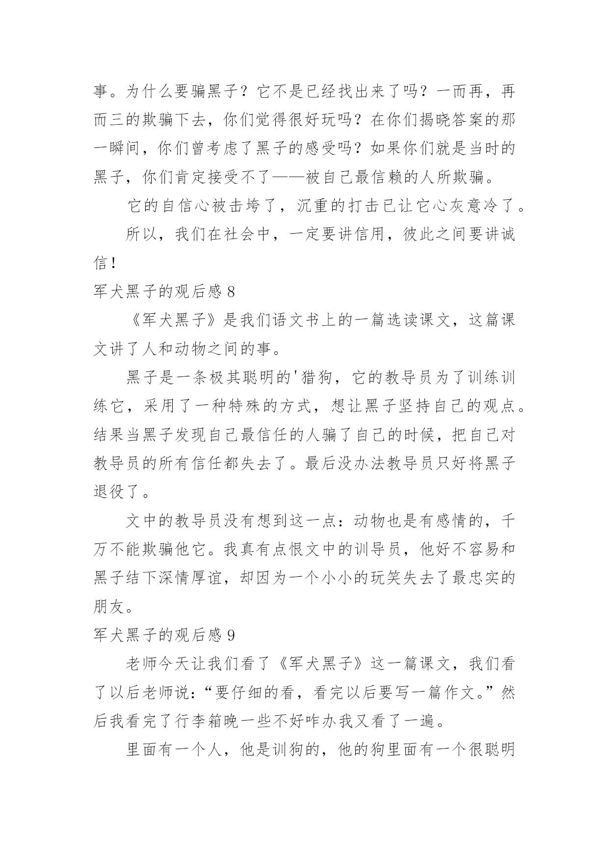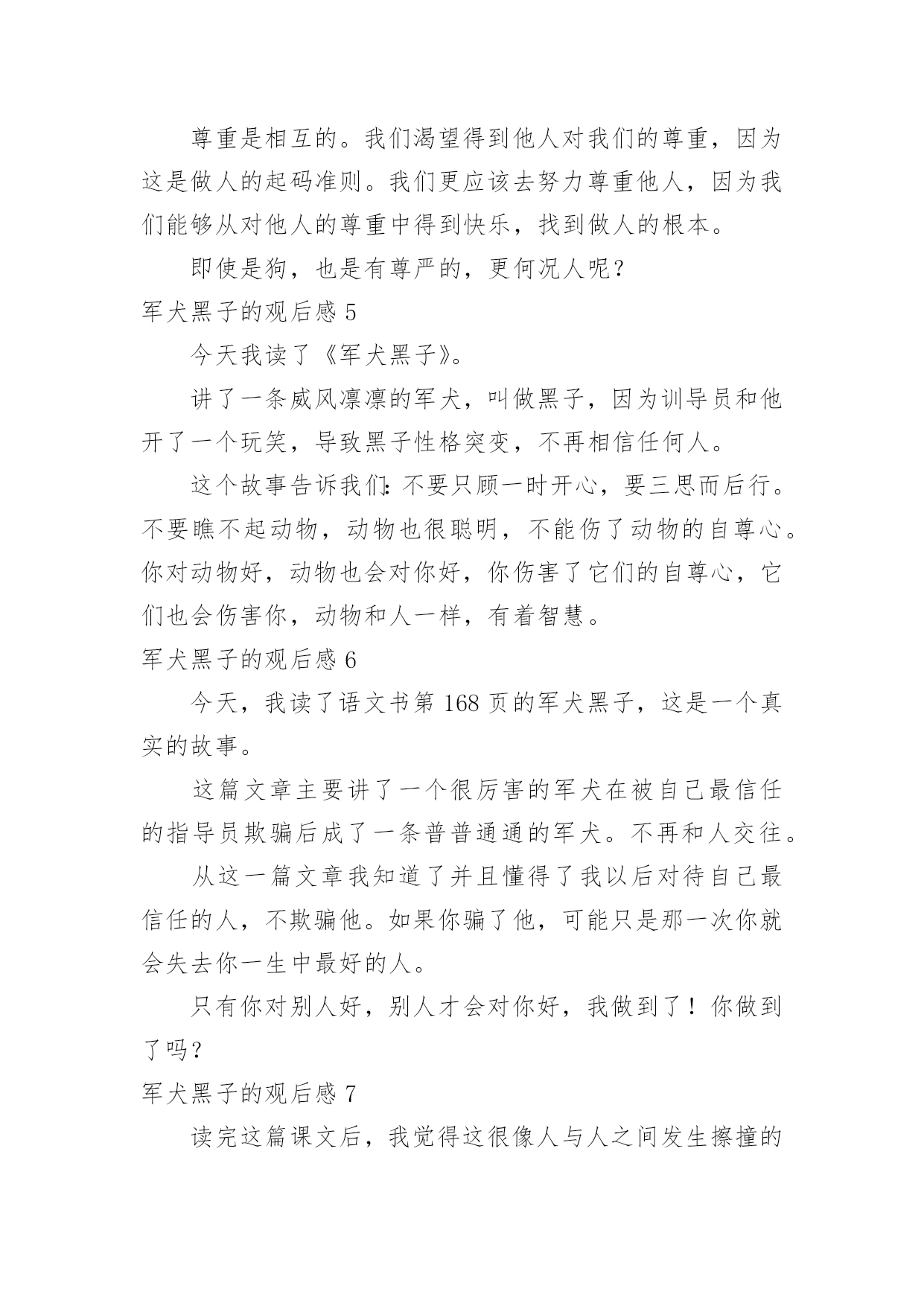 军犬黑子的观后感军犬黑子的观后感当认真看完一部影视作品后,相信大家的视野一定开拓了不少吧,需要写一篇观后感好好地作记录了。那么你会写观后感吗?下面是小编帮大家整理的军犬黑子的观后感,欢迎阅读,希望大家能够喜欢。军犬黑子的观后感1今天我读了《军犬黑子》,读了之后我很有感受,接下来就让我来谈一下吧!军犬黑子实在军犬中最有名的军犬,一天他叫一些军人站成一排,并且让君权找到那个偷东西的军人,军犬马上就找到了那个人,可是他的主人一直说他找错了人。可是经过了军犬黑子的三分四次都找到了那个人,但是军人都说她找错了,当他放弃去找其他人的时候,引得他人哄堂大笑。这时军犬黑子丧气的跑了出去,几天几夜都没有吃饭、睡觉,最后就去世了,从中可以告诉我们,要去信任那个人。军犬黑子的观后感2今天,我读了《军犬黑子》这篇课文,黑子是一个信赖训导员的军犬,我有很多感受,让我给大家伙聊聊吧。从前有一只军犬非常聪明,有一个军人偷吃饭,训导员牵出黑子,又叫十几个人出来,让黑子用鼻子闻闻谁的身上有饭菜的味道,谁就是偷吃饭的人,黑子开始问问这几十个人的身上的气息黑子闻了出来训导员说不对,让黑子重找,黑子又找了一遍还是那个军人,训导员又说不对,黑子找了一遍又一遍,照得人还是第一次找的那个人。最后那个人出来了,果然是黑子找的那个人。从此以后黑子一口饭都没吃,训导员让上司把黑子开除了军级。我明白新来不是依赖。军犬黑子的观后感3读了这一篇文章后,我懂得了所有的动物都是有情感的。你对它好,它就对你好。你对它不好,他自然就对你不好了。就像军犬黑子一样,它一向绝对信赖的训导员骗了他,他就十分伤心。从此不吃不喝。不再相信训导员,甚至不再相信任何人,所以,我们应该把动物当成是我们最好的伙伴,不能去欺骗它们,伤害他们。军犬黑子的观后感4读了《军犬黑子》,黑子很聪明,它相信自己,却也很信赖它的主人。这时的黑子不是着急,而是充满疑惑……它希望它能走出这个困境,可是没有一个人愿意告诉它——尽管大家都知道这是一场骗局。当它最后一次找到那个“小偷”时,它动摇了它的心,信任让它没有了自主……试想:如果我是那只军犬,我可能也会“动摇军心”我相信自己的判断,可也信赖我的主人,信任让我在这个“洞中”团团转,没有自主,或是随便就改变主意后果……尊重是相互的。我们渴望得到他人对我们的尊重,因为这是做人的起码准则。我们更应该去努力尊重他人,因为我们能够从对他人的尊重中得到快乐,找到做人的根本。即使是狗,也是有尊严的,更何况人呢?军犬黑子的观后感5今天我读了《军犬黑子》。讲了一条威风凛凛的军犬,叫做黑子,因为训导员和他开了一个玩笑,导致黑子性格突变,不再相信任何人。这个故事告诉我们:不要只顾一时开心,要三思而后行。不要瞧不起动物,动物也很聪明,不能伤了动物的自尊心。你对动物好,动物也会对你好,你伤害了它们的自尊心,它们也会伤害你,动物和人一样,有着智慧。军犬黑子的观后感6今天,我读了语文书的军犬黑子,这是一个真实的故事。这篇文章主要讲了一个很厉害的军犬在被自己最信任的指导员欺骗后成了一条普普通通的军犬。不再和人交往。从这一篇文章我知道了并且懂得了我以后对待自己最信任的人,不欺骗他。如果你骗了他,可能只是那一次你就会失去你一生中最好的人。只有你对别人好,别人才会对你好,我做到了!你做到了吗?军犬黑子的观后感7读完这篇课文后,我觉得这很像人与人之间发生擦撞的事。为什么要骗黑子?它不是已经找出来了吗?一而再,再而三的欺骗下去,你们觉得很好玩吗?在你们揭晓答案的那一瞬间,你们曾考虑了黑子的感受吗?如果你们就是当时的黑子,你们肯定接受不了——被自己最信赖的人所欺骗。它的自信心被击垮了,沉重的打击已让它心灰意冷了。所以,我们在社会中,一定要讲信用,彼此之间要讲诚信!军犬黑子的观后感8《军犬黑子》是我们语文书上的一篇选读课文,这篇课文讲了人和动物之间的事。黑子是一条极其聪明的'猎狗,它的教导员为了训练训练它,采用了一种特殊的方式,想让黑子坚持自己的观点。结果当黑子发现自己最信任的人骗了自己的时候,把自己对教导员的所有信任都失去了。最后没办法教导员只好将黑子退役了。文中的教导员没有想到这一点:动物也是有感情的,千万不能欺骗他它。我真有点恨文中的训导员,他好不容易和黑子结下深情厚谊,却因为一个小小的玩笑失去了最忠实的朋友。军犬黑子的观后感9老师今天让我们看了《军犬黑子》这一篇课文,我们看了以后老师说:“要仔细的看,看完以后要写一篇作文。”然后我看完了行李箱晚一些不好咋办我又看了一遍。里面有一个人,他是训狗的,他的狗里面有一个很聪明的,那一只狗叫黑子,如果,有一个杀人凶手他如果是很臭,那给叫黑子的狗他闻这一个味道就可以就出那个劫匪。