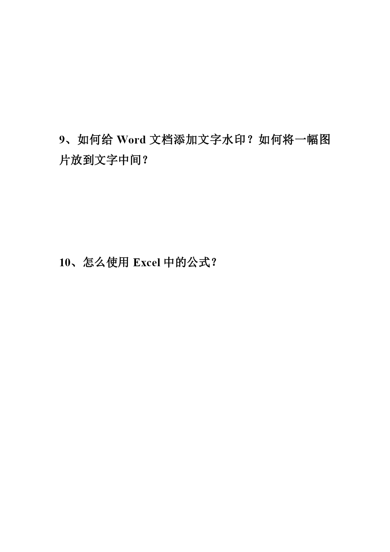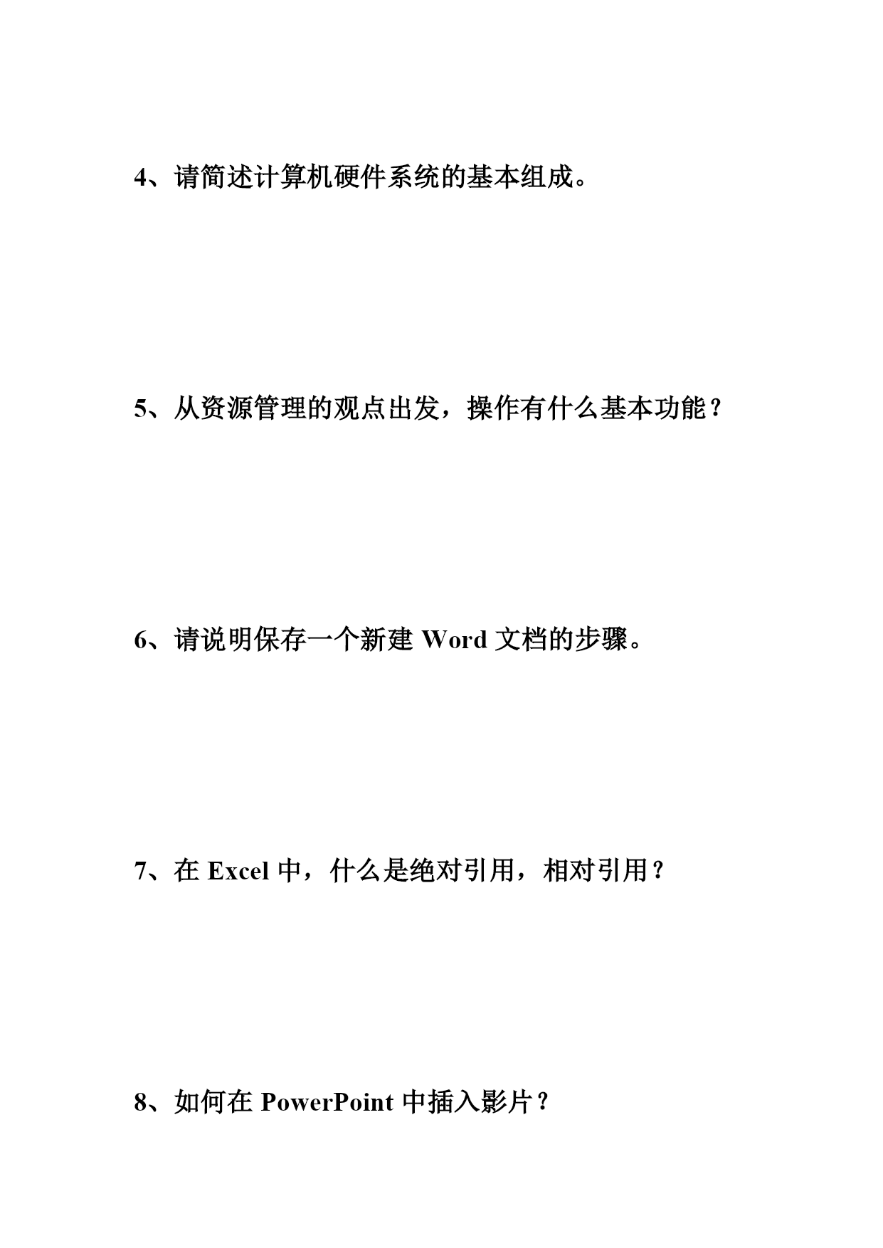 2010-2011第一学期计算机基础考试试题出题人:黄晓巧联系方式:15993650882E-mail:huxq@xcu.edu.cn学号:,专业:,姓名:1、根据电子元器件的不同计算机的发展经过哪几代?各有什么特点?2、计算机的发展趋势有哪些?计算机的应用在哪些方面?3、Windowsxp操作系统的桌面上有哪些基本图标,各有什么功能?4、请简述计算机硬件系统的基本组成。5、从资源管理的观点出发,操作有什么基本功能?6、请说明保存一个新建Word文档的步骤。7、在Excel中,什么是绝对引用,相对引用?8、如何在PowerPoint中插入影片?9、如何给Word文档添加文字水印?如何将一幅图片放到文字中间?10、怎么使用Excel中的公式?