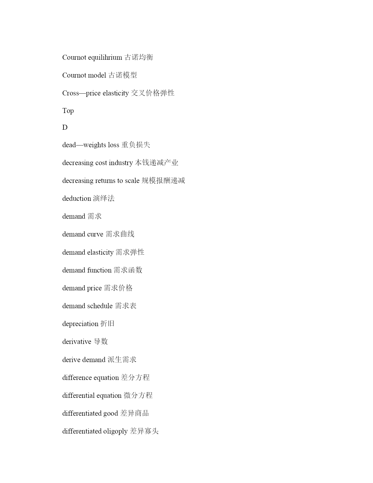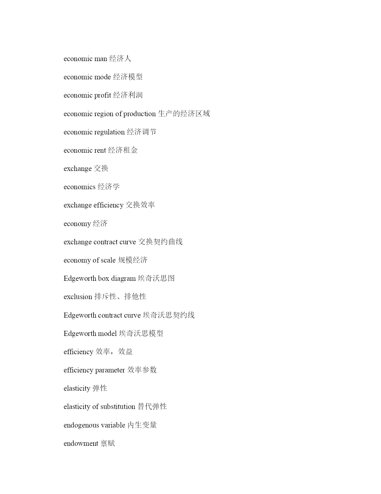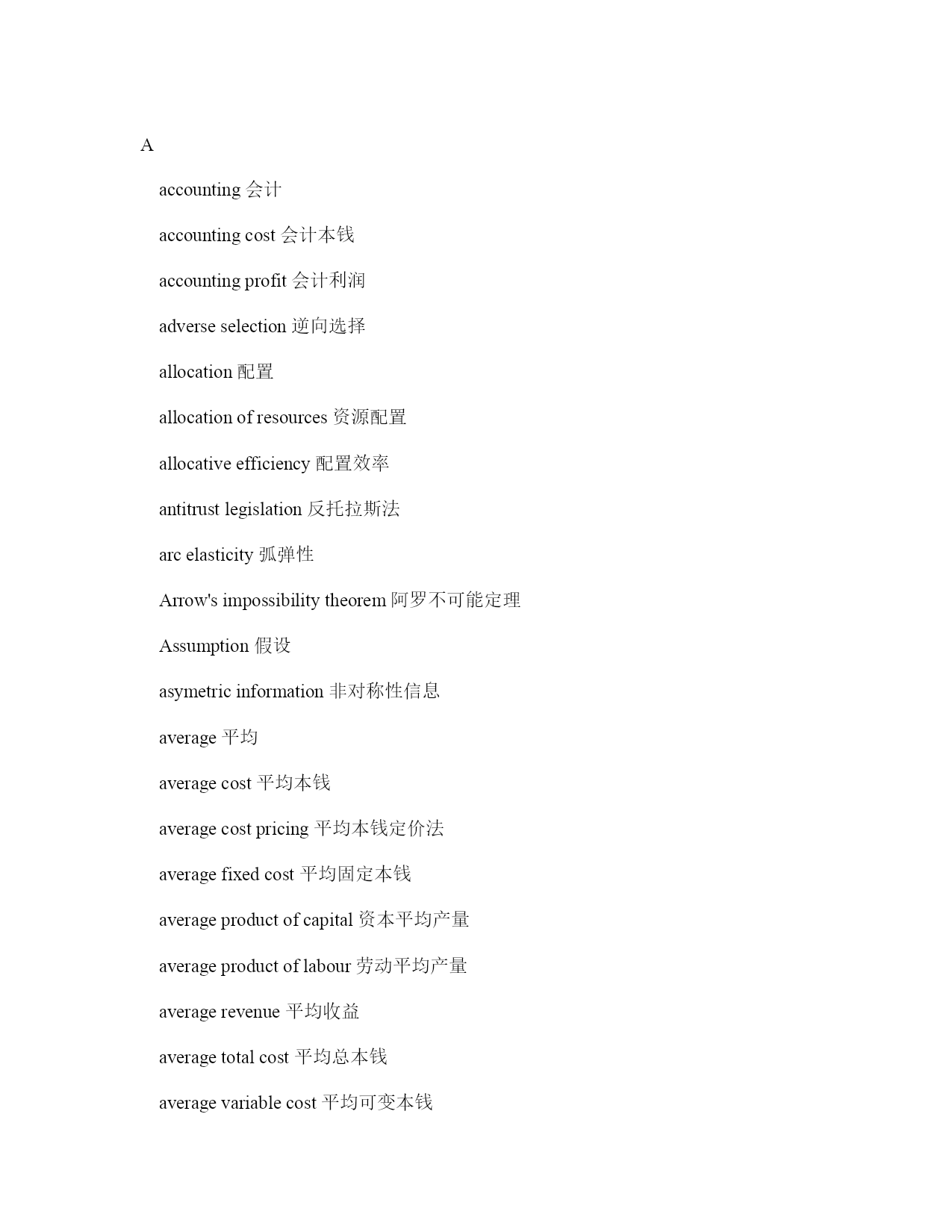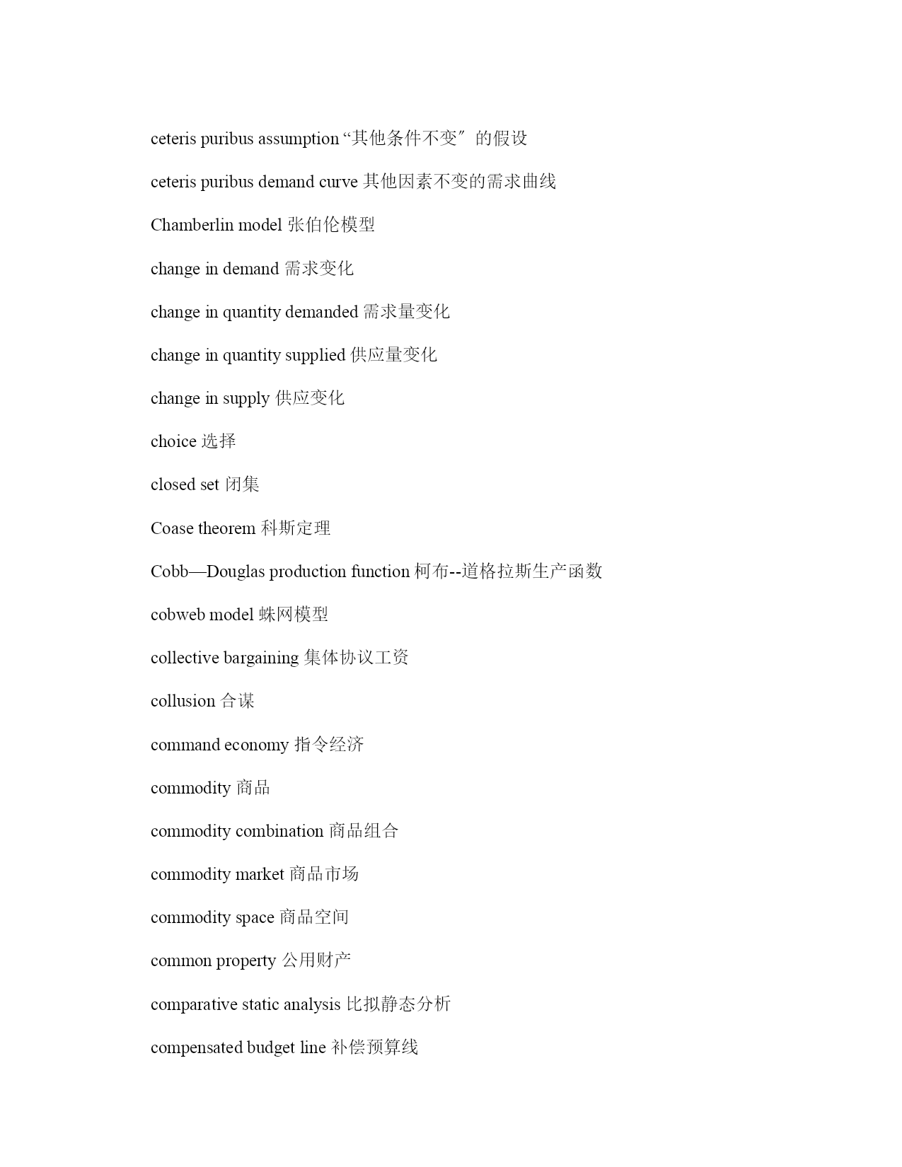 经济学英语词汇【完整版】(文档可以直接使用,也可根据实际需要修订后使用,可编辑放心下载)Aaccounting会计accountingcost会计本钱accountingprofit会计利润adverseselection逆向选择allocation配置allocationofresources资源配置allocativeefficiency配置效率antitrustlegislation反托拉斯法arcelasticity弧弹性Arrow'simpossibilitytheorem阿罗不可能定理Assumption假设asymetricinformation非对称性信息average平均averagecost平均本钱averagecostpricing平均本钱定价法averagefixedcost平均固定本钱averageproductofcapital资本平均产量averageproductoflabour劳动平均产量averagerevenue平均收益averagetotalcost平均总本钱averagevariablecost平均可变本钱TopBbarrierstoentry进入壁垒baseyear基年bilateralmonopoly双边垄断benefit收益blackmarket黑市blisspoint极乐点boundarypoint边界点breakevenpoint收支相抵点budget预算budgetconstraint预算约束budgetline预算线budgetset预算集TopCcapital资本capitalstock资本存量capitaloutputratio资本产出比率capitalism资本主义cardinalutilitytheory基数效用论cartel卡特尔ceterispuribusassumption“其他条件不变〞的假设ceterispuribusdemandcurve其他因素不变的需求曲线Chamberlinmodel张伯伦模型changeindemand需求变化changeinquantitydemanded需求量变化changeinquantitysupplied供应量变化changeinsupply供应变化choice选择closedset闭集Coasetheorem科斯定理Cobb—Douglasproductionfunction柯布--道格拉斯生产函数cobwebmodel蛛网模型collectivebargaining集体协议工资collusion合谋commandeconomy指令经济commodity商品commoditycombination商品组合commoditymarket商品市场commodityspace商品空间commonproperty公用财产comparativestaticanalysis比拟静态分析compensatedbudgetline补偿预算线compensateddemandfunction补偿需求函数compensationprinciples补偿原那么compensatingvariationinincome收入补偿变量competition竞争competitivemarket竞争性市场complementgoods互补品completeinformation完全信息completeness完备性conditionforefficiencyinexchange交换的最优条件conditionforefficiencyinproduction生产的最优条件concave凹concavefunction凹函数concavepreference凹偏好consistence一致性constantcostindustry本钱不变产业constantreturnstoscale规模报酬不变constraints约束consumer消费者consumerbehavior消费者行