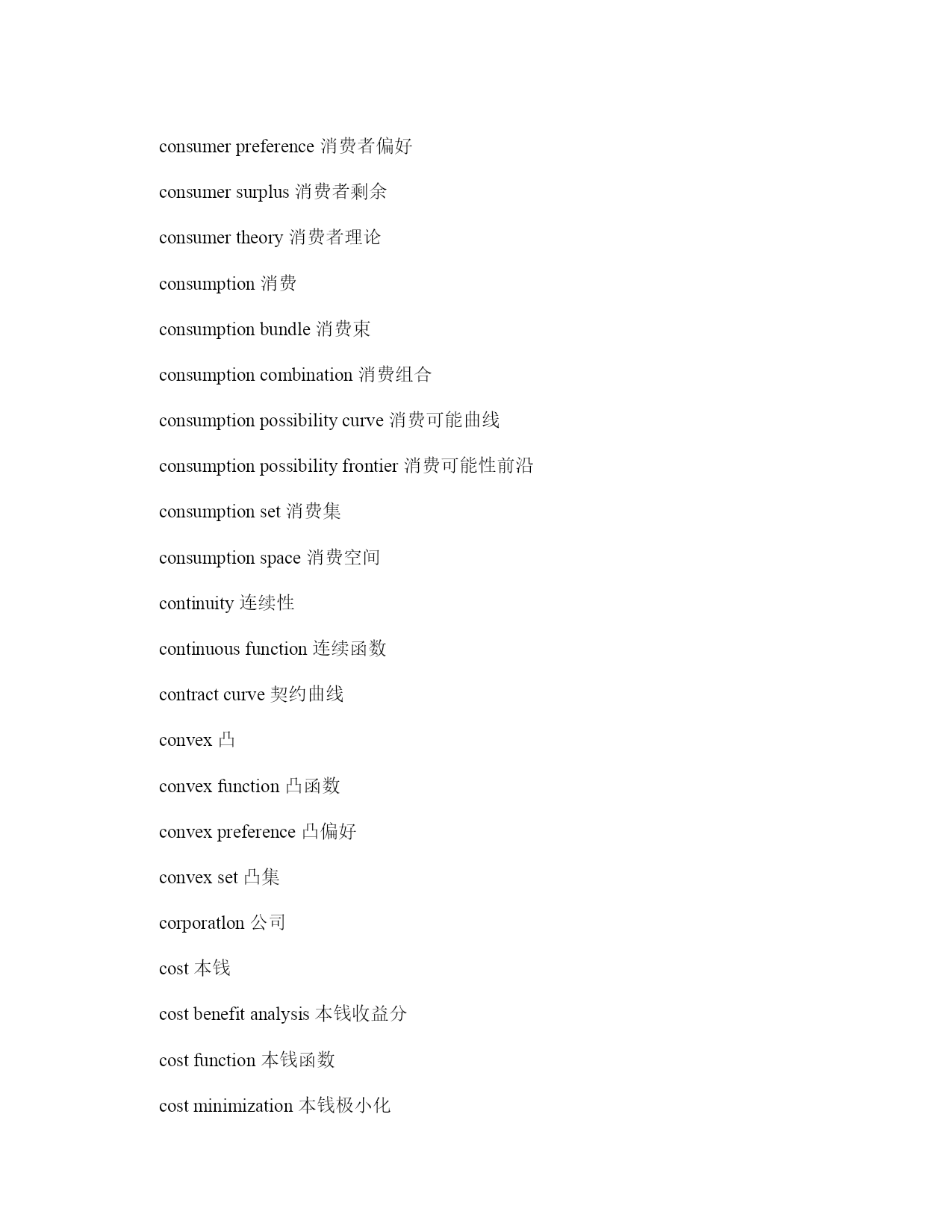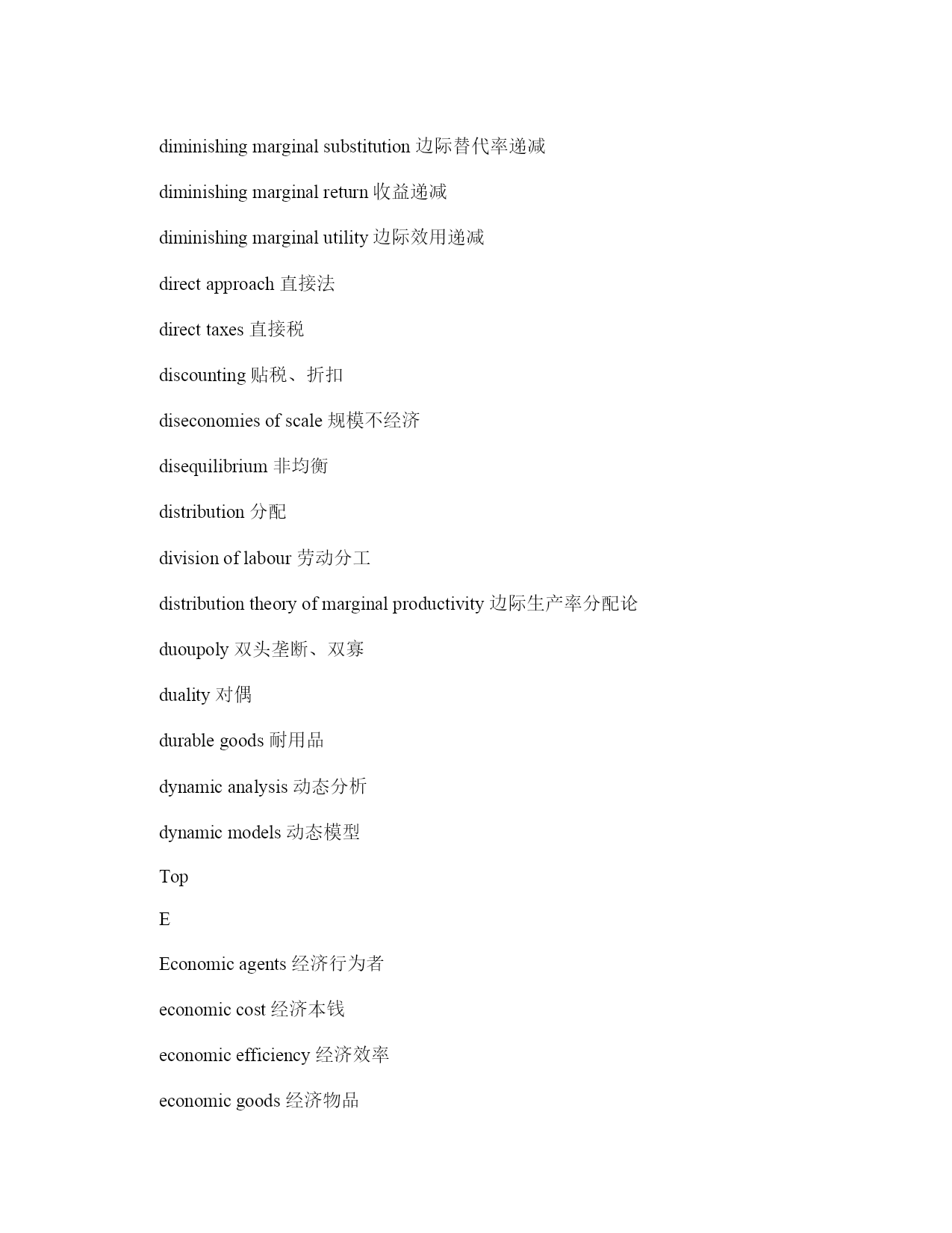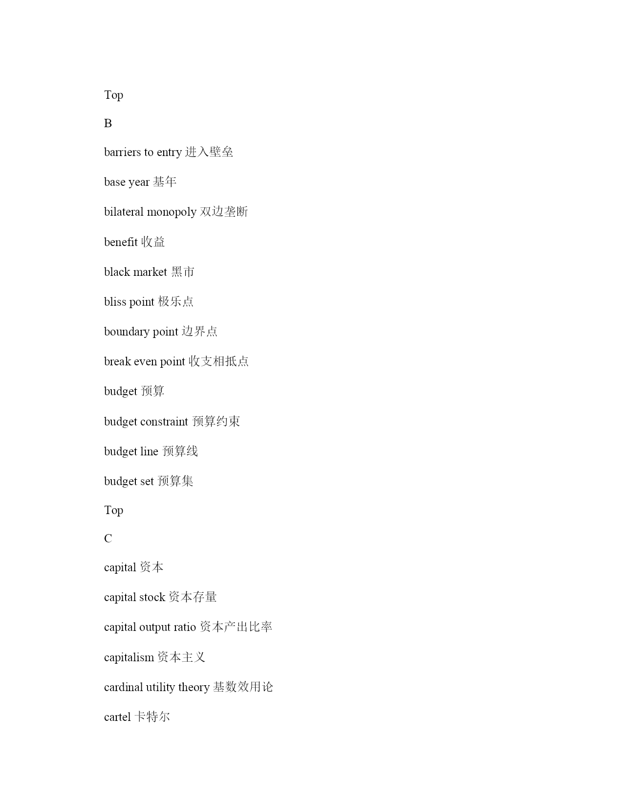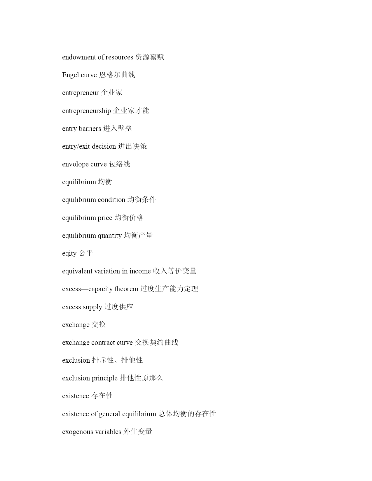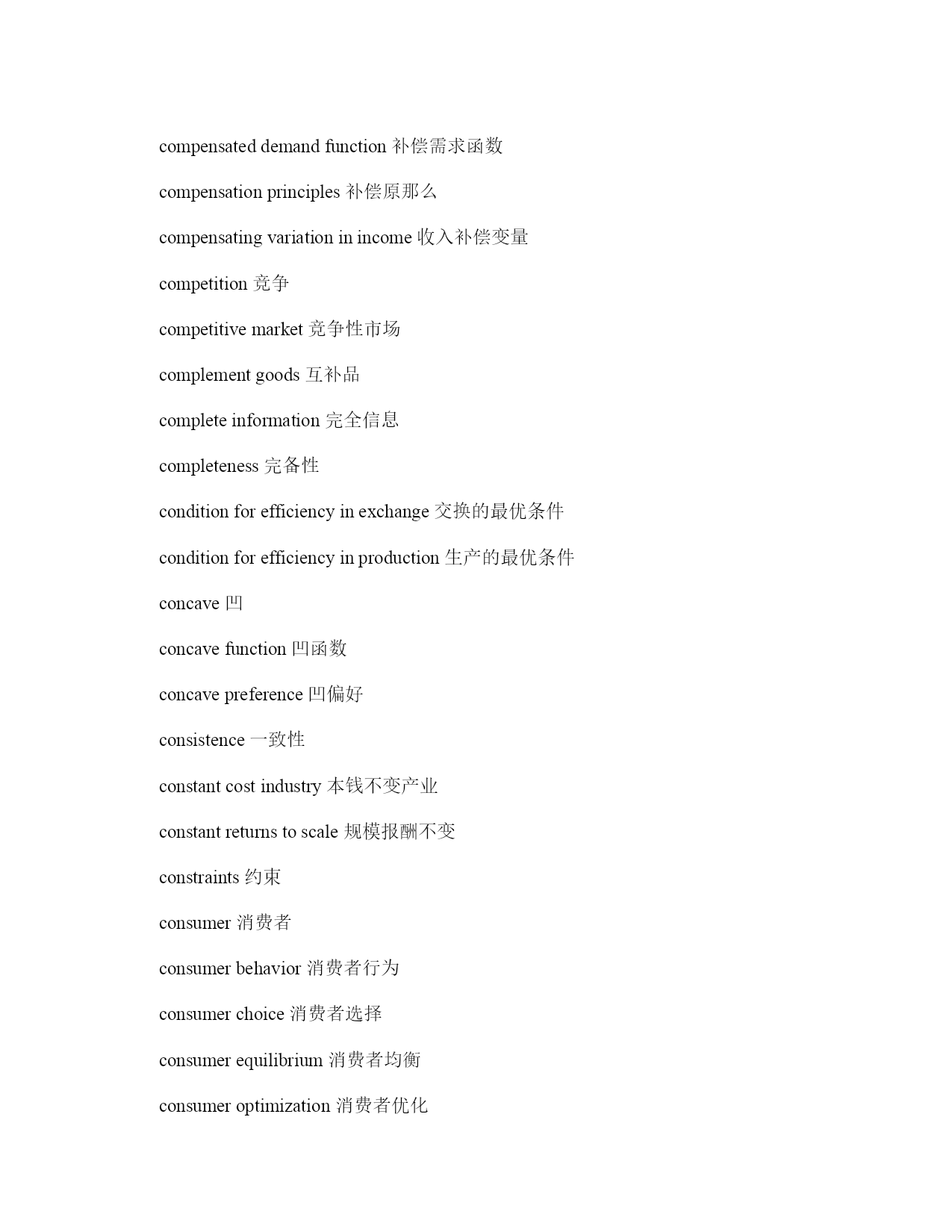 经济学英语词汇【完整版】(文档可以直接使用,也可根据实际需要修订后使用,可编辑放心下载)Aaccounting会计accountingcost会计本钱accountingprofit会计利润adverseselection逆向选择allocation配置allocationofresources资源配置allocativeefficiency配置效率antitrustlegislation反托拉斯法arcelasticity弧弹性Arrow'simpossibilitytheorem阿罗不可能定理Assumption假设asymetricinformation非对称性信息average平均averagecost平均本钱averagecostpricing平均本钱定价法averagefixedcost平均固定本钱averageproductofcapital资本平均产量averageproductoflabour劳动平均产量averagerevenue平均收益averagetotalcost平均总本钱averagevariablecost平均可变本钱TopBbarrierstoentry进入壁垒baseyear基年bilateralmonopoly双边垄断benefit收益blackmarket黑市blisspoint极乐点boundarypoint边界点breakevenpoint收支相抵点budget预算budgetconstraint预算约束budgetline预算线budgetset预算集TopCcapital资本capitalstock资本存量capitaloutputratio资本产出比率capitalism资本主义cardinalutilitytheory基数效用论cartel卡特尔ceterispuribusassumption“其他条件不变〞的假设ceterispuribusdemandcurve其他因素不变的需求曲线Chamberlinmodel张伯伦模型changeindemand需求变化changeinquantitydemanded需求量变化changeinquantitysupplied供应量变化changeinsupply供应变化choice选择closedset闭集Coasetheorem科斯定理Cobb—Douglasproductionfunction柯布--道格拉斯生产函数cobwebmodel蛛网模型collectivebargaining集体协议工资collusion合谋commandeconomy指令经济commodity商品commoditycombination商品组合commoditymarket商品市场commodityspace商品空间commonproperty公用财产comparativestaticanalysis比拟静态分析compensatedbudgetline补偿预算线compensateddemandfunction补偿需求函数compensationprinciples补偿原那么compensatingvariationinincome收入补偿变量competition竞争competitivemarket竞争性市场complementgoods互补品completeinformation完全信息completeness完备性conditionforefficiencyinexchange交换的最优条件conditionforefficiencyinproduction生产的最优条件concave凹concavefunction凹函数concavepreference凹偏好consistence一致性constantcostindustry本钱不变产业constantreturnstoscale规模报酬不变constraints约束consumer消费者consumerbehavior消费者行