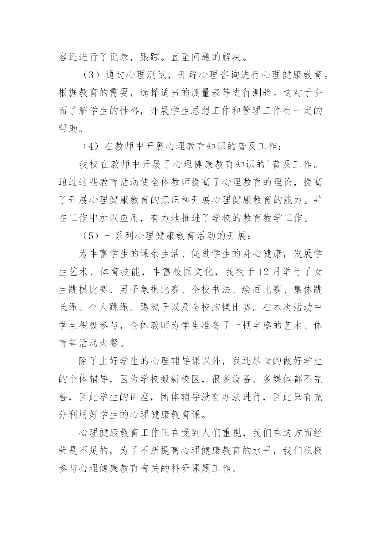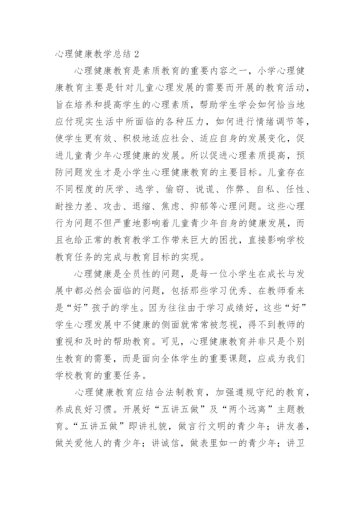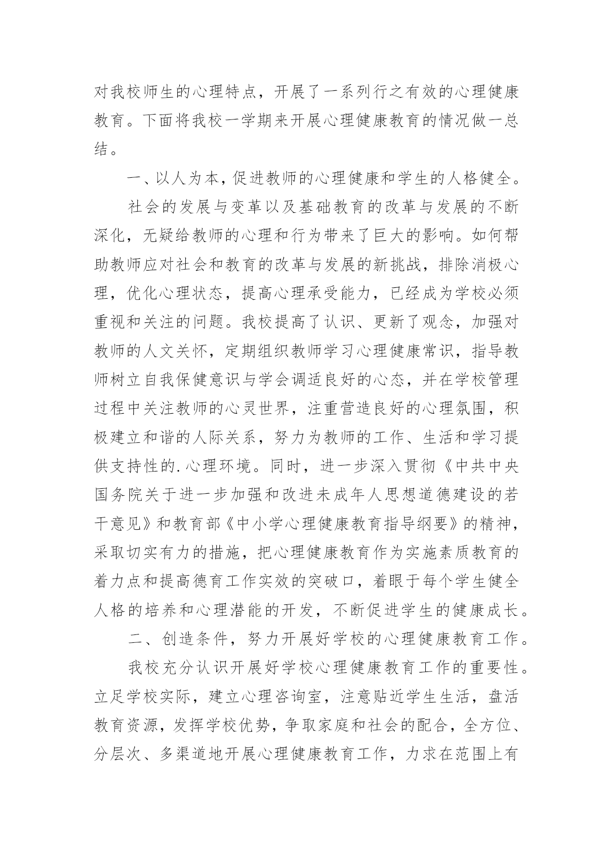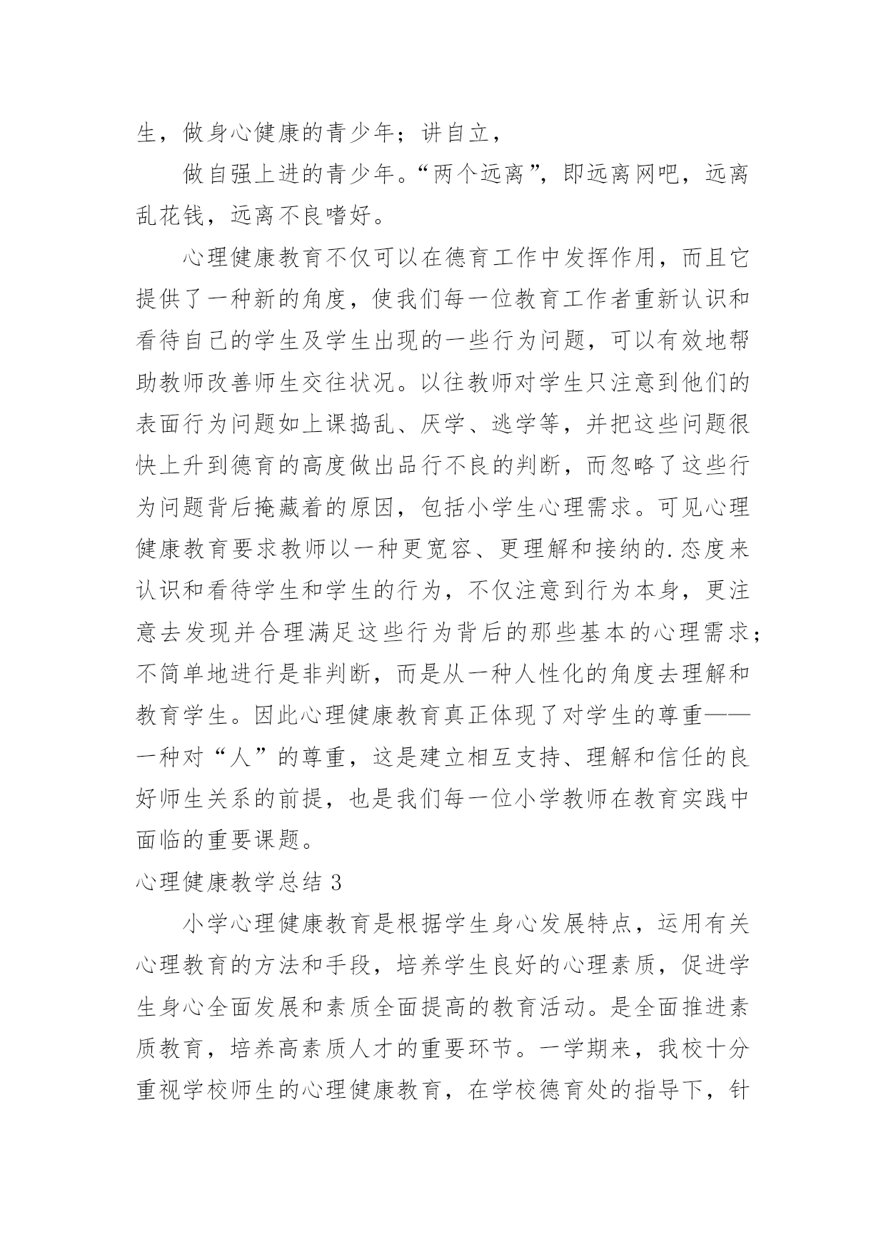心理健康教学总结心理健康教学总结总结在一个时期、一个年度、一个阶段对学习和工作生活等情况加以回顾和分析的一种书面材料,它能够给人努力工作的动力,因此我们需要回头归纳,写一份总结了。那么你知道总结如何写吗?以下是小编帮大家整理的心理健康教学总结,欢迎大家借鉴与参考,希望对大家有所帮助。心理健康教学总结1在全面贯彻教育方针、实施素质教育的过程,学校开展心理健康教育正在引起人们的重视,开展心理健康教育,既是学生自身健康成长的需要,也是社会发展对人的素质要求的需要。要加强学生的心理健康教育,培养学生坚韧不拨的意志、艰苦奋斗的精神,才能增强青少年适应社会生活的适应能力。我校在从今年开学以来,学校搬迁两次,新生入住,为了更好地促进学生适应高中生活并健康成长,提高学生的心理素质和心理健康水平,在上级领导的关怀下和有关专家的帮助下,新校区的心理咨询室(温馨之家)建设完成,并且在十二月份给学生组织了一系列的活动。下面将我校这一学期来开展心理健康教育的情况做一总结。(一)领导高度重视,心理健康教育工作认识到位,组织落实:1、认识到位:学校领导认识到心理健康教育工作是德育工作的一部分,是时代教育的需要,是素质教育的需要,是不断提高学校办学质量的需要,是为学生创造一个良好的成长环境的需要,是为学生终生不断进步发展奠定良好的心理基础的需要。2、组织落实:我校心理健康教育工作组织是严密的。校长挂帅开展心理健康教育工作,主管德育的副校长直接负责,教导处具体负责组织实施。使心理健康教育有了组织上的保证。3、学校将心理健康教育纳入学校规划中,不论是学年还是学期工作计划都将心理健康教育例为学校重点工作之一。而且,心理健康教育工作每学期要制定单独计划,进行总结。(二)培养师资,做到心理健康教育人员落实:1、学校从普及入手,重点培养骨干,先后派出多名教师参加市心理健康教育继续教育培训。2、设置心理教师岗位。我校由刘静、熊登会两位老师但任心理健康教育专职教师,由蔡玉霞、蔡延军两位老师但任心理健康教育兼职教师使心理健康教育工作从人员上得到保证。(三)开展心理健康教育的具体做法:(1)集体教育:我们积极想办法保证每班每周一节心理教育课,使心理教育成为学校课程的一个组成部分。(2)个别教育:学校在今年设置了“温馨之家”,每周定期开放,使个别心理有问题的同学单独找谈话,对谈话内容还进行了记录,跟踪。直至问题的解决。(3)通过心理测试,开辟心理咨询进行心理健康教育。根据教育的需要,选择适当的测量表等进行测验。这对于全面了解学生的性格,开展学生思想工作和管理工作有一定的帮助。(4)在教师中开展心理教育知识的普及工作:我校在教师中开展了心理健康教育知识的`普及工作。通过这些教育活动使全体教师提高了心理教育的理论,提高了开展心理健康教育的意识和开展心理健康教育的能力。并在工作中加以应用,有力地推进了学校的教育教学工作。(5)一系列心理健康教育活动的开展:为丰富学生的课余生活、促进学生的身心健康,发展学生艺术、体育技能,丰富校园文化,我校于12月举行了女生跳棋比赛、男子象棋比赛、全校书法、绘画比赛、集体跳长绳、个人跳绳、踢毽子以及全校跑操比赛。在本次活动中学生积极参与,全体教师为学生准备了一顿丰盛的艺术、体育等活动大餐。除了上好学生的心理辅导课以外,我还尽量的做好学生的个体辅导,因为学校搬新校区,很多设备、多媒体都不完善,因此学生的讲座,团体辅导没有办法进行,因此只有充分利用好学生的心理健康教育课。心理健康教育工作正在受到人们重视,我们在这方面经验是不足的,为了不断提高心理健康教育的水平,我们积极参与心理健康教育有关的科研课题工作。心理健康教学总结2心理健康教育是素质教育的重要内容之一,小学心理健康教育主要是针对儿童心理发展的需要而开展的教育活动,旨在培养和提高学生的心理素质,帮助学生学会如何恰当地应付现实生活中所面临的各种压力,如何进行情绪调节等,使学生更有效、积极地适应社会、适应自身的发展变化,促进儿童青少年心理健康的发展。所以促进心理素质提高,预防问题发生才是小学生心理健康教育的主要目标。儿童存在不同程度的厌学、逃学、偷窃、说谎、作弊、自私、任性、耐挫力差、攻击、退缩、焦虑、抑郁等心理问题。这些心理行为问题不但严重地影响着儿童青少年自身的健康发展,而且也给正常的教育教学工作带来巨大的困扰,直接影响学校教育任务的完成与教育目标的实现。心理健康是全员性的问题,是每一位小学生在成长与发展中都必然会面临的问题,包括那些学习优秀、在教师看来是“好”孩子的学生。因为往往由于学习成绩好,这些“好”学生心理发展中不健康的侧面就常常被忽视,得不到教师的重视和及时的帮助教育。可见,心理健康教育并非只是个别生教育的需要,而是面向全体学生的重要课题,应成为我们学校教育的重要任务。心理健康教育应结合法