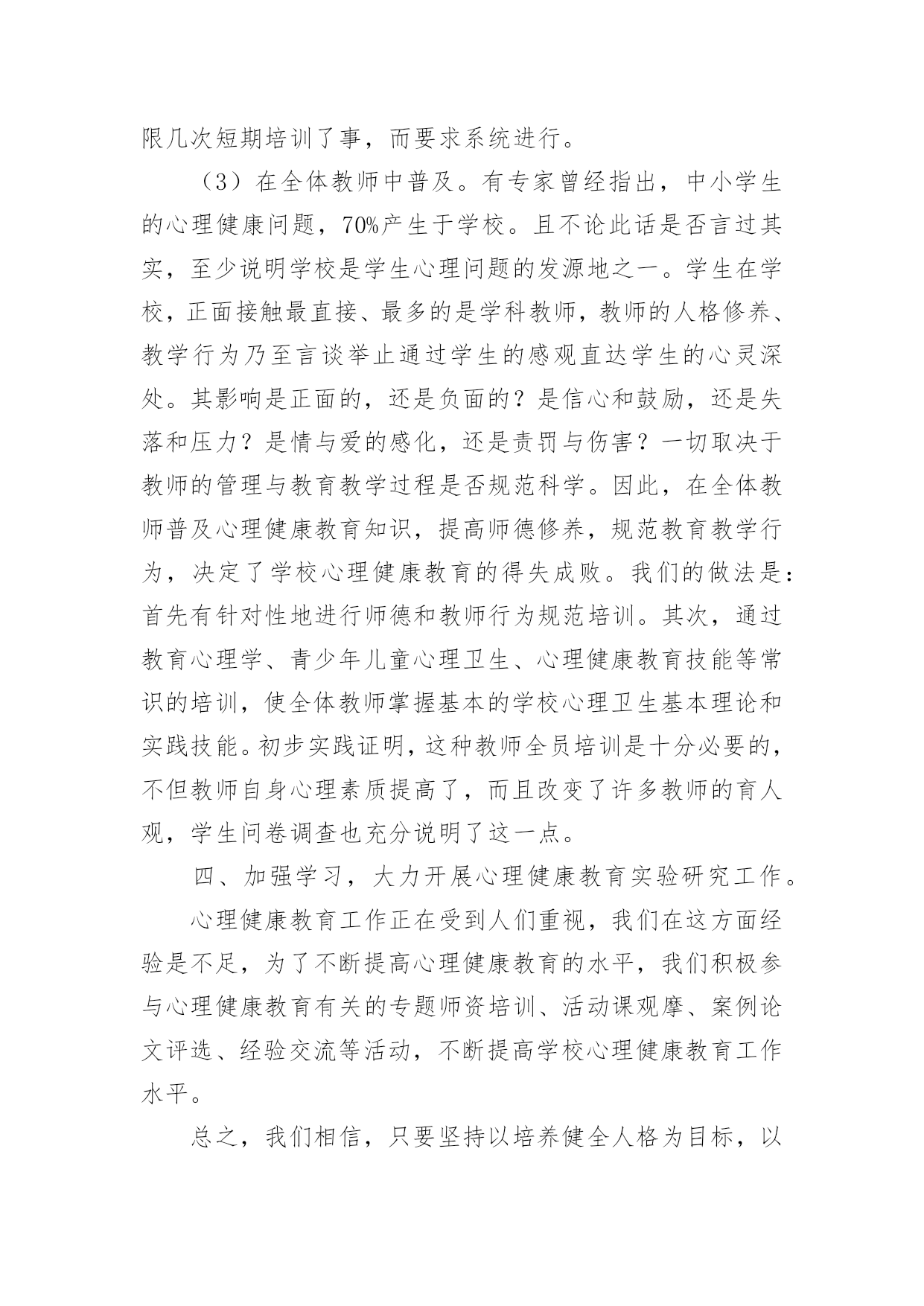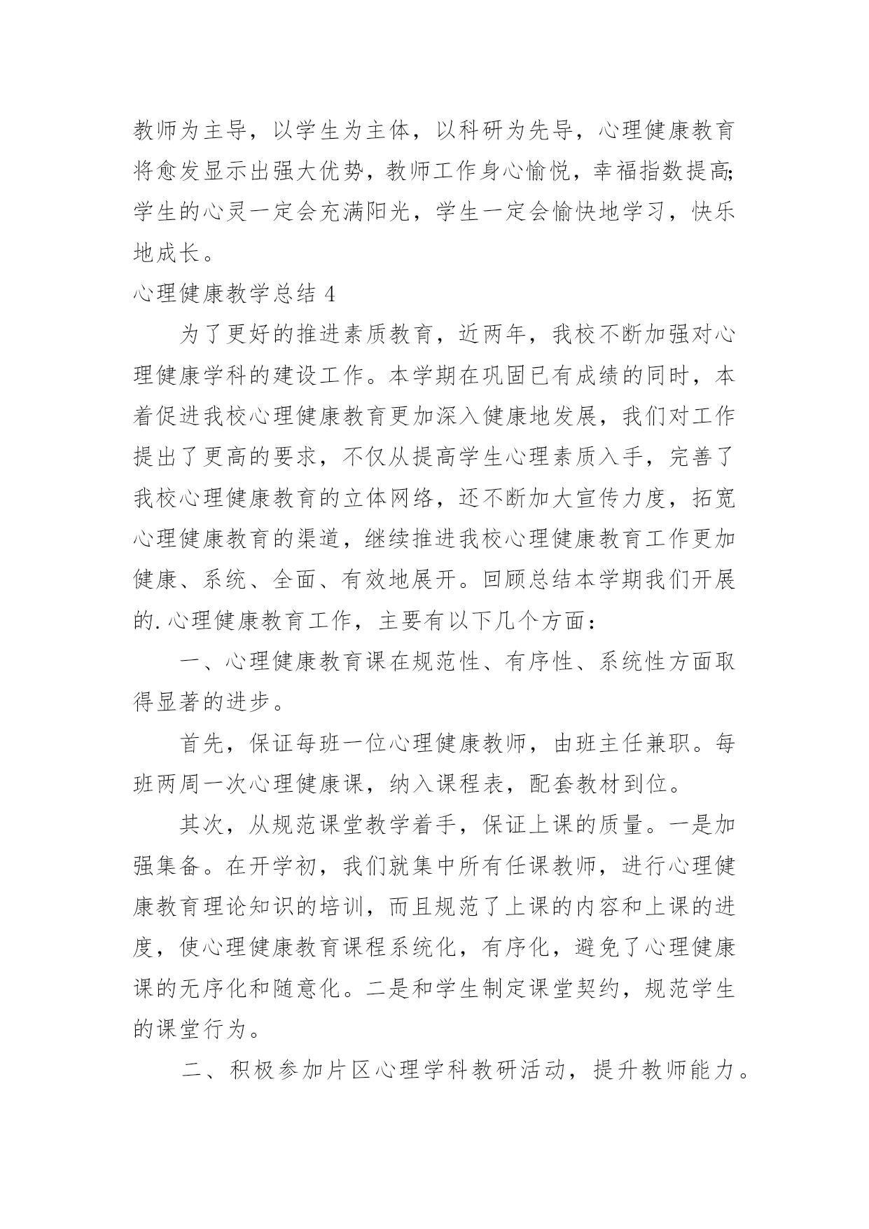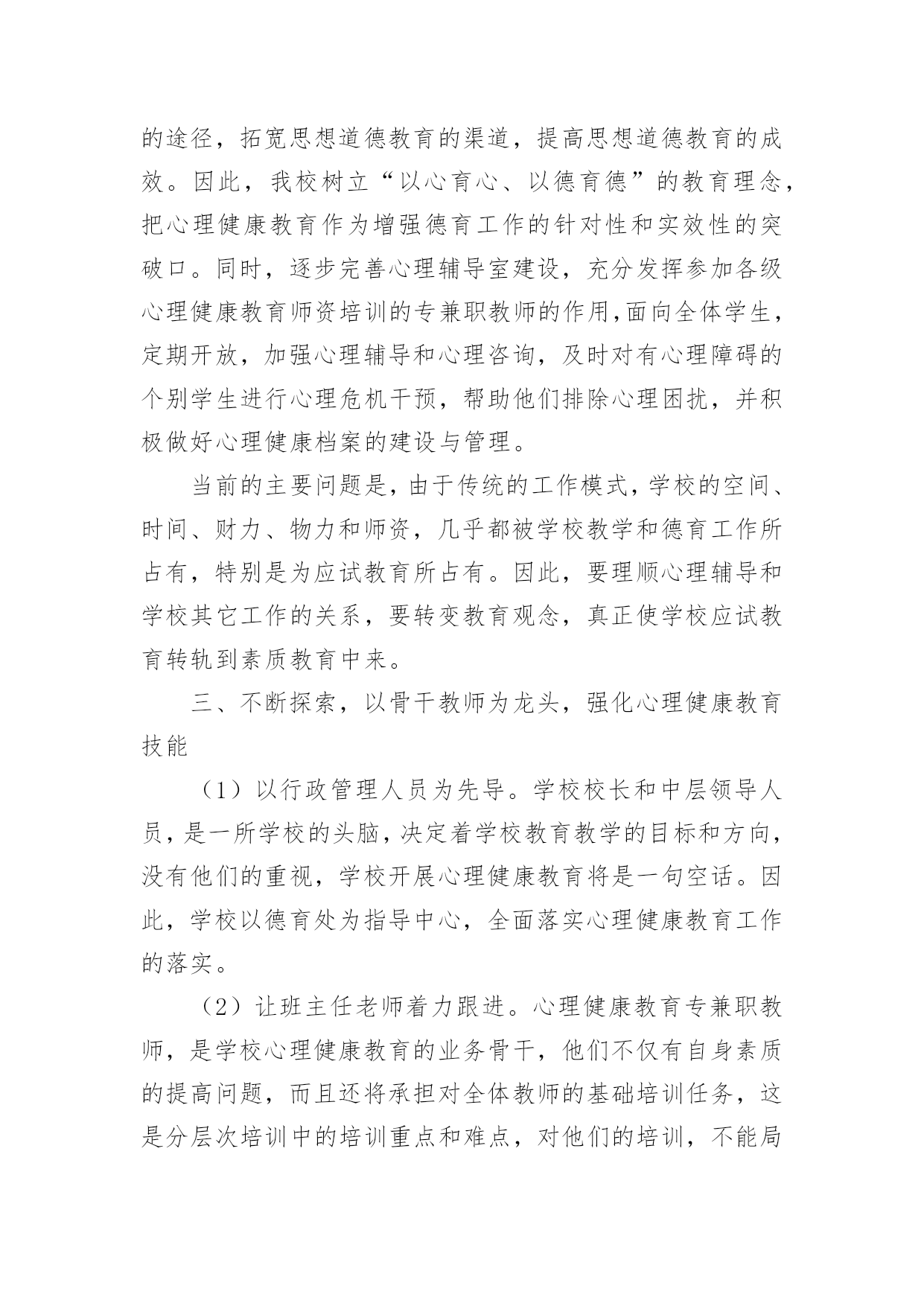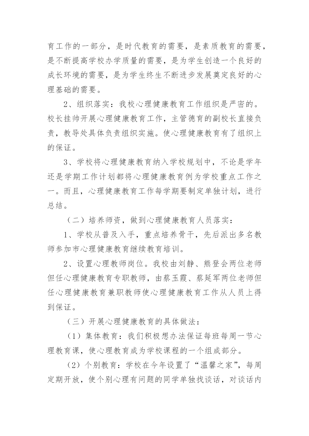 心理健康教学总结心理健康教学总结总结在一个时期、一个年度、一个阶段对学习和工作生活等情况加以回顾和分析的一种书面材料,它能够给人努力工作的动力,因此我们需要回头归纳,写一份总结了。那么你知道总结如何写吗?以下是小编帮大家整理的心理健康教学总结,欢迎大家借鉴与参考,希望对大家有所帮助。心理健康教学总结1在全面贯彻教育方针、实施素质教育的过程,学校开展心理健康教育正在引起人们的重视,开展心理健康教育,既是学生自身健康成长的需要,也是社会发展对人的素质要求的需要。要加强学生的心理健康教育,培养学生坚韧不拨的意志、艰苦奋斗的精神,才能增强青少年适应社会生活的适应能力。我校在从今年开学以来,学校搬迁两次,新生入住,为了更好地促进学生适应高中生活并健康成长,提高学生的心理素质和心理健康水平,在上级领导的关怀下和有关专家的帮助下,新校区的心理咨询室(温馨之家)建设完成,并且在十二月份给学生组织了一系列的活动。下面将我校这一学期来开展心理健康教育的情况做一总结。(一)领导高度重视,心理健康教育工作认识到位,组织落实:1、认识到位:学校领导认识到心理健康教育工作是德育工作的一部分,是时代教育的需要,是素质教育的需要,是不断提高学校办学质量的需要,是为学生创造一个良好的成长环境的需要,是为学生终生不断进步发展奠定良好的心理基础的需要。2、组织落实:我校心理健康教育工作组织是严密的。校长挂帅开展心理健康教育工作,主管德育的副校长直接负责,教导处具体负责组织实施。使心理健康教育有了组织上的保证。3、学校将心理健康教育纳入学校规划中,不论是学年还是学期工作计划都将心理健康教育例为学校重点工作之一。而且,心理健康教育工作每学期要制定单独计划,进行总结。(二)培养师资,做到心理健康教育人员落实:1、学校从普及入手,重点培养骨干,先后派出多名教师参加市心理健康教育继续教育培训。2、设置心理教师岗位。我校由刘静、熊登会两位老师但任心理健康教育专职教师,由蔡玉霞、蔡延军两位老师但任心理健康教育兼职教师使心理健康教育工作从人员上得到保证。(三)开展心理健康教育的具体做法:(1)集体教育:我们积极想办法保证每班每周一节心理教育课,使心理教育成为学校课程的一个组成部分。(2)个别教育:学校在今年设置了“温馨之家”,每周定期开放,使个别心理有问题的同学单独找谈话,对谈话内容还进行了记录,跟踪。直至问题的解决。(3)通过心理测试,开辟心理咨询进行心理健康教育。根据教育的需要,选择适当的测量表等进行测验。这对于全面了解学生的性格,开展学生思想工作和管理工作有一定的帮助。(4)在教师中开展心理教育知识的普及工作:我校在教师中开展了心理健康教育知识的`普及工作。通过这些教育活动使全体教师提高了心理教育的理论,提高了开展心理健康教育的意识和开展心理健康教育的能力。并在工作中加以应用,有力地推进了学校的教育教学工作。(5)一系列心理健康教育活动的开展:为丰富学生的课余生活、促进学生的身心健康,发展学生艺术、体育技能,丰富校园文化,我校于12月举行了女生跳棋比赛、男子象棋比赛、全校书法、绘画比赛、集体跳长绳、个人跳绳、踢毽子以及全校跑操比赛。在本次活动中学生积极参与,全体教师为学生准备了一顿丰盛的艺术、体育等活动大餐。除了上好学生的心理辅导课以外,我还尽量的做好学生的个体辅导,因为学校搬新校区,很多设备、多媒体都不完善,因此学生的讲座,团体辅导没有办法进行,因此只有充分利用好学生的心理健康教育课。心理健康教育工作正在受到人们重视,我们在这方面经验是不足的,为了不断提高心理健康教育的水平,我们积极参与心理健康教育有关的科研课题工作。心理健康教学总结2心理健康教育是素质教育的重要内容之一,小学心理健康教育主要是针对儿童心理发展的需要而开展的教育活动,旨在培养和提高学生的心理素质,帮助学生学会如何恰当地应付现实生活中所面临的各种压力,如何进行情绪调节等,使学生更有效、积极地适应社会、适应自身的发展变化,促进儿童青少年心理健康的发展。所以促进心理素质提高,预防问题发生才是小学生心理健康教育的主要目标。儿童存在不同程度的厌学、逃学、偷窃、说谎、作弊、自私、任性、耐挫力差、攻击、退缩、焦虑、抑郁等心理问题。这些心理行为问题不但严重地影响着儿童青少年自身的健康发展,而且也给正常的教育教学工作带来巨大的困扰,直接影响学校教育任务的完成与教育目标的实现。心理健康是全员性的问题,是每一位小学生在成长与发展中都必然会面临的问题,包括那些学习优秀、在教师看来是“好”孩子的学生。因为往往由于学习成绩好,这些“好”学生心理发展中不健康的侧面就常常被忽视,得不到教师的重视和及时的帮助教育。可见,心理健康教育并非只是个别生教育的需要,而是面向全体学生的重要课题,应成为我们学校教育的重要任务。心理健康教育应结合法