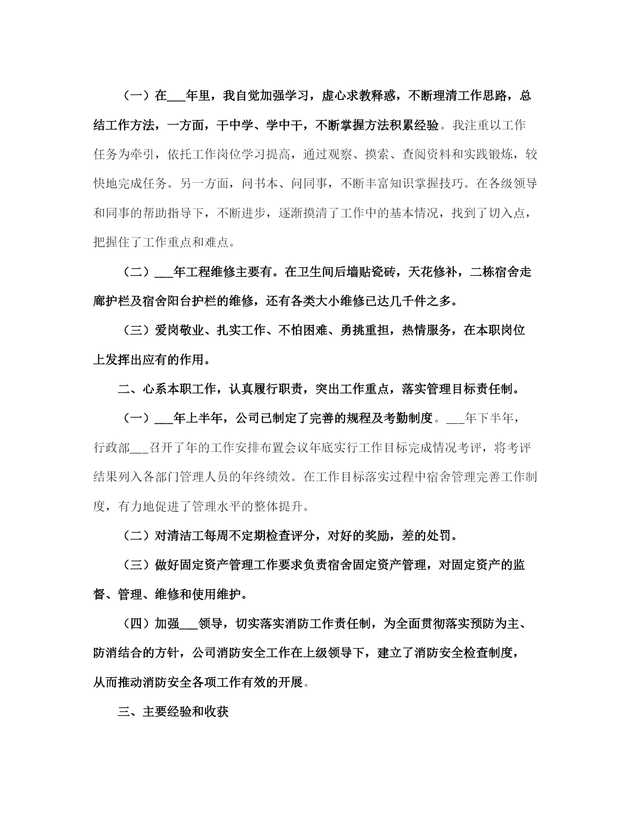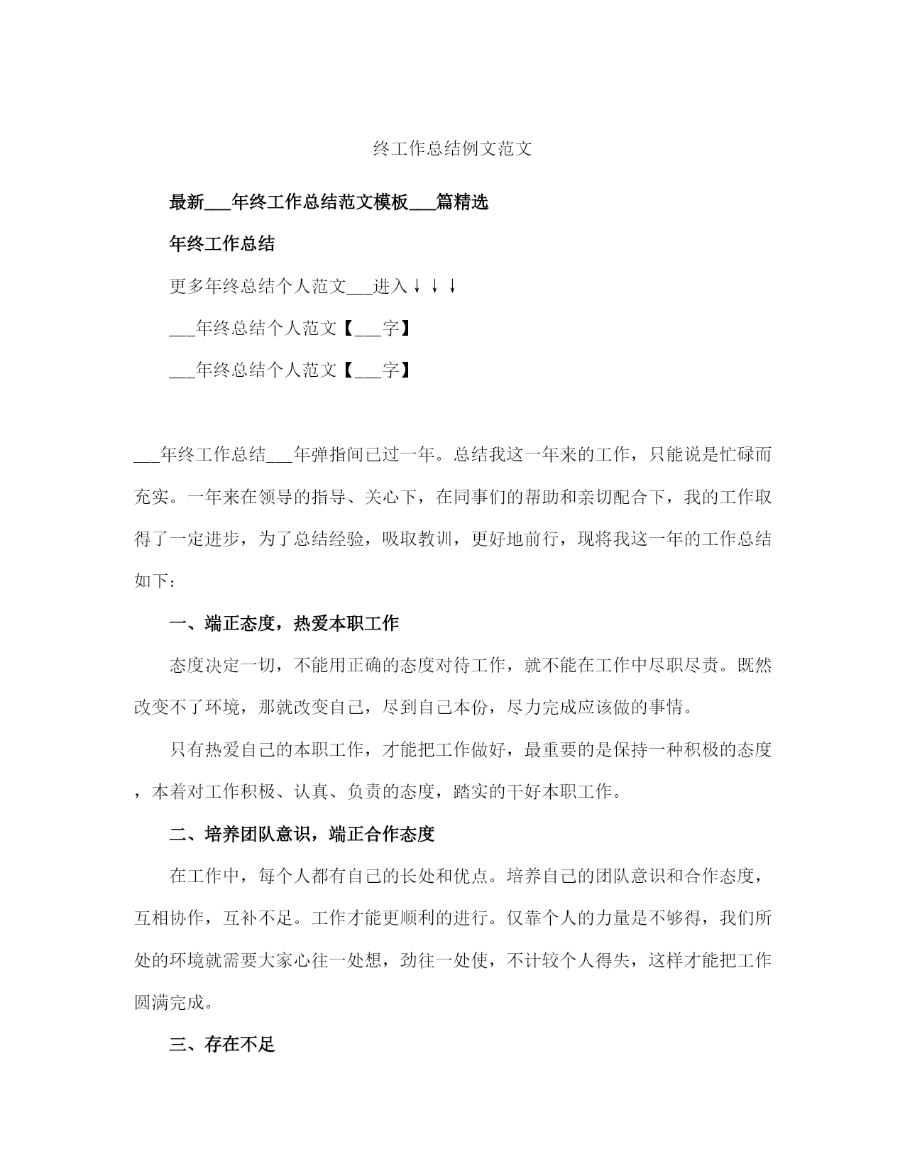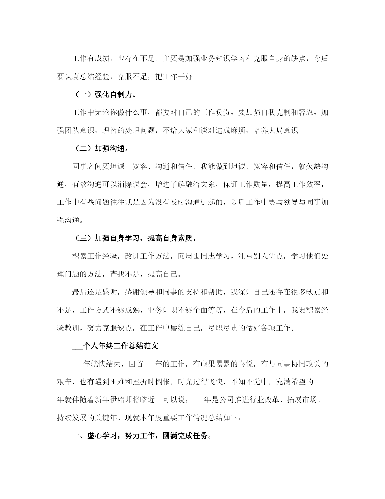 终工作总结(完整版)文档资料可直接使用,可编辑,欢迎下载终工作总结例文范文最新___年终工作总结范文模板___篇精选年终工作总结更多年终总结个人范文___进入↓↓↓___年终总结个人范文【___字】___年终总结个人范文【___字】___年终工作总结___年弹指间已过一年。总结我这一年来的工作,只能说是忙碌而充实。一年来在领导的指导、关心下,在同事们的帮助和亲切配合下,我的工作取得了一定进步,为了总结经验,吸取教训,更好地前行,现将我这一年的工作总结如下:一、端正态度,热爱本职工作态度决定一切,不能用正确的态度对待工作,就不能在工作中尽职尽责。既然改变不了环境,那就改变自己,尽到自己本份,尽力完成应该做的事情。只有热爱自己的本职工作,才能把工作做好,最重要的是保持一种积极的态度,本着对工作积极、认真、负责的态度,踏实的干好本职工作。二、培养团队意识,端正合作态度在工作中,每个人都有自己的长处和优点。培养自己的团队意识和合作态度,互相协作,互补不足。工作才能更顺利的进行。仅靠个人的力量是不够得,我们所处的环境就需要大家心往一处想,劲往一处使,不计较个人得失,这样才能把工作圆满完成。三、存在不足工作有成绩,也存在不足。主要是加强业务知识学习和克服自身的缺点,今后要认真总结经验,克服不足,把工作干好。(一)强化自制力。工作中无论你做什么事,都要对自己的工作负责,要加强自我克制和容忍,加强团队意识,理智的处理问题,不给大家和谈对造成麻烦,培养大局意识(二)加强沟通。同事之间要坦诚、宽容、沟通和信任。我能做到坦诚、宽容和信任,就欠缺沟通,有效沟通可以消除误会,增进了解融洽关系,保证工作质量,提高工作效率,工作中有些问题往往就是因为没有及时沟通引起的,以后工作中要与领导与同事加强沟通。(三)加强自身学习,提高自身素质。积累工作经验,改进工作方法,向周围同志学习,注重别人优点,学习他们处理问题的方法,查找不足,提高自己。最后还是感谢,感谢领导和同事的支持和帮助,我深知自己还存在很多缺点和不足,工作方式不够成熟,业务知识不够全面等等,在今后的工作中,我要积累经验教训,努力克服缺点,在工作中磨练自己,尽职尽责的做好各项工作。___个人年终工作总结范文___年就快结束,回首___年的工作,有硕果累累的喜悦,有与同事协同攻关的艰辛,也有遇到困难和挫折时惆怅,时光过得飞快,不知不觉中,充满希望的___年就伴随着新年伊始即将临近。可以说,___年是公司推进行业改革、拓展市场、持续发展的关键年。现就本年度重要工作情况总结如下:一、虚心学习,努力工作,圆满完成任务。(一)在___年里,我自觉加强学习,虚心求教释惑,不断理清工作思路,总结工作方法,一方面,干中学、学中干,不断掌握方法积累经验。我注重以工作任务为牵引,依托工作岗位学习提高,通过观察、摸索、查阅资料和实践锻炼,较快地完成任务。另一方面,问书本、问同事,不断丰富知识掌握技巧。在各级领导和同事的帮助指导下,不断进步,逐渐摸清了工作中的基本情况,找到了切入点,把握住了工作重点和难点。(二)___年工程维修主要有。在卫生间后墙贴瓷砖,天花修补,二栋宿舍走廊护栏及宿舍阳台护栏的维修,还有各类大小维修已达几千件之多。(三)爱岗敬业、扎实工作、不怕困难、勇挑重担,热情服务,在本职岗位上发挥出应有的作用。二、心系本职工作,认真履行职责,突出工作重点,落实管理目标责任制。(一)___年上半年,公司已制定了完善的规程及考勤制度。___年下半年,行政部___召开了年的工作安排布置会议年底实行工作目标完成情况考评,将考评结果列入各部门管理人员的年终绩效。在工作目标落实过程中宿舍管理完善工作制度,有力地促进了管理水平的整体提升。(二)对清洁工每周不定期检查评分,对好的奖励,差的处罚。(三)做好固定资产管理工作要求负责宿舍固定资产管理,对固定资产的监督、管理、维修和使用维护。(四)加强___领导,切实落实消防工作责任制,为全面贯彻落实预防为主、防消结合的方针,公司消防安全工作在上级领导下,建立了消防安全检查制度,从而推动消防安全各项工作有效的开展。三、主要经验和收获在安防工作这两年来,完成了一些工作,取得了一定成绩,总结起来有以下几个方面的经验和收获:(一)只有摆正自己的位置,下功夫熟悉基本业务,才能更好适应工作岗位。(二)只有主动融入___,处理好各方面的关系,才能在新的环境中保持好的工作状态。(三)只有坚持原则落实制度,认真统计盘点,才能履行好用品的申购与领用。(四)只有树立服务意识,加强沟通协调,才能把分内的工作做好。(五)要加强与员工的交流,要与员工做好沟通,解决员工工作上的情绪问题,要与员工进行思想交流。四、加强检查,及时整改,在工