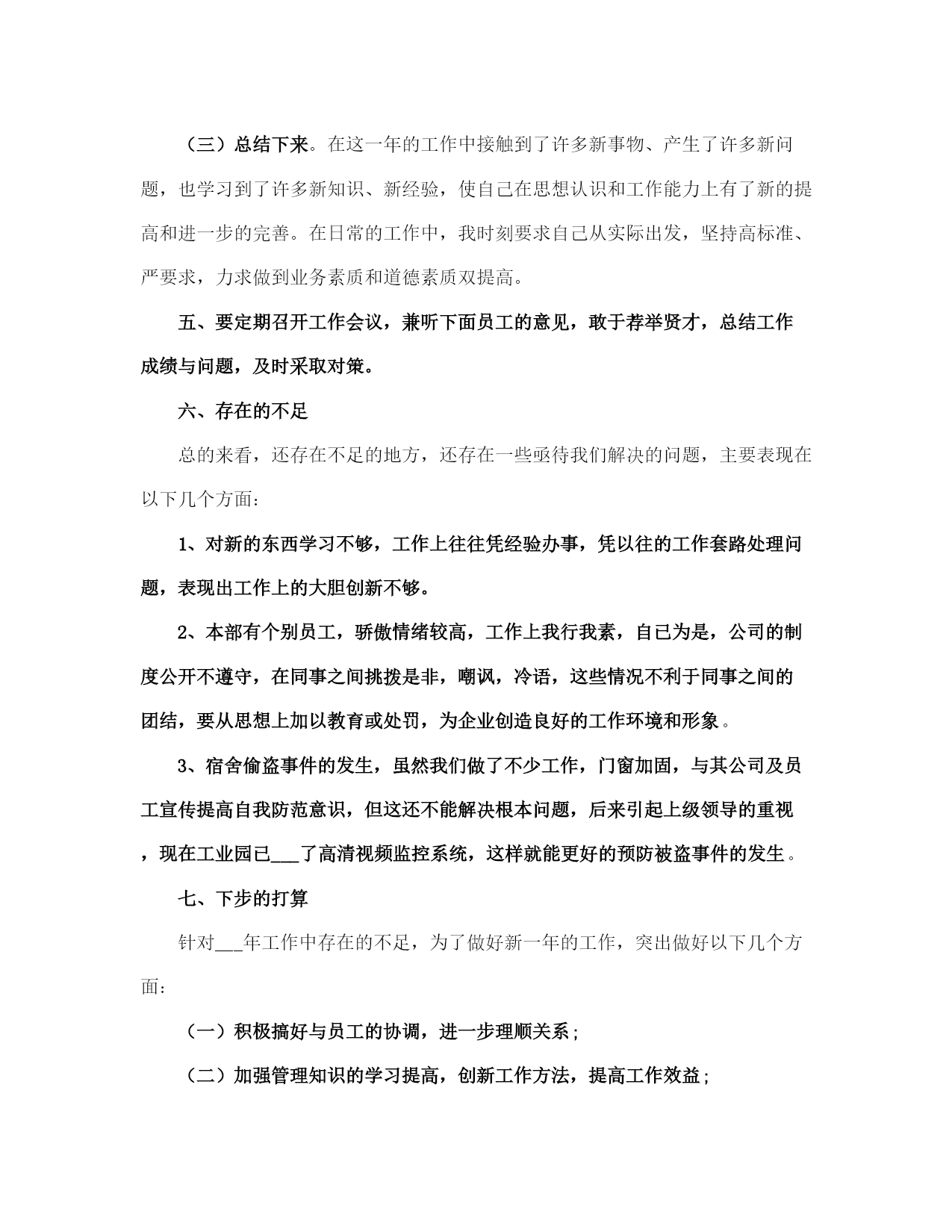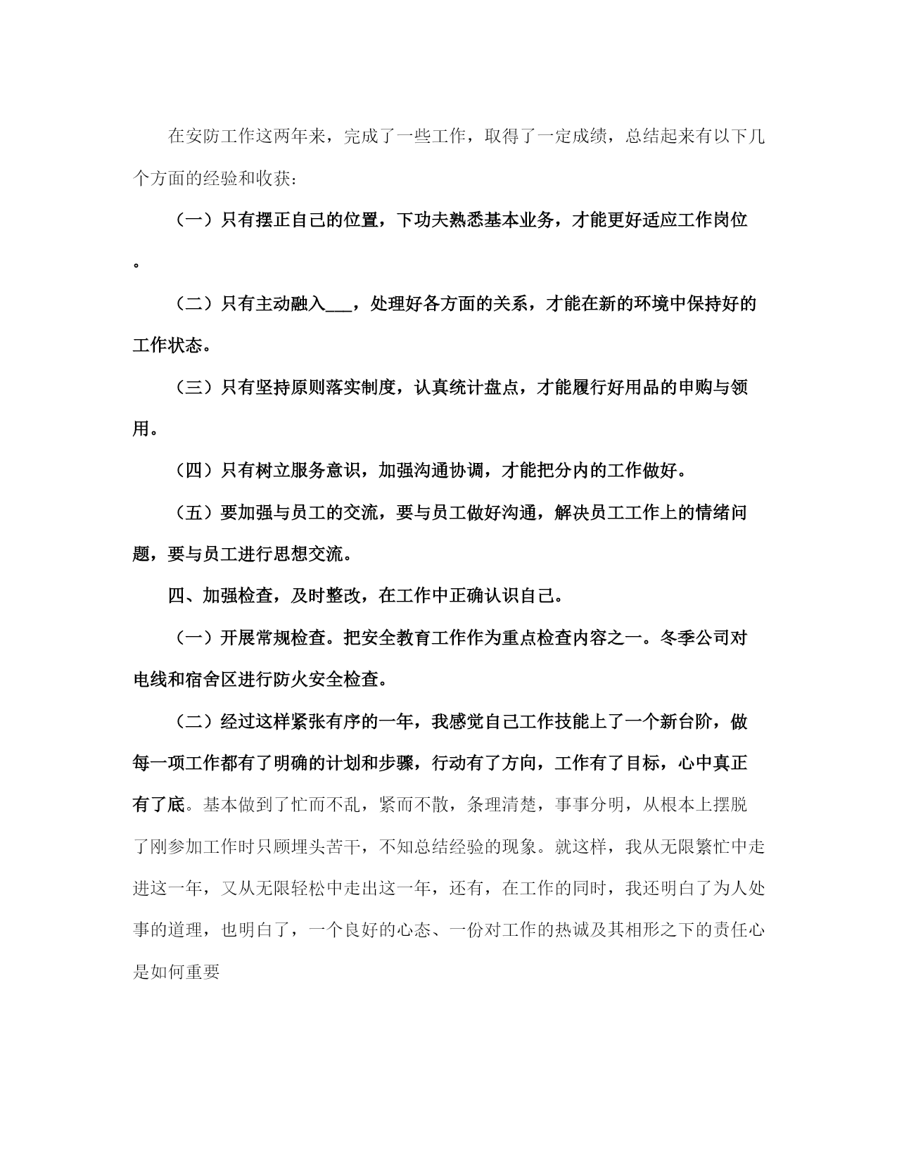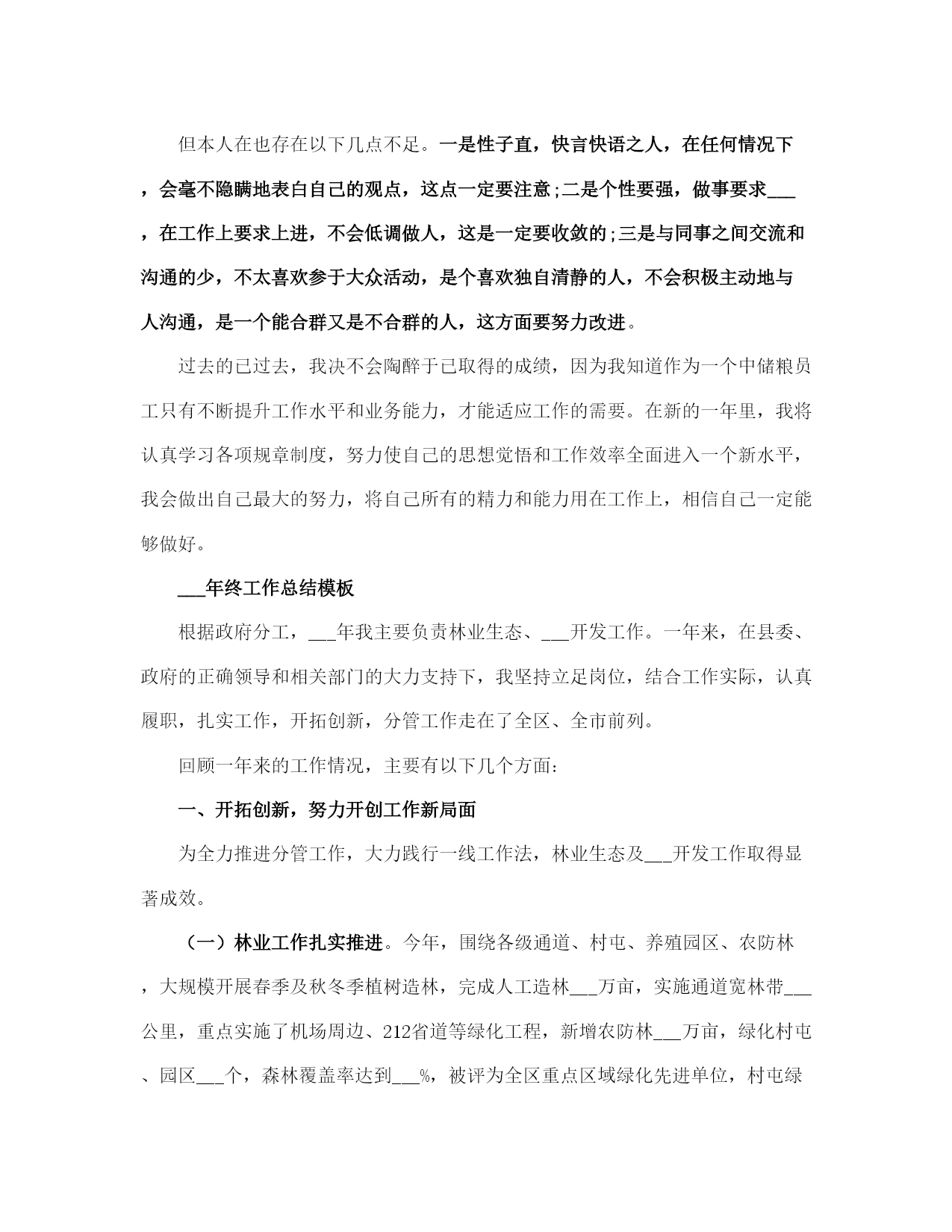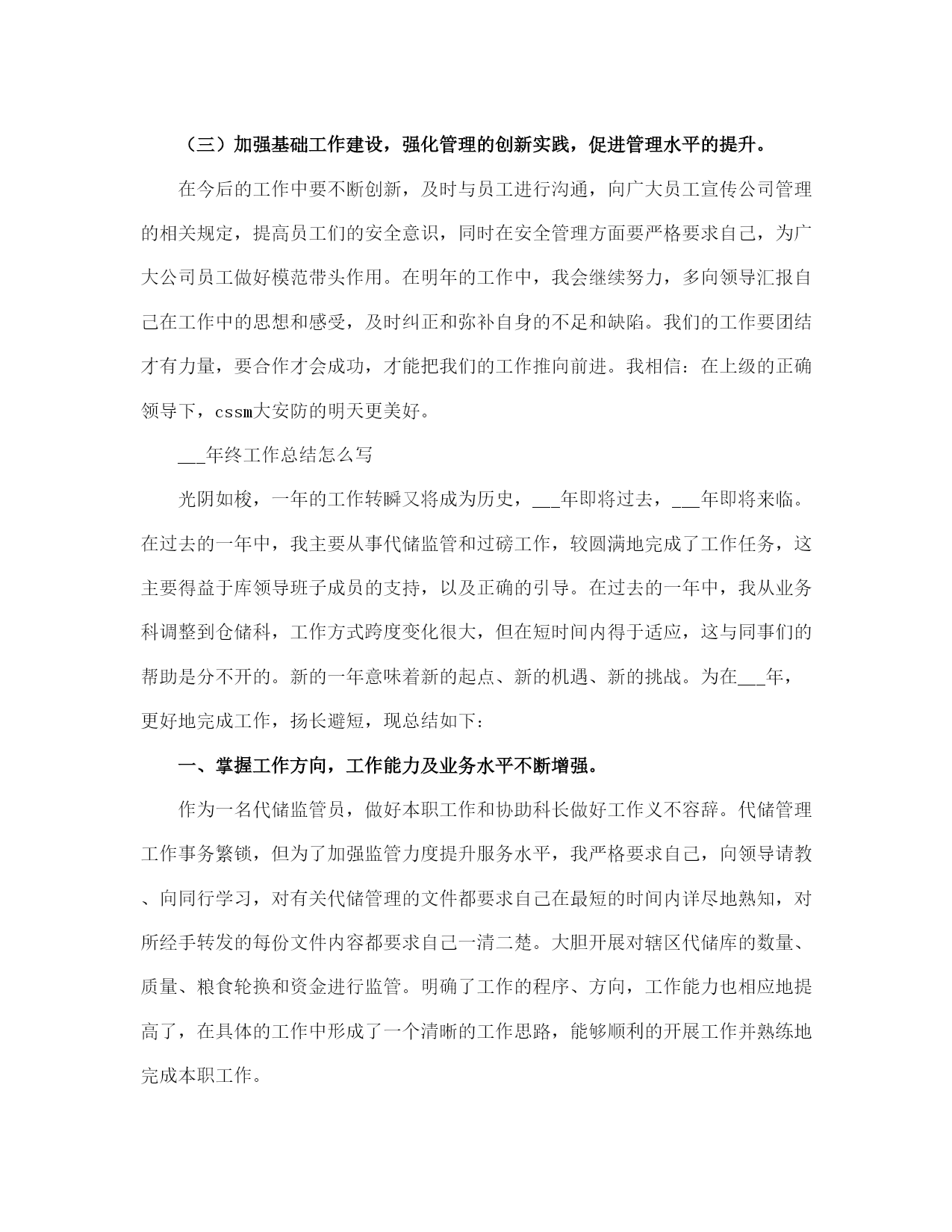 终工作总结(完整版)文档资料可直接使用,可编辑,欢迎下载终工作总结例文范文最新___年终工作总结范文模板___篇精选年终工作总结更多年终总结个人范文___进入↓↓↓___年终总结个人范文【___字】___年终总结个人范文【___字】___年终工作总结___年弹指间已过一年。总结我这一年来的工作,只能说是忙碌而充实。一年来在领导的指导、关心下,在同事们的帮助和亲切配合下,我的工作取得了一定进步,为了总结经验,吸取教训,更好地前行,现将我这一年的工作总结如下:一、端正态度,热爱本职工作态度决定一切,不能用正确的态度对待工作,就不能在工作中尽职尽责。既然改变不了环境,那就改变自己,尽到自己本份,尽力完成应该做的事情。只有热爱自己的本职工作,才能把工作做好,最重要的是保持一种积极的态度,本着对工作积极、认真、负责的态度,踏实的干好本职工作。二、培养团队意识,端正合作态度在工作中,每个人都有自己的长处和优点。培养自己的团队意识和合作态度,互相协作,互补不足。工作才能更顺利的进行。仅靠个人的力量是不够得,我们所处的环境就需要大家心往一处想,劲往一处使,不计较个人得失,这样才能把工作圆满完成。三、存在不足工作有成绩,也存在不足。主要是加强业务知识学习和克服自身的缺点,今后要认真总结经验,克服不足,把工作干好。(一)强化自制力。工作中无论你做什么事,都要对自己的工作负责,要加强自我克制和容忍,加强团队意识,理智的处理问题,不给大家和谈对造成麻烦,培养大局意识(二)加强沟通。同事之间要坦诚、宽容、沟通和信任。我能做到坦诚、宽容和信任,就欠缺沟通,有效沟通可以消除误会,增进了解融洽关系,保证工作质量,提高工作效率,工作中有些问题往往就是因为没有及时沟通引起的,以后工作中要与领导与同事加强沟通。(三)加强自身学习,提高自身素质。积累工作经验,改进工作方法,向周围同志学习,注重别人优点,学习他们处理问题的方法,查找不足,提高自己。最后还是感谢,感谢领导和同事的支持和帮助,我深知自己还存在很多缺点和不足,工作方式不够成熟,业务知识不够全面等等,在今后的工作中,我要积累经验教训,努力克服缺点,在工作中磨练自己,尽职尽责的做好各项工作。___个人年终工作总结范文___年就快结束,回首___年的工作,有硕果累累的喜悦,有与同事协同攻关的艰辛,也有遇到困难和挫折时惆怅,时光过得飞快,不知不觉中,充满希望的___年就伴随着新年伊始即将临近。可以说,___年是公司推进行业改革、拓展市场、持续发展的关键年。现就本年度重要工作情况总结如下:一、虚心学习,努力工作,圆满完成任务。(一)在___年里,我自觉加强学习,虚心求教释惑,不断理清工作思路,总结工作方法,一方面,干中学、学中干,不断掌握方法积累经验。我注重以工作任务为牵引,依托工作岗位学习提高,通过观察、摸索、查阅资料和实践锻炼,较快地完成任务。另一方面,问书本、问同事,不断丰富知识掌握技巧。在各级领导和同事的帮助指导下,不断进步,逐渐摸清了工作中的基本情况,找到了切入点,把握住了工作重点和难点。(二)___年工程维修主要有。在卫生间后墙贴瓷砖,天花修补,二栋宿舍走廊护栏及宿舍阳台护栏的维修,还有各类大小维修已达几千件之多。(三)爱岗敬业、扎实工作、不怕困难、勇挑重担,热情服务,在本职岗位上发挥出应有的作用。二、心系本职工作,认真履行职责,突出工作重点,落实管理目标责任制。(一)___年上半年,公司已制定了完善的规程及考勤制度。___年下半年,行政部___召开了年的工作安排布置会议年底实行工作目标完成情况考评,将考评结果列入各部门管理人员的年终绩效。在工作目标落实过程中宿舍管理完善工作制度,有力地促进了管理水平的整体提升。(二)对清洁工每周不定期检查评分,对好的奖励,差的处罚。(三)做好固定资产管理工作要求负责宿舍固定资产管理,对固定资产的监督、管理、维修和使用维护。(四)加强___领导,切实落实消防工作责任制,为全面贯彻落实预防为主、防消结合的方针,公司消防安全工作在上级领导下,建立了消防安全检查制度,从而推动消防安全各项工作有效的开展。三、主要经验和收获在安防工作这两年来,完成了一些工作,取得了一定成绩,总结起来有以下几个方面的经验和收获:(一)只有摆正自己的位置,下功夫熟悉基本业务,才能更好适应工作岗位。(二)只有主动融入___,处理好各方面的关系,才能在新的环境中保持好的工作状态。(三)只有坚持原则落实制度,认真统计盘点,才能履行好用品的申购与领用。(四)只有树立服务意识,加强沟通协调,才能把分内的工作做好。(五)要加强与员工的交流,要与员工做好沟通,解决员工工作上的情绪问题,要与员工进行思想交流。四、加强检查,及时整改,在工