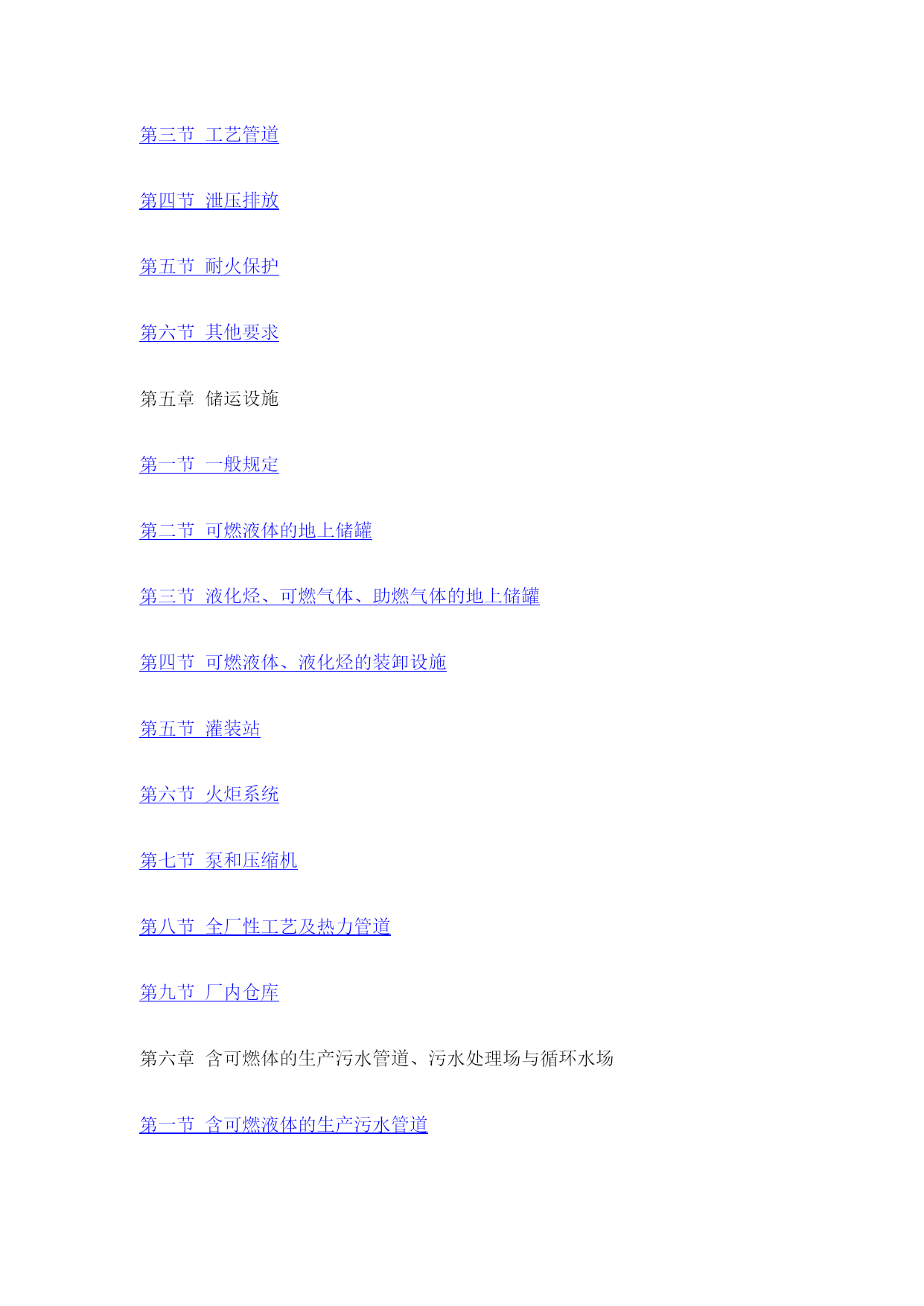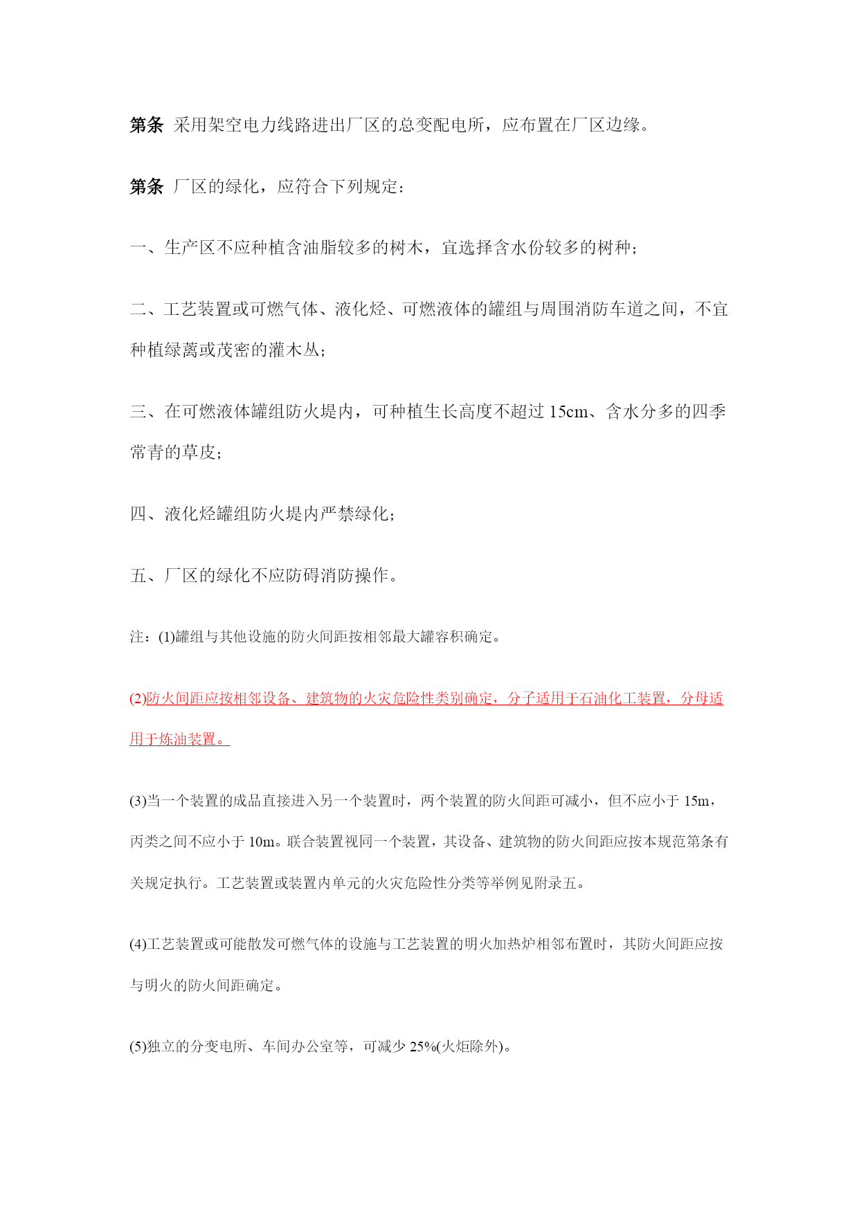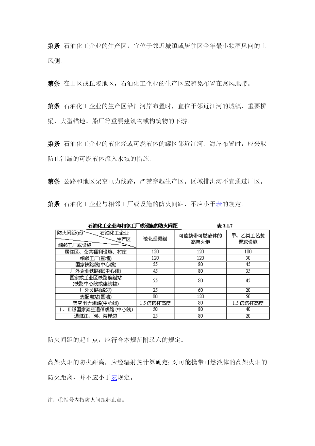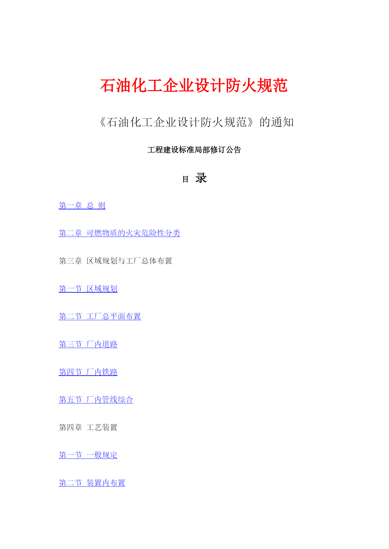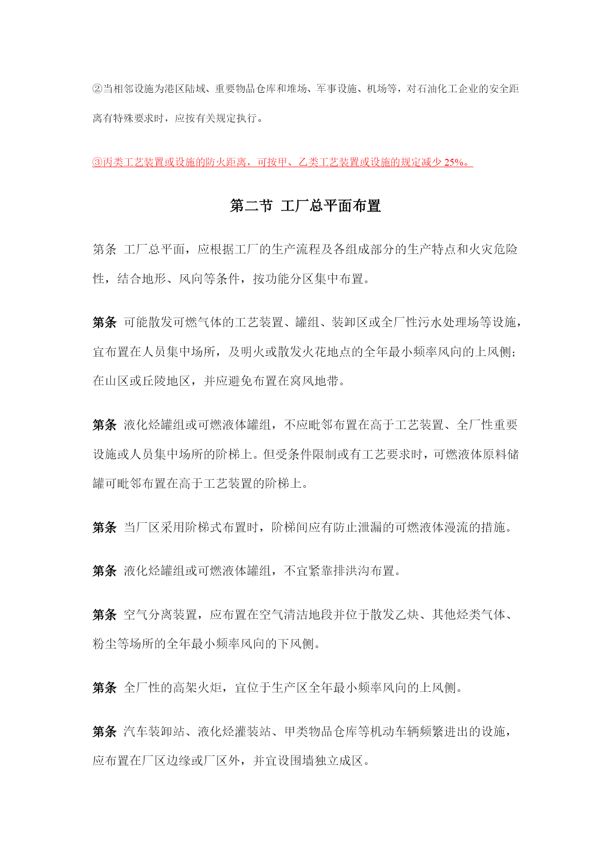 石油化工企业设计防火规范(常用版)(可以直接使用,可编辑完整版资料,欢迎下载)石油化工企业设计防火规范《石油化工企业设计防火规范》的通知工程建设标准局部修订公告目录第一章总则第二章可燃物质的火灾危险性分类第三章区域规划与工厂总体布置第一节区域规划第二节工厂总平面布置第三节厂内道路第四节厂内铁路第五节厂内管线综合第四章工艺装置第一节一般规定第二节装置内布置第三节工艺管道第四节泄压排放第五节耐火保护第六节其他要求第五章储运设施第一节一般规定第二节可燃液体的地上储罐第三节液化烃、可燃气体、助燃气体的地上储罐第四节可燃液体、液化烃的装卸设施第五节灌装站第六节火炬系统第七节泵和压缩机第八节全厂性工艺及热力管道第九节厂内仓库第六章含可燃体的生产污水管道、污水处理场与循环水场第一节含可燃液体的生产污水管道第二节污水处理场与循环水场第七章消防第一节一般规定第二节消防站第三节消防给水系统第四节低倍数泡沫灭火系统第五节干粉灭火系统第六节蒸汽灭火系统第七节灭火器设置第八节火灾报警系统第九节液化烃罐区消防第十节装卸油码头消防第十一节建筑物内消防第八章电气第一节消防电源及配电第二节防雷第三节静电接地附录一名词解释附录二可燃气体的火灾危险性分类举例附录三液化烃、可燃液体的火灾危险性分类举例附录四甲、乙、丙类固体的火灾危险性分类举例附录五工艺装置或装置内单元的火灾危险性分类举例附录六防火间距起止点附录七本规范用词说明附加说明第一章总则第条为了保障人身和财产的安全,在石油化工企业设计中,贯彻“预防为主,防消结合”的方针,采取防火措施,防止和减少火灾危害,特制定本规范。第条本规范适用于以石油、天然气及其产品为原料的石油化工新建、扩建或改建工程的防火设计。第条石油化工企业的防火设计应按本规范执行;本规范未作规定者,应符合有关现行国家标准规范的要求或规定。第二章可燃物质的火灾危险性分类第条可燃气体的火灾危险性,应按表分类。可燃气体的火灾危险性分类举例见本规范附录二。第条液化烃、可燃液体的火灾危险性分类,应符合下列规定:一、液化烃、可燃液体的火灾危险性,应按表分类;二、操作温度超过其闪点的乙类液体,应视为甲B类液体;三、操作温度超过其闪点的丙类液体,应视为乙A类液体。液化烃、可燃液体的火灾危险性分类举例,见本规范附录三。第条固体的火灾危险性分类,应按现行国家标准《建筑设计防火规范》的有关规定执行。甲、乙、丙类固体的火灾危险性分类举例,见本规范附录四。第三章区域规划与工厂总体布置第一节区域规划第条在进行区域规划时,应根据石油化工企业及其相邻的工厂或设施的特点和火灾危险性,结合地形,风向等条件,合理布置。第条石油化工企业的生产区,宜位于邻近城镇或居住区全年最小频率风向的上风侧。第条在山区或丘陵地区,石油化工企业的生产区应避免布置在窝风地带。第条石油化工企业的生产区沿江河岸布置时,宜位于邻近江河的城镇、重要桥梁、大型锚地、船厂等重要建筑物或构筑物的下游。第条石油化工企业的液化烃或可燃液体的罐区邻近江河、海岸布置时,应采取防止泄漏的可燃液体流入水域的措施。第条公路和地区架空电力线路,严禁穿越生产区。区域排洪沟不宜通过厂区。第条石油化工企业与相邻工厂或设施的防火间距,不应小于表的规定。防火间距的起止点,应符合本规范附录六的规定。高架火炬的防火距离,应经辐射热计算确定;对可能携带可燃液体的高架火炬的防火距离,并不应小于表规定。注:①括号内指防火间距起止点。②当相邻设施为港区陆域、重要物品仓库和堆场、军事设施、机场等,对石油化工企业的安全距离有特殊要求时,应按有关规定执行。③丙类工艺装置或设施的防火距离,可按甲、乙类工艺装置或设施的规定减少25%。第二节工厂总平面布置第条工厂总平面,应根据工厂的生产流程及各组成部分的生产特点和火灾危险性,结合地形、风向等条件,按功能分区集中布置。第条可能散发可燃气体的工艺装置、罐组、装卸区或全厂性污水处理场等设施,宜布置在人员集中场所,及明火或散发火花地点的全年最小频率风向的上风侧;在山区或丘陵地区,并应避免布置在窝风地带。第条液化烃罐组或可燃液体罐组,不应毗邻布置在高于工艺装置、全厂性重要设施或人员集中场所的阶梯上。但受条件限制或有工艺要求时,可燃液体原料储罐可毗邻布置在高于工艺装置的阶梯上。第条当厂区采用阶梯式布置时,阶梯间应有防止泄漏的可燃液体漫流的措施。第条液化烃罐组或可燃液体罐组,不宜紧靠排洪沟布置。第条空气分离装置,应布置在空气清洁地段并位于散发乙炔、其他烃类气体、粉尘等场所的全年最小频率风向的下风侧。第条全厂性的高架火