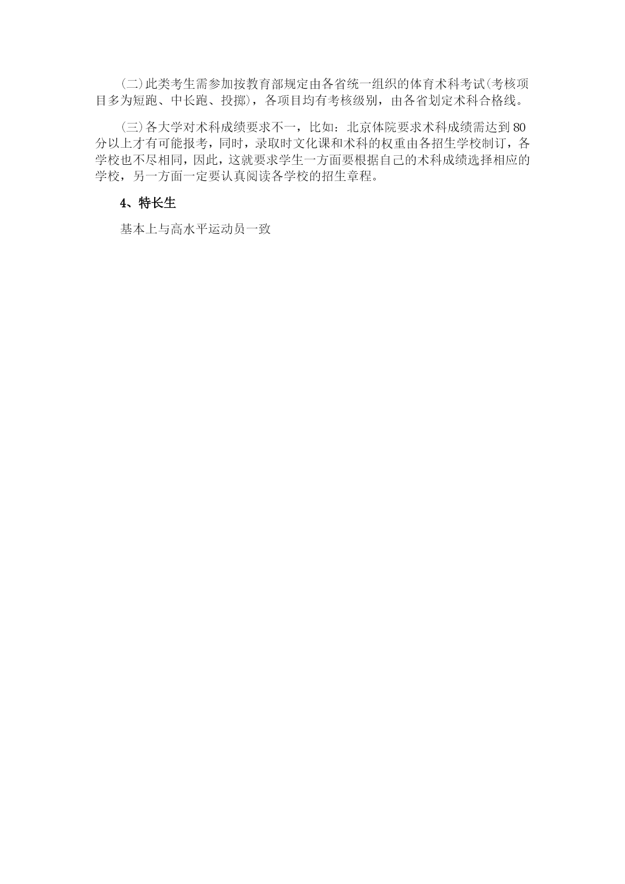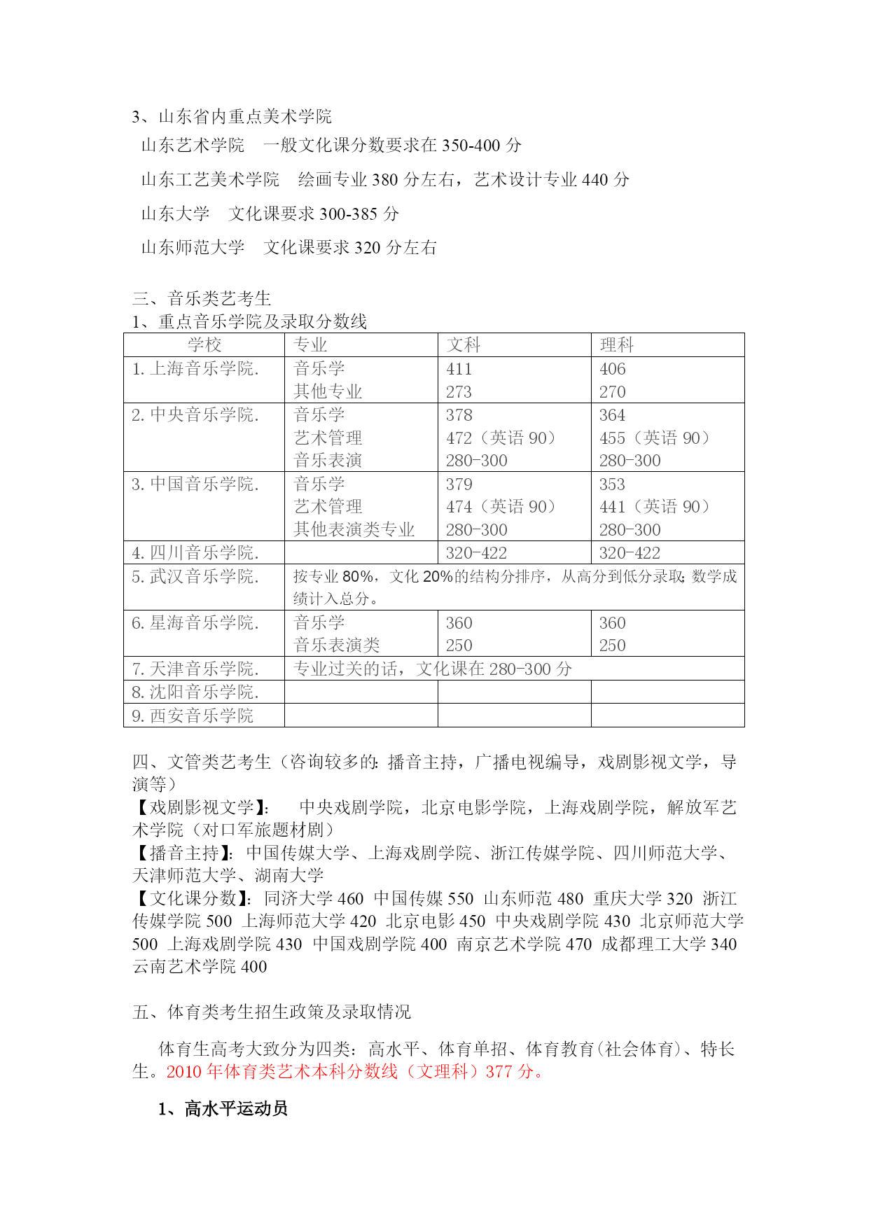 艺术生的相关知识了解艺考1、艺考:指各大院校的音乐、美术或艺术系进行的专业招生考试。考试获得了专业合格证,持证参加高考,择优录取。2、艺考专业HYPERLINK"http://www.sdyk.org/zhuanyejieshao/meishu/"\t"_blank"美术类|HYPERLINK"http://www.sdyk.org/zhuanyejieshao/shufa/"\t"_blank"书法类|HYPERLINK"http://www.sdyk.org/zhuanyejieshao/sheying/"\t"_blank"摄影类HYPERLINK"http://www.sdyk.org/zhuanyejieshao/yinyue/"\t"_blank"音乐类|HYPERLINK"http://www.sdyk.org/zhuanyejieshao/wudao/"\t"_blank"舞蹈类|HYPERLINK"http://www.sdyk.org/zhuanyejieshao/boyin/"\t"_blank"播音主持类HYPERLINK"http://www.sdyk.org/zhuanyejieshao/wenguan/"\t"_blank"文学编导管理类|HYPERLINK"http://www.sdyk.org/zhuanyejieshao/xijubiaoyan/"\t"_blank"影视戏剧表演类HYPERLINK"http://www.sdyk.org/zhuanyejieshao/fuzhuangbiaoyan/"\t"_blank"服装表演(模特)类|HYPERLINK"http://www.sdyk.org/zhuanyejieshao/kongcheng/"\t"_blank"空乘类|HYPERLINK"http://www.sdyk.org/zhuanyejieshao/qita/"\t"_blank"其他类3、山东艺考往年概况2010年山东省有9.7万艺考生,比09年降低6000人,主要是美术和音乐类考生减少,文学编导类考生增加3000人。【录取方式】:A、专业课优先:即考生达到学校划定的最低录取分数线后,以专业课成绩来进行排序录取。实行此类政策的学校是最多的。B、文化课优先:即考生达到学校专业课的基本要求之后,以高考的文化课成绩来进行排序录取。C、专业课、文化课兼顾:既考核了考生的专业课水平,同时也要求考生的文化课成绩足够优秀。【分数线】:2009年艺术本科文科300分,理科290分2010年艺术本科文科300分,理科300分二、美术类艺考生1、考试政策美术类考试分统考和校考两种形式,考试既可以参加统考又可以自主报名参加校考。山东省美术统考一般在每年12月份,校考在第二年的3月份,省内院校4月5日前公布成绩,省外院校于4月10日前公布合格考生专业成绩,并与4月10日前发放合格证书。山东省美术统考考试科目为:造型基础、色彩基础。每科考试时间均为3个小时,每科满分为150分。2、八大美院及录取分数线八大美院中央美术学院(北京)中国美术学院(杭州)鲁迅美术学院(沈阳)广州美术学院(广州)四川美术学院(重庆)天津美术学院(天津)西安美术学院(西安)湖北美术学院(武汉)【详细专业分数线参考文档:八大美院详细录取分数线】3、山东省内重点美术学院山东艺术学院一般文化课分数要求在350-400分山东工艺美术学院绘画专业380分左右,艺术设计专业440分山东大学文化课要求300-385分山东师范大学文化课要求320分左右三、音乐类艺考生1、重点音乐学院及录取分数线学校专业文科理科1.上海音乐学院.音乐学其他专业4112734062702.中央音乐学院.音乐学艺术管理音乐表演378472(英语90)280-300364455(英语90)280-3003.中国音乐学院.音乐学艺术管理其他表演类专业379474(英语90)280-300353441(英语90)280-3004.四川音乐学院.320-422320-4225.武汉音乐学院.按专业80%,文化20%的结构分排序,从高分到低分录取;数学成绩计入总分。6.星海音乐学院.音乐学音乐表演类3602503602507.天津音乐学院.专业过关的话,文化课在280-300分8.沈阳音乐学院.9.西安音乐学院四、文管类艺考生(咨询较多的:播音主持,广播电视编导,戏剧影视文学,导演等)【戏剧影视文学】:中央戏剧学院,北京电影学院,上海戏剧学院,解放军艺术学院(对口军旅题材剧)【播音主持】:中国传媒大学、上