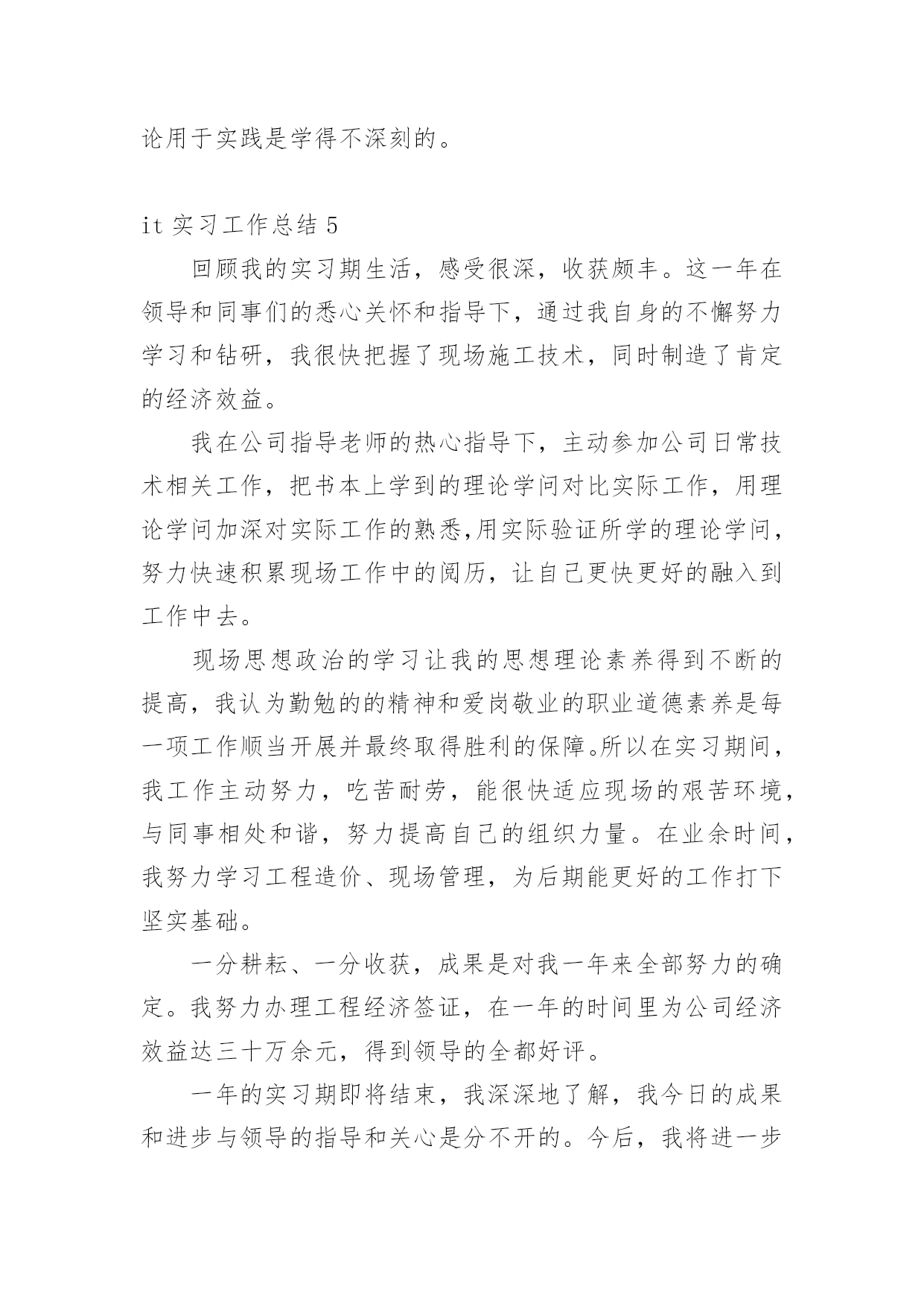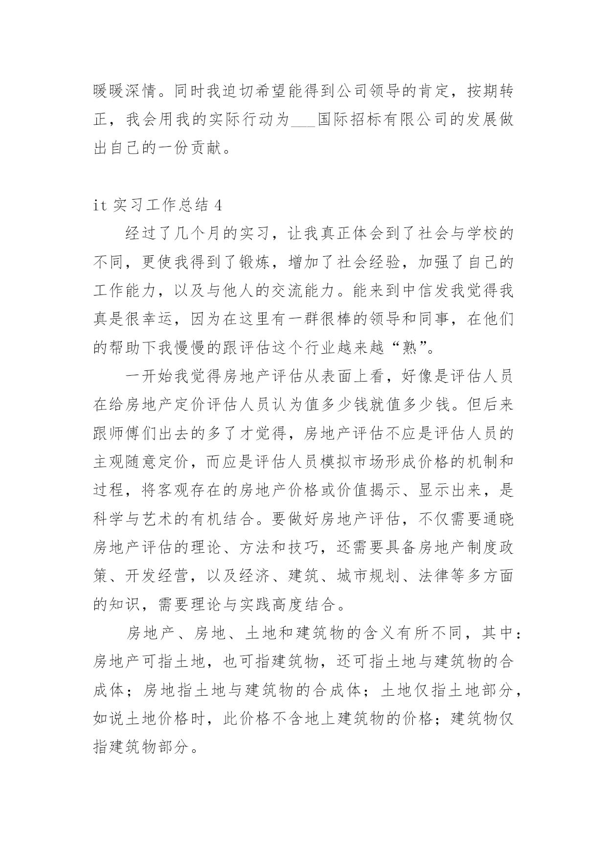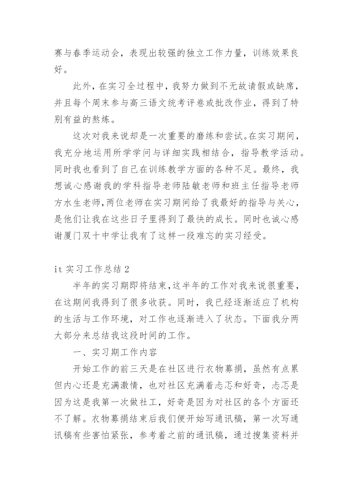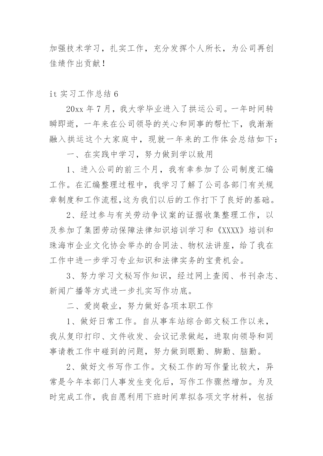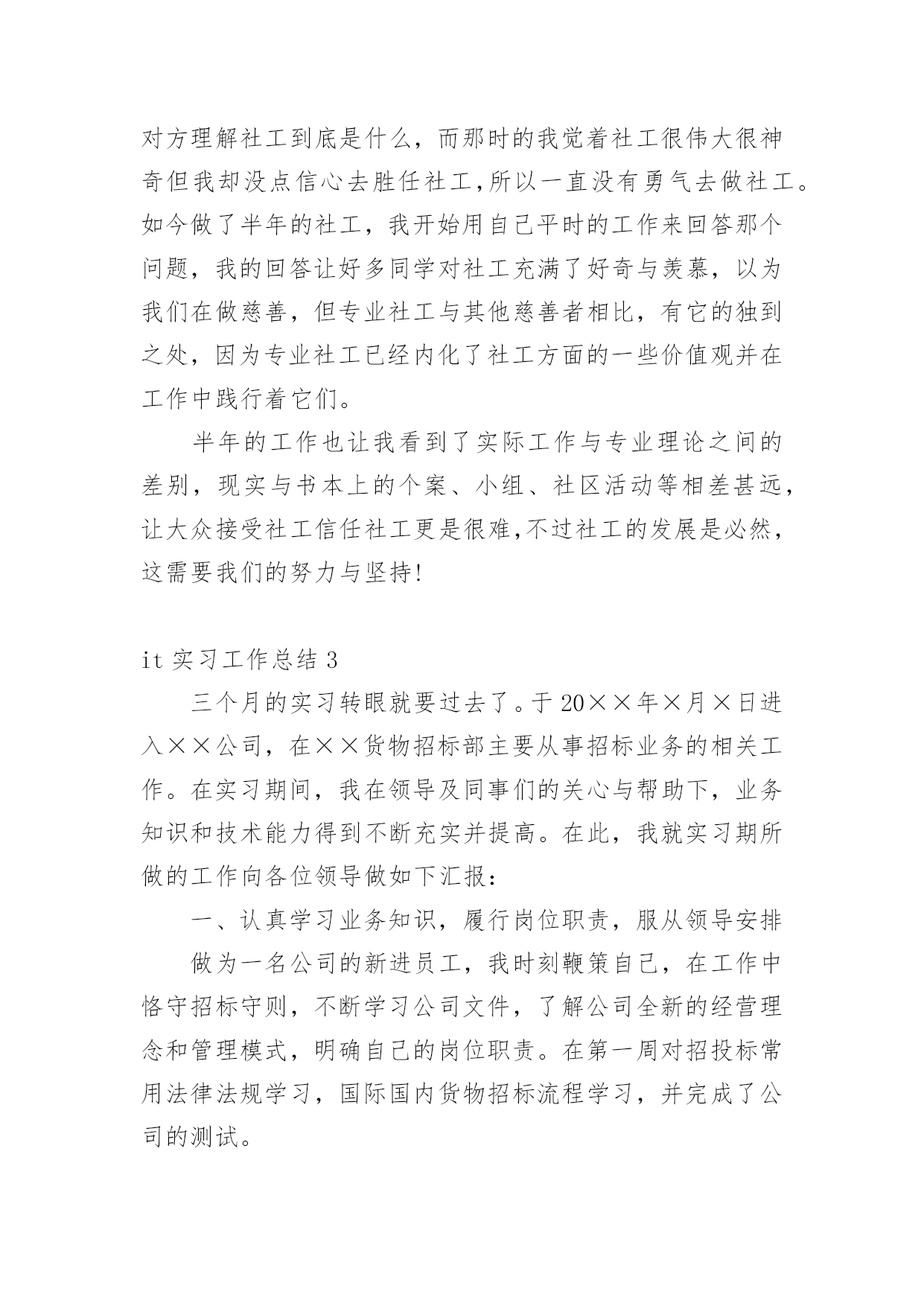 it实习工作总结总结是对过去一定时期的工作、学习或思想情况进行回顾、分析,并做出客观评价的书面材料,它可使零星的、肤浅的、表面的感性认知上升到全面的、系统的、本质的理性认识上来,快快来写一份总结吧。那么你真的懂得怎么写总结吗?以下是小编为大家整理的it实习工作总结,供大家参考借鉴,希望可以帮助到有需要的朋友。it实习工作总结1在三个月的实习期中,在XX中学领导和指导老师的关心指导下,我较好地完成了训练实习任务。下面,就实习期间自己在教学实习和班主任实习等方面的工作做一个自我总结:在训练教学工作中,我能在指导老师的关心下仔细备课,尽量做到所设计的每一个教案及课件内容都精准合理,符合规范。在课堂教学中,教学语言表达清晰、流畅,取得了较好的教学效果。课外辅导时则努力做到耐烦细致,对不同程度的同学都能区分状况,因材施教,答疑解惑正确而有启发性,批改作业及考卷认真正确。在实习班主任工作中,我也能较好地把握和熟识全班同学姓名、个性特点、爱好爱好、思想状况,组织状况以及班级特点,工作主动主动,仔细负责,处理日常事务敏捷而不拖沓,带动同学们的学习生活热忱,并一起参加了班级篮球赛与春季运动会,表现出较强的独立工作力量,训练效果良好。此外,在实习全过程中,我努力做到不无故请假或缺席,并且每个周末参与高三语文统考评卷或批改作业,得到了特别有益的熬炼。这次对我来说却是一次重要的磨练和尝试。在实习期间,我充分地运用所学学问与详细实践相结合,指导教学活动。同时我也看到了自己在训练教学方面的各种不足。最终,我想诚心感谢我的学科指导老师陆敏老师和班主任指导老师方水生老师,两位老师在实习期间给了我最好的指导与关心,是他们让我在这些日子里得到了最快的成长。同时也诚心感谢厦门双十中学让我有了这样一段难忘的实习经受。it实习工作总结2半年的实习期即将结束,这半年的工作对我来说很重要,在这期间我得到了很多收获。同时,我已经逐渐适应了机构的生活与工作环境,对工作也逐渐进入了状态。下面我分两大部分来总结我这段时间的工作。一、实习期工作内容开始工作的前三天是在社区进行衣物募捐,虽然有点累但内心还是充满激情,也对社区充满着忐忑和好奇,忐忑是因为这是我第一次做社工,好奇是因为对社区的各个方面还不了解。衣物募捐结束后我们便开始写通讯稿,第一次写通讯稿有些害怕紧张,参考着之前的通讯稿,通过搜集资料并结合自己的工作感受完成了第一份通讯稿,当时心里有些小欣喜,我对自己的工作也开始充满着热情与干劲。通过查阅爱民社工机构以前的活动资料来了解我们的机构,并试着拟写活动策划书。后来我被分在岗位社工,有机会_就带着我一起去社区,教我如何与社区工作人员打交道、如何与活动举办的联合单位人员打交道与合作、如何与社区居民沟通交流等。没多久,我与_接受了新的任务与考验——装饰楼栋,任务一下来我们就开始进行多种设想并搜集资料,楼栋装饰主要工作有拟写策划书与通知、打扫楼栋卫生、整理出小书架、拟写图书借阅须知、购买书籍和装饰楼栋所需物品、搜集素材、制作装饰物等。忙着楼栋装饰的同时也在_她们三个的带领下进行着其他的一些工作。前不久我们对聋哑人家庭进行了一次家访,这是我第一次家访也是我第一次亲密接触这些听力残障人士,开始有些慌张,慢慢的我被他们的热情所感动。周末影院系列活动在从第二期开始走入正常轨道,做到了准时播放,并且观影人数越来越多,效果也越来越好,我们与上周来观影的居民进行了很好的互动交流。二、工作反思与总结通过半年的工作,我收获很大,也有很多感触。首先,在理论学习与实践工作方面。一直有个问题让我难以做出恰当的回答:社工是干什么的?没毕业前我总是拿书本上的理论知识来对社工做解释,不过我的解释并没能让对方理解社工到底是什么,而那时的我觉着社工很伟大很神奇但我却没点信心去胜任社工,所以一直没有勇气去做社工。如今做了半年的社工,我开始用自己平时的工作来回答那个问题,我的回答让好多同学对社工充满了好奇与羡慕,以为我们在做慈善,但专业社工与其他慈善者相比,有它的独到之处,因为专业社工已经内化了社工方面的一些价值观并在工作中践行着它们。半年的工作也让我看到了实际工作与专业理论之间的差别,现实与书本上的个案、小组、社区活动等相差甚远,让大众接受社工信任社工更是很难,不过社工的发展是必然,这需要我们的努力与坚持!it实习工作总结3三个月的实习转眼就要过去了。于20××年×月×日进入××公司,在××货物招标部主要从事招标业务的相关工作。在实习期间,我在领导及同事们的关心与帮助下,业务知识和技术能力得到不断充实并提高。在此,我就实习期所做的工作向各位领导做如下汇报:一、认真学习业务知识,履行岗位职责,服从领导安排做为一名公司的新进员工,我时刻鞭策自己,在工作中恪守招标守则,不断学习公司文件,了解公司全新的经营理念和管理模式,