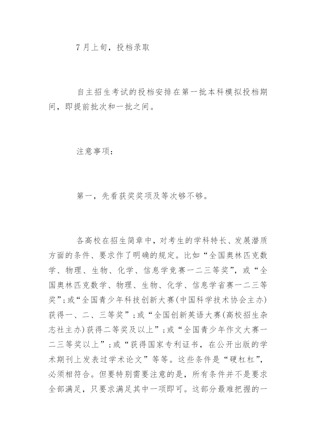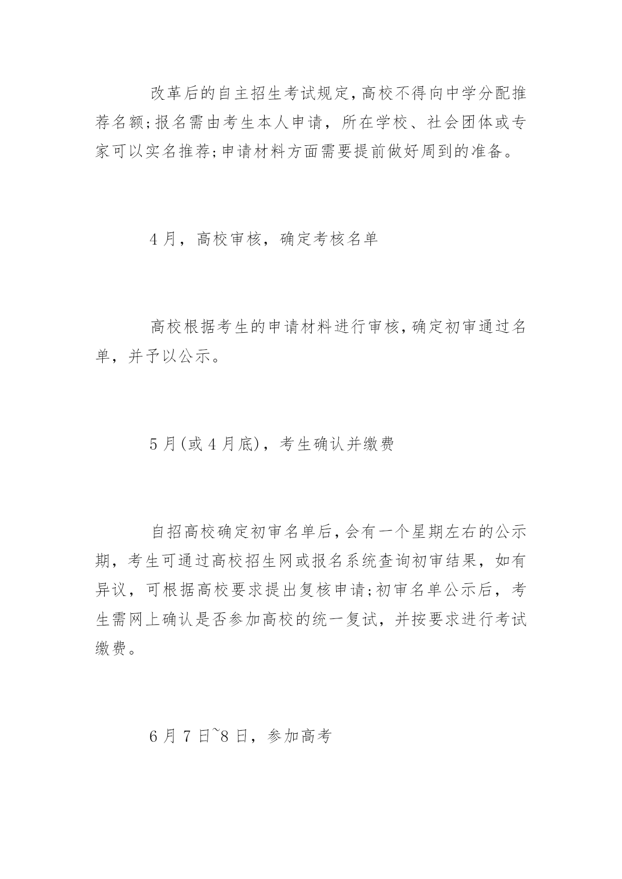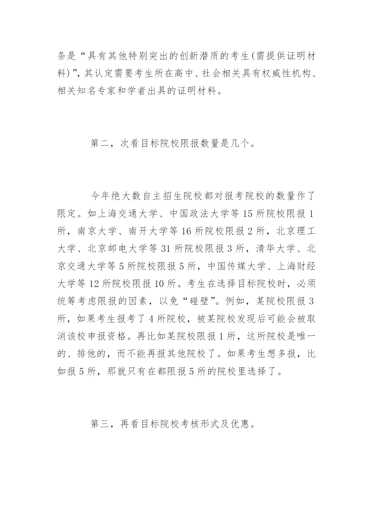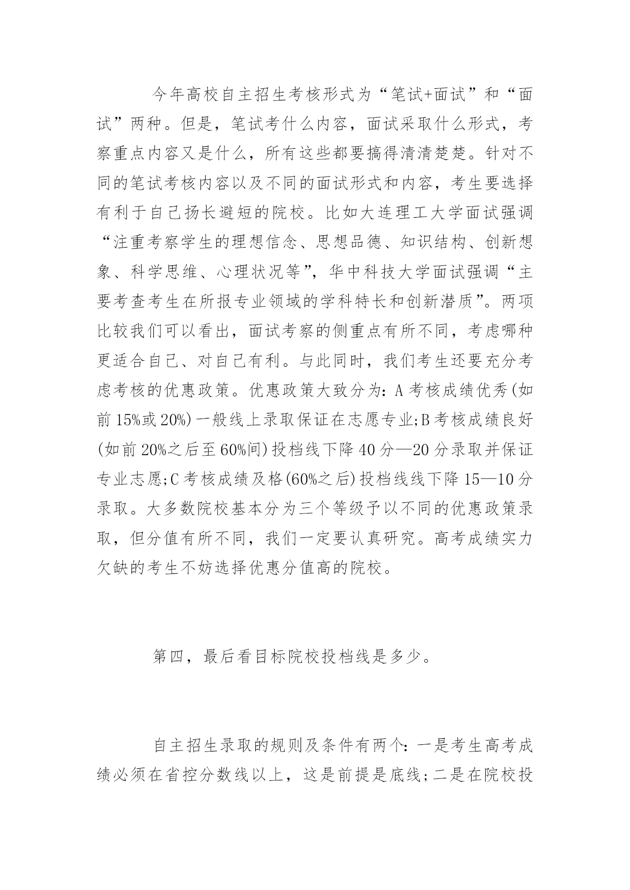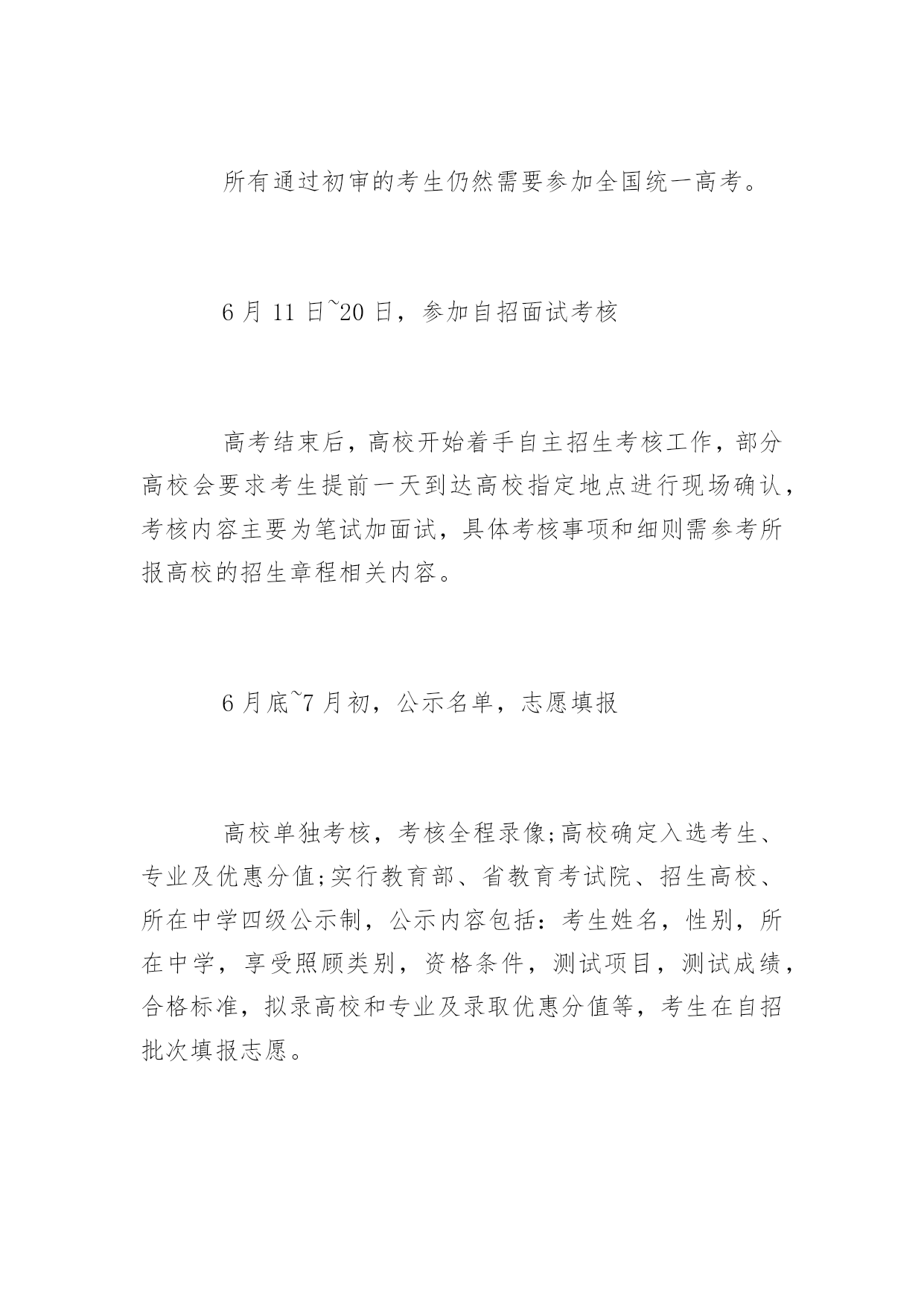 高校自主招生考试流程2017高校自主招生考试流程每年年2月底或者3月初,各自主招生高校会陆续发布招生简章,每年都有考生通过自主招生圆了名校梦,每年也有更多考生折戟考场,甚至有考生因为准备自主招生考试而影响了高考复习,以致高考失利。那么2017高校自主招生考试流程是什么,怎么考?下面跟yjbys小编一起来看看吧!2月底~3月初,高校发布自招简章考生需要明确目标高校的报名条件、审核办法、考核时间等信息。建议考生和家长关注鱼跃教育官方微信或教育部阳光高考网,获取相关信息。3月,考生申请报名,报送申请材料改革后的自主招生考试规定,高校不得向中学分配推荐名额;报名需由考生本人申请,所在学校、社会团体或专家可以实名推荐;申请材料方面需要提前做好周到的准备。4月,高校审核,确定考核名单高校根据考生的申请材料进行审核,确定初审通过名单,并予以公示。5月(或4月底),考生确认并缴费自招高校确定初审名单后,会有一个星期左右的公示期,考生可通过高校招生网或报名系统查询初审结果,如有异议,可根据高校要求提出复核申请;初审名单公示后,考生需网上确认是否参加高校的统一复试,并按要求进行考试缴费。6月7日~8日,参加高考所有通过初审的考生仍然需要参加全国统一高考。6月11日~20日,参加自招面试考核高考结束后,高校开始着手自主招生考核工作,部分高校会要求考生提前一天到达高校指定地点进行现场确认,考核内容主要为笔试加面试,具体考核事项和细则需参考所报高校的招生章程相关内容。6月底~7月初,公示名单,志愿填报高校单独考核,考核全程录像;高校确定入选考生、专业及优惠分值;实行教育部、省教育考试院、招生高校、所在中学四级公示制,公示内容包括:考生姓名,性别,所在中学,享受照顾类别,资格条件,测试项目,测试成绩,合格标准,拟录高校和专业及录取优惠分值等,考生在自招批次填报志愿。7月上旬,投档录取自主招生考试的投档安排在第一批本科模拟投档期间,即提前批次和一批之间。注意事项:第一,先看获奖奖项及等次够不够。各高校在招生简章中,对考生的学科特长、发展潜质方面的条件、要求作了明确的规定。比如“全国奥林匹克数学、物理、生物、化学、信息学竞赛一二三等奖”,或“全国奥林匹克数学、物理、生物、化学、信息学省赛一二三等奖”;或“全国青少年科技创新大赛(中国科学技术协会主办)获得一、二、三等奖”;或“全国创新英语大赛(高校招生杂志社主办)获得二等奖及以上”;或“全国青少年作文大赛一二三等奖以上”;或“获得国家专利证书,在公开出版的学术期刊上发表过学术论文”等等。这些条件是“硬杠杠”,必须相符合。但要特别需要注意的是,所有条件并不是要求全部满足,只要求满足其中一项即可。这部分最难把握的一条是“具有其他特别突出的创新潜质的考生(需提供证明材料)”,其认定需要考生所在高中、社会相关具有权威性机构、相关知名专家和学者出具的证明材料。第二,次看目标院校限报数量是几个。今年绝大数自主招生院校都对报考院校的数量作了限定。如上海交通大学、中国政法大学等15所院校限报1所,南京大学、南开大学等16所院校限报2所,北京理工大学、北京邮电大学等31所院校限报3所,清华大学、北京交通大学等5所院校限报5所,中国传媒大学、上海财经大学等12所院校限报10所。考生在选择目标院校时,必须统筹考虑限报的因素,以免“碰壁”。例如,某院校限报3所,如果考生报考了4所院校,被某院校发现后可能会被取消该校申报资格。再比如某院校限报1所,这所院校是唯一的、排他的,而不能再报其他院校了。如果考生想多报,比如报5所,那就只有在都限报5所的院校里选择了。第三,再看目标院校考核形式及优惠。今年高校自主招生考核形式为“笔试+面试”和“面试”两种。但是,笔试考什么内容,面试采取什么形式,考察重点内容又是什么,所有这些都要搞得清清楚楚。针对不同的笔试考核内容以及不同的面试形式和内容,考生要选择有利于自己扬长避短的院校。比如大连理工大学面试强调“注重考察学生的理想信念、思想品德、知识结构、创新想象、科学思维、心理状况等”,华中科技大学面试强调“主要考查考生在所报专业领域的学科特长和创新潜质”。两项比较我们可以看出,面试考察的侧重点有所不同,考虑哪种更适合自己、对自己有利。与此同时,我们考生还要充分考虑考核的优惠政策。优惠政策大致分为:A考核成绩优秀(如前15%或20%)一般线上录取保证在志愿专业;B考核成绩良好(如前20%之后至60%间)投档线下降40分—20分录取并保证专业志愿;C考核成绩及格(60%之后)投档线线下降15—10分录取。大多数院校基本分为三个等级予以不同的优惠政策录取,但分值有所不同,我们一定要认真研究。高考成绩实力欠缺的考生不妨选择优惠分值高的院校。第四,最后看目标院