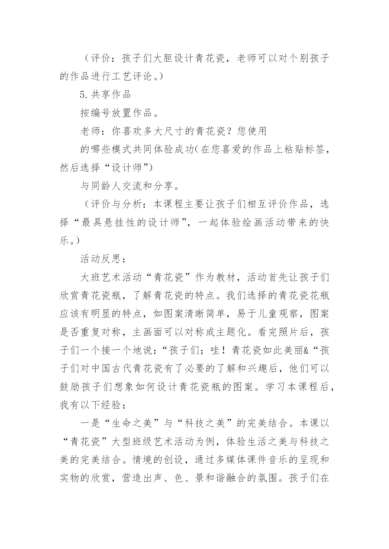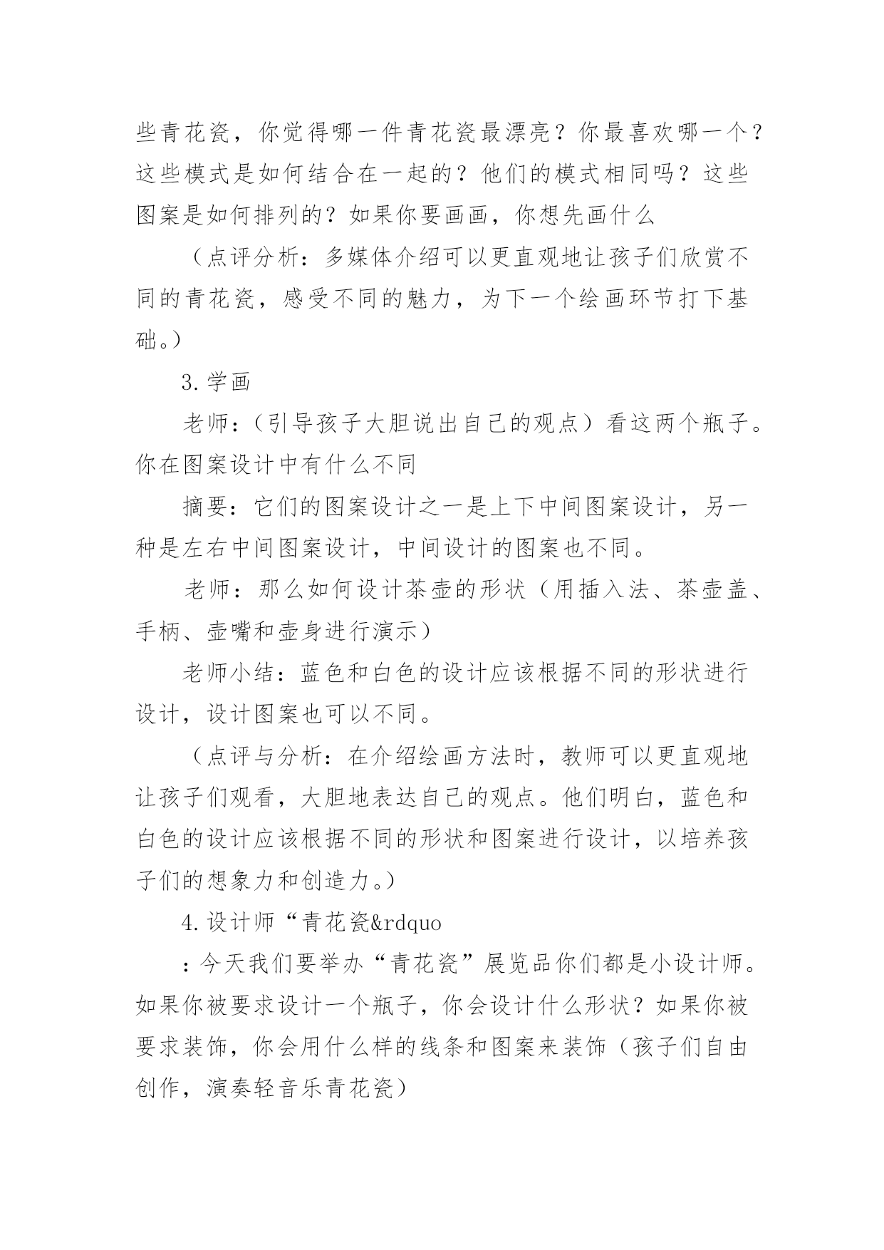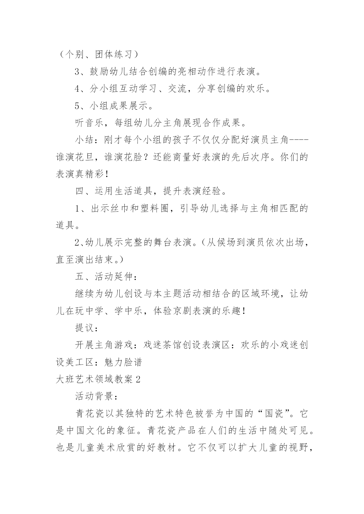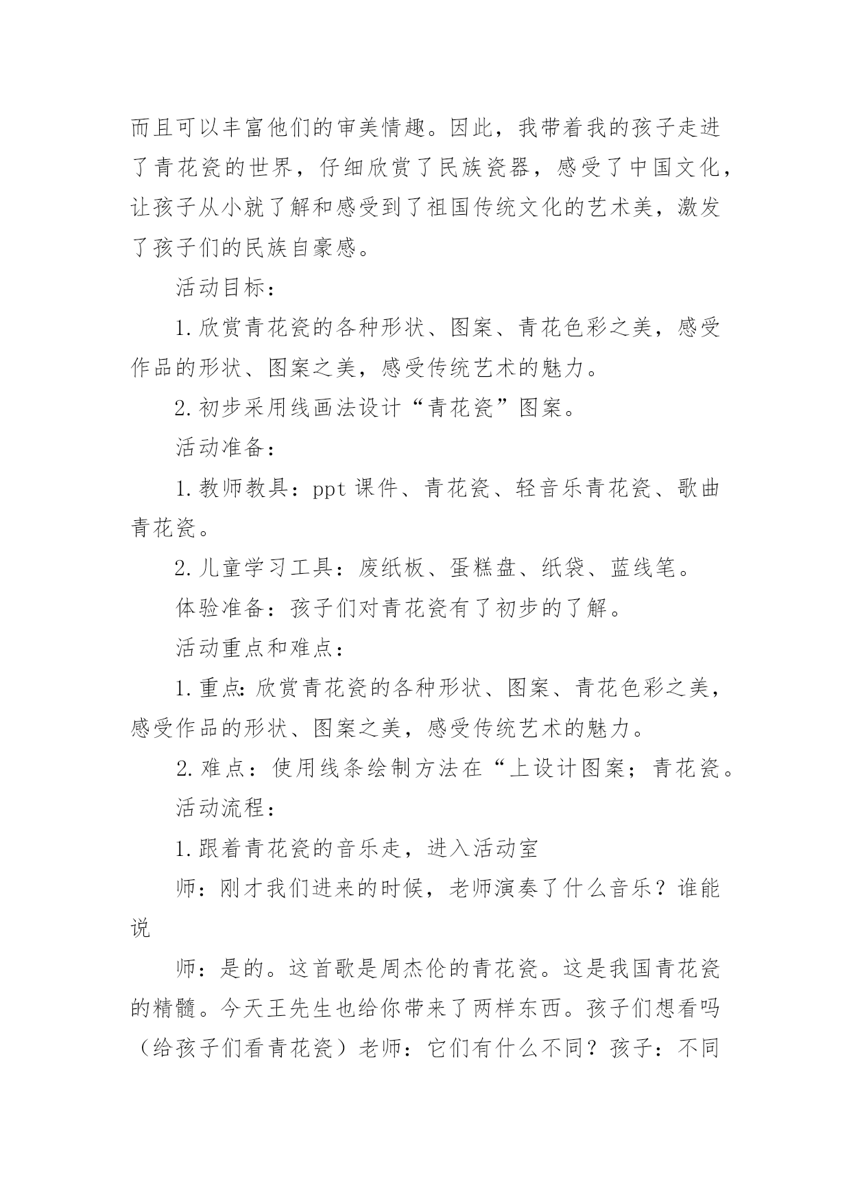 大班艺术领域教案大班艺术领域教案作为一位不辞辛劳的人民教师,通常会被要求编写教案,教案是保证教学取得成功、提高教学质量的基本条件。那么写教案需要注意哪些问题呢?以下是小编帮大家整理的大班艺术领域教案,仅供参考,欢迎大家阅读。大班艺术领域教案1活动目标:1、感受京剧表演中的唱腔和身法,体验京剧的魅力,萌发对京剧表演的喜爱。2、尝试京剧表演,用自我的方式大胆表现。重难点分析:重点:引导幼儿在感受和观察比较中学习花旦和花脸的走路和亮相。难点:引导幼儿把已有的经验初步迁移到京歌中。活动准备:环境准备:把有关京剧脸谱的装饰布置在活动室里,供幼儿欣赏。知识经验准备:与幼儿共同收集有关京剧的资料,并了解京剧的四大行当及各种京剧脸谱的代表人物。物质准备:1、教师准备材料:制作多媒体课件《说唱脸谱》,挑选京剧选段(有关花旦和花脸的音像资料),录音机及磁带。2、幼儿操作材料:在四个花篮里放有丝巾若干、塑料圈若干(与幼儿人数相符)。教学过程:一、营造京剧的氛围,激发幼儿的兴趣。1、幼儿在京歌《说唱脸谱》音乐伴奏下进入活动室。(背景是多媒体课件《说唱脸谱》,用来衬托京剧表演的氛围。)2、教师用京剧四大行当中的念的语调向大家问好,与幼儿互动。3、引导幼儿讲述有关京剧的已知经验,帮忙幼儿了解京剧的文化。小结:京剧是我们中华民族的国粹,有两百多年的历史,不但受到中国人民的喜爱,也深受外国友人的欢迎,是中国人的骄傲!二、运用多种感官,学习花旦和花脸的动作特征。我们一齐走进京剧的世界,领略京剧中人物的风采。1、欣赏京剧《卖水》选段,学习花旦走路的动作。教师提问:1、花旦是怎样走的?手部的动作是什么样的?2、为什么花旦走路会这么轻啊?你试试,怎样走才会又快又轻呢?3、幼儿尝试表演。(个别表演与团体表演相结合)小结:花旦走路快如飞,两腿并紧迈小步,一步跟着一步走,挺胸走路真开心。这种步子它还有一个名字叫圆场步,演员进场和出场时会这么走。2、欣赏京剧《铡包勉》选段,学习花脸走路的动作。教师提问:1、花脸走路的感觉怎样样啊(神气)2、花脸的脚尖和花旦的脚尖有什么不一样?为什么花脸走路的时候手要架起来?3、学花脸走路时腰应当要怎样样啊?(挺直了)4、幼儿尝试表演。(个别表现与团体表现相结合,教师口念:匡-采、匡-采)小结:花脸走路真神气,勾脚用力向前踢,前脚迈出,后脚跟紧,腰板挺直,两手用力握。古时候当官的人都是这么走的,异常神气!三、欣赏京歌《说唱脸谱》,体验小组表演的乐趣。1、请幼儿欣赏京歌《说唱脸谱》。教师提问:请大家说说听了这段音乐,你有什么样的感受呀小结;这首《说唱脸谱》把唱歌和京剧融合在了一齐,我们就把它叫做京歌。2、欣赏京歌第二遍,引导幼儿分辨AB段资料。(重点找出AB段中间的间奏)教师提问:这首京歌的演唱分成了前后两部分,你听出那一段适合花旦表演?(个别、团体练习)那后面一段就比较适合谁表演呀?(个别、团体练习)3、鼓励幼儿结合创编的亮相动作进行表演。4、分小组互动学习、交流,分享创编的欢乐。5、小组成果展示。听音乐,每组幼儿分主角展现合作成果。小结:刚才每个小组的孩子不仅仅分配好演员主角----谁演花旦,谁演花脸?还能商量好表演的先后次序。你们的表演真精彩!四、运用生活道具,提升表演经验。1、出示丝巾和塑料圈,引导幼儿选择与主角相匹配的道具。2、幼儿展示完整的舞台表演。(从候场到演员依次出场,直至演出结束。)五、活动延伸:继续为幼儿创设与本主题活动相结合的区域环境,让幼儿在玩中学、学中乐,体验京剧表演的乐趣!提议:开展主角游戏:戏迷茶馆创设表演区:欢乐的小戏迷创设美工区:魅力脸谱大班艺术领域教案2活动背景:青花瓷以其独特的艺术特色被誉为中国的“国瓷”。它是中国文化的象征。青花瓷产品在人们的生活中随处可见。也是儿童美术欣赏的好教材。它不仅可以扩大儿童的视野,而且可以丰富他们的审美情趣。因此,我带着我的孩子走进了青花瓷的世界,仔细欣赏了民族瓷器,感受了中国文化,让孩子从小就了解和感受到了祖国传统文化的艺术美,激发了孩子们的民族自豪感。活动目标:1.欣赏青花瓷的各种形状、图案、青花色彩之美,感受作品的形状、图案之美,感受传统艺术的魅力。2.初步采用线画法设计“青花瓷”图案。活动准备:1.教师教具:ppt课件、青花瓷、轻音乐青花瓷、歌曲青花瓷。2.儿童学习工具:废纸板、蛋糕盘、纸袋、蓝线笔。体验准备:孩子们对青花瓷有了初步的了解。活动重点和难点:1.重点:欣赏青花瓷的各种形状、图案、青花色彩之美,感受作品的形状、图案之美,感受传统艺术的魅力。2.难点:使用线条绘制方法在“上设计图案;青花瓷。活动流程:1.跟着青花瓷的音乐走,进入活动室师:刚才我们进来的时候,老师演奏了什么音乐?谁能说师:是的。这首歌是周杰伦的青花瓷。这是我国青花瓷的精髓。今天王先生也给你带