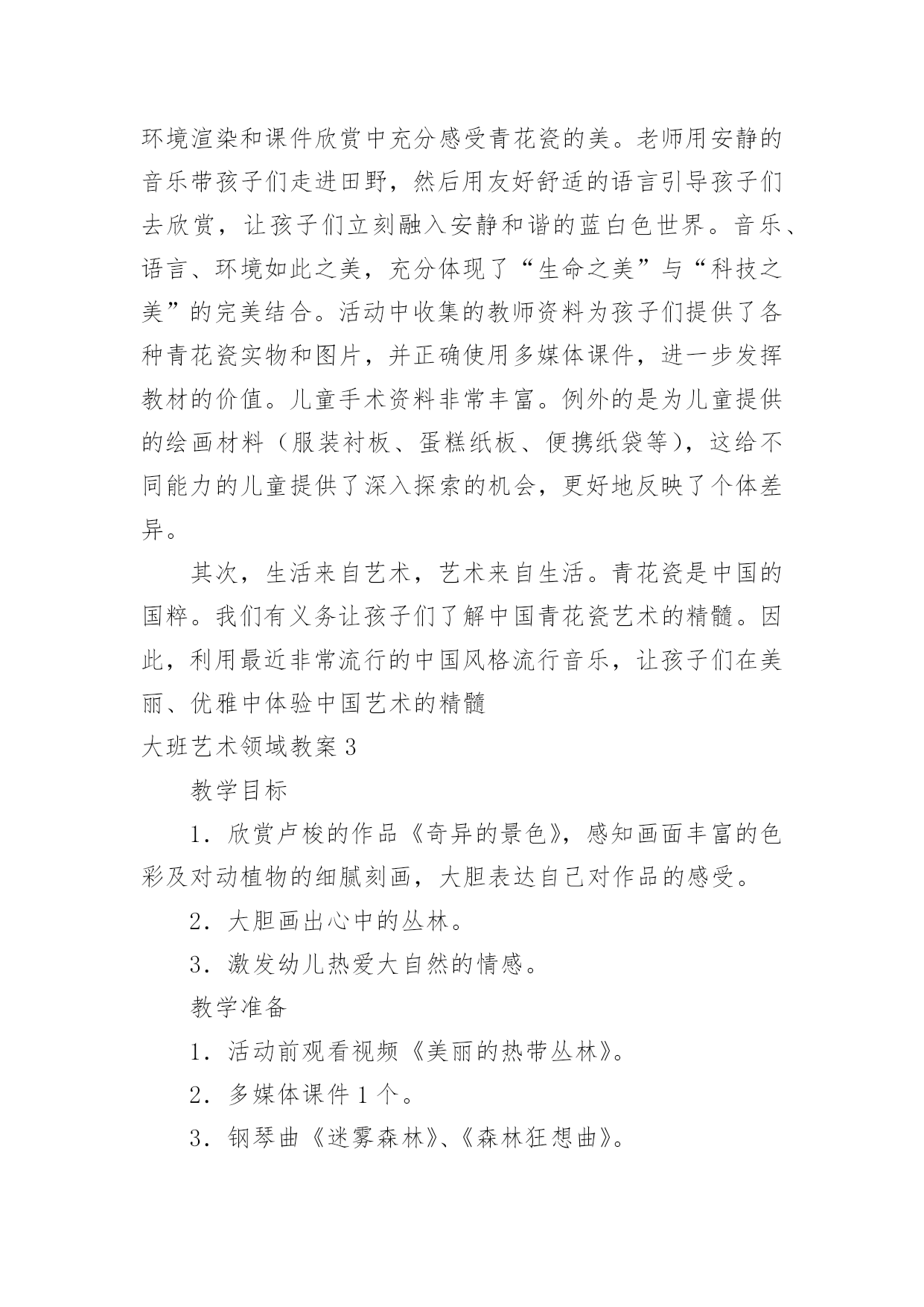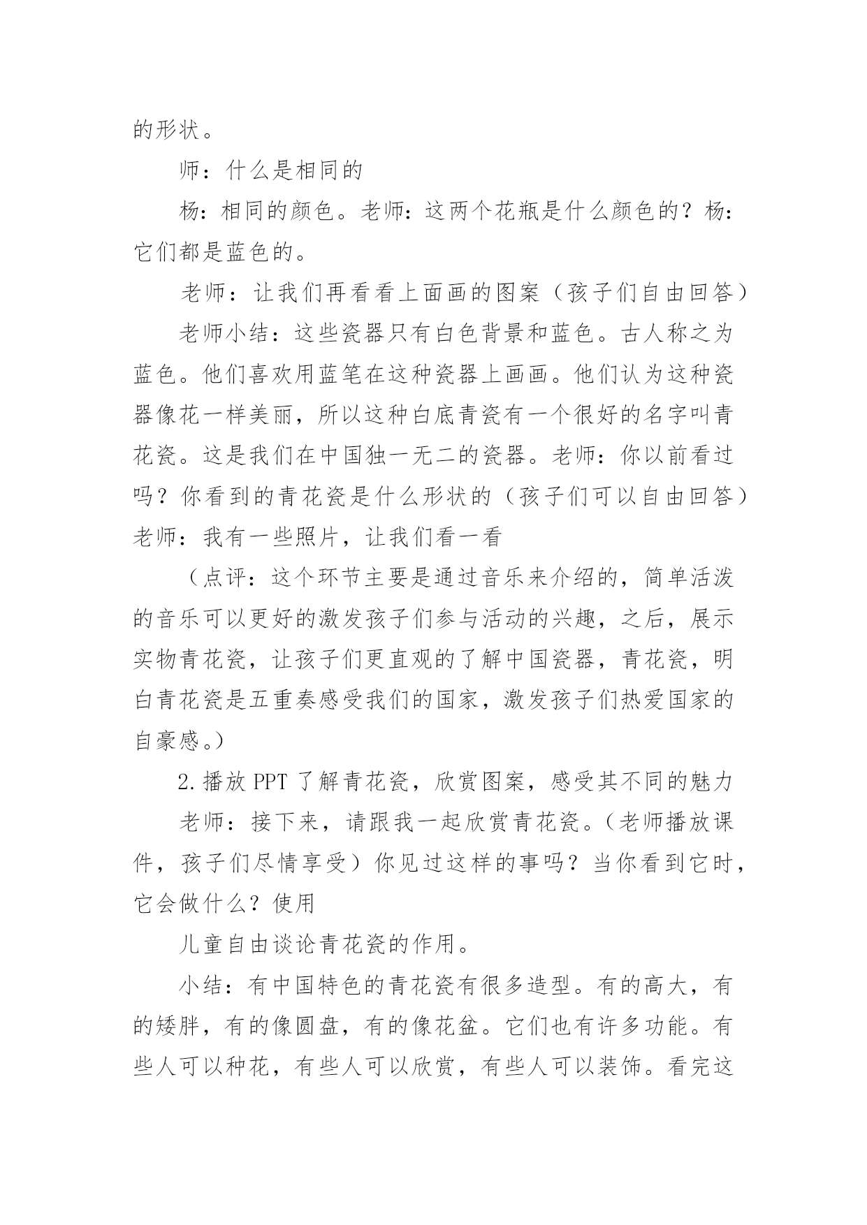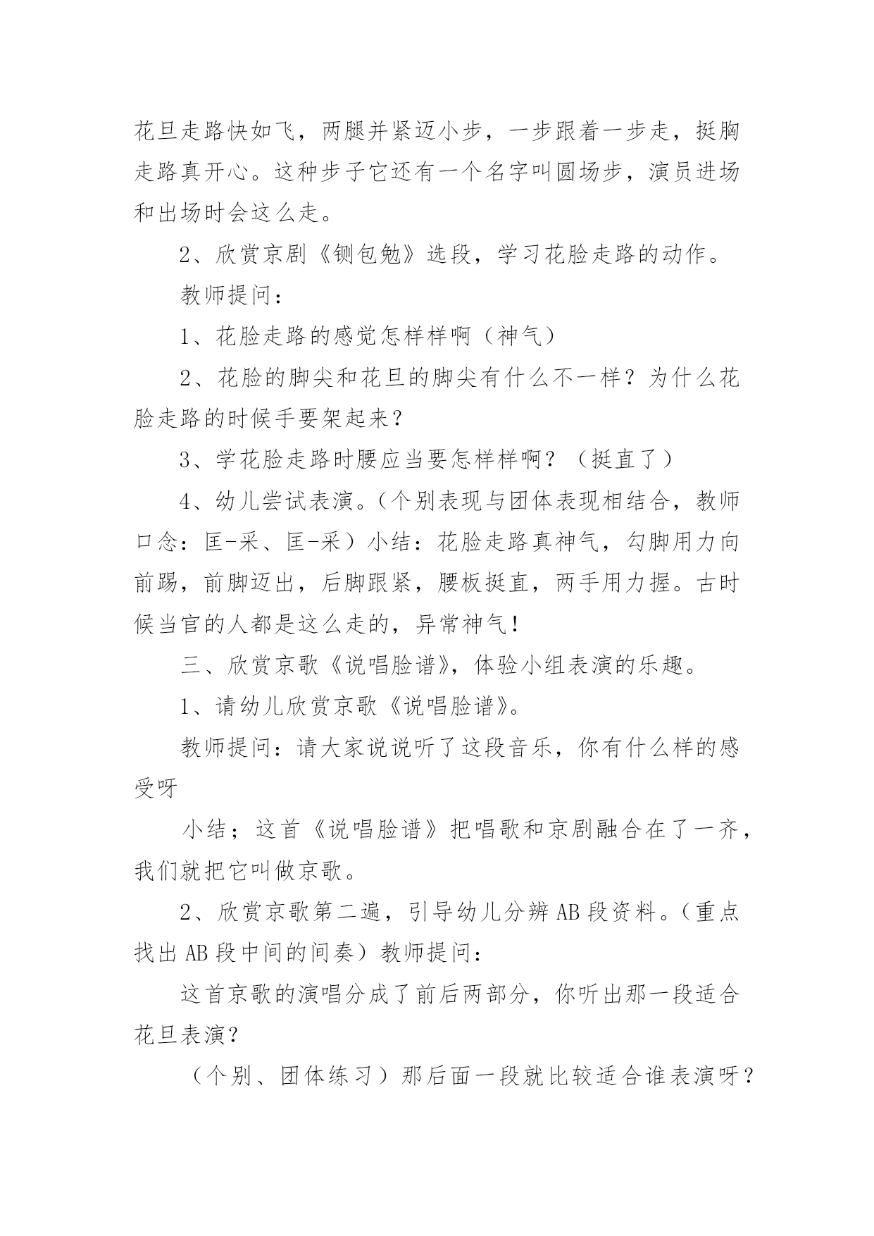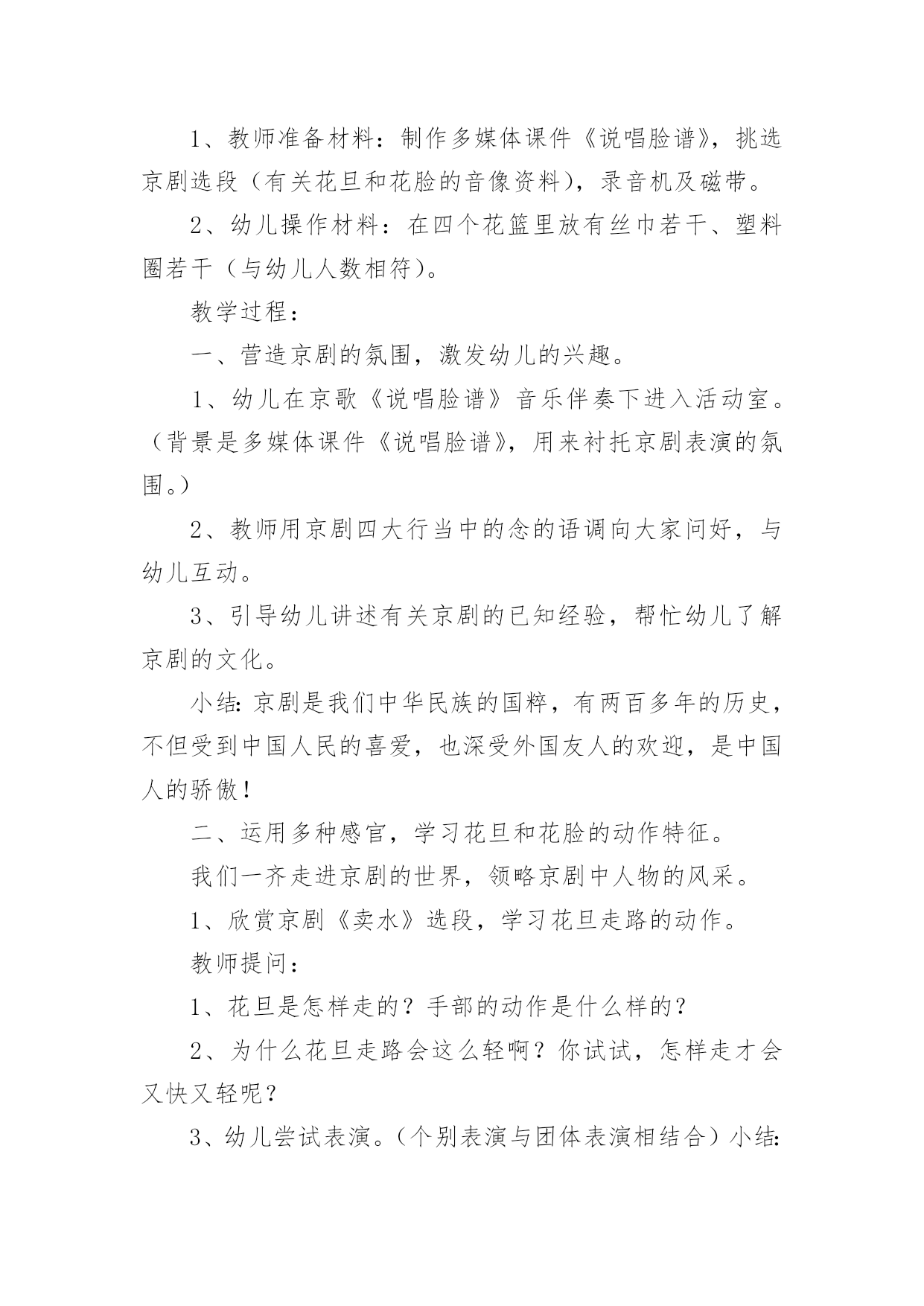大班艺术领域教案大班艺术领域教案作为一位不辞辛劳的人民教师,通常会被要求编写教案,教案是保证教学取得成功、提高教学质量的基本条件。那么写教案需要注意哪些问题呢?以下是小编帮大家整理的大班艺术领域教案,仅供参考,欢迎大家阅读。大班艺术领域教案1活动目标:1、感受京剧表演中的唱腔和身法,体验京剧的魅力,萌发对京剧表演的喜爱。2、尝试京剧表演,用自我的方式大胆表现。重难点分析:重点:引导幼儿在感受和观察比较中学习花旦和花脸的走路和亮相。难点:引导幼儿把已有的经验初步迁移到京歌中。活动准备:环境准备:把有关京剧脸谱的装饰布置在活动室里,供幼儿欣赏。知识经验准备:与幼儿共同收集有关京剧的资料,并了解京剧的四大行当及各种京剧脸谱的代表人物。物质准备:1、教师准备材料:制作多媒体课件《说唱脸谱》,挑选京剧选段(有关花旦和花脸的音像资料),录音机及磁带。2、幼儿操作材料:在四个花篮里放有丝巾若干、塑料圈若干(与幼儿人数相符)。教学过程:一、营造京剧的氛围,激发幼儿的兴趣。1、幼儿在京歌《说唱脸谱》音乐伴奏下进入活动室。(背景是多媒体课件《说唱脸谱》,用来衬托京剧表演的氛围。)2、教师用京剧四大行当中的念的语调向大家问好,与幼儿互动。3、引导幼儿讲述有关京剧的已知经验,帮忙幼儿了解京剧的文化。小结:京剧是我们中华民族的国粹,有两百多年的历史,不但受到中国人民的喜爱,也深受外国友人的欢迎,是中国人的骄傲!二、运用多种感官,学习花旦和花脸的动作特征。我们一齐走进京剧的世界,领略京剧中人物的风采。1、欣赏京剧《卖水》选段,学习花旦走路的动作。教师提问:1、花旦是怎样走的?手部的动作是什么样的?2、为什么花旦走路会这么轻啊?你试试,怎样走才会又快又轻呢?3、幼儿尝试表演。(个别表演与团体表演相结合)小结:花旦走路快如飞,两腿并紧迈小步,一步跟着一步走,挺胸走路真开心。这种步子它还有一个名字叫圆场步,演员进场和出场时会这么走。2、欣赏京剧《铡包勉》选段,学习花脸走路的动作。教师提问:1、花脸走路的感觉怎样样啊(神气)2、花脸的脚尖和花旦的脚尖有什么不一样?为什么花脸走路的时候手要架起来?3、学花脸走路时腰应当要怎样样啊?(挺直了)4、幼儿尝试表演。(个别表现与团体表现相结合,教师口念:匡-采、匡-采)小结:花脸走路真神气,勾脚用力向前踢,前脚迈出,后脚跟紧,腰板挺直,两手用力握。古时候当官的人都是这么走的,异常神气!三、欣赏京歌《说唱脸谱》,体验小组表演的乐趣。1、请幼儿欣赏京歌《说唱脸谱》。教师提问:请大家说说听了这段音乐,你有什么样的感受呀小结;这首《说唱脸谱》把唱歌和京剧融合在了一齐,我们就把它叫做京歌。2、欣赏京歌第二遍,引导幼儿分辨AB段资料。(重点找出AB段中间的间奏)教师提问:这首京歌的演唱分成了前后两部分,你听出那一段适合花旦表演?(个别、团体练习)那后面一段就比较适合谁表演呀?(个别、团体练习)3、鼓励幼儿结合创编的亮相动作进行表演。4、分小组互动学习、交流,分享创编的欢乐。5、小组成果展示。听音乐,每组幼儿分主角展现合作成果。小结:刚才每个小组的孩子不仅仅分配好演员主角----谁演花旦,谁演花脸?还能商量好表演的先后次序。你们的表演真精彩!四、运用生活道具,提升表演经验。1、出示丝巾和塑料圈,引导幼儿选择与主角相匹配的道具。2、幼儿展示完整的舞台表演。(从候场到演员依次出场,直至演出结束。)五、活动延伸:继续为幼儿创设与本主题活动相结合的区域环境,让幼儿在玩中学、学中乐,体验京剧表演的乐趣!提议:开展主角游戏:戏迷茶馆创设表演区:欢乐的小戏迷创设美工区:魅力脸谱大班艺术领域教案2活动背景:青花瓷以其独特的艺术特色被誉为中国的“国瓷”。它是中国文化的象征。青花瓷产品在人们的生活中随处可见。也是儿童美术欣赏的好教材。它不仅可以扩大儿童的视野,而且可以丰富他们的审美情趣。因此,我带着我的孩子走进了青花瓷的世界,仔细欣赏了民族瓷器,感受了中国文化,让孩子从小就了解和感受到了祖国传统文化的艺术美,激发了孩子们的民族自豪感。活动目标:1.欣赏青花瓷的各种形状、图案、青花色彩之美,感受作品的形状、图案之美,感受传统艺术的魅力。2.初步采用线画法设计“青花瓷”图案。活动准备:1.教师教具:ppt课件、青花瓷、轻音乐青花瓷、歌曲青花瓷。2.儿童学习工具:废纸板、蛋糕盘、纸袋、蓝线笔。体验准备:孩子们对青花瓷有了初步的了解。活动重点和难点:1.重点:欣赏青花瓷的各种形状、图案、青花色彩之美,感受作品的形状、图案之美,感受传统艺术的魅力。2.难点:使用线条绘制方法在“上设计图案;青花瓷。活动流程:1.跟着青花瓷的音乐走,进入活动室师:刚才我们进来的时候,老师演奏了什么音乐?谁能说师:是的。这首歌是周杰伦的青花瓷。这是我国青花瓷的精髓。今天王先生也给你带