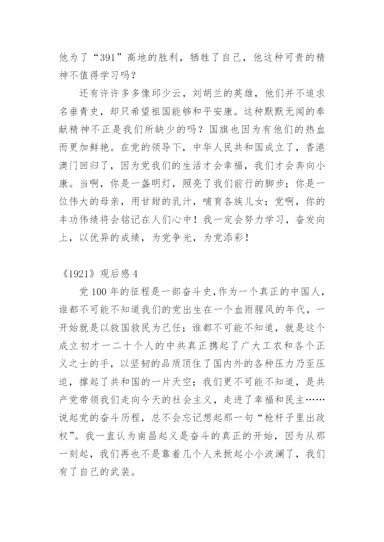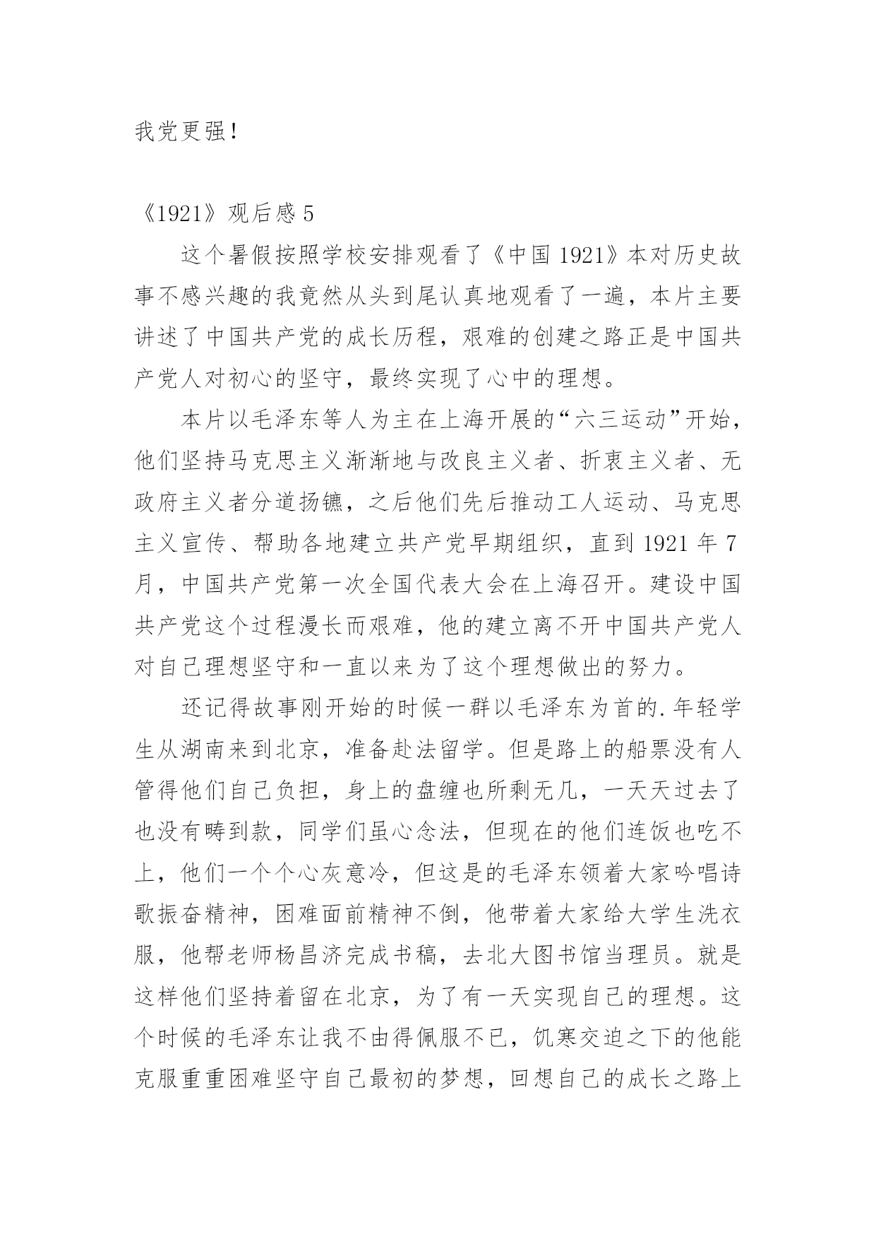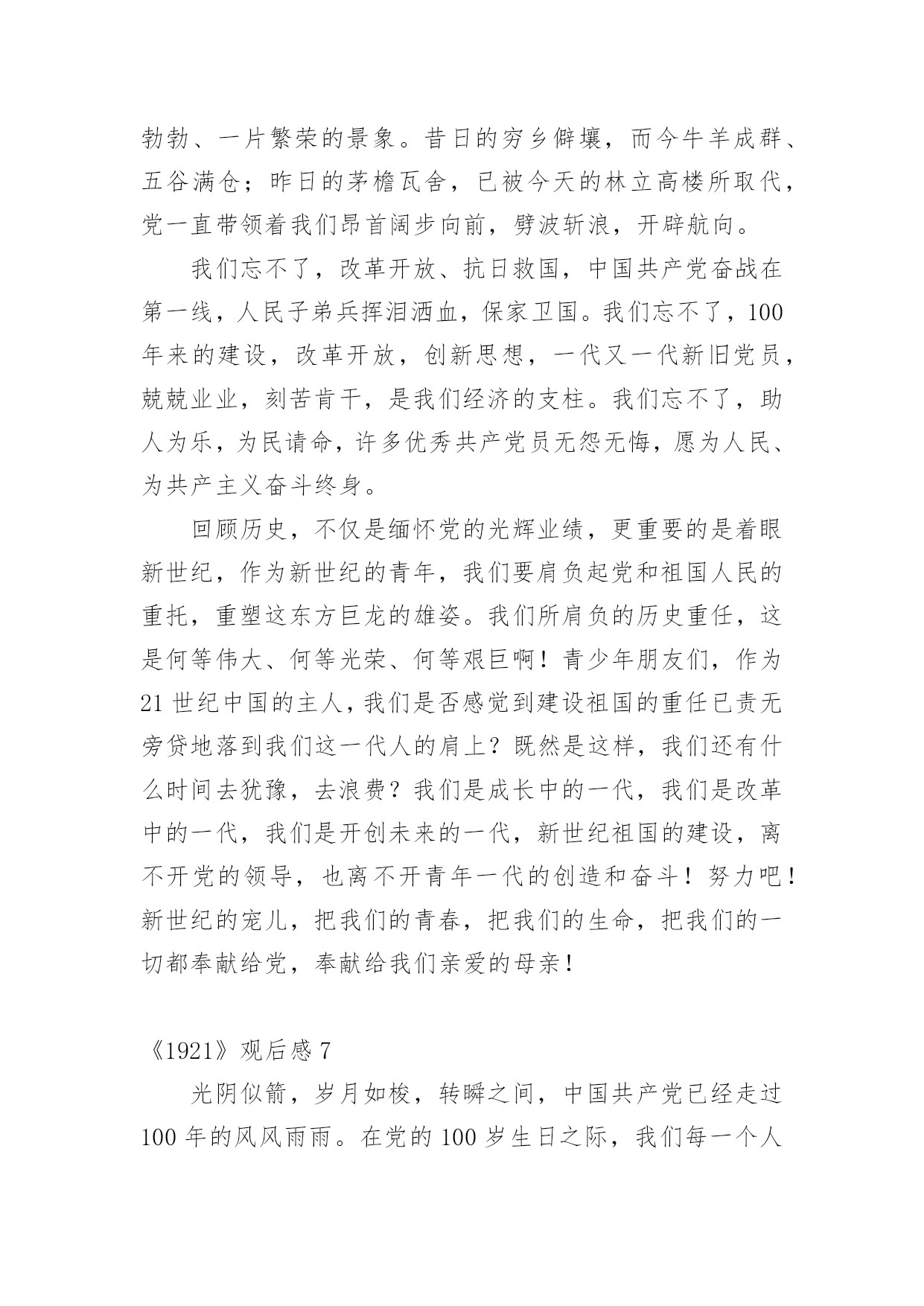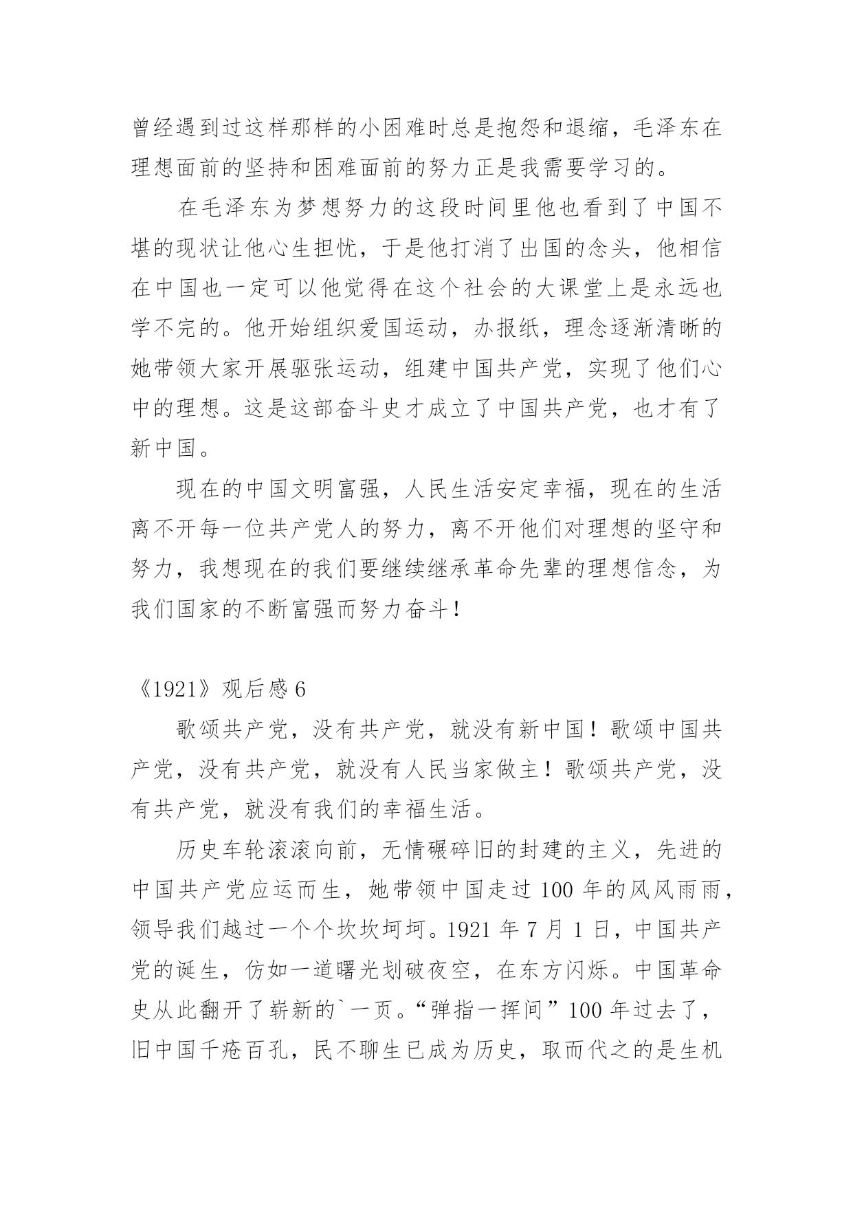 《1921》观后感品味完一部作品后,从中我们收获新的思想,这时候最关键的观后感不能忘了。那么你真的会写观后感吗?以下是小编为大家收集的《1921》观后感,希望对大家有所帮助。《1921》观后感11921年的七月,一群当时怀揣救国理想的志士仁人在浙江嘉兴南湖的红船上,商量着当时看来似乎不会产生多大影响的事——建立中国共产党。转眼间,这个组织带领全中国人民在追逐中国梦的路上已然走过94载的光辉历程,伟大的中国共产党在成立之初只有仅仅50几个党员,“就凭这全国50几个党员,12个全国代表,就想建立一个新中国?”这在当时,听上去真的很难。有三位参加了“一大”的代表,因为这条道路太难走了,背信弃义,叛党投敌;我们敬爱的毛主席,在这条道路上,先后牺牲了六位至亲;而难以计数的共产党员,为了这个目标,前仆后继、献上一切,乃至生命。最终,艰难险阻没能挡得住共产党人前进的`步伐,一个崭新的中国冉冉升起,屹立东方,令世界侧目,而弓着腰,托举起这一切的,正是我们伟大的党!感恩父母,给予我们生命;感恩老师,教授我们知识,在这特殊的日子,我们更应该感恩中国共产党。没有共产党,就没有新中国,也就没有我们平安出生,健康成长的社会;也就没有我们端坐教室,接受教育的环境;更不会有我们追寻理想,实现价值,圆中国梦的机会。感谢先烈、志士仁人,我们今天不用再流血牺牲,生下来就泡在蜜罐里,过上幸福的生活,那如何表现自己爱党呢?很简单,树立一个理想,并为之努力奋斗,直至实现。对于中职学生来说,掌握技能,学习知识,是实现自己个人理想的最优秀手段。假使我们每个人,都能够通过自己的努力实现梦想,我们的国家,就实现了中华民族伟大复兴的中国梦,而实现“中国梦”正是我们党的当代使命,你为了这个使命添过砖,加过瓦,还有什么比这个更能体现你爱党,感恩党呢?在此,我不会苦口婆心的规劝你们好好学习,我只想说,为了党、为了国家、为了父母亲人、为了老师、为了自己,努力奋斗,去实现自己的梦想吧!《1921》观后感2光阴似箭,岁月如梭,转瞬之间,中国共产党已经走过100年的风风雨雨。在党的100岁生日之际,我们每一个人的心情,除了感慨,的是感激。在这激情万丈的日子里,我脑海里的记忆大门,正缓缓向我打开。1921年7月,浙江嘉兴南湖的一艘红船上传出巨人的呐喊,犹如春雷唤醒了沉睡已久的东方雄狮,拔开了数百年来笼罩于千万仁人志士心头的迷雾,亮出了共产主义的伟大旗帜,点燃了神洲大地上的星星革命之火。从此,炎黄子孙们的理想有了归一,有了值得托付的领导人——中国共产党。悠悠长夜下终于亮起了一颗耀眼的启明星,它照亮了黎明前的黑暗,指引着前进的方向。在那灾难深重,血雨腥风的漫漫长夜,是“七一”的晨曦拨开华夏大地重重迷雾,激励着华夏儿女,为了民族的自由独立,抛头颅洒热血,将共产主义信念的'火种撒向大地,把理想的火炬照亮强国之路,万里河山因此而挺拔俊秀,雄浑壮丽;历史的长河因此而波澜壮阔,豪情万丈。在战争年代里的.每一天,都会为每时每刻发生在战士身上的故事传说传说感动着。为了中国人民的事业,为了共产主义事业,他们无怨无悔地奋勇向前。我以我们的祖国有这样的英雄而感到骄傲,我以生在这样英雄的国度而自豪。和平年代里的雷锋留给我们做人的真言:“人的生命是有限的。,但为人民服务是无限的,我要把有限的生命投入到无限的为人民服务之中。”他对同志像春天般的温暖,对待工作像夏天般的火热。“雷锋精神”鼓舞着几辈人,教育了几代人。强国之路在探索的脚步声中不断延伸,富强的梦想一天天实现。申奥申博成功加入世贸……中华大地喜事连连,照亮了华夏儿女的爱国之心。红旗飘飘,党旗猎猎,祖国欣欣向荣,经济蓬勃发展,人民安居乐业,国际地位空前居高,中国人民正满怀喜悦和希望朝着现代化的宏伟目标迈进。100年的光辉历程,走出了一条亘古不变的真理:中国共产党是时代的中流砥柱,是中华民族的脊梁。“没有中国共产党,就没有新中国。”用历史验证中国共产党的伟大历程,我们要铭记党,拥护党,所谓党民一心,对党就像对我们的亲人。《1921》观后感3小的时候党在我的心中,是一个个英雄人物和一个个感人的战争故事组成的。渐渐的我长大了,懂事了,党在我心中,有着更深刻的含义。我从小对党怀着崇敬。我把党比做母亲,他用乳汁哺育我们长大;她把幸福留给我们,把苦难留给自己。为了新中国的解放,为了能让老百姓过上好日子,有那么多党的优秀儿女,他们不惜抛头颅洒热血。献出自己宝贵而年轻的生命,比如:年仅15岁的刘胡兰,面对敌人的嚎叫怒吼,她没有胆怯;面对敌人的威逼利诱,她没有动摇;面对敌人的铡刀,她没有屈服。就这样,一个伟大而年轻的生命走完了他光辉灿烂的人生历程。仅有十五岁的她,只是一个花季少女,怎会不知道生命的可贵?但是,为了保护组织和党员的安全,刘胡兰抛弃了对生命的渴望,笑对屠刀,用铮铮铁骨和