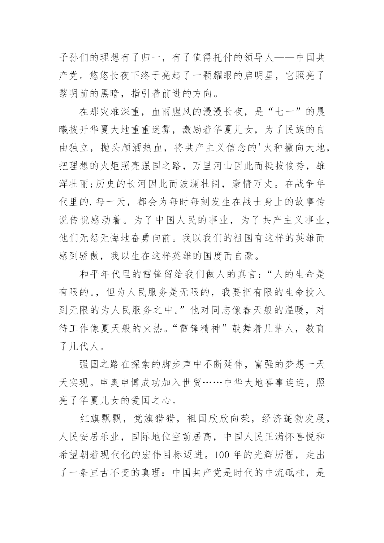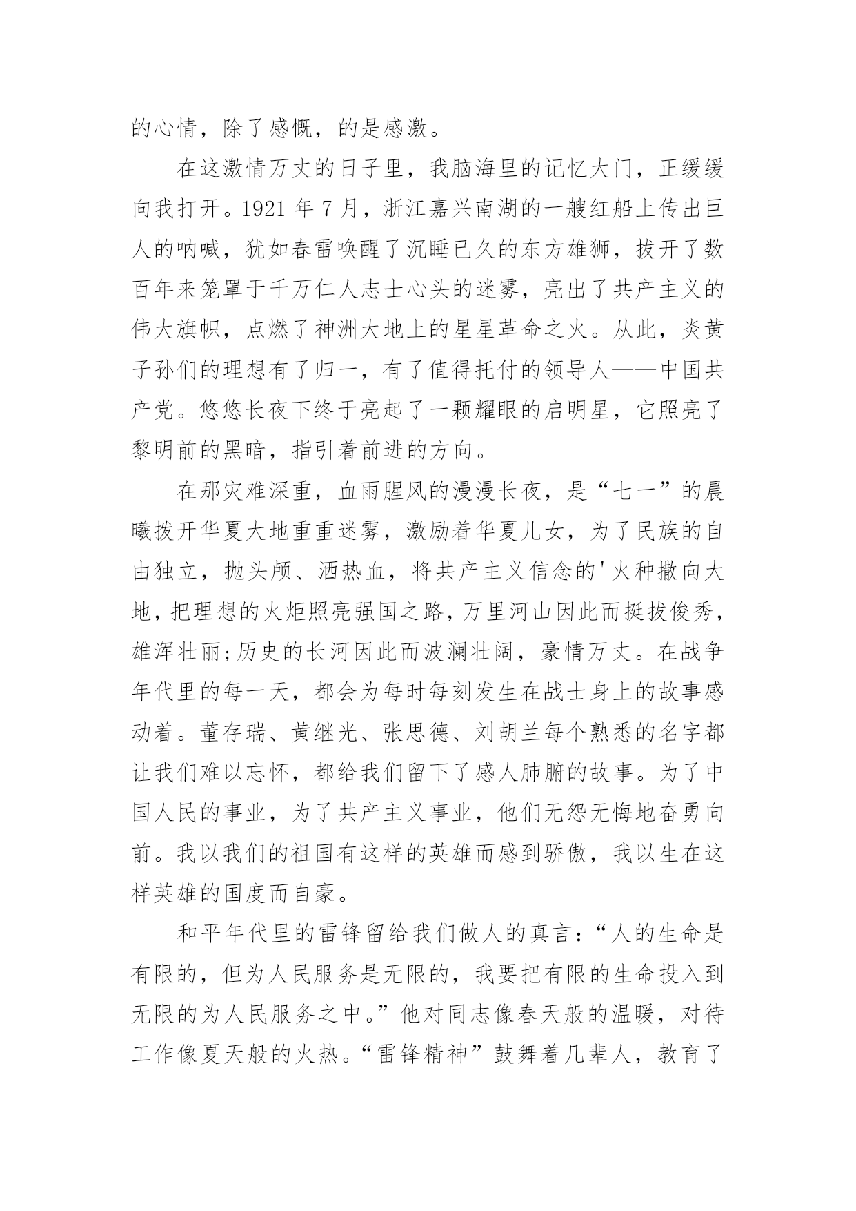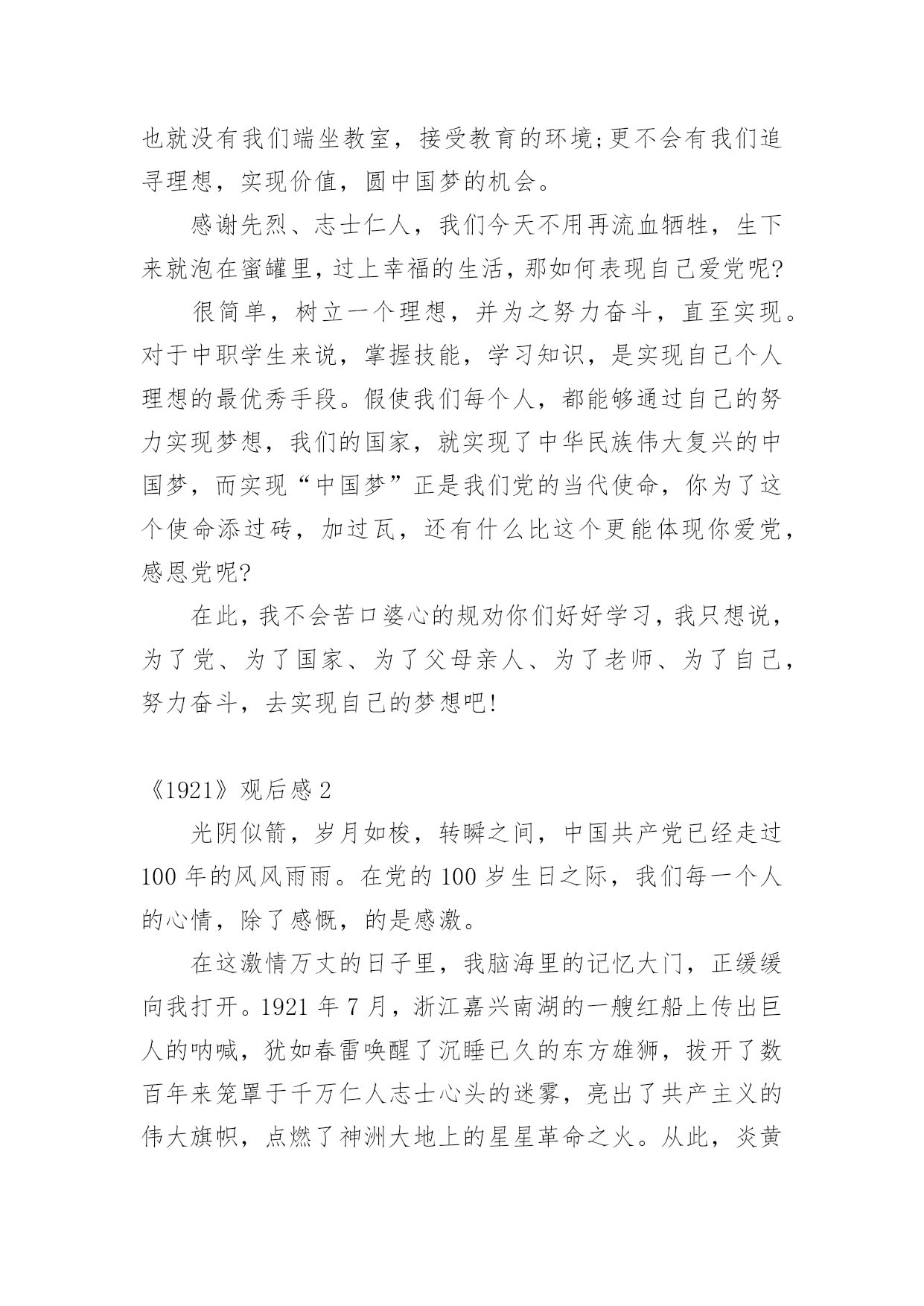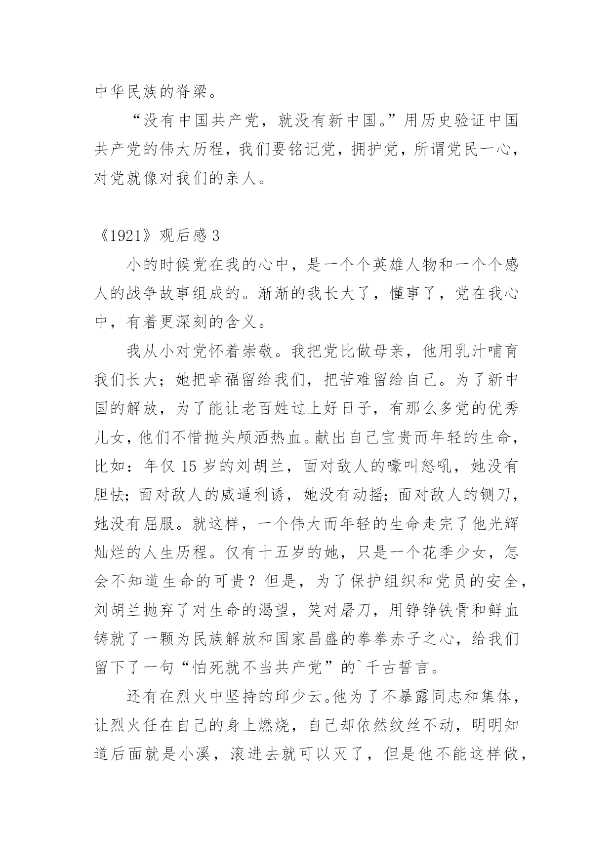 《1921》观后感品味完一部作品后,从中我们收获新的思想,这时候最关键的观后感不能忘了。那么你真的会写观后感吗?以下是小编为大家收集的《1921》观后感,希望对大家有所帮助。《1921》观后感11921年的七月,一群当时怀揣救国理想的志士仁人在浙江嘉兴南湖的红船上,商量着当时看来似乎不会产生多大影响的事——建立中国共产党。转眼间,这个组织带领全中国人民在追逐中国梦的路上已然走过94载的光辉历程,伟大的中国共产党在成立之初只有仅仅50几个党员,“就凭这全国50几个党员,12个全国代表,就想建立一个新中国?”这在当时,听上去真的很难。有三位参加了“一大”的代表,因为这条道路太难走了,背信弃义,叛党投敌;我们敬爱的毛主席,在这条道路上,先后牺牲了六位至亲;而难以计数的共产党员,为了这个目标,前仆后继、献上一切,乃至生命。最终,艰难险阻没能挡得住共产党人前进的`步伐,一个崭新的中国冉冉升起,屹立东方,令世界侧目,而弓着腰,托举起这一切的,正是我们伟大的党!感恩父母,给予我们生命;感恩老师,教授我们知识,在这特殊的日子,我们更应该感恩中国共产党。没有共产党,就没有新中国,也就没有我们平安出生,健康成长的社会;也就没有我们端坐教室,接受教育的环境;更不会有我们追寻理想,实现价值,圆中国梦的机会。感谢先烈、志士仁人,我们今天不用再流血牺牲,生下来就泡在蜜罐里,过上幸福的生活,那如何表现自己爱党呢?很简单,树立一个理想,并为之努力奋斗,直至实现。对于中职学生来说,掌握技能,学习知识,是实现自己个人理想的最优秀手段。假使我们每个人,都能够通过自己的努力实现梦想,我们的国家,就实现了中华民族伟大复兴的中国梦,而实现“中国梦”正是我们党的当代使命,你为了这个使命添过砖,加过瓦,还有什么比这个更能体现你爱党,感恩党呢?在此,我不会苦口婆心的规劝你们好好学习,我只想说,为了党、为了国家、为了父母亲人、为了老师、为了自己,努力奋斗,去实现自己的梦想吧!《1921》观后感2光阴似箭,岁月如梭,转瞬之间,中国共产党已经走过100年的风风雨雨。在党的100岁生日之际,我们每一个人的心情,除了感慨,的是感激。在这激情万丈的日子里,我脑海里的记忆大门,正缓缓向我打开。1921年7月,浙江嘉兴南湖的一艘红船上传出巨人的呐喊,犹如春雷唤醒了沉睡已久的东方雄狮,拔开了数百年来笼罩于千万仁人志士心头的迷雾,亮出了共产主义的伟大旗帜,点燃了神洲大地上的星星革命之火。从此,炎黄子孙们的理想有了归一,有了值得托付的领导人——中国共产党。悠悠长夜下终于亮起了一颗耀眼的启明星,它照亮了黎明前的黑暗,指引着前进的方向。在那灾难深重,血雨腥风的漫漫长夜,是“七一”的晨曦拨开华夏大地重重迷雾,激励着华夏儿女,为了民族的自由独立,抛头颅洒热血,将共产主义信念的'火种撒向大地,把理想的火炬照亮强国之路,万里河山因此而挺拔俊秀,雄浑壮丽;历史的长河因此而波澜壮阔,豪情万丈。在战争年代里的.每一天,都会为每时每刻发生在战士身上的故事传说传说感动着。为了中国人民的事业,为了共产主义事业,他们无怨无悔地奋勇向前。我以我们的祖国有这样的英雄而感到骄傲,我以生在这样英雄的国度而自豪。和平年代里的雷锋留给我们做人的真言:“人的生命是有限的。,但为人民服务是无限的,我要把有限的生命投入到无限的为人民服务之中。”他对同志像春天般的温暖,对待工作像夏天般的火热。“雷锋精神”鼓舞着几辈人,教育了几代人。强国之路在探索的脚步声中不断延伸,富强的梦想一天天实现。申奥申博成功加入世贸……中华大地喜事连连,照亮了华夏儿女的爱国之心。红旗飘飘,党旗猎猎,祖国欣欣向荣,经济蓬勃发展,人民安居乐业,国际地位空前居高,中国人民正满怀喜悦和希望朝着现代化的宏伟目标迈进。100年的光辉历程,走出了一条亘古不变的真理:中国共产党是时代的中流砥柱,是中华民族的脊梁。“没有中国共产党,就没有新中国。”用历史验证中国共产党的伟大历程,我们要铭记党,拥护党,所谓党民一心,对党就像对我们的亲人。《1921》观后感3小的时候党在我的心中,是一个个英雄人物和一个个感人的战争故事组成的。渐渐的我长大了,懂事了,党在我心中,有着更深刻的含义。我从小对党怀着崇敬。我把党比做母亲,他用乳汁哺育我们长大;她把幸福留给我们,把苦难留给自己。为了新中国的解放,为了能让老百姓过上好日子,有那么多党的优秀儿女,他们不惜抛头颅洒热血。献出自己宝贵而年轻的生命,比如:年仅15岁的刘胡兰,面对敌人的嚎叫怒吼,她没有胆怯;面对敌人的威逼利诱,她没有动摇;面对敌人的铡刀,她没有屈服。就这样,一个伟大而年轻的生命走完了他光辉灿烂的人生历程。仅有十五岁的她,只是一个花季少女,怎会不知道生命的可贵?但是,为了保护组织和党员的安全,刘胡兰抛弃了对生命的渴望,笑对屠刀,用铮铮铁骨和
