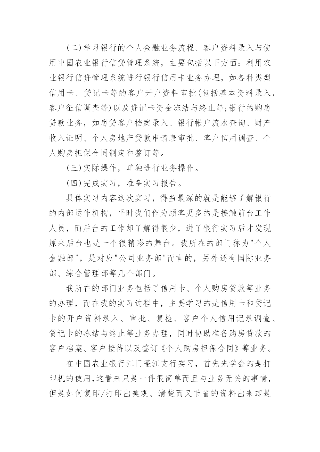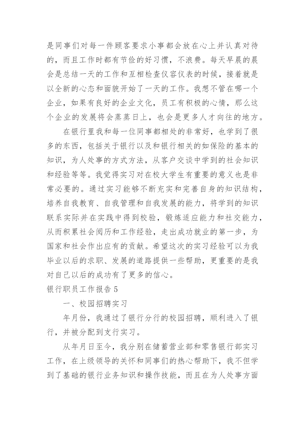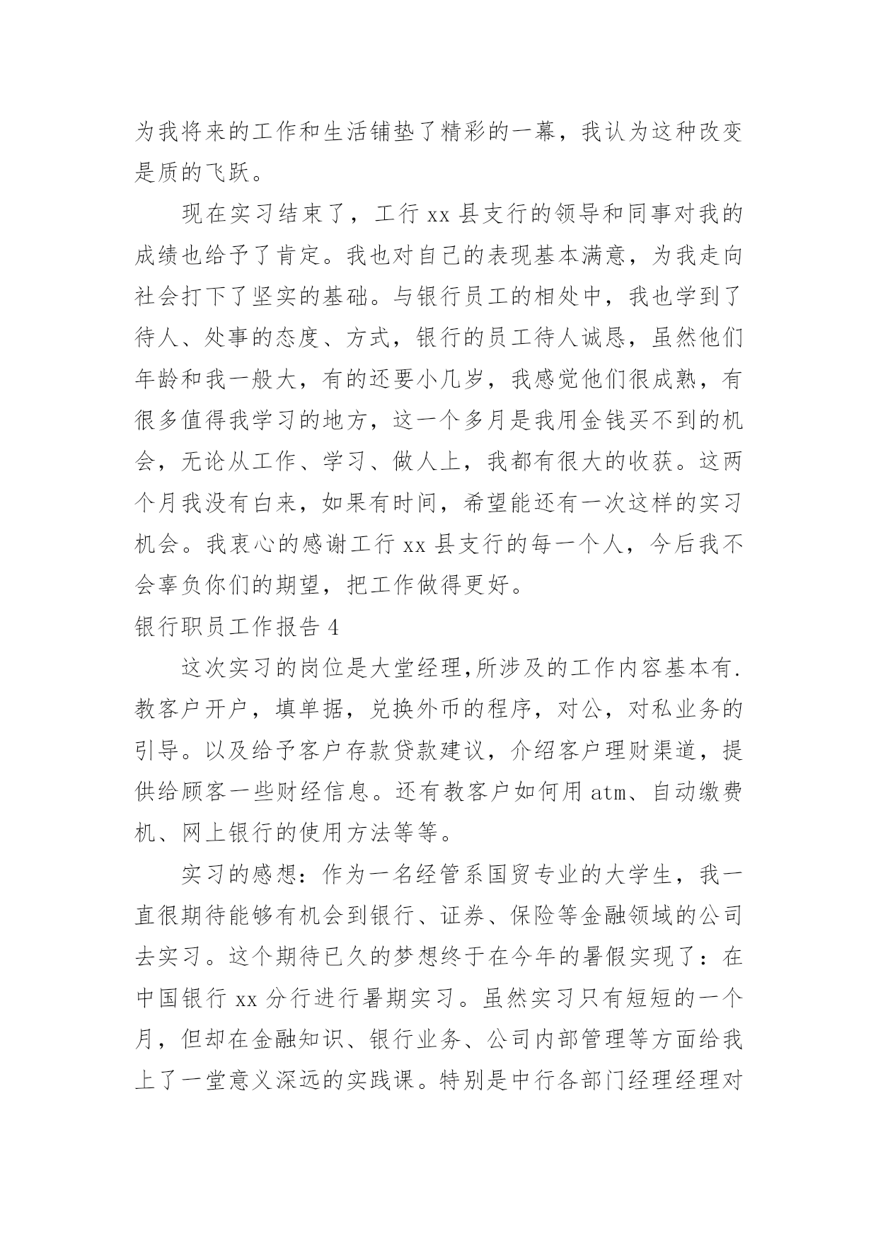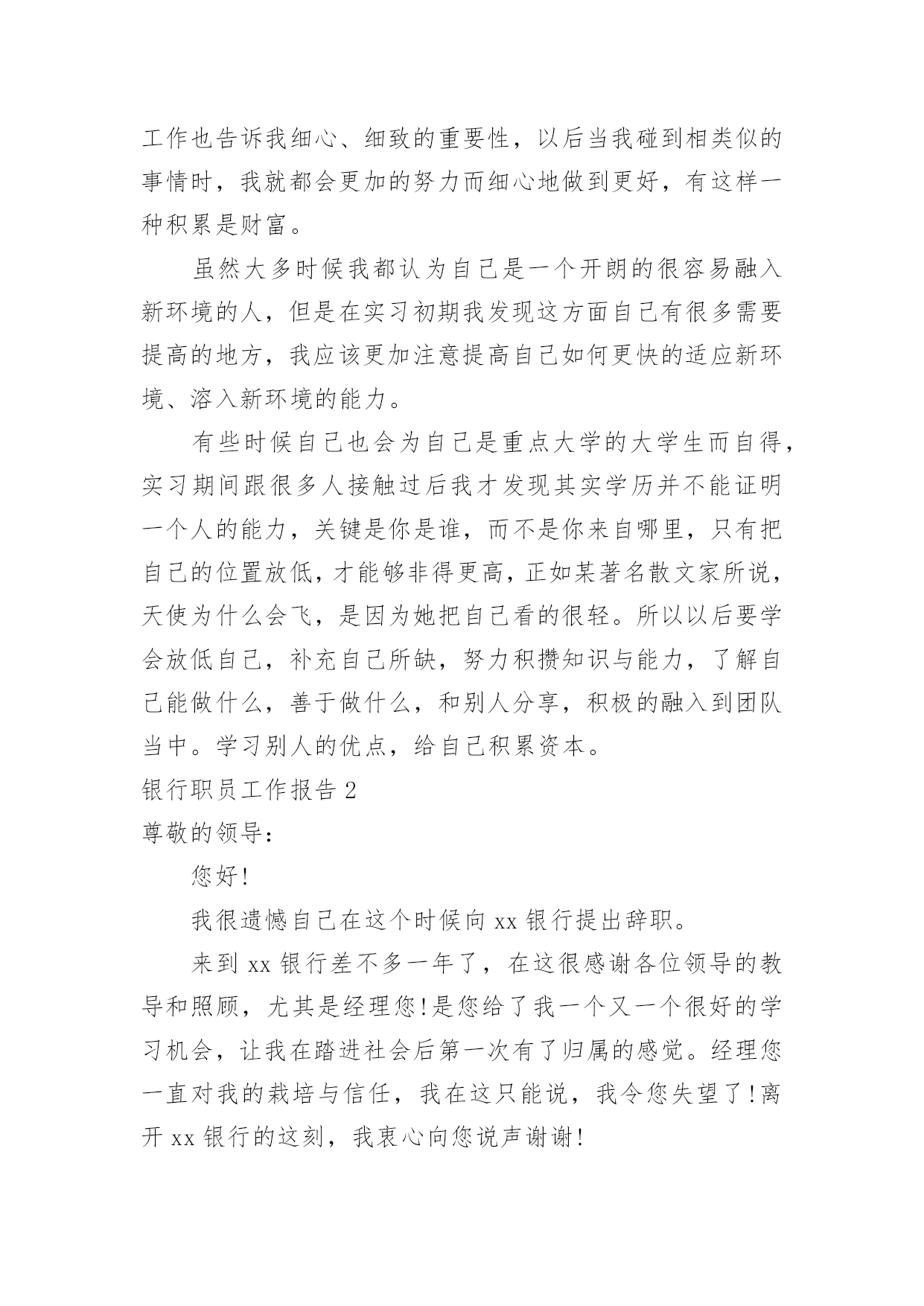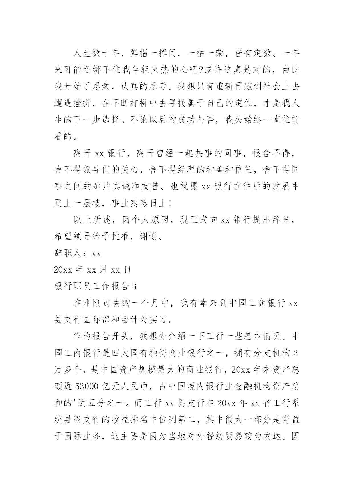 银行职员工作报告银行职员工作报告在生活中,报告十分的重要,我们在写报告的时候要避免篇幅过长。那么大家知道标准正式的报告格式吗?以下是小编为大家整理的银行职员工作报告,希望能够帮助到大家。银行职员工作报告1一、本次实习的目的1、通过在xx支行实习,并进一步巩固我在上学期所学的基本理论,依靠理论联系实际,以增强自我解决实际问题的能力。2、通过在xx支行的实习,达到学校的社会实践要求,并在单位指导老师的帮助下,熟悉了金融机构的主要经济业务活动,系统地学习银行个人金融管理工作。3、通过在xx支行的实习,学会如何更好的适应新的环境以及端正自我的学习态度,为更好的走入社会打下基础。二、实习步骤此次实习在于通过在xx支行的实习,了解银行业务工作所需要的基本技能,熟悉银行日常业务的操作流程以及工作制度等。实习过程主要包括以下几个阶段:(一)了解实习单位基本情况和机构设置等。(二)学习银行的个人金融业务流程、客户资料录入与使用中国农业银行信贷管理系统,主要包括以下方面:利用农业银行信贷管理系统进行银行信用卡业务办理,如各种类型信用卡、贷记卡等的客户开户资料审批(包括基本资料录入,客户征信调查等)以及贷记卡资金冻结与终止等;银行的购房贷款业务,如房贷客户档案录入、银行帐户流水查询、财产收入证明、个人房地产贷款申请表审批、客户信用调查、个人购房担保合同制定和签订等。(三)实际操作,单独进行业务操作。(四)完成实习,准备实习报告。具体实习内容这次实习,得益最深的就是能够了解银行的内部运作机构,平时我们作为顾客更多的是接触前台工作人员,而后台的工作却了解得很少,进了银行实习后才发现原来后台也是一个很精彩的舞台。我所在的部门称为"个人金融部",是对应"公司业务部"而言的,另外还有国际业务部、综合管理部等几个部门。我所在的部门业务包括了信用卡、个人购房贷款等业务的办理,而在我的实习过程中,主要学习的是信用卡和贷记卡的开户资料录入、审批、复检、客户个人信用记录调查、贷记卡的冻结与终止等业务办理,同时协助准备购房贷款的客户档案、客户接待以及签订《个人购房担保合同》等业务。在中国农业银行江门蓬江支行实习,首先先学会的是打印机的使用,这看来只是一件很简单而且与业务无关的事情,但是如何复印/打印出美观、清楚而又节省的资料出来却是工作的基本功,因为在所有的个人购房贷款业务办理过程中,都要打印客户帐户流水和主档、客户的基本个人资料、客户收入证明、抵押证明、个人购房合同以及各种由开发商提供的资料等,因此我实习的第一件事是学会怎样使用打印机这项简单却必须的工具。接下来学习的是如何利用中国人民银行的系统进行贷记卡客户信用审查,虽然系统操作并不复杂,但是却要求查询者认真仔细并且按章办事,客户的资料必须授权才可以使用,同时不得透露客户个人隐私。在学会查询客户信用查询后,我开始学习利用农业银行的系统进行客户的开卡登记,同时利用信用调查结果并结合客户的收入证明等材料进行客户申请的审批等。办理信用卡业务,需要学会如何利用农业银行信贷管理系统进行卡务的一系列进程,而这个系统对于办理购房信贷方面也是很重要的。在办理购房贷款的业务中,需要对客户资料进行录入、协助客户准备购房证明、抵押证明、收入证明、财产证明等资料,同时协助客户签订合同以及及时提醒客户还款等。三、个人实习心得虽然这只是短短的一个实习,但对我来说,是大学生涯中很重要的一部分积累,这在我以后的学习生活中都会发挥很重要的作用,特别是我的同事们和上司给我的榜样作用。他们勤奋、努力而且乐于助人,给予我很多鼓励与帮助,细心的教导我怎么去将看似一件很简单的像复印信用卡这样一件事情做到更好,告诉我追求卓越的重要性。同时,这份工作也告诉我细心、细致的重要性,以后当我碰到相类似的事情时,我就都会更加的努力而细心地做到更好,有这样一种积累是财富。虽然大多时候我都认为自己是一个开朗的很容易融入新环境的人,但是在实习初期我发现这方面自己有很多需要提高的地方,我应该更加注意提高自己如何更快的适应新环境、溶入新环境的能力。有些时候自己也会为自己是重点大学的大学生而自得,实习期间跟很多人接触过后我才发现其实学历并不能证明一个人的能力,关键是你是谁,而不是你来自哪里,只有把自己的位置放低,才能够非得更高,正如某著名散文家所说,天使为什么会飞,是因为她把自己看的很轻。所以以后要学会放低自己,补充自己所缺,努力积攒知识与能力,了解自己能做什么,善于做什么,和别人分享,积极的融入到团队当中。学习别人的优点,给自己积累资本。银行职员工作报告2尊敬的领导:您好!我很遗憾自己在这个时候向xx银行提出辞职。来到xx银行差不多一年了,在这很感谢各位领导的教导和照顾,尤其是经理您!是您给了我一个又一个很好的学习机会,让我在踏进社会后第一次有了归属的感觉。经理您一直对我的栽培