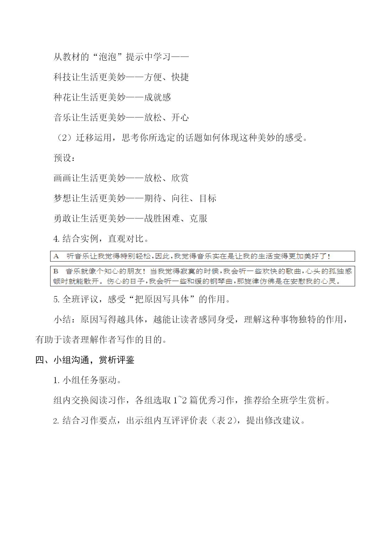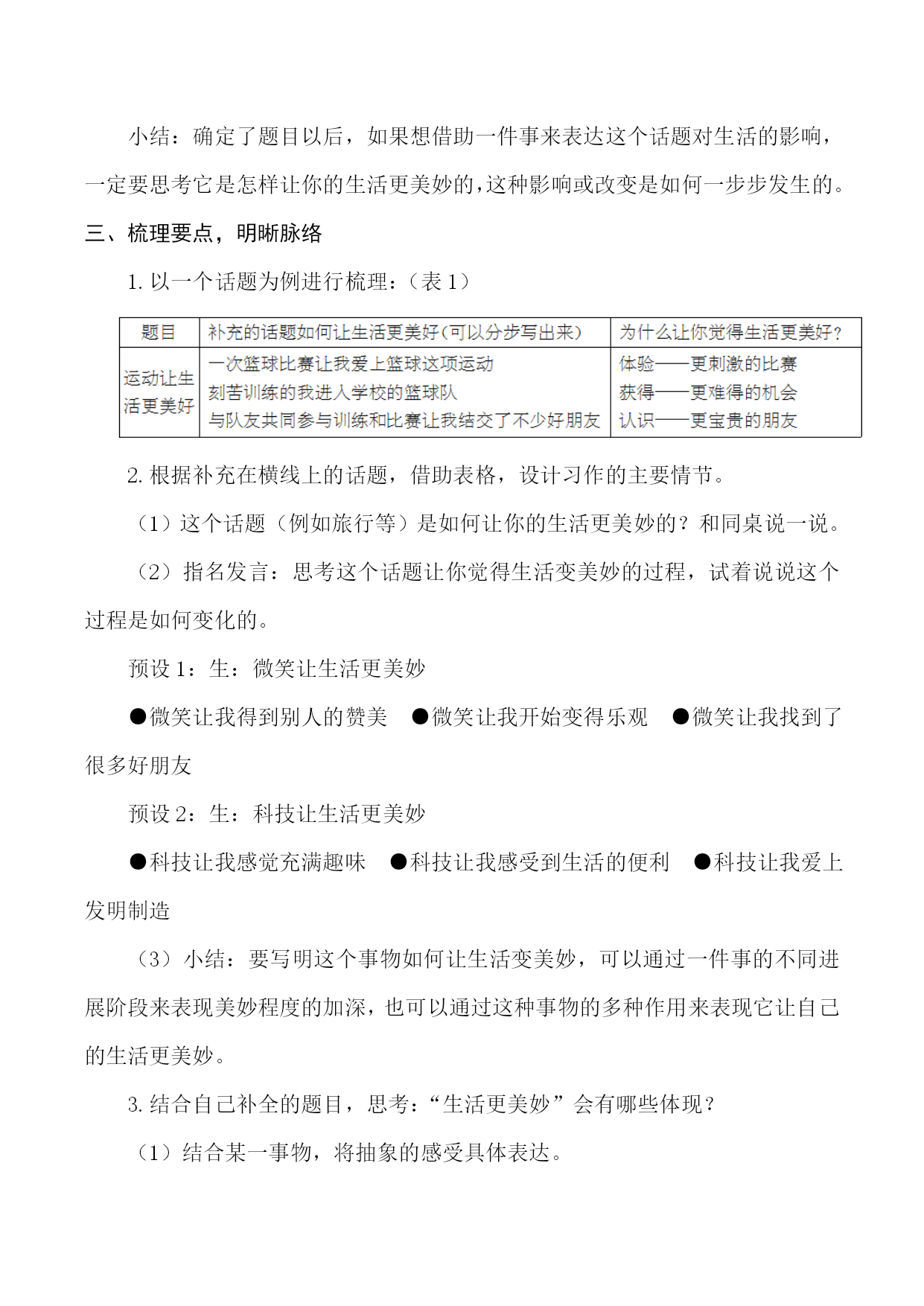 习作三________让生活更美妙[教学目标]1.选择让自己生活更美妙的一件事情、一样事物或一种品质写下来。2.写清楚它是怎样影响自己生活的,把它让生活更美妙的原因写具体。【语文要素】3.分享习作心得体会。[教学重难点]1.基于写作目的,写清楚某件事物让生活更美妙的经历,情节要围绕这件事物对生活的影响展开。2.能把某件事物让生活更美妙的原因写清楚,写具体。[教学课时]1—2课时一、仔细审题,明确要点师:同学们,在这个单元,我们通过学习课文,一起进行“有目的地阅读”。这次习作,我们也要先明确写作的目的,做到