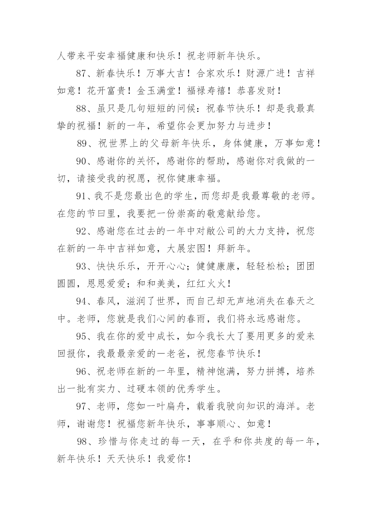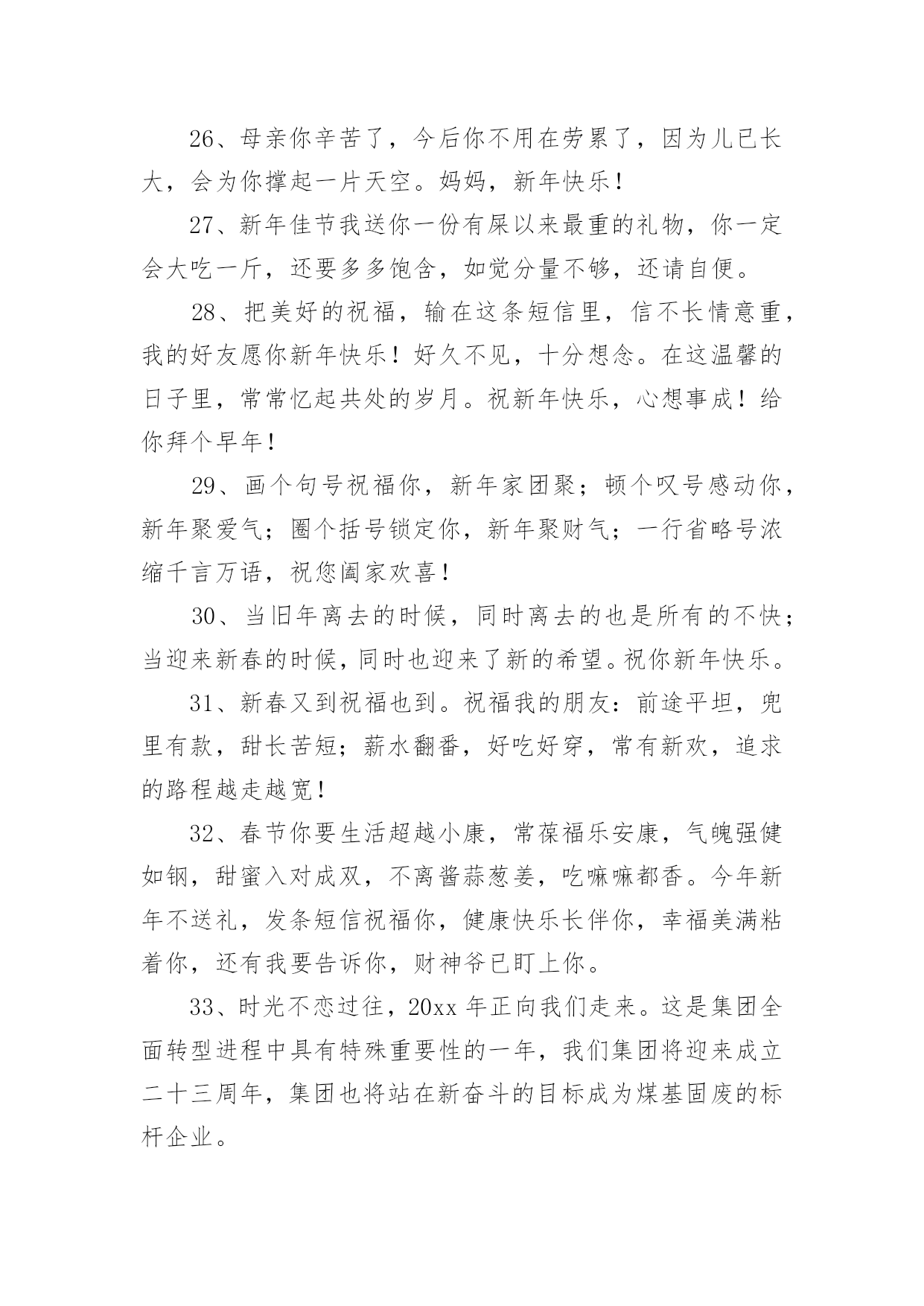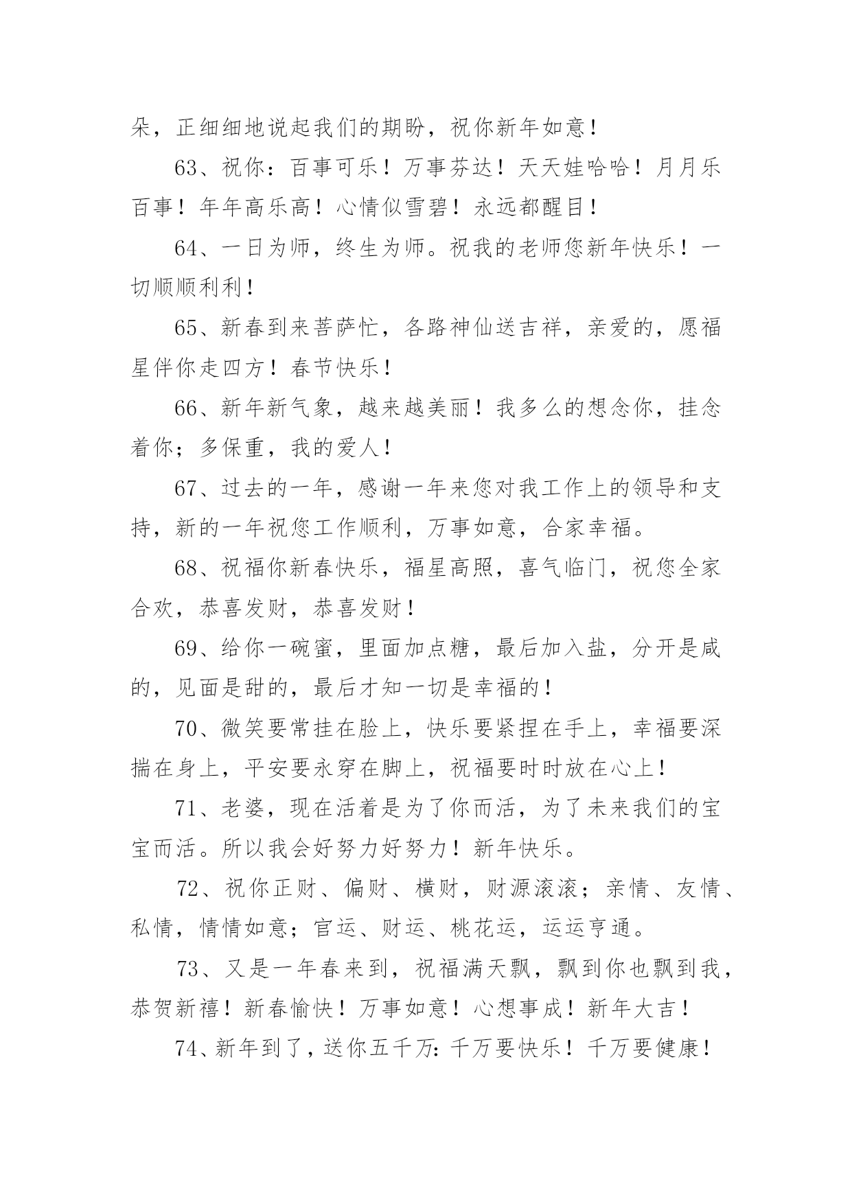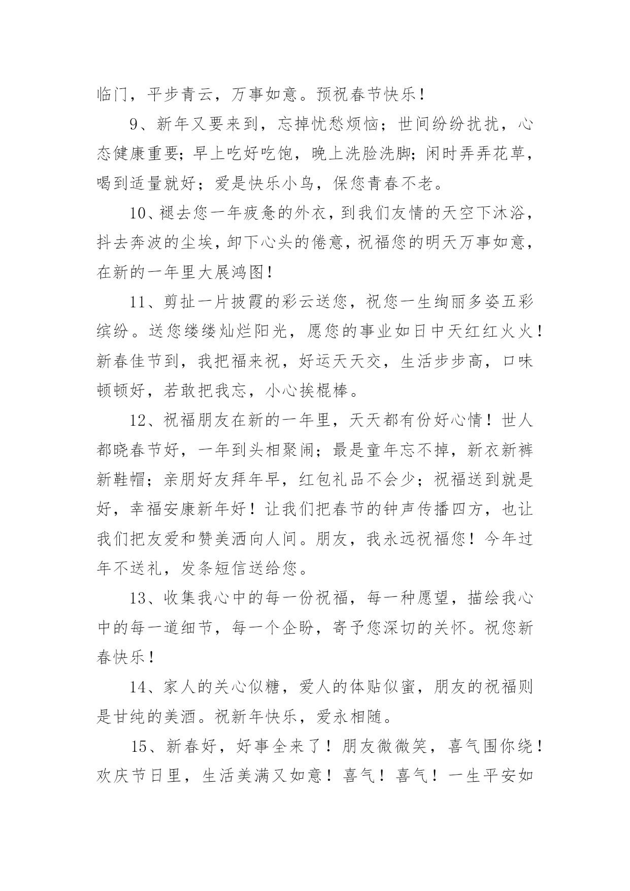 过年给领导身体健康过年给领导身体健康1、您是经霜的枫树,愈老愈红。虽历尽悲欢,却愈显得襟怀坦荡。衷心祝愿您生命之树常青。祝新年快乐!2、过年好,最近在干吗呢?是不是忙着拜年,忙着聚会,有没有把我忘记。短信祝福送给您,愿您在新的一年里快乐依然,幸福绵绵!3、玫瑰是我的热情,糖禁是我的味道,星星是我的眼睛,月光是我的灵魂,一并送给您,我的爱人,新年快乐!4、一个灿烂的微笑、一缕淡淡的春风、一声亲切的问候、一个衷心的祝福、都在这个温馨的日子里、来到您的身边。5、来来来,废话不多说了,春节就在眼前。燃一束礼花,绽放好运给您;开一个红包,喜庆祝福给您;道一个万福,合家欢乐给您;发一条短信,真情友谊给您。6、新年好!给您拜年了!过去的一年我们合作得都很愉快,谢谢您的关照,祝您春节快乐!吉祥如意!心想事成!7、友情就如一轮红日默默付出而无求,一声轻轻问候就是一束温暖阳光。友情就如一坛老酒封存愈久愈香醇,一句短短祝福就能开启坛盖品尝浓醇酒香。祝新年快乐!8、在春节即将到来,钟声即将响起,焰火即将燃起的日子里,短信带着祝福先送去给您。愿您在新的一年里好事临门,平步青云,万事如意。预祝春节快乐!9、新年又要来到,忘掉忧愁烦恼;世间纷纷扰扰,心态健康重要;早上吃好吃饱,晚上洗脸洗脚;闲时弄弄花草,喝到适量就好;爱是快乐小鸟,保您青春不老。10、褪去您一年疲惫的外衣,到我们友情的天空下沐浴,抖去奔波的尘埃,卸下心头的倦意,祝福您的明天万事如意,在新的一年里大展鸿图!11、剪扯一片披霞的彩云送您,祝您一生绚丽多姿五彩缤纷。送您缕缕灿烂阳光,愿您的事业如日中天红红火火!新春佳节到,我把福来祝,好运天天交,生活步步高,口味顿顿好,若敢把我忘,小心挨棍棒。12、祝福朋友在新的一年里,天天都有份好心情!世人都晓春节好,一年到头相聚闹;最是童年忘不掉,新衣新裤新鞋帽;亲朋好友拜年早,红包礼品不会少;祝福送到就是好,幸福安康新年好!让我们把春节的钟声传播四方,也让我们把友爱和赞美洒向人间。朋友,我永远祝福您!今年过年不送礼,发条短信送给您。13、收集我心中的每一份祝福,每一种愿望,描绘我心中的每一道细节,每一个企盼,寄予您深切的关怀。祝您新春快乐!14、家人的关心似糖,爱人的体贴似蜜,朋友的祝福则是甘纯的美酒。祝新年快乐,爱永相随。15、新春好,好事全来了!朋友微微笑,喜气围你绕!欢庆节日里,生活美满又如意!喜气!喜气!一生平安如意!16、声声祝福,丝丝情谊,串串思念,化作一份礼物,留在你的心田,祝新年快乐,万事如意!手机铃响,那是问候;手机唱歌,那是祝福;手机震动,那一定是我握住了你的手。新年快乐!我的朋友。17、家人的关心似糖,爱人的体贴似蜜,朋友的祝福则是甘纯的美酒。祝新年快乐,爱永相随。18、这一季,有我最深的思念。就让风捎去满心的祝福,缀满你甜蜜的梦境,祝你拥有一个更加灿烂更加辉煌的来年。19、春节祝你:天天接礼收红包,从早到晚有人Call,打牌赢钱如山高,新人爱你似豆包!20、我不只一次对你说不要这样玩命工作,要注意身体,可你总是意味深长地说:不趁春节多滚几个粪球,明年我吃什么?千万别累坏自己,祝你新年愉快!21、新春到,财神到,幸运之神伴随我的短消息到!新的一年更加珍重,明年生活锦上添花。22、你我相拥倾听新年的钟声犹如年轮的呼吸,簇拥着我们共同的梦,满心的爱意化作真挚的祝福“新年快乐”!23、新年的第一天,我在默默地为你祝福,愿你的生活中:夏宜人,冬温暖,秋收获,春满园。24、新春贺喜,祝福是份真心意,不用千言,不用万语,默默地唱首心曲。愿你岁岁平安,如意!25、春节来临,祝新年快乐,愿你时时刻刻幸福欢乐!愿春节的温馨带给你祥和与喜悦。26、母亲你辛苦了,今后你不用在劳累了,因为儿已长大,会为你撑起一片天空。妈妈,新年快乐!27、新年佳节我送你一份有屎以来最重的礼物,你一定会大吃一斤,还要多多饱含,如觉分量不够,还请自便。28、把美好的祝福,输在这条短信里,信不长情意重,我的好友愿你新年快乐!好久不见,十分想念。在这温馨的日子里,常常忆起共处的岁月。祝新年快乐,心想事成!给你拜个早年!29、画个句号祝福你,新年家团聚;顿个叹号感动你,新年聚爱气;圈个括号锁定你,新年聚财气;一行省略号浓缩千言万语,祝您阖家欢喜!30、当旧年离去的时候,同时离去的也是所有的不快;当迎来新春的时候,同时也迎来了新的希望。祝你新年快乐。31、新春又到祝福也到。祝福我的朋友:前途平坦,兜里有款,甜长苦短;薪水翻番,好吃好穿,常有新欢,追求的路程越走越宽!32、春节你要生活超越小康,常葆福乐安康,气魄强健如钢,甜蜜入对成双,不离酱蒜葱姜,吃嘛嘛都香。今年新年不送礼,发条短信祝福你,健康快乐长伴你,幸福美满粘着你,还有我要告诉你,财神爷已盯上你。33、时光不恋过往,20xx