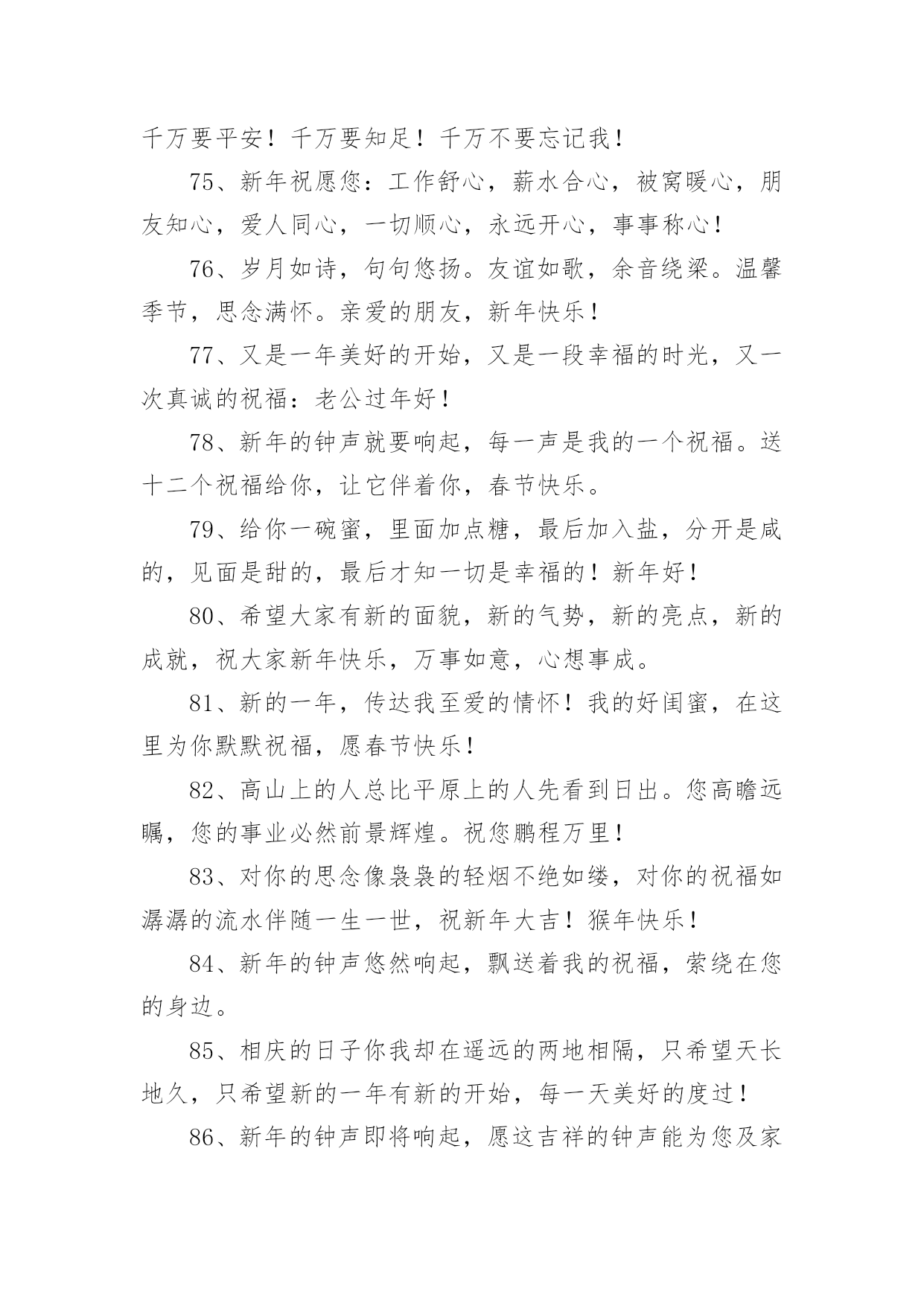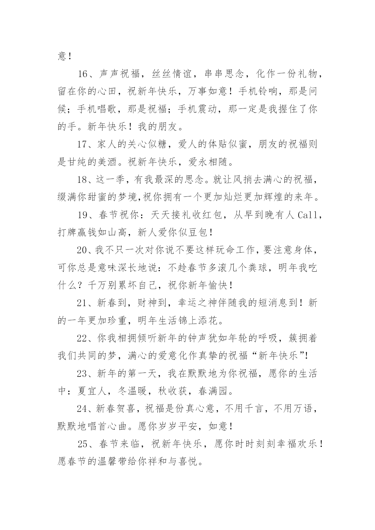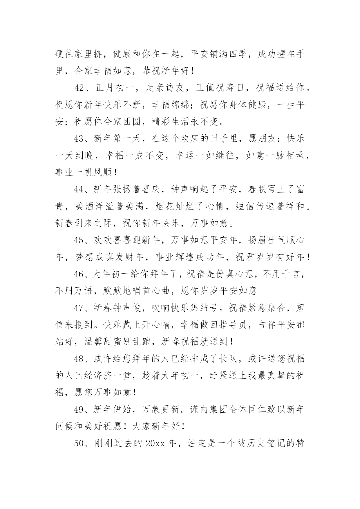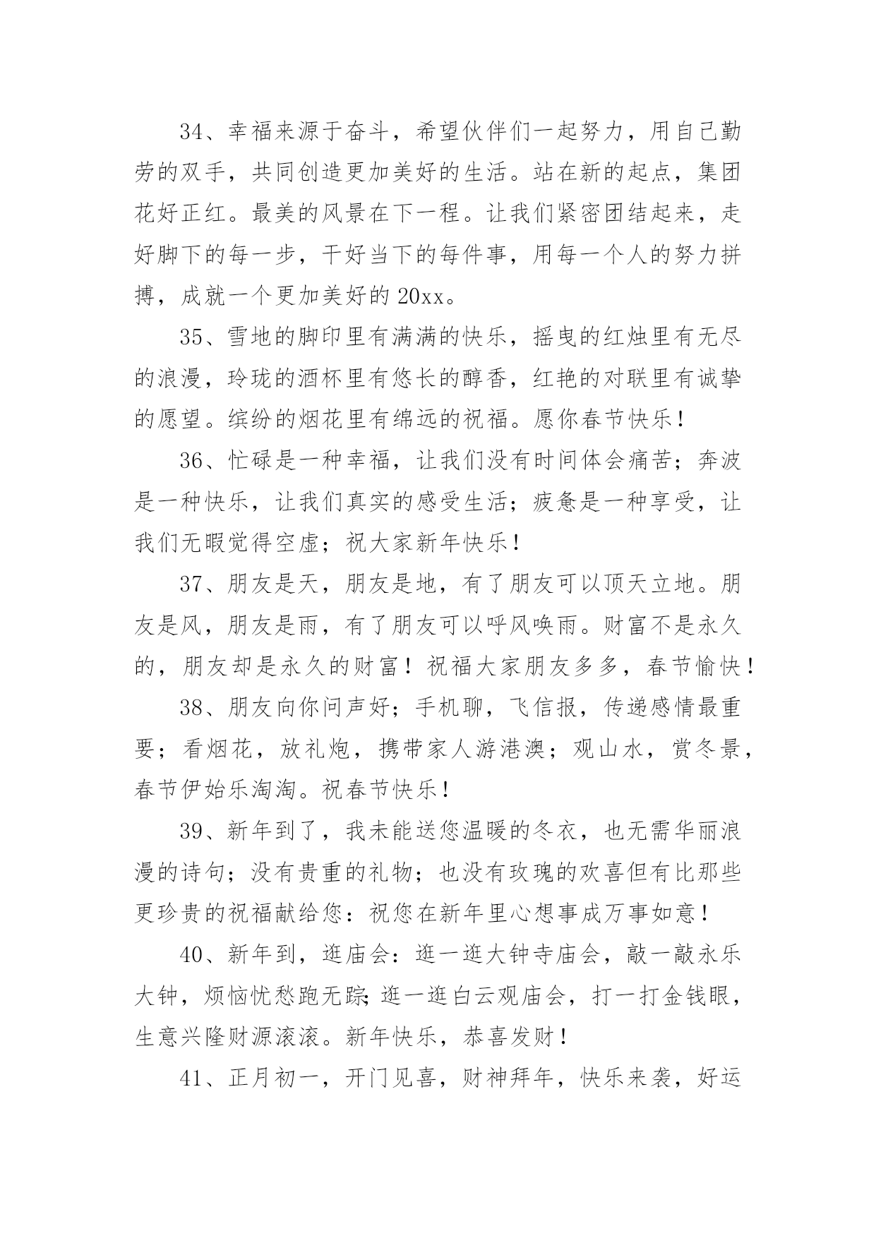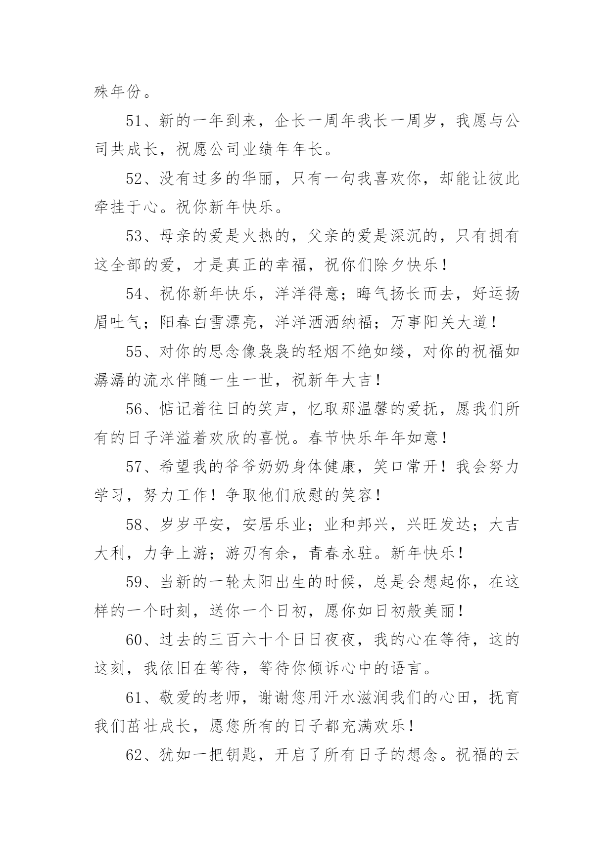 过年给领导身体健康过年给领导身体健康1、您是经霜的枫树,愈老愈红。虽历尽悲欢,却愈显得襟怀坦荡。衷心祝愿您生命之树常青。祝新年快乐!2、过年好,最近在干吗呢?是不是忙着拜年,忙着聚会,有没有把我忘记。短信祝福送给您,愿您在新的一年里快乐依然,幸福绵绵!3、玫瑰是我的热情,糖禁是我的味道,星星是我的眼睛,月光是我的灵魂,一并送给您,我的爱人,新年快乐!4、一个灿烂的微笑、一缕淡淡的春风、一声亲切的问候、一个衷心的祝福、都在这个温馨的日子里、来到您的身边。5、来来来,废话不多说了,春节就在眼前。燃一束礼花,绽放好运给您;开一个红包,喜庆祝福给您;道一个万福,合家欢乐给您;发一条短信,真情友谊给您。6、新年好!给您拜年了!过去的一年我们合作得都很愉快,谢谢您的关照,祝您春节快乐!吉祥如意!心想事成!7、友情就如一轮红日默默付出而无求,一声轻轻问候就是一束温暖阳光。友情就如一坛老酒封存愈久愈香醇,一句短短祝福就能开启坛盖品尝浓醇酒香。祝新年快乐!8、在春节即将到来,钟声即将响起,焰火即将燃起的日子里,短信带着祝福先送去给您。愿您在新的一年里好事临门,平步青云,万事如意。预祝春节快乐!9、新年又要来到,忘掉忧愁烦恼;世间纷纷扰扰,心态健康重要;早上吃好吃饱,晚上洗脸洗脚;闲时弄弄花草,喝到适量就好;爱是快乐小鸟,保您青春不老。10、褪去您一年疲惫的外衣,到我们友情的天空下沐浴,抖去奔波的尘埃,卸下心头的倦意,祝福您的明天万事如意,在新的一年里大展鸿图!11、剪扯一片披霞的彩云送您,祝您一生绚丽多姿五彩缤纷。送您缕缕灿烂阳光,愿您的事业如日中天红红火火!新春佳节到,我把福来祝,好运天天交,生活步步高,口味顿顿好,若敢把我忘,小心挨棍棒。12、祝福朋友在新的一年里,天天都有份好心情!世人都晓春节好,一年到头相聚闹;最是童年忘不掉,新衣新裤新鞋帽;亲朋好友拜年早,红包礼品不会少;祝福送到就是好,幸福安康新年好!让我们把春节的钟声传播四方,也让我们把友爱和赞美洒向人间。朋友,我永远祝福您!今年过年不送礼,发条短信送给您。13、收集我心中的每一份祝福,每一种愿望,描绘我心中的每一道细节,每一个企盼,寄予您深切的关怀。祝您新春快乐!14、家人的关心似糖,爱人的体贴似蜜,朋友的祝福则是甘纯的美酒。祝新年快乐,爱永相随。15、新春好,好事全来了!朋友微微笑,喜气围你绕!欢庆节日里,生活美满又如意!喜气!喜气!一生平安如意!16、声声祝福,丝丝情谊,串串思念,化作一份礼物,留在你的心田,祝新年快乐,万事如意!手机铃响,那是问候;手机唱歌,那是祝福;手机震动,那一定是我握住了你的手。新年快乐!我的朋友。17、家人的关心似糖,爱人的体贴似蜜,朋友的祝福则是甘纯的美酒。祝新年快乐,爱永相随。18、这一季,有我最深的思念。就让风捎去满心的祝福,缀满你甜蜜的梦境,祝你拥有一个更加灿烂更加辉煌的来年。19、春节祝你:天天接礼收红包,从早到晚有人Call,打牌赢钱如山高,新人爱你似豆包!20、我不只一次对你说不要这样玩命工作,要注意身体,可你总是意味深长地说:不趁春节多滚几个粪球,明年我吃什么?千万别累坏自己,祝你新年愉快!21、新春到,财神到,幸运之神伴随我的短消息到!新的一年更加珍重,明年生活锦上添花。22、你我相拥倾听新年的钟声犹如年轮的呼吸,簇拥着我们共同的梦,满心的爱意化作真挚的祝福“新年快乐”!23、新年的第一天,我在默默地为你祝福,愿你的生活中:夏宜人,冬温暖,秋收获,春满园。24、新春贺喜,祝福是份真心意,不用千言,不用万语,默默地唱首心曲。愿你岁岁平安,如意!25、春节来临,祝新年快乐,愿你时时刻刻幸福欢乐!愿春节的温馨带给你祥和与喜悦。26、母亲你辛苦了,今后你不用在劳累了,因为儿已长大,会为你撑起一片天空。妈妈,新年快乐!27、新年佳节我送你一份有屎以来最重的礼物,你一定会大吃一斤,还要多多饱含,如觉分量不够,还请自便。28、把美好的祝福,输在这条短信里,信不长情意重,我的好友愿你新年快乐!好久不见,十分想念。在这温馨的日子里,常常忆起共处的岁月。祝新年快乐,心想事成!给你拜个早年!29、画个句号祝福你,新年家团聚;顿个叹号感动你,新年聚爱气;圈个括号锁定你,新年聚财气;一行省略号浓缩千言万语,祝您阖家欢喜!30、当旧年离去的时候,同时离去的也是所有的不快;当迎来新春的时候,同时也迎来了新的希望。祝你新年快乐。31、新春又到祝福也到。祝福我的朋友:前途平坦,兜里有款,甜长苦短;薪水翻番,好吃好穿,常有新欢,追求的路程越走越宽!32、春节你要生活超越小康,常葆福乐安康,气魄强健如钢,甜蜜入对成双,不离酱蒜葱姜,吃嘛嘛都香。今年新年不送礼,发条短信祝福你,健康快乐长伴你,幸福美满粘着你,还有我要告诉你,财神爷已盯上你。33、时光不恋过往,20xx