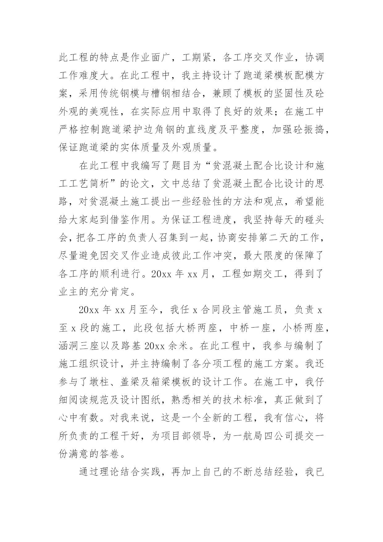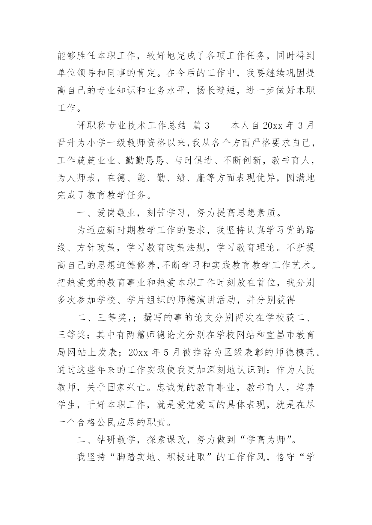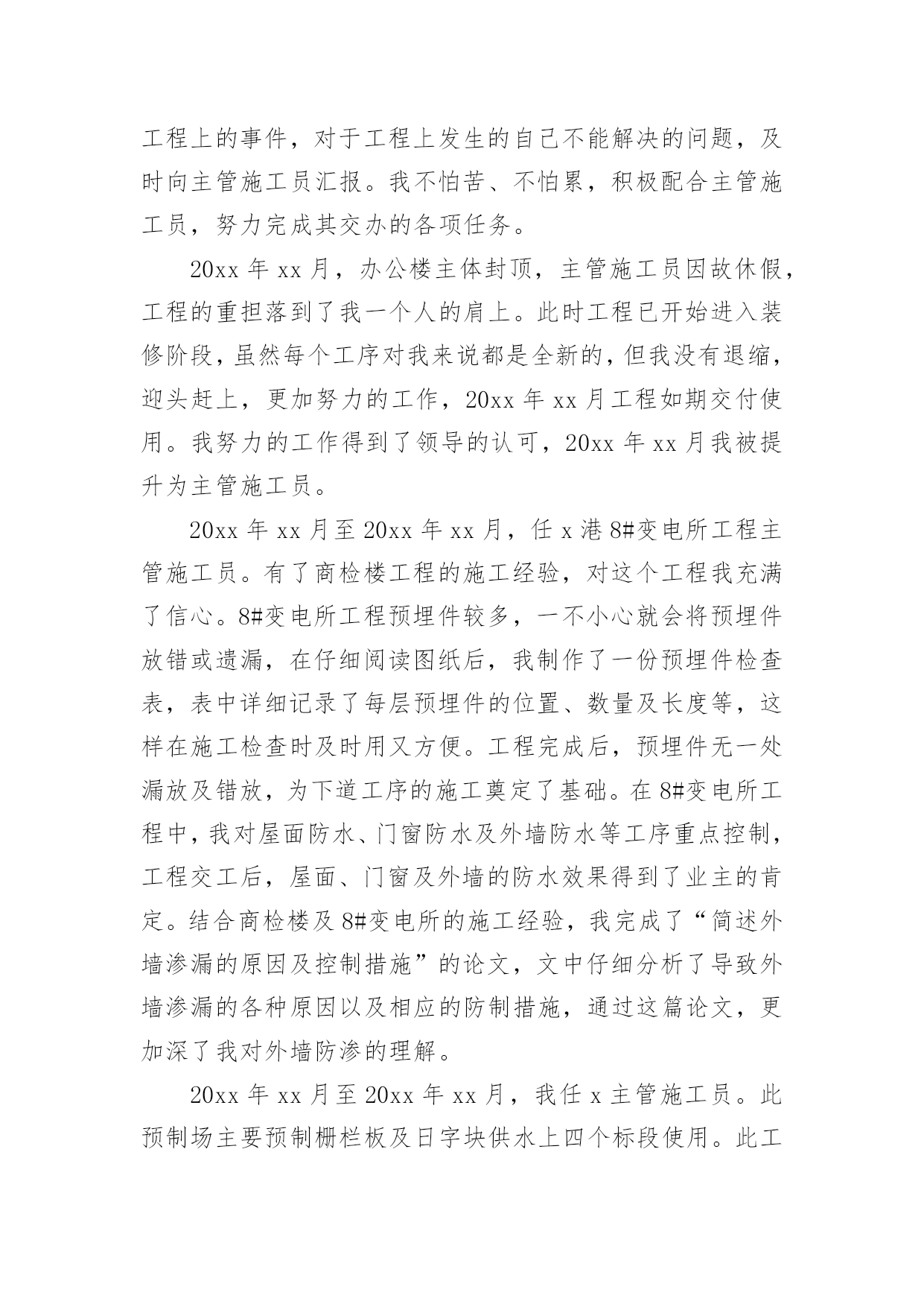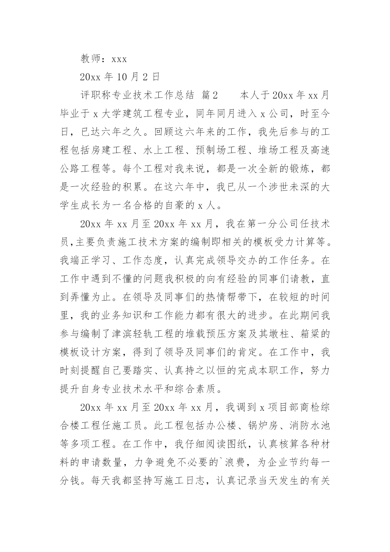 评职称专业技术工作总结评职称专业技术工作总结总结是指对某一阶段的工作、学习或思想中的经验或情况进行分析研究,做出带有规律性结论的书面材料,它可以帮助我们有寻找学习和工作中的规律,让我们一起认真地写一份总结吧。总结怎么写才是正确的呢?以下是小编为大家收集的评职称专业技术工作总结,希望能够帮助到大家。评职称专业技术工作总结篇1本人自20xx年8月任中学二级教师以来,在新华中学一直从事语文教学及班主任工作,同时担任语文组长及校刊主编。四年来,我尽职尽责完成本职工作,成绩虽小,感慨良多。下面我就对自己这几年来的工作作一番简单的回顾与总结。一.思想方面:作为一名共产党员,我一直坚持党的四项基本原则,热爱教育事业,对工作不讲任何条件,只是尽自己最大的能力把工作做得更好。正因为如此,我有幸成为我县提前晋升工资的少数教师之一。二.教学方面:1.教学认真并取得了一定的成效。任职以来,我对教学一丝不苟,对备课、上课、批改作业等教学环节勇于钻研、精心设计,因而很快成为我校骨干教师,并历任初三毕业班教学。2.积极进行教学研究,获奖论文颇多。作为语文教研组长,我不仅带领本组教师积极开展教研活动,我自己还不断对教育教学进行总结提高,并写成论文。任现职以来,我共有获奖论文五篇,其中国家级三篇,省级一篇,地区级一篇。我的论文有的`发表在省级刊物,有的入编论文专著,如《“蒙太奇”手法与中学作文》入编《21世纪教育改革与发展文献》(新疆大学出版社)。3.为了教学的需要,我创办了校刊《绿原》。作为一名我校公认的写作能手,为了激发学生的写作兴趣,我主动请示学校领导,发起并创办了校刊《绿原》,并担任主编。这一行动得到了老师与学生的大力支持,校刊也成为了同学们热切期待的精神食粮。这在我校曾是轰动一时的大事。三.班主任工作方面:工作认真,管理有效,善待学生,这是学校对我班主任工作的一个总结。几年来,我对学校布置的各项工作都能认真按时地完成,教育管理也有一定的成效,特别是在教育学生方面,我善于用赏识的眼光去看待学生,并注意以情动人。学生犯错误时,我常像魏书生那样让学生写“说明书”,而非“检讨书”,因而我也赢得了学校的肯定和同学的爱戴,并曾获得过县级“优秀班主任”称号。以上是本人任现职以来思想、工作方面的总结,虽然取得了一定的工作成效,但我还要加倍努力,当然其中也许难免有些不足,我一定会在今后的工作中尽力克服,并不断地完善自我,努力使自己成为一名优秀的人民教师。教师:xxx20xx年10月2日评职称专业技术工作总结篇2本人于20xx年xx月毕业于x大学建筑工程专业,同年同月进入x公司,时至今日,已达六年之久。回顾这六年来的工作,我先后参与的工程包括房建工程、水上工程、预制场工程、堆场工程及高速公路工程等。每个工程对我来说,都是一次全新的锻炼,都是一次经验的积累。在这六年中,我已从一个涉世未深的大学生成长为一名合格的自豪的x人。20xx年xx月至20xx年xx月,我在第一分公司任技术员,主要负责施工技术方案的编制即相关的模板受力计算等。我端正学习、工作态度,认真完成领导交办的工作任务。在工作中遇到不懂的问题我积极的向有经验的同事们请教,直到弄懂为止。在领导及同事们的热情帮带下,在较短的时间里,我的业务知识和工作能力都有很大的进步。在此期间我参与编制了津滨轻轨工程的堆载预压方案及其墩柱、箱粱的模板设计方案,得到了领导及同事们的肯定。在工作中,我时刻提醒自己要踏实、认真持之以恒的完成本职工作,努力提升自身专业技术水平和综合素质。20xx年xx月至20xx年xx月,我调到x项目部商检综合楼工程任施工员。此工程包括办公楼、锅炉房、消防水池等多项工程。在工作中,我仔细阅读图纸,认真核算各种材料的申请数量,力争避免不必要的`浪费,为企业节约每一分钱。每天我都坚持写施工日志,认真记录当天发生的有关工程上的事件,对于工程上发生的自己不能解决的问题,及时向主管施工员汇报。我不怕苦、不怕累,积极配合主管施工员,努力完成其交办的各项任务。20xx年xx月,办公楼主体封顶,主管施工员因故休假,工程的重担落到了我一个人的肩上。此时工程已开始进入装修阶段,虽然每个工序对我来说都是全新的,但我没有退缩,迎头赶上,更加努力的工作,20xx年xx月工程如期交付使用。我努力的工作得到了领导的认可,20xx年xx月我被提升为主管施工员。20xx年xx月至20xx年xx月,任x港8#变电所工程主管施工员。有了商检楼工程的施工经验,对这个工程我充满了信心。8#变电所工程预埋件较多,一不小心就会将预埋件放错或遗漏,在仔细阅读图纸后,我制作了一份预埋件检查表,表中详细记录了每层预埋件的位置、数量及长度等,这样在施工检查时及时用又方便。工程完成后,预埋件无一处漏放及错放,为下道工序的施工奠定了基础。在8#变电所工程中,我