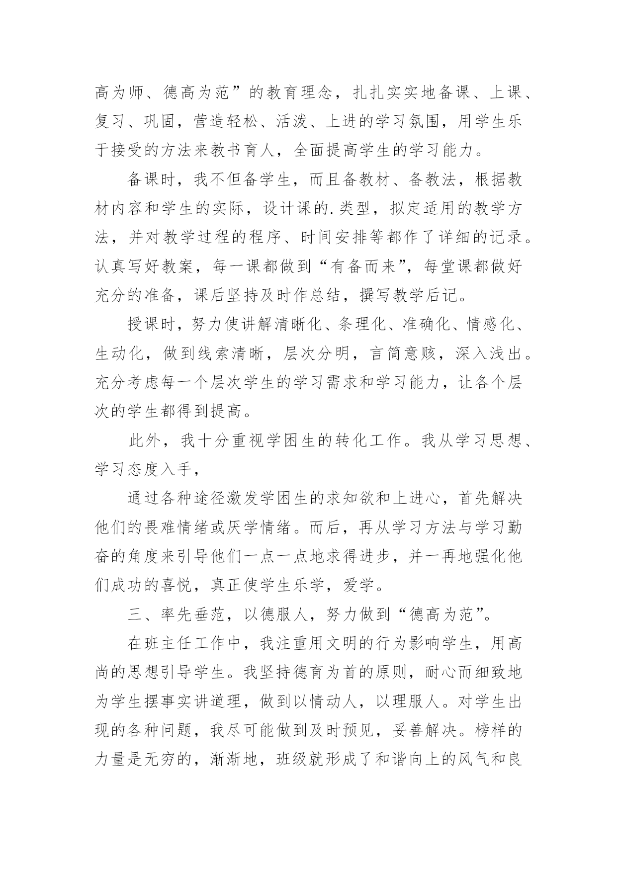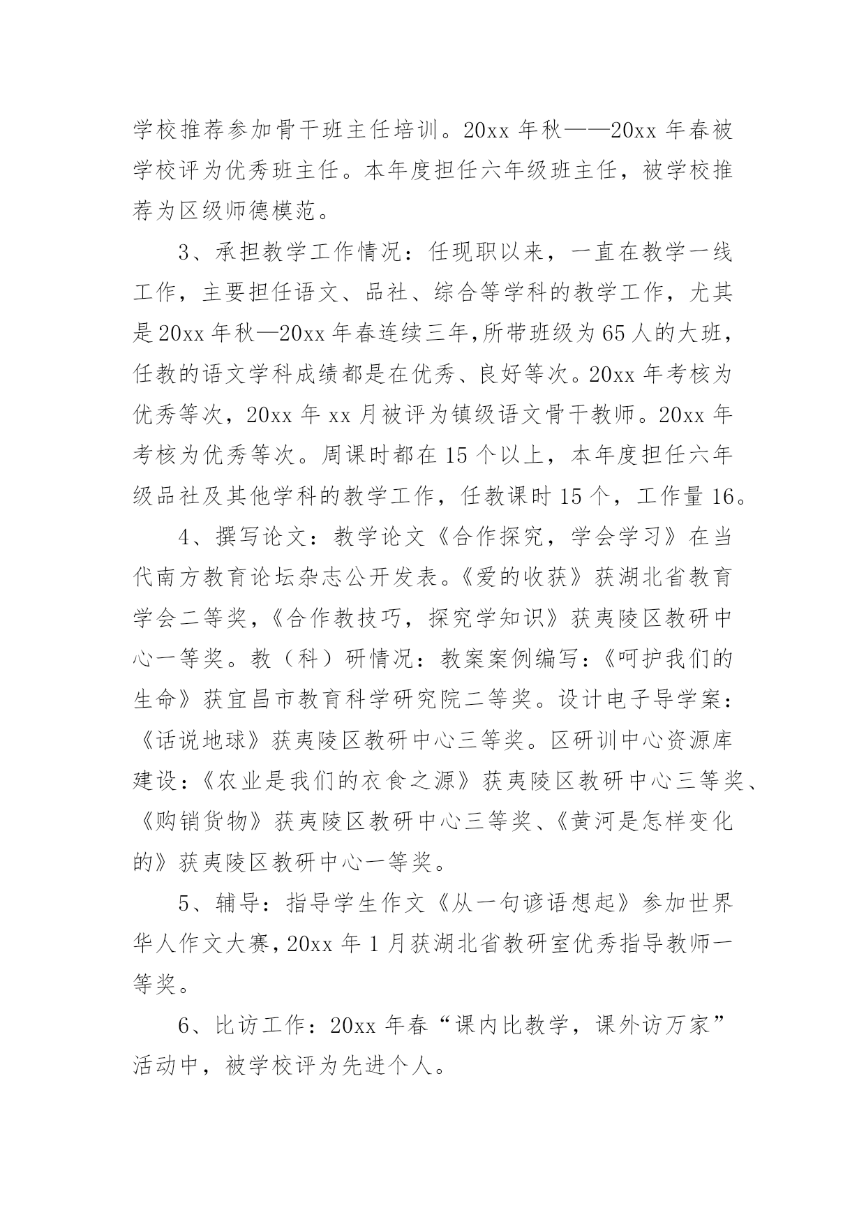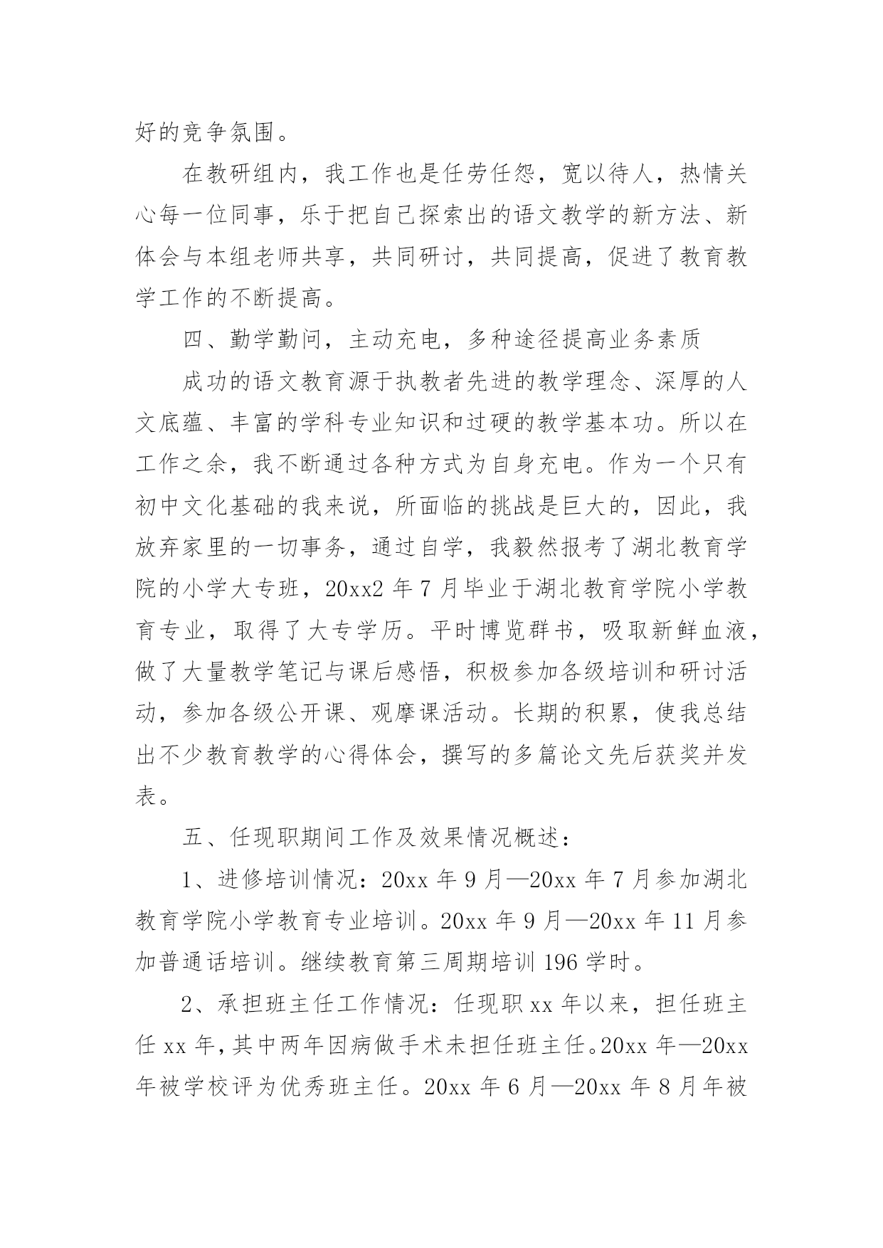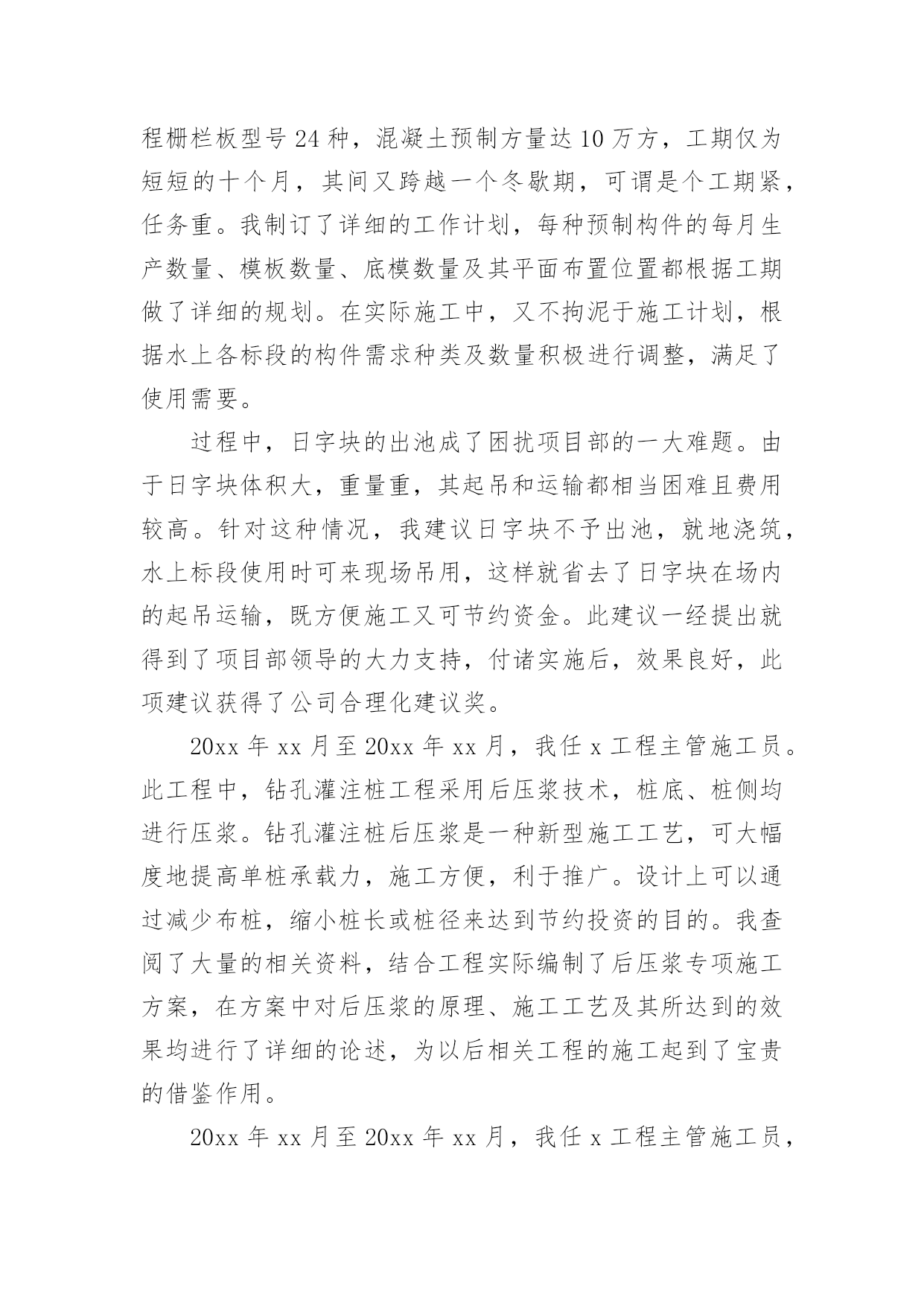 评职称专业技术工作总结评职称专业技术工作总结总结是指对某一阶段的工作、学习或思想中的经验或情况进行分析研究,做出带有规律性结论的书面材料,它可以帮助我们有寻找学习和工作中的规律,让我们一起认真地写一份总结吧。总结怎么写才是正确的呢?以下是小编为大家收集的评职称专业技术工作总结,希望能够帮助到大家。评职称专业技术工作总结篇1本人自20xx年8月任中学二级教师以来,在新华中学一直从事语文教学及班主任工作,同时担任语文组长及校刊主编。四年来,我尽职尽责完成本职工作,成绩虽小,感慨良多。下面我就对自己这几年来的工作作一番简单的回顾与总结。一.思想方面:作为一名共产党员,我一直坚持党的四项基本原则,热爱教育事业,对工作不讲任何条件,只是尽自己最大的能力把工作做得更好。正因为如此,我有幸成为我县提前晋升工资的少数教师之一。二.教学方面:1.教学认真并取得了一定的成效。任职以来,我对教学一丝不苟,对备课、上课、批改作业等教学环节勇于钻研、精心设计,因而很快成为我校骨干教师,并历任初三毕业班教学。2.积极进行教学研究,获奖论文颇多。作为语文教研组长,我不仅带领本组教师积极开展教研活动,我自己还不断对教育教学进行总结提高,并写成论文。任现职以来,我共有获奖论文五篇,其中国家级三篇,省级一篇,地区级一篇。我的论文有的`发表在省级刊物,有的入编论文专著,如《“蒙太奇”手法与中学作文》入编《21世纪教育改革与发展文献》(新疆大学出版社)。3.为了教学的需要,我创办了校刊《绿原》。作为一名我校公认的写作能手,为了激发学生的写作兴趣,我主动请示学校领导,发起并创办了校刊《绿原》,并担任主编。这一行动得到了老师与学生的大力支持,校刊也成为了同学们热切期待的精神食粮。这在我校曾是轰动一时的大事。三.班主任工作方面:工作认真,管理有效,善待学生,这是学校对我班主任工作的一个总结。几年来,我对学校布置的各项工作都能认真按时地完成,教育管理也有一定的成效,特别是在教育学生方面,我善于用赏识的眼光去看待学生,并注意以情动人。学生犯错误时,我常像魏书生那样让学生写“说明书”,而非“检讨书”,因而我也赢得了学校的肯定和同学的爱戴,并曾获得过县级“优秀班主任”称号。以上是本人任现职以来思想、工作方面的总结,虽然取得了一定的工作成效,但我还要加倍努力,当然其中也许难免有些不足,我一定会在今后的工作中尽力克服,并不断地完善自我,努力使自己成为一名优秀的人民教师。教师:xxx20xx年10月2日评职称专业技术工作总结篇2本人于20xx年xx月毕业于x大学建筑工程专业,同年同月进入x公司,时至今日,已达六年之久。回顾这六年来的工作,我先后参与的工程包括房建工程、水上工程、预制场工程、堆场工程及高速公路工程等。每个工程对我来说,都是一次全新的锻炼,都是一次经验的积累。在这六年中,我已从一个涉世未深的大学生成长为一名合格的自豪的x人。20xx年xx月至20xx年xx月,我在第一分公司任技术员,主要负责施工技术方案的编制即相关的模板受力计算等。我端正学习、工作态度,认真完成领导交办的工作任务。在工作中遇到不懂的问题我积极的向有经验的同事们请教,直到弄懂为止。在领导及同事们的热情帮带下,在较短的时间里,我的业务知识和工作能力都有很大的进步。在此期间我参与编制了津滨轻轨工程的堆载预压方案及其墩柱、箱粱的模板设计方案,得到了领导及同事们的肯定。在工作中,我时刻提醒自己要踏实、认真持之以恒的完成本职工作,努力提升自身专业技术水平和综合素质。20xx年xx月至20xx年xx月,我调到x项目部商检综合楼工程任施工员。此工程包括办公楼、锅炉房、消防水池等多项工程。在工作中,我仔细阅读图纸,认真核算各种材料的申请数量,力争避免不必要的`浪费,为企业节约每一分钱。每天我都坚持写施工日志,认真记录当天发生的有关工程上的事件,对于工程上发生的自己不能解决的问题,及时向主管施工员汇报。我不怕苦、不怕累,积极配合主管施工员,努力完成其交办的各项任务。20xx年xx月,办公楼主体封顶,主管施工员因故休假,工程的重担落到了我一个人的肩上。此时工程已开始进入装修阶段,虽然每个工序对我来说都是全新的,但我没有退缩,迎头赶上,更加努力的工作,20xx年xx月工程如期交付使用。我努力的工作得到了领导的认可,20xx年xx月我被提升为主管施工员。20xx年xx月至20xx年xx月,任x港8#变电所工程主管施工员。有了商检楼工程的施工经验,对这个工程我充满了信心。8#变电所工程预埋件较多,一不小心就会将预埋件放错或遗漏,在仔细阅读图纸后,我制作了一份预埋件检查表,表中详细记录了每层预埋件的位置、数量及长度等,这样在施工检查时及时用又方便。工程完成后,预埋件无一处漏放及错放,为下道工序的施工奠定了基础。在8#变电所工程中,我