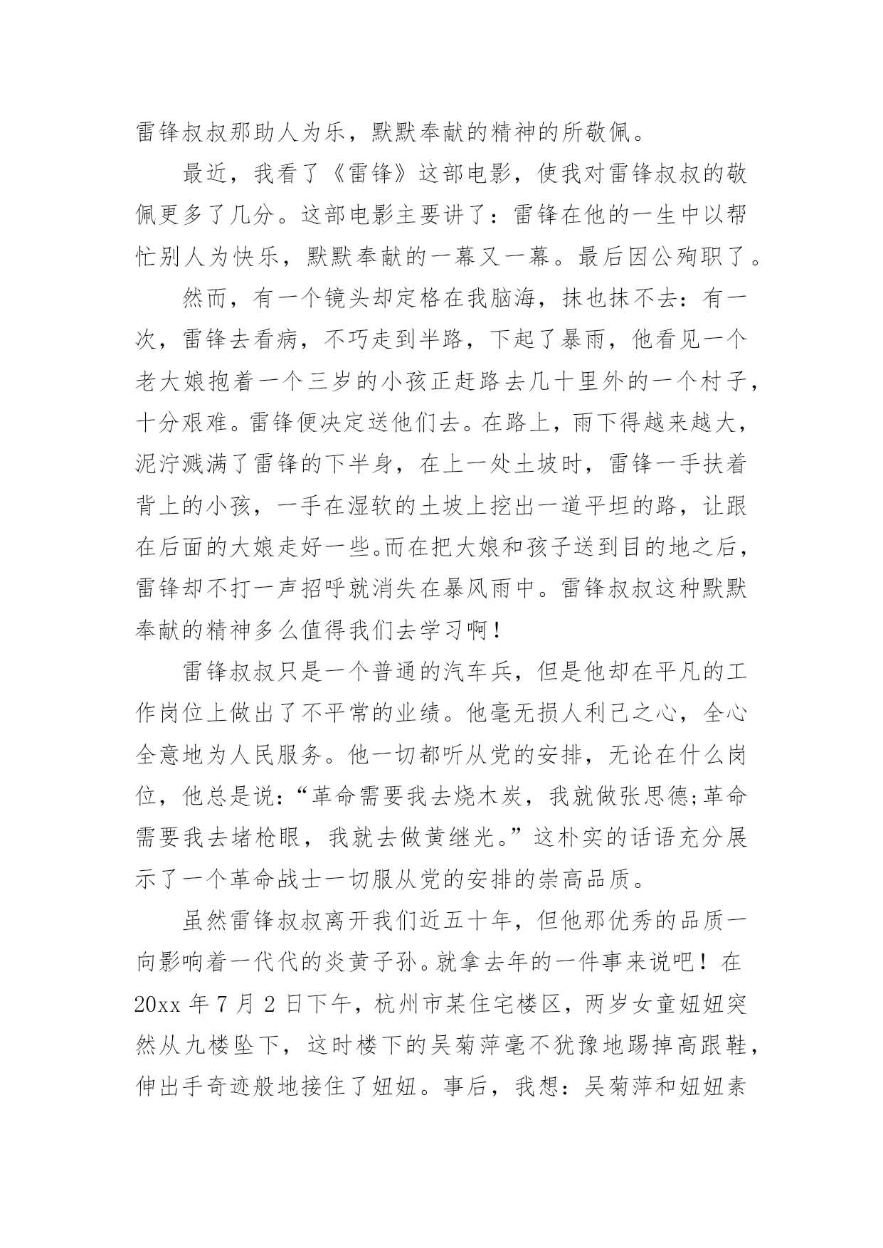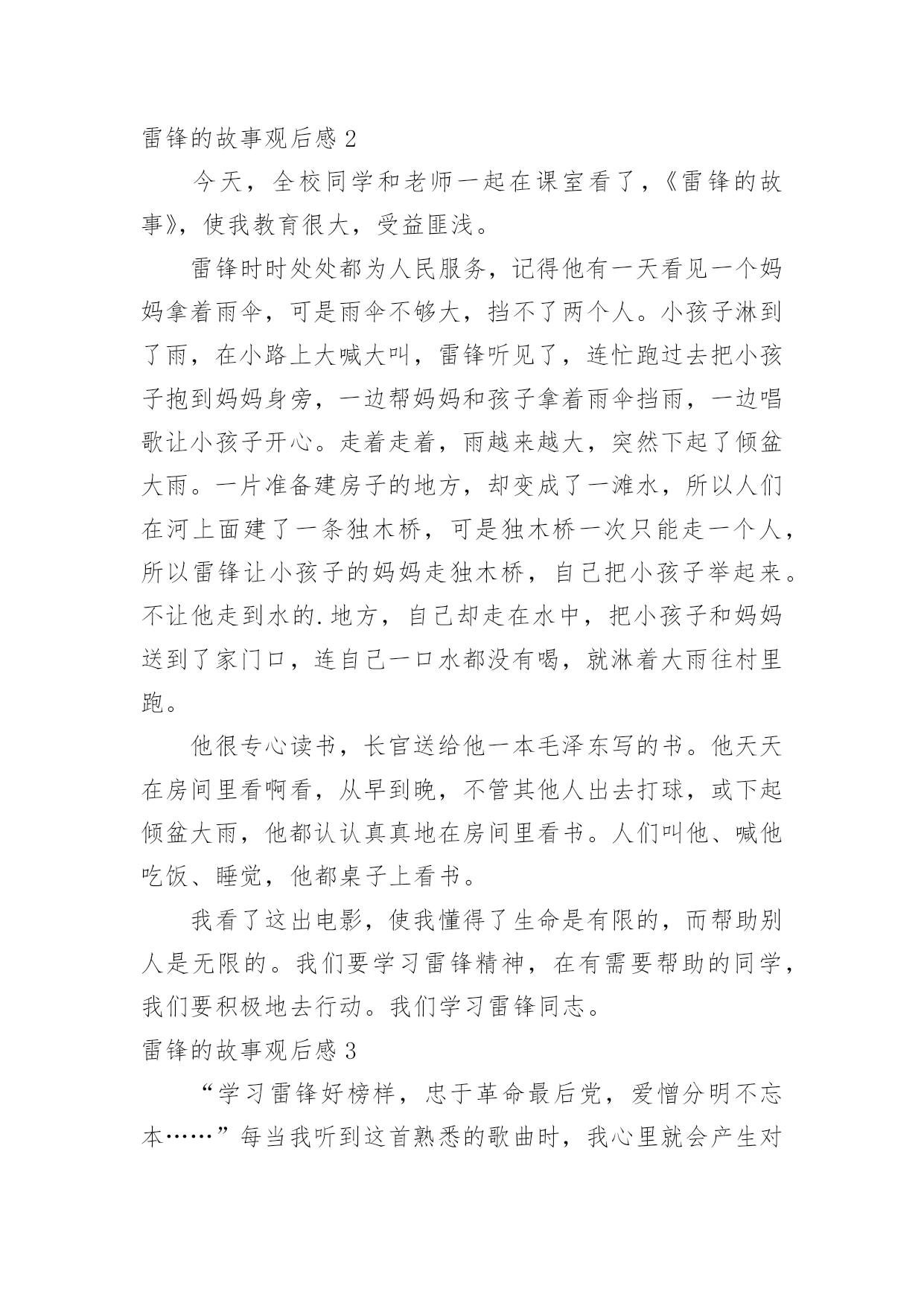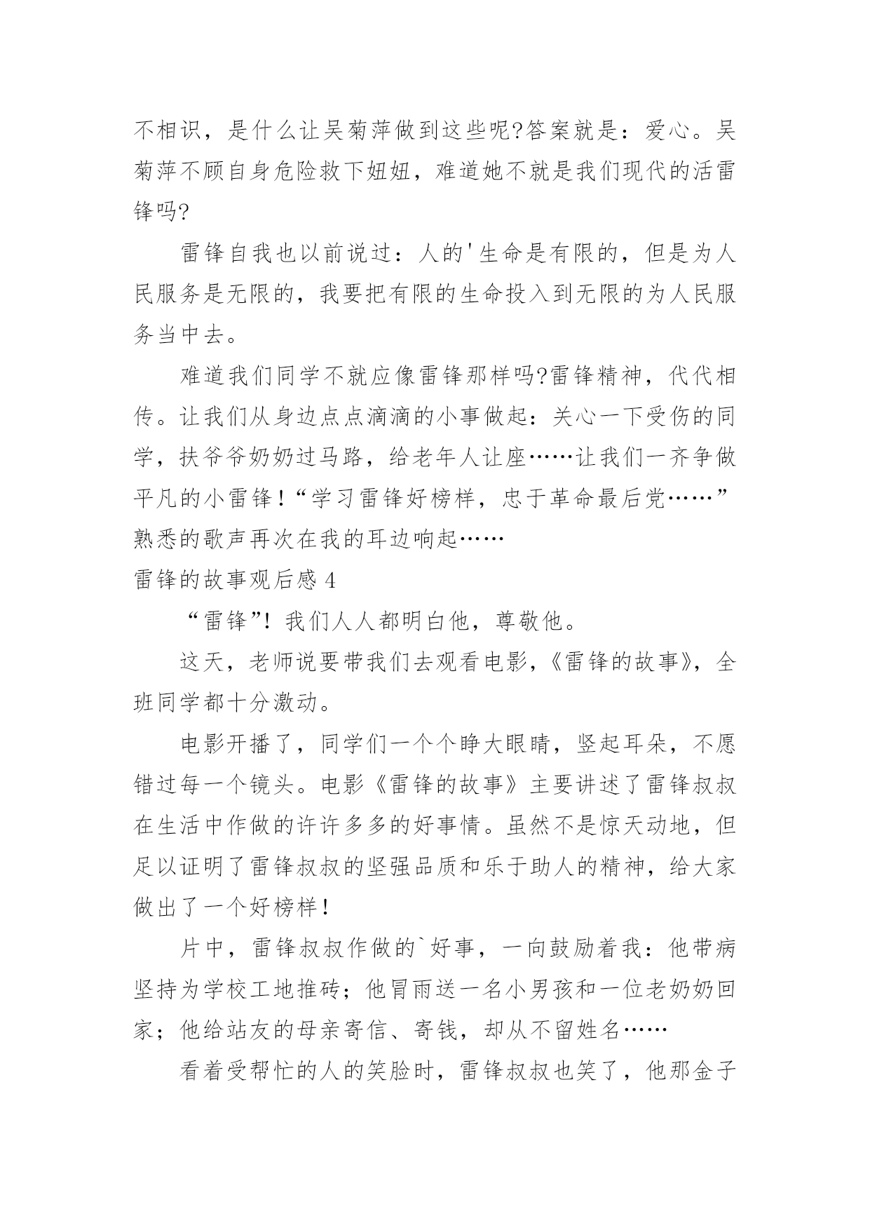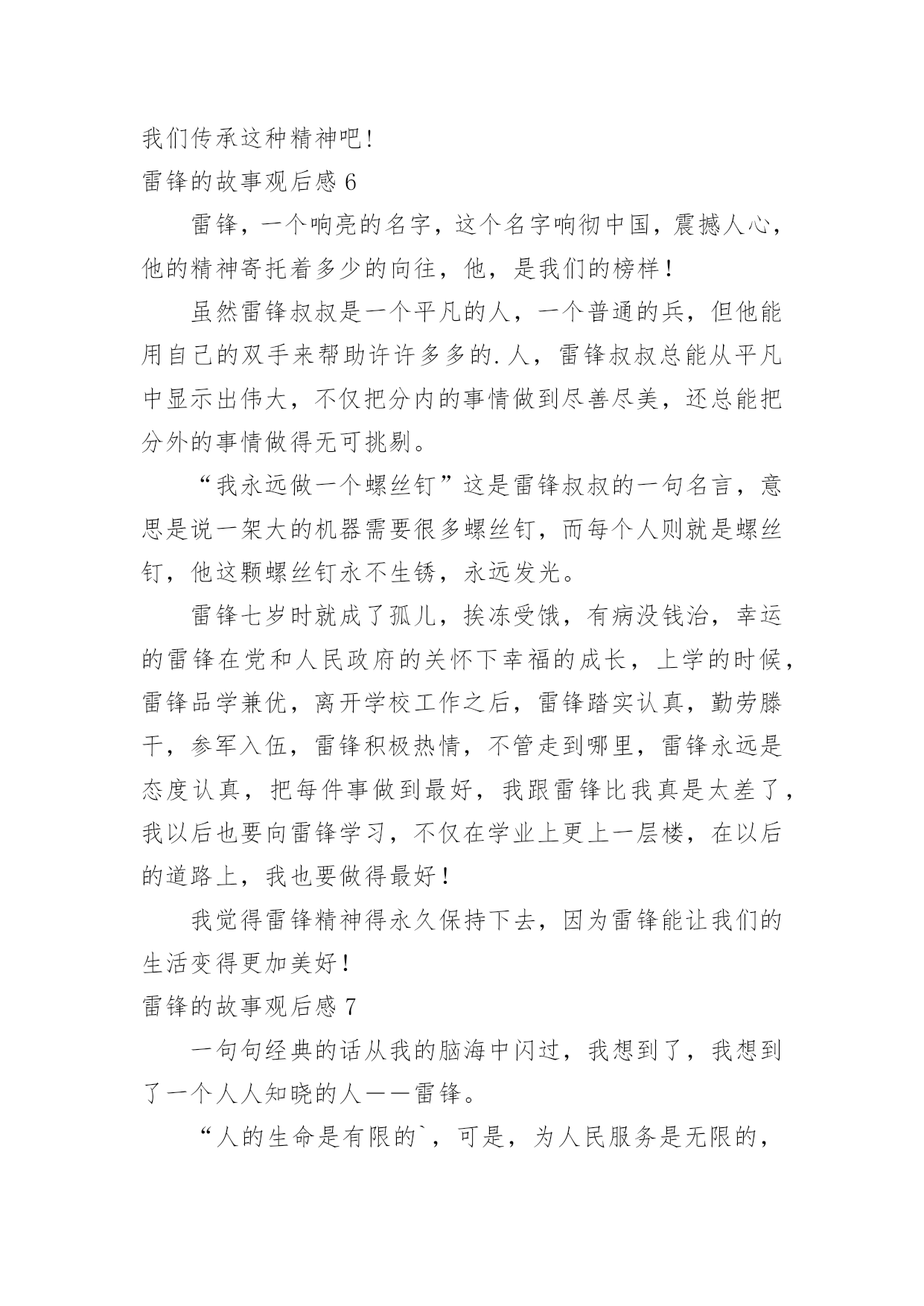 雷锋的故事观后感雷锋的故事观后感在观赏了后,心中感慨万千,不禁为作品所深深折服,相信大家有很多值得分享的东西吧,每个观看完影片的人都有不一样的感受与想法。那么观后感到底应该怎么写呢?以下是小编为大家收集的雷锋的故事观后感,欢迎大家借鉴与参考,希望对大家有所帮助。雷锋的故事观后感1今天,我读了一本有意义的书,名叫《雷锋的故事》。这本书的主人公是个名叫雷锋的孤儿,他小时候因家中贫穷,常常饿肚子,他的父母也死亡,但幸运的是他遇到了一位改变了他人生的人,那就是一位解放军叔叔,他在解放区内开始发奋读书,他特别珍惜这次机会,就一有学习的机会,第一个报名。他非常喜欢看书,尤其是《钢铁是怎样炼成的.》,这本书他百看不厌。长大后他就去参加八路军,可是因为身体虚弱,被拒绝了,可他非要参军,就在书记的家中干起了活,书记看他十分想参军,又很有纪律,就让他参军。雷锋经常帮助陌生人,还不留名,所以大家都认识这个小伙子。后来因为一次意外,使他去世了。老奶奶知道了,哭的比自己的孩子死了还伤心!读了这本书,我心想:我一定要像雷锋叔叔一样。雷锋的故事观后感2今天,全校同学和老师一起在课室看了,《雷锋的故事》,使我教育很大,受益匪浅。雷锋时时处处都为人民服务,记得他有一天看见一个妈妈拿着雨伞,可是雨伞不够大,挡不了两个人。小孩子淋到了雨,在小路上大喊大叫,雷锋听见了,连忙跑过去把小孩子抱到妈妈身旁,一边帮妈妈和孩子拿着雨伞挡雨,一边唱歌让小孩子开心。走着走着,雨越来越大,突然下起了倾盆大雨。一片准备建房子的地方,却变成了一滩水,所以人们在河上面建了一条独木桥,可是独木桥一次只能走一个人,所以雷锋让小孩子的妈妈走独木桥,自己把小孩子举起来。不让他走到水的.地方,自己却走在水中,把小孩子和妈妈送到了家门口,连自己一口水都没有喝,就淋着大雨往村里跑。他很专心读书,长官送给他一本毛泽东写的书。他天天在房间里看啊看,从早到晚,不管其他人出去打球,或下起倾盆大雨,他都认认真真地在房间里看书。人们叫他、喊他吃饭、睡觉,他都桌子上看书。我看了这出电影,使我懂得了生命是有限的,而帮助别人是无限的。我们要学习雷锋精神,在有需要帮助的同学,我们要积极地去行动。我们学习雷锋同志。雷锋的故事观后感3“学习雷锋好榜样,忠于革命最后党,爱憎分明不忘本……”每当我听到这首熟悉的歌曲时,我心里就会产生对雷锋叔叔那助人为乐,默默奉献的精神的所敬佩。最近,我看了《雷锋》这部电影,使我对雷锋叔叔的敬佩更多了几分。这部电影主要讲了:雷锋在他的一生中以帮忙别人为快乐,默默奉献的一幕又一幕。最后因公殉职了。然而,有一个镜头却定格在我脑海,抹也抹不去:有一次,雷锋去看病,不巧走到半路,下起了暴雨,他看见一个老大娘抱着一个三岁的小孩正赶路去几十里外的一个村子,十分艰难。雷锋便决定送他们去。在路上,雨下得越来越大,泥泞溅满了雷锋的下半身,在上一处土坡时,雷锋一手扶着背上的小孩,一手在湿软的土坡上挖出一道平坦的路,让跟在后面的大娘走好一些。而在把大娘和孩子送到目的地之后,雷锋却不打一声招呼就消失在暴风雨中。雷锋叔叔这种默默奉献的精神多么值得我们去学习啊!雷锋叔叔只是一个普通的汽车兵,但是他却在平凡的工作岗位上做出了不平常的业绩。他毫无损人利己之心,全心全意地为人民服务。他一切都听从党的安排,无论在什么岗位,他总是说:“革命需要我去烧木炭,我就做张思德;革命需要我去堵枪眼,我就去做黄继光。”这朴实的话语充分展示了一个革命战士一切服从党的安排的崇高品质。虽然雷锋叔叔离开我们近五十年,但他那优秀的品质一向影响着一代代的炎黄子孙。就拿去年的一件事来说吧!在20xx年7月2日下午,杭州市某住宅楼区,两岁女童妞妞突然从九楼坠下,这时楼下的吴菊萍毫不犹豫地踢掉高跟鞋,伸出手奇迹般地接住了妞妞。事后,我想:吴菊萍和妞妞素不相识,是什么让吴菊萍做到这些呢?答案就是:爱心。吴菊萍不顾自身危险救下妞妞,难道她不就是我们现代的活雷锋吗?雷锋自我也以前说过:人的'生命是有限的,但是为人民服务是无限的,我要把有限的生命投入到无限的为人民服务当中去。难道我们同学不就应像雷锋那样吗?雷锋精神,代代相传。让我们从身边点点滴滴的小事做起:关心一下受伤的同学,扶爷爷奶奶过马路,给老年人让座……让我们一齐争做平凡的小雷锋!“学习雷锋好榜样,忠于革命最后党……”熟悉的歌声再次在我的耳边响起……雷锋的故事观后感4“雷锋”!我们人人都明白他,尊敬他。这天,老师说要带我们去观看电影,《雷锋的故事》,全班同学都十分激动。电影开播了,同学们一个个睁大眼睛,竖起耳朵,不愿错过每一个镜头。电影《雷锋的故事》主要讲述了雷锋叔叔在生活中作做的许许多多的好事情。虽然不是惊天动地,但足以证明了雷锋叔叔的坚强品质和乐于助人的精神,给大家做出了一个好榜样!片中,雷锋叔叔作做的`好