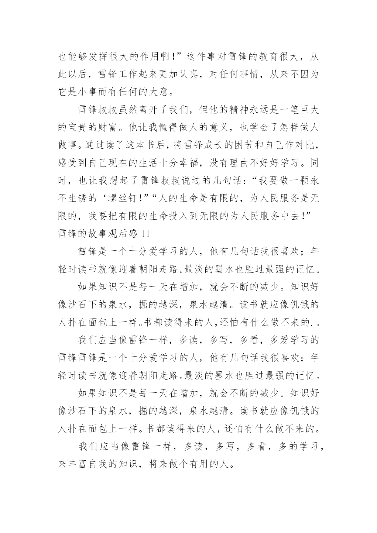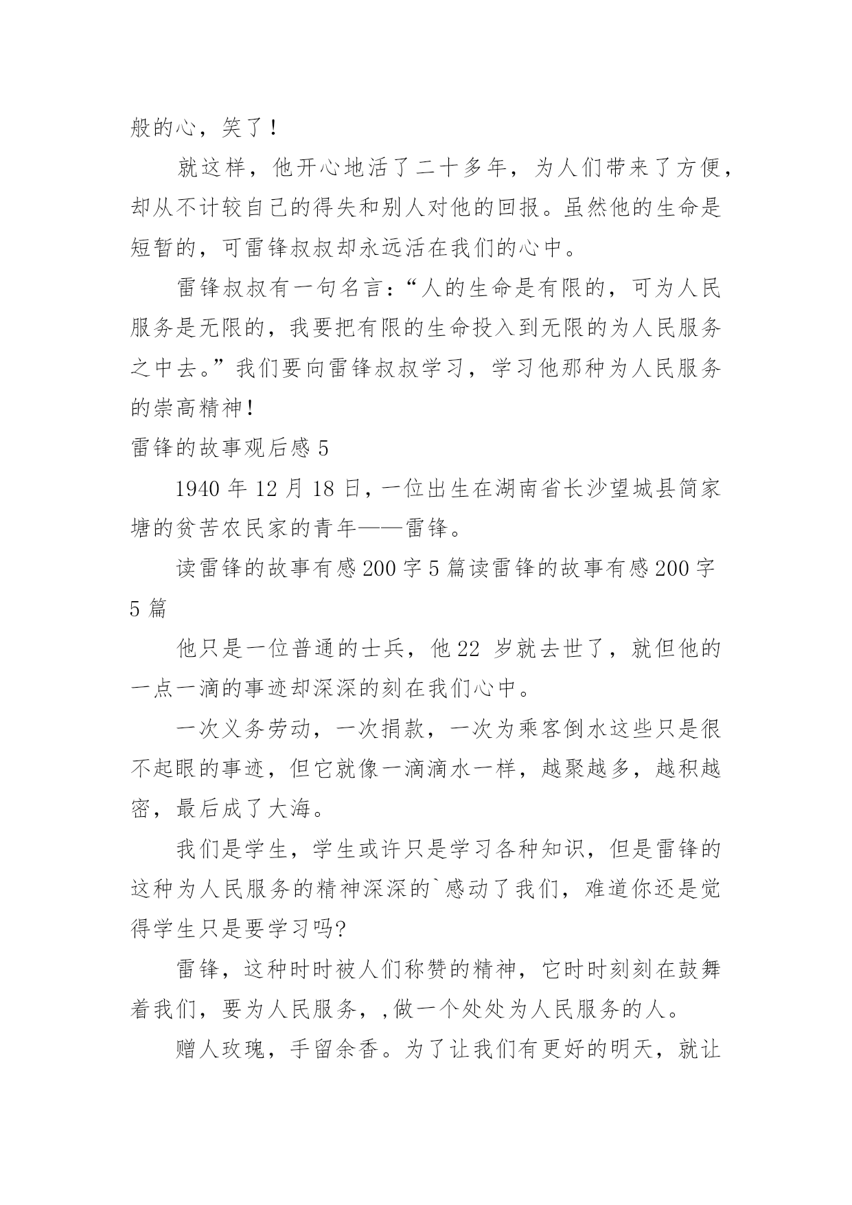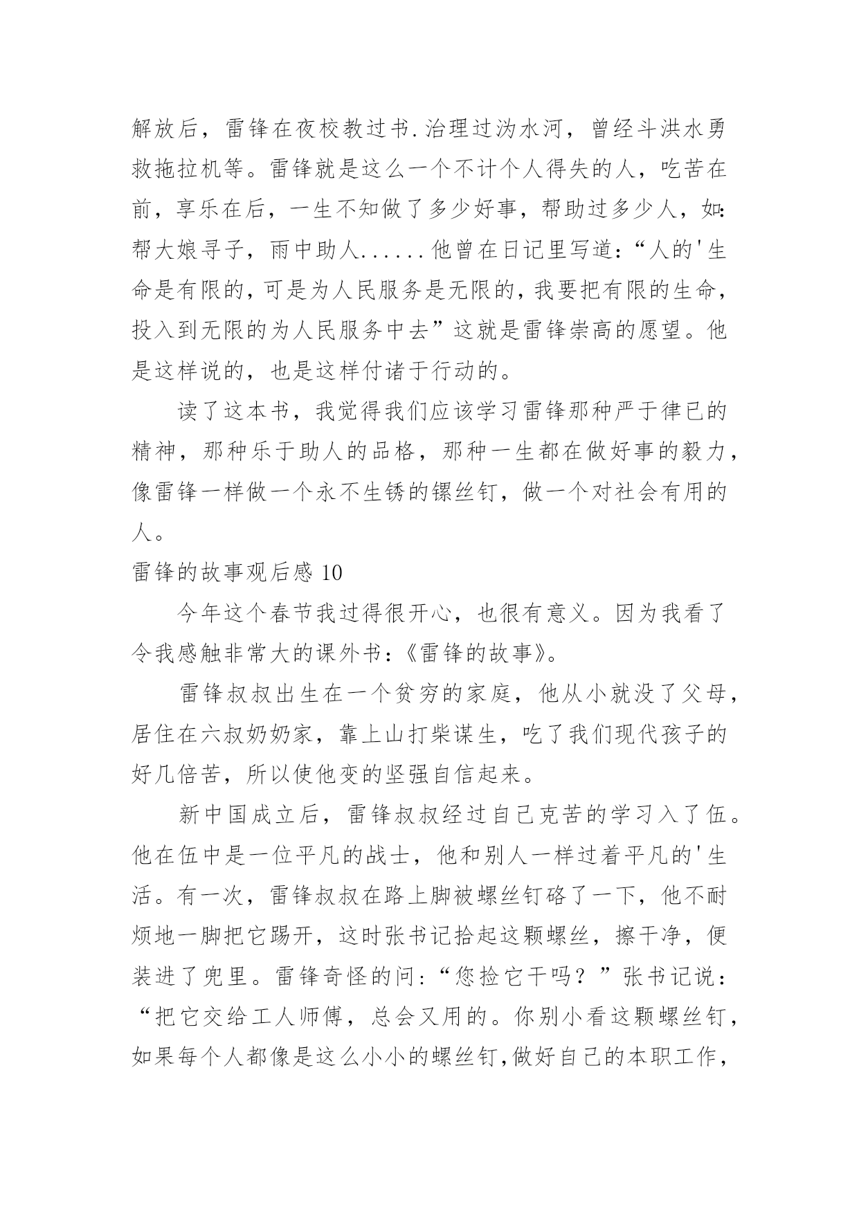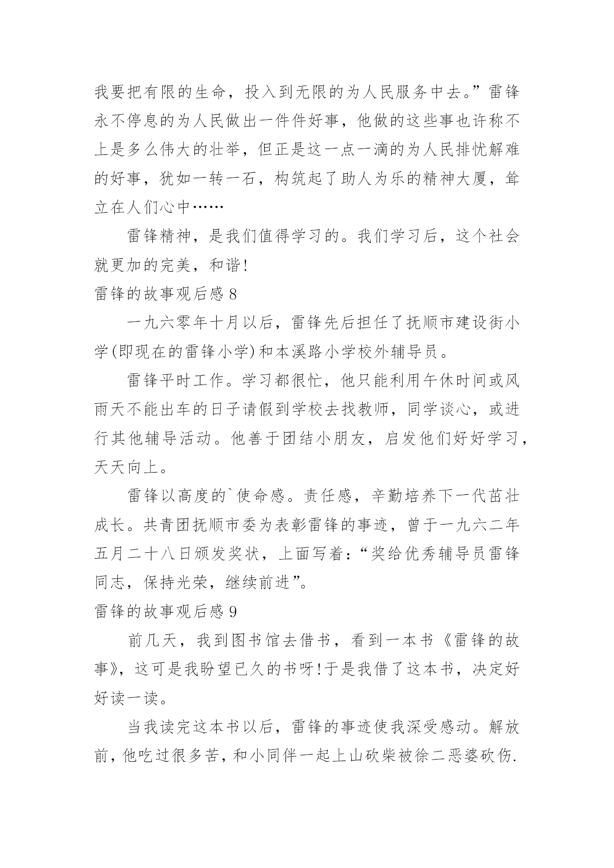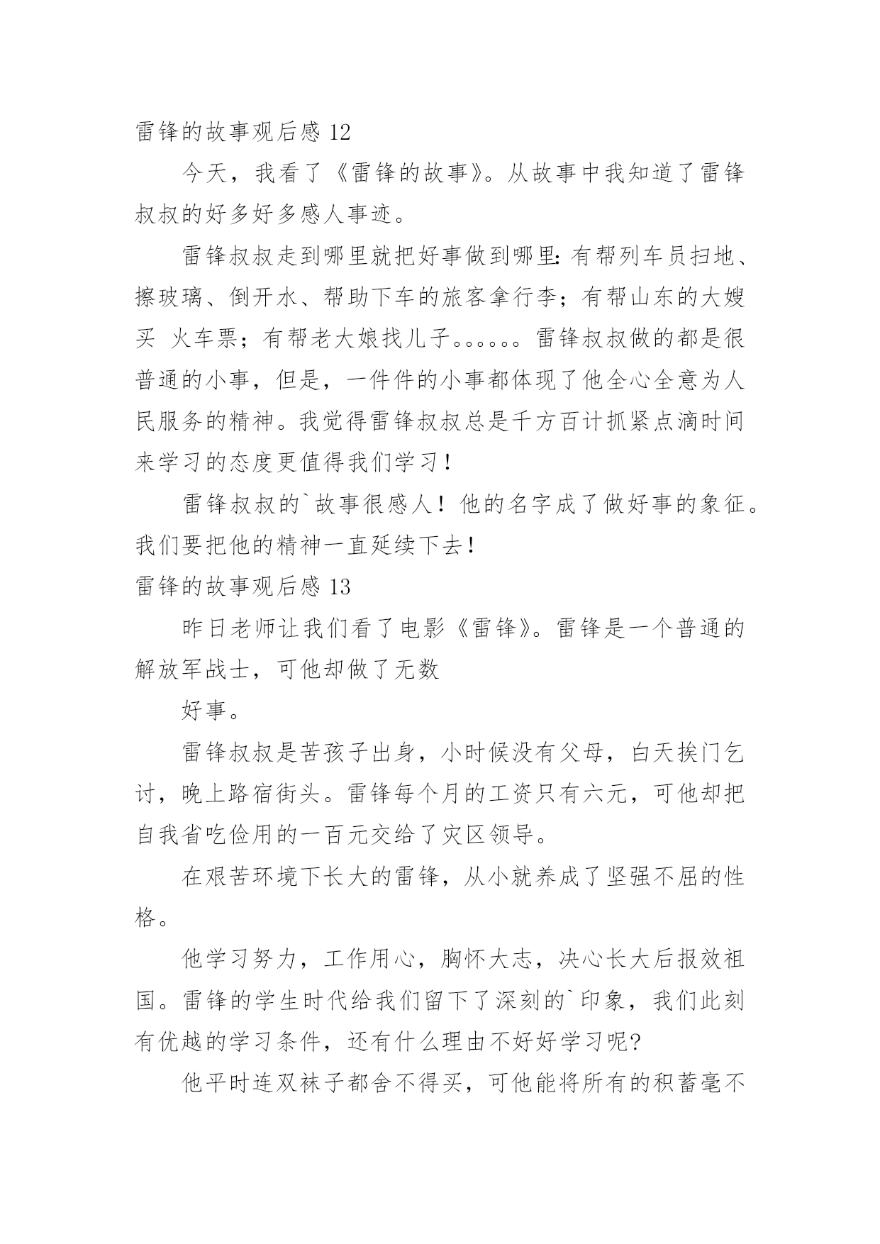 雷锋的故事观后感雷锋的故事观后感在观赏了后,心中感慨万千,不禁为作品所深深折服,相信大家有很多值得分享的东西吧,每个观看完影片的人都有不一样的感受与想法。那么观后感到底应该怎么写呢?以下是小编为大家收集的雷锋的故事观后感,欢迎大家借鉴与参考,希望对大家有所帮助。雷锋的故事观后感1今天,我读了一本有意义的书,名叫《雷锋的故事》。这本书的主人公是个名叫雷锋的孤儿,他小时候因家中贫穷,常常饿肚子,他的父母也死亡,但幸运的是他遇到了一位改变了他人生的人,那就是一位解放军叔叔,他在解放区内开始发奋读书,他特别珍惜这次机会,就一有学习的机会,第一个报名。他非常喜欢看书,尤其是《钢铁是怎样炼成的.》,这本书他百看不厌。长大后他就去参加八路军,可是因为身体虚弱,被拒绝了,可他非要参军,就在书记的家中干起了活,书记看他十分想参军,又很有纪律,就让他参军。雷锋经常帮助陌生人,还不留名,所以大家都认识这个小伙子。后来因为一次意外,使他去世了。老奶奶知道了,哭的比自己的孩子死了还伤心!读了这本书,我心想:我一定要像雷锋叔叔一样。雷锋的故事观后感2今天,全校同学和老师一起在课室看了,《雷锋的故事》,使我教育很大,受益匪浅。雷锋时时处处都为人民服务,记得他有一天看见一个妈妈拿着雨伞,可是雨伞不够大,挡不了两个人。小孩子淋到了雨,在小路上大喊大叫,雷锋听见了,连忙跑过去把小孩子抱到妈妈身旁,一边帮妈妈和孩子拿着雨伞挡雨,一边唱歌让小孩子开心。走着走着,雨越来越大,突然下起了倾盆大雨。一片准备建房子的地方,却变成了一滩水,所以人们在河上面建了一条独木桥,可是独木桥一次只能走一个人,所以雷锋让小孩子的妈妈走独木桥,自己把小孩子举起来。不让他走到水的.地方,自己却走在水中,把小孩子和妈妈送到了家门口,连自己一口水都没有喝,就淋着大雨往村里跑。他很专心读书,长官送给他一本毛泽东写的书。他天天在房间里看啊看,从早到晚,不管其他人出去打球,或下起倾盆大雨,他都认认真真地在房间里看书。人们叫他、喊他吃饭、睡觉,他都桌子上看书。我看了这出电影,使我懂得了生命是有限的,而帮助别人是无限的。我们要学习雷锋精神,在有需要帮助的同学,我们要积极地去行动。我们学习雷锋同志。雷锋的故事观后感3“学习雷锋好榜样,忠于革命最后党,爱憎分明不忘本……”每当我听到这首熟悉的歌曲时,我心里就会产生对雷锋叔叔那助人为乐,默默奉献的精神的所敬佩。最近,我看了《雷锋》这部电影,使我对雷锋叔叔的敬佩更多了几分。这部电影主要讲了:雷锋在他的一生中以帮忙别人为快乐,默默奉献的一幕又一幕。最后因公殉职了。然而,有一个镜头却定格在我脑海,抹也抹不去:有一次,雷锋去看病,不巧走到半路,下起了暴雨,他看见一个老大娘抱着一个三岁的小孩正赶路去几十里外的一个村子,十分艰难。雷锋便决定送他们去。在路上,雨下得越来越大,泥泞溅满了雷锋的下半身,在上一处土坡时,雷锋一手扶着背上的小孩,一手在湿软的土坡上挖出一道平坦的路,让跟在后面的大娘走好一些。而在把大娘和孩子送到目的地之后,雷锋却不打一声招呼就消失在暴风雨中。雷锋叔叔这种默默奉献的精神多么值得我们去学习啊!雷锋叔叔只是一个普通的汽车兵,但是他却在平凡的工作岗位上做出了不平常的业绩。他毫无损人利己之心,全心全意地为人民服务。他一切都听从党的安排,无论在什么岗位,他总是说:“革命需要我去烧木炭,我就做张思德;革命需要我去堵枪眼,我就去做黄继光。”这朴实的话语充分展示了一个革命战士一切服从党的安排的崇高品质。虽然雷锋叔叔离开我们近五十年,但他那优秀的品质一向影响着一代代的炎黄子孙。就拿去年的一件事来说吧!在20xx年7月2日下午,杭州市某住宅楼区,两岁女童妞妞突然从九楼坠下,这时楼下的吴菊萍毫不犹豫地踢掉高跟鞋,伸出手奇迹般地接住了妞妞。事后,我想:吴菊萍和妞妞素不相识,是什么让吴菊萍做到这些呢?答案就是:爱心。吴菊萍不顾自身危险救下妞妞,难道她不就是我们现代的活雷锋吗?雷锋自我也以前说过:人的'生命是有限的,但是为人民服务是无限的,我要把有限的生命投入到无限的为人民服务当中去。难道我们同学不就应像雷锋那样吗?雷锋精神,代代相传。让我们从身边点点滴滴的小事做起:关心一下受伤的同学,扶爷爷奶奶过马路,给老年人让座……让我们一齐争做平凡的小雷锋!“学习雷锋好榜样,忠于革命最后党……”熟悉的歌声再次在我的耳边响起……雷锋的故事观后感4“雷锋”!我们人人都明白他,尊敬他。这天,老师说要带我们去观看电影,《雷锋的故事》,全班同学都十分激动。电影开播了,同学们一个个睁大眼睛,竖起耳朵,不愿错过每一个镜头。电影《雷锋的故事》主要讲述了雷锋叔叔在生活中作做的许许多多的好事情。虽然不是惊天动地,但足以证明了雷锋叔叔的坚强品质和乐于助人的精神,给大家做出了一个好榜样!片中,雷锋叔叔作做的`好