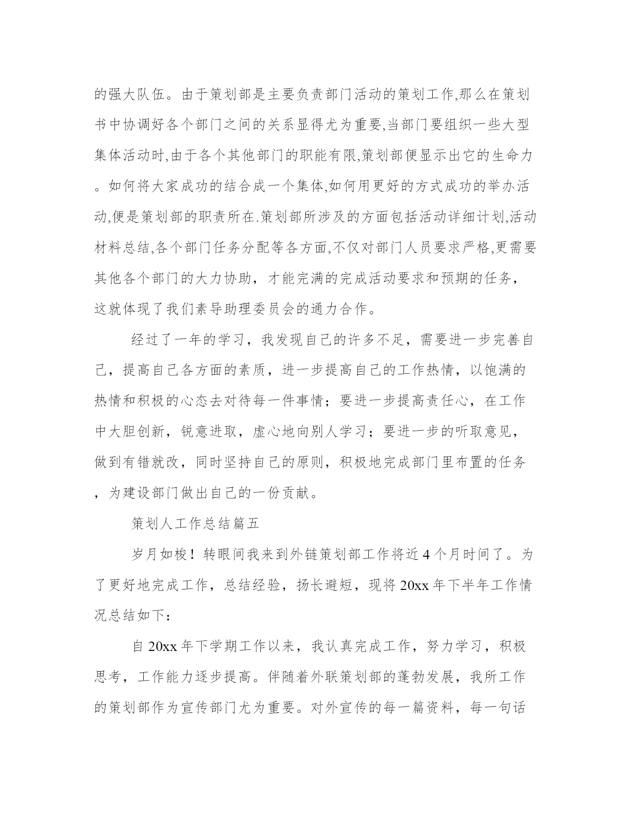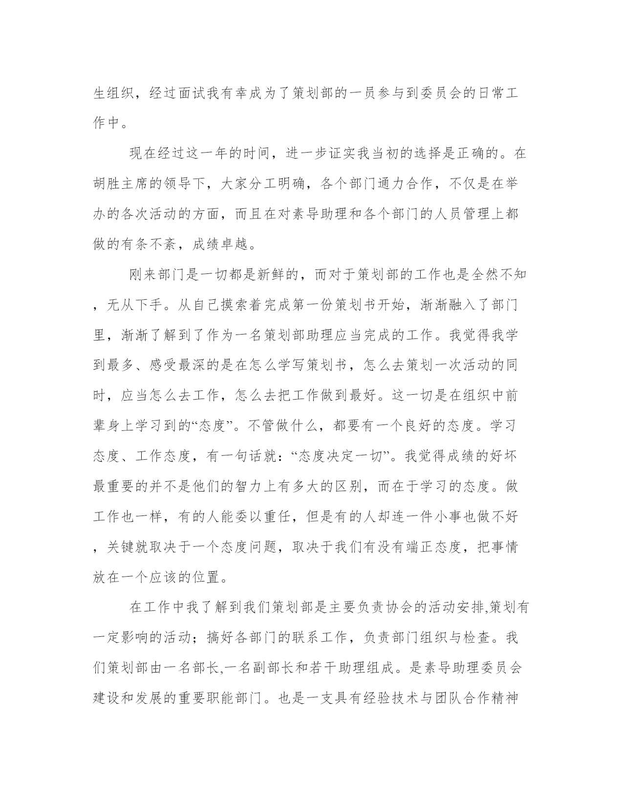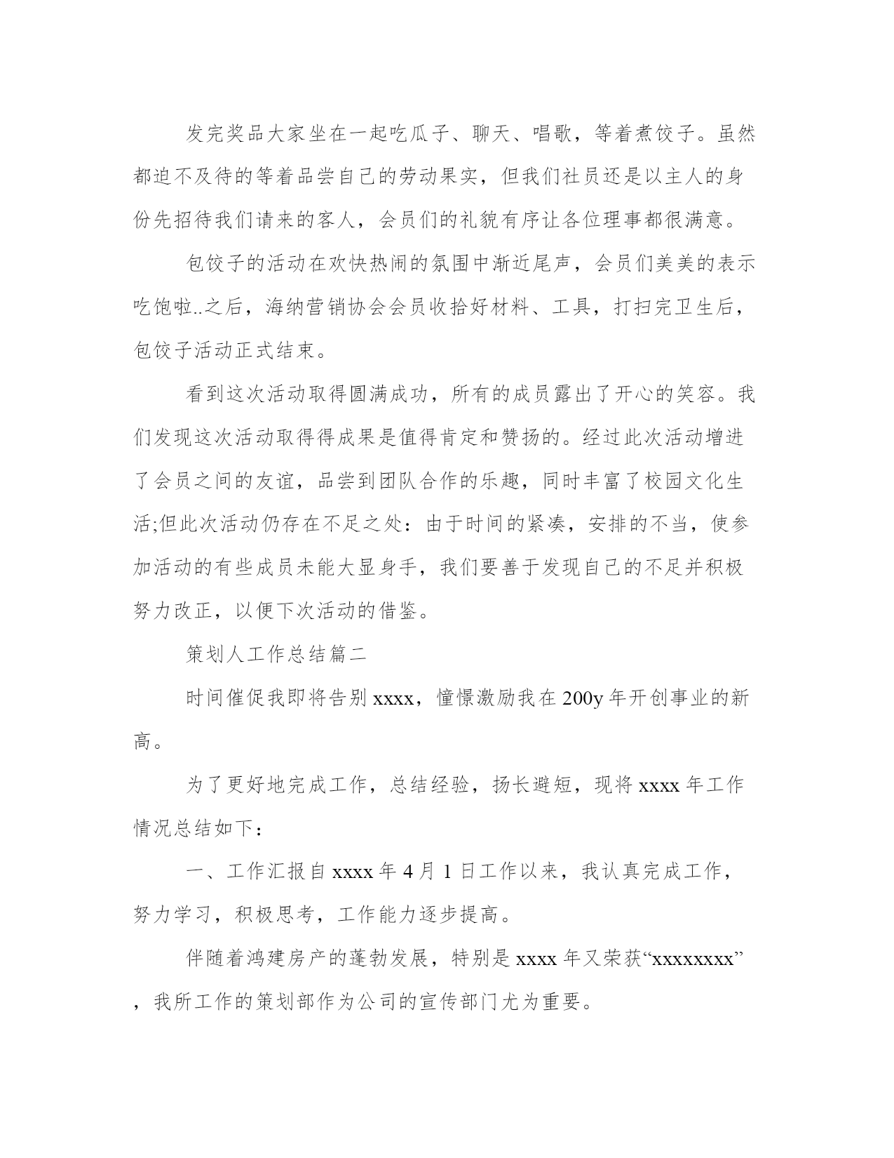 策划人工作总结策划工作总结(精选9篇)总结是写给人看的,条理不清,人们就看不下去,即使看了也不知其所以然,这样就达不到总结的目的。总结怎么写才能发挥它最大的作用呢?下面是小编为大家带来的总结书优秀范文,希望大家可以喜欢。策划人工作总结篇一12月22日是中国传统的节日---冬至,在北方有句俗语“冬至饺子,夏至面”。为此,在20xx年12月18日我社团在餐厅二楼举办“冬至日包饺子活动”。让社团成员在学校度过一个美好的冬至节。虽然我们远离家乡,但我们并不孤单,不知怎样的机缘让我们相聚在这座古城,相聚在英才。让我们在寒冷的冬至感受到浓浓的情谊。此次活动除海纳营销协会会员外还有学院各兄弟社团负责人参加,为此次活动增添光彩。活动于下午1点准时开始,活动开始后同学们迅速分组分工热火朝天地行动起来。同学们个个捋起衣袖,摩拳擦掌,跃跃欲试,调馅调料和面擀皮包饺子,在短短的二十分钟里,面粉飞扬,欢声笑语。一个个身材各异的饺子陆陆续续地被包了出来,圆的、扁的、胖的、瘦的,甚至还有“向日葵”、“糖果”......人多力量大,很快饺子皮用完了,馅儿也没了。到了看水饺赢餐具的时候啦,会员们都夸着自己的爱心便当——水饺,争夺奖品。发完奖品大家坐在一起吃瓜子、聊天、唱歌,等着煮饺子。虽然都迫不及待的等着品尝自己的劳动果实,但我们社员还是以主人的身份先招待我们请来的客人,会员们的礼貌有序让各位理事都很满意。包饺子的活动在欢快热闹的氛围中渐近尾声,会员们美美的表示吃饱啦..之后,海纳营销协会会员收拾好材料、工具,打扫完卫生后,包饺子活动正式结束。看到这次活动取得圆满成功,所有的成员露出了开心的笑容。我们发现这次活动取得得成果是值得肯定和赞扬的。经过此次活动增进了会员之间的友谊,品尝到团队合作的乐趣,同时丰富了校园文化生活;但此次活动仍存在不足之处:由于时间的紧凑,安排的不当,使参加活动的有些成员未能大显身手,我们要善于发现自己的不足并积极努力改正,以便下次活动的借鉴。策划人工作总结篇二时间催促我即将告别xxxx,憧憬激励我在200y年开创事业的新高。为了更好地完成工作,总结经验,扬长避短,现将xxxx年工作情况总结如下:一、工作汇报自xxxx年4月1日工作以来,我认真完成工作,努力学习,积极思考,工作能力逐步提高。伴随着鸿建房产的蓬勃发展,特别是xxxx年又荣获“xxxxxxxx”,我所工作的策划部作为公司的宣传部门尤为重要。对外宣传的每一篇资料,每一句话都代表着公司的形象。所有,我在实际工作中,时时严格要求自己,做到谨小慎微。此外,火车跑的快还靠车头带,由于刚参加工作,无论从业务能力,还是从思想上都存在许多的不足。在这些方面我都得到了公司领导、部门领导的正确引导和帮助,使我在工作能力提高,方向明确,态度端正。从而,对我的发展打下了良好的基矗。二、思想汇报。xxxx年是我真真正正走上工作岗位的第一年,对于工作或者说事业,每个人都有不同的认识和感受,我也一样。对我而言,我通常会从两个角度去把握自己的思想脉络。首先是心态,套用米卢的一句话“态度决定一切”。有了正确的态度,才能运用正确的方法,找到正确的方向,进而取得正确的结果。具体而言,我对工作的态度就是选择自己喜爱的,然后为自己的所爱尽自己最大的努力。我一直认为工作不该是一个任务或者负担,应该是一种乐趣,是一种享受,而只有你对它产生兴趣,彻底的爱上它,你才能充分的体会到其中的快乐。我相信我会在对这一业务的努力探索和发现中找到我工作的乐趣,也才能毫无保留的为它尽我最大的力量。可以说,懂得享受工作,你才懂得如何成功,期间来不得半点勉强。其次,是能力问题,又可以分成专业能力和基本能力。对这一问题的认识我可以用一个简单的例子说明:以一只骆驼来讲,专业能力决定了它能够在沙漠的环境里生存,而基本能力,包括适应度、坚忍度、天性的警觉等,决定了它能在沙漠的环境里生存多久。具体到人,专业能力决定了你适合于某种工作,基本能力,包括自信力,协作能力,承担责任的能力,冒险精神,以及发展潜力等,将直接决定工作的生命力。一个在事业上成功的人,必是两种能力能够很好地协调发展和运作的人。xxxx年,我将以崭新的精神状态投入到工作当中,努力学习,提高工作、业务能力。积极响应公司加强管理的措施,遵守公司的规章制度。三、主要活动及成绩。1、xxxx年4月,准备并参加上海房展会。主要工作为宣传资料准备、现场资料的收集与存档。2、xxxx年5月,准备企业内刊xxx的资料收集及酒店公寓资料的收集。3、xxxx年6月,返校一个月,考察xxx楼市。如:星海国宝、世纪经典、经典生活、壹品星海、宏孚商旅酒店(产权式)、晨熙假日酒店、名仕国际(loft公寓)等。4、xxxx年7月,第二期