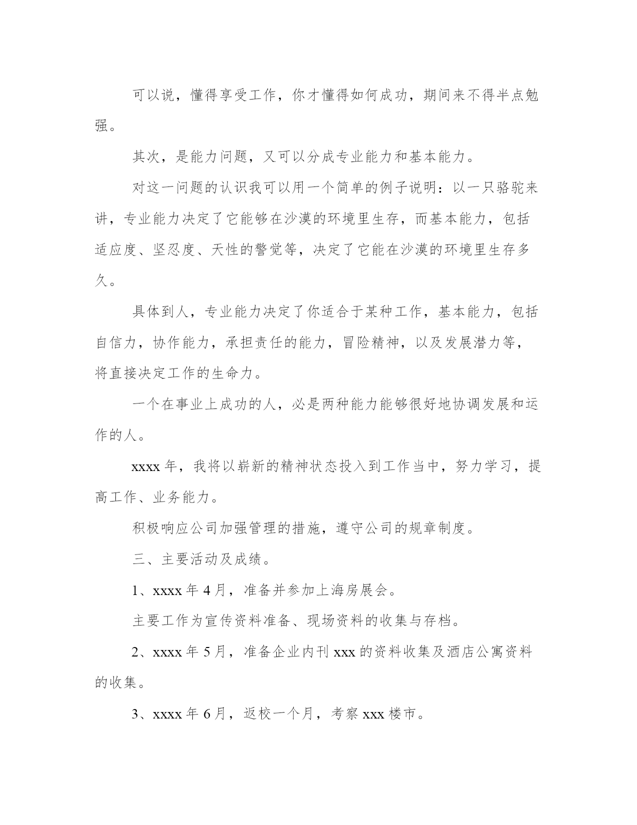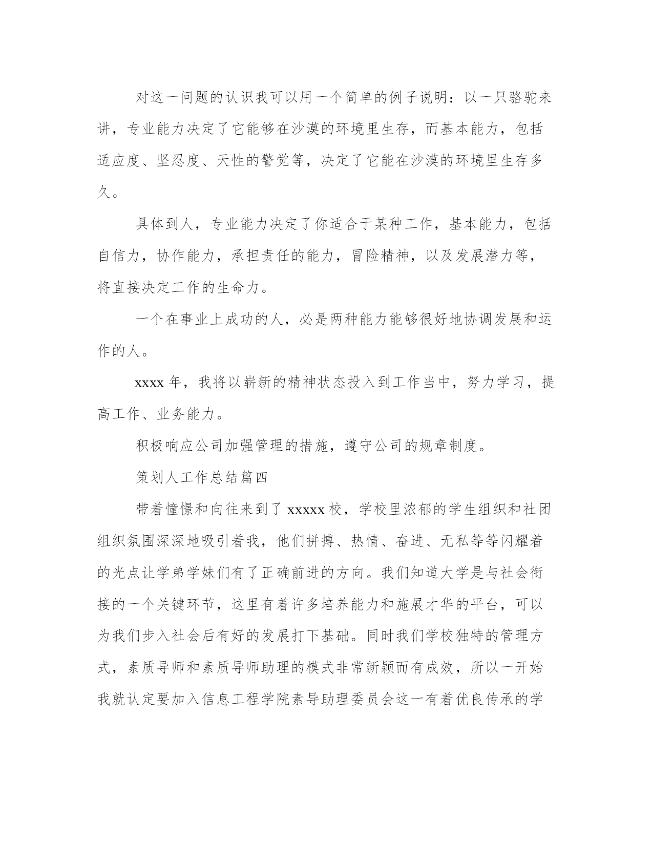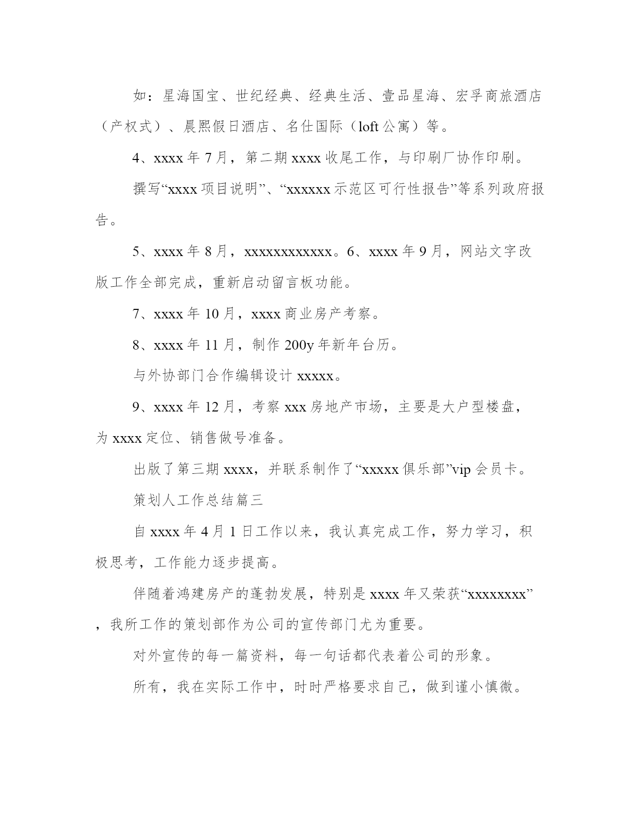 策划人工作总结策划工作总结(精选9篇)总结是写给人看的,条理不清,人们就看不下去,即使看了也不知其所以然,这样就达不到总结的目的。总结怎么写才能发挥它最大的作用呢?下面是小编为大家带来的总结书优秀范文,希望大家可以喜欢。策划人工作总结篇一12月22日是中国传统的节日---冬至,在北方有句俗语“冬至饺子,夏至面”。为此,在20xx年12月18日我社团在餐厅二楼举办“冬至日包饺子活动”。让社团成员在学校度过一个美好的冬至节。虽然我们远离家乡,但我们并不孤单,不知怎样的机缘让我们相聚在这座古城,相聚在英才。让我们在寒冷的冬至感受到浓浓的情谊。此次活动除海纳营销协会会员外还有学院各兄弟社团负责人参加,为此次活动增添光彩。活动于下午1点准时开始,活动开始后同学们迅速分组分工热火朝天地行动起来。同学们个个捋起衣袖,摩拳擦掌,跃跃欲试,调馅调料和面擀皮包饺子,在短短的二十分钟里,面粉飞扬,欢声笑语。一个个身材各异的饺子陆陆续续地被包了出来,圆的、扁的、胖的、瘦的,甚至还有“向日葵”、“糖果”......人多力量大,很快饺子皮用完了,馅儿也没了。到了看水饺赢餐具的时候啦,会员们都夸着自己的爱心便当——水饺,争夺奖品。发完奖品大家坐在一起吃瓜子、聊天、唱歌,等着煮饺子。虽然都迫不及待的等着品尝自己的劳动果实,但我们社员还是以主人的身份先招待我们请来的客人,会员们的礼貌有序让各位理事都很满意。包饺子的活动在欢快热闹的氛围中渐近尾声,会员们美美的表示吃饱啦..之后,海纳营销协会会员收拾好材料、工具,打扫完卫生后,包饺子活动正式结束。看到这次活动取得圆满成功,所有的成员露出了开心的笑容。我们发现这次活动取得得成果是值得肯定和赞扬的。经过此次活动增进了会员之间的友谊,品尝到团队合作的乐趣,同时丰富了校园文化生活;但此次活动仍存在不足之处:由于时间的紧凑,安排的不当,使参加活动的有些成员未能大显身手,我们要善于发现自己的不足并积极努力改正,以便下次活动的借鉴。策划人工作总结篇二时间催促我即将告别xxxx,憧憬激励我在200y年开创事业的新高。为了更好地完成工作,总结经验,扬长避短,现将xxxx年工作情况总结如下:一、工作汇报自xxxx年4月1日工作以来,我认真完成工作,努力学习,积极思考,工作能力逐步提高。伴随着鸿建房产的蓬勃发展,特别是xxxx年又荣获“xxxxxxxx”,我所工作的策划部作为公司的宣传部门尤为重要。对外宣传的每一篇资料,每一句话都代表着公司的形象。所有,我在实际工作中,时时严格要求自己,做到谨小慎微。此外,火车跑的快还靠车头带,由于刚参加工作,无论从业务能力,还是从思想上都存在许多的不足。在这些方面我都得到了公司领导、部门领导的正确引导和帮助,使我在工作能力提高,方向明确,态度端正。从而,对我的发展打下了良好的基矗。二、思想汇报。xxxx年是我真真正正走上工作岗位的第一年,对于工作或者说事业,每个人都有不同的认识和感受,我也一样。对我而言,我通常会从两个角度去把握自己的思想脉络。首先是心态,套用米卢的一句话“态度决定一切”。有了正确的态度,才能运用正确的方法,找到正确的方向,进而取得正确的结果。具体而言,我对工作的态度就是选择自己喜爱的,然后为自己的所爱尽自己最大的努力。我一直认为工作不该是一个任务或者负担,应该是一种乐趣,是一种享受,而只有你对它产生兴趣,彻底的爱上它,你才能充分的体会到其中的快乐。我相信我会在对这一业务的努力探索和发现中找到我工作的乐趣,也才能毫无保留的为它尽我最大的力量。可以说,懂得享受工作,你才懂得如何成功,期间来不得半点勉强。其次,是能力问题,又可以分成专业能力和基本能力。对这一问题的认识我可以用一个简单的例子说明:以一只骆驼来讲,专业能力决定了它能够在沙漠的环境里生存,而基本能力,包括适应度、坚忍度、天性的警觉等,决定了它能在沙漠的环境里生存多久。具体到人,专业能力决定了你适合于某种工作,基本能力,包括自信力,协作能力,承担责任的能力,冒险精神,以及发展潜力等,将直接决定工作的生命力。一个在事业上成功的人,必是两种能力能够很好地协调发展和运作的人。xxxx年,我将以崭新的精神状态投入到工作当中,努力学习,提高工作、业务能力。积极响应公司加强管理的措施,遵守公司的规章制度。三、主要活动及成绩。1、xxxx年4月,准备并参加上海房展会。主要工作为宣传资料准备、现场资料的收集与存档。2、xxxx年5月,准备企业内刊xxx的资料收集及酒店公寓资料的收集。3、xxxx年6月,返校一个月,考察xxx楼市。如:星海国宝、世纪经典、经典生活、壹品星海、宏孚商旅酒店(产权式)、晨熙假日酒店、名仕国际(loft公寓)等。4、xxxx年7月,第二期