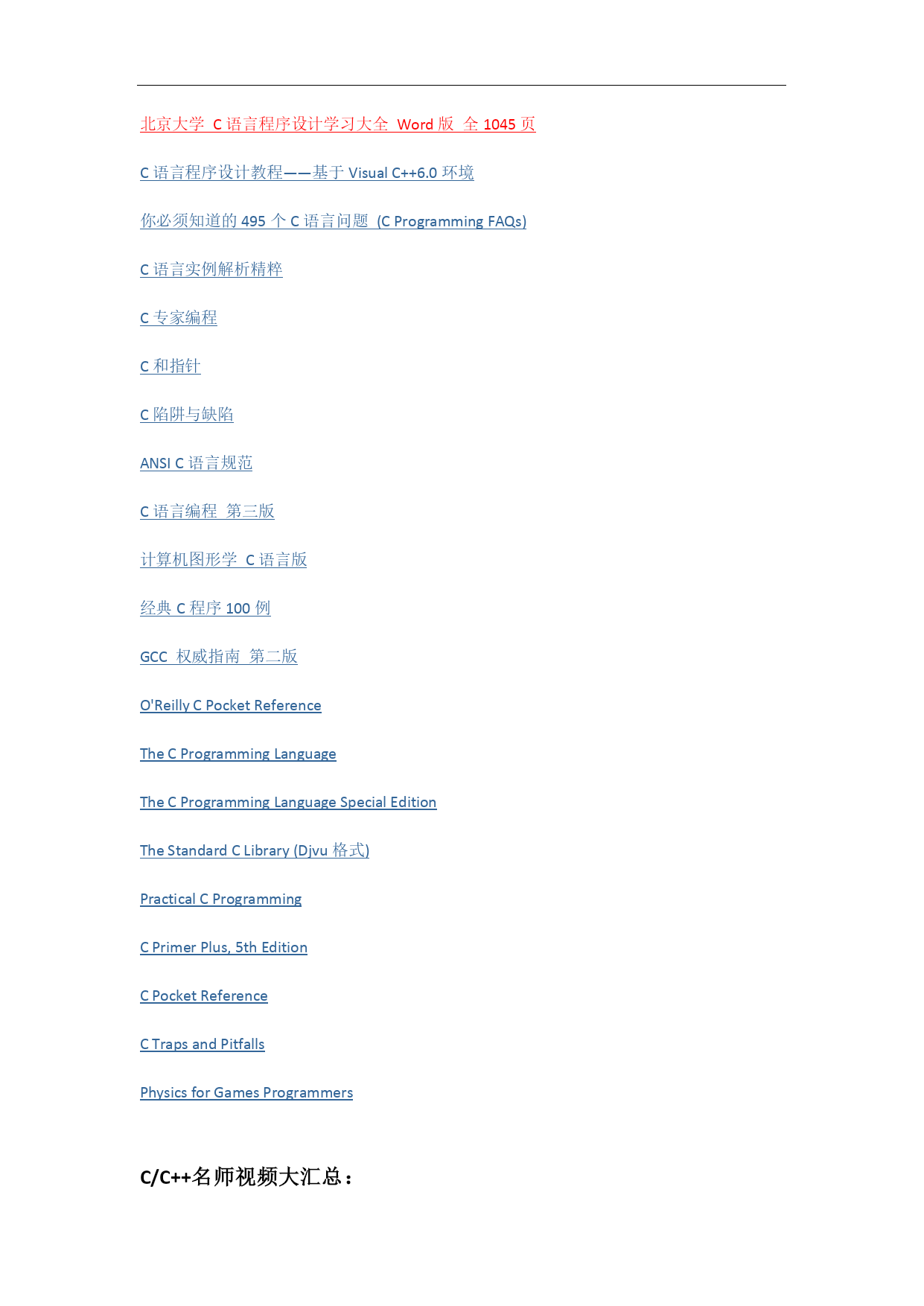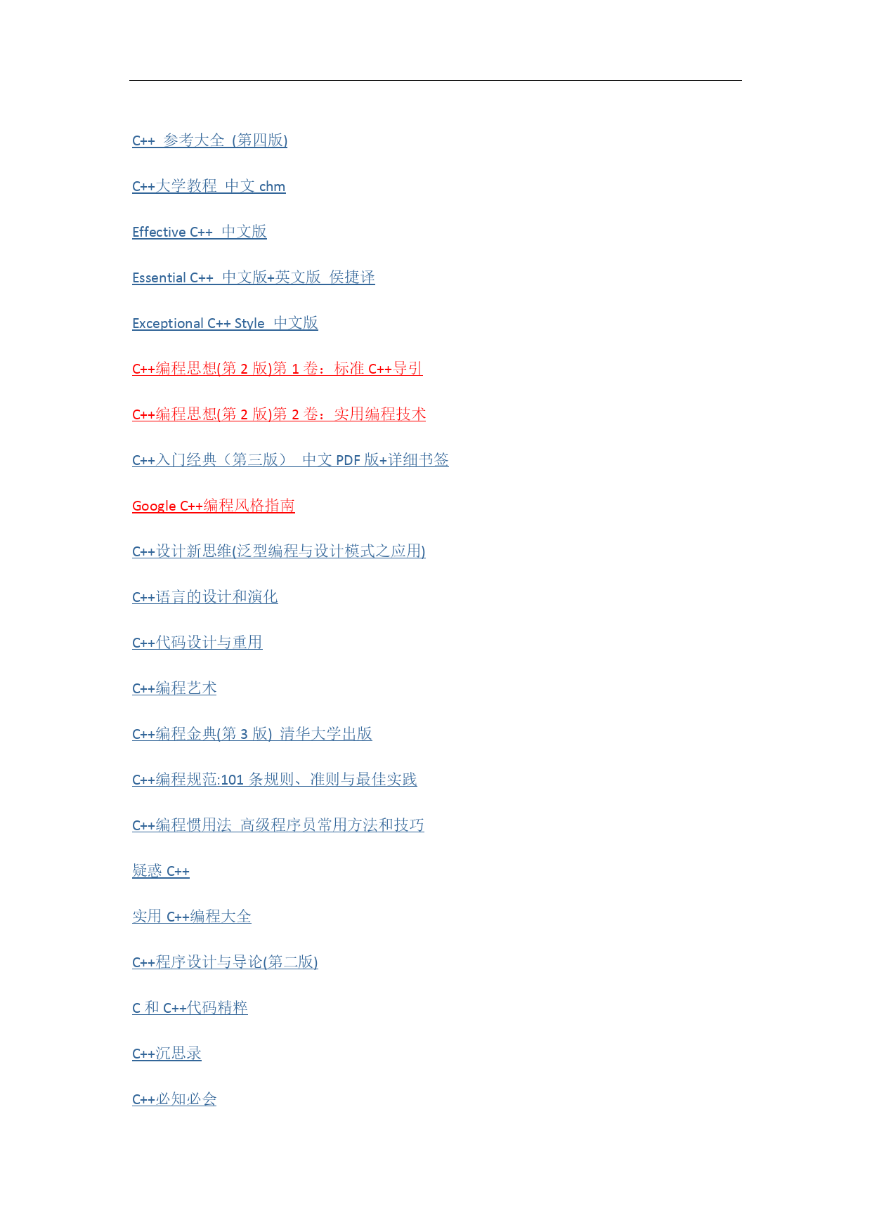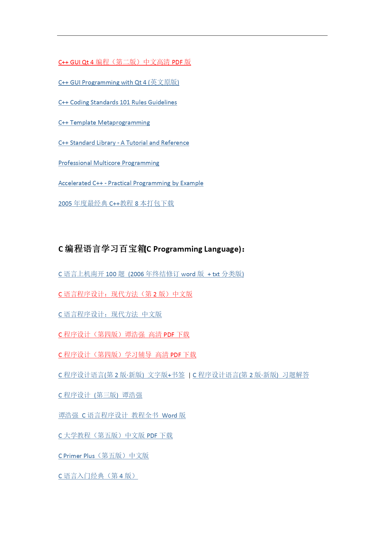 史无前例的网络最全最强C/C++资料索引:HYPERLINK"http://club.topsage.com/thread-361458-1-1.html"\t"_blank"C/C++编程语言学习资料尽收眼底电子书+视频教程HYPERLINK"http://club.topsage.com/thread-361504-1-1.html"\t"_blank"VC++/MFC(VC6)开发技术精品学习资料下载汇总HYPERLINK"http://club.topsage.com/thread-2320565-1-1.html"\t"_blank"VisualC++/MFC数字图像处理学习参考资料下载大全HYPERLINK"http://club.topsage.com/thread-2317042-1-1.html"\t"_blank"C++Builder开发技术相关精品资料下载汇总HYPERLINK"http://club.topsage.com/thread-2227714-1-1.html"\t"_blank"C/C++开发工具/集成开发环境下载汇总HYPERLINK"http://club.topsage.com/thread-2317053-1-1.html"\t"_blank"VC/MFC开发必备VisualC++、VisualStudio、MSDN等下载汇总C++编程语言学习百宝箱(C++ProgrammingLanguage):HYPERLINK"http://club.topsage.com/thread-2261337-1-1.html"\t"_blank"C++HowtoProgram,7/e(C++大学教程第7版)英文原版全彩页HYPERLINK"http://club.topsage.com/thread-2346668-1-1.html"\t"_blank"C++大学教程(第五版)中文版高清PDF下载HYPERLINK"http://club.topsage.com/thread-2170548-1-1.html"\t"_blank"C++大学教程第五版(C++HowtoProgram,5/e)英文版HYPERLINK"http://club.topsage.com/thread-468524-1-1.html"\t"_blank"C++程序设计语言(特别版)中文版HYPERLINK"http://club.topsage.com/thread-2261316-1-1.html"\t"_blank"C++程序设计原理与实践(中文高清版)|HYPERLINK"http://club.topsage.com/thread-2234080-1-1.html"\t"_blank"Programming:PrinciplesandPracticeUsingC++(英文原版)HYPERLINK"http://club.topsage.com/thread-175018-1-1.html"\t"_blank"TheC++ProgrammingLanguage,3rdEditionHYPERLINK"http://club.topsage.com/thread-177763-1-1.html"\t"_blank"C++Primer第四版中文版HYPERLINK"http://club.topsage.com/thread-533186-1-1.html"\t"_blank"C++Primer第四版中英文对照文字版HYPERLINK"http://club.topsage.com/thread-2224208-1-1.html"\t"_blank"C++Primer第三版中文版HYPERLINK"http://club.topsage.com/thread-2278817-1-1.html"\t"_blank"C++Cookbook中文版高清PDF下载|HYPERLINK"http://club.topsage.com/thread-2262664-1-1.html"\t"_blank"O'ReillyC++CookbookHYPERLINK"http://club.topsage.com/thread-2281575-1-1.html"\t"_blank"C++PrimerPlus(第五版)中文版+习题解答+代码|HYPERLINK"http://club.topsage.com/thread-252671-1-1.html"\t"_blank"英文原版HYPERL
