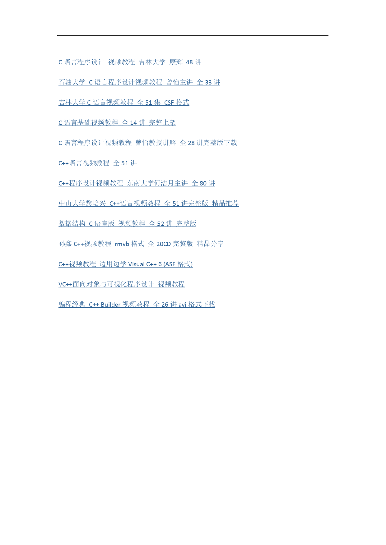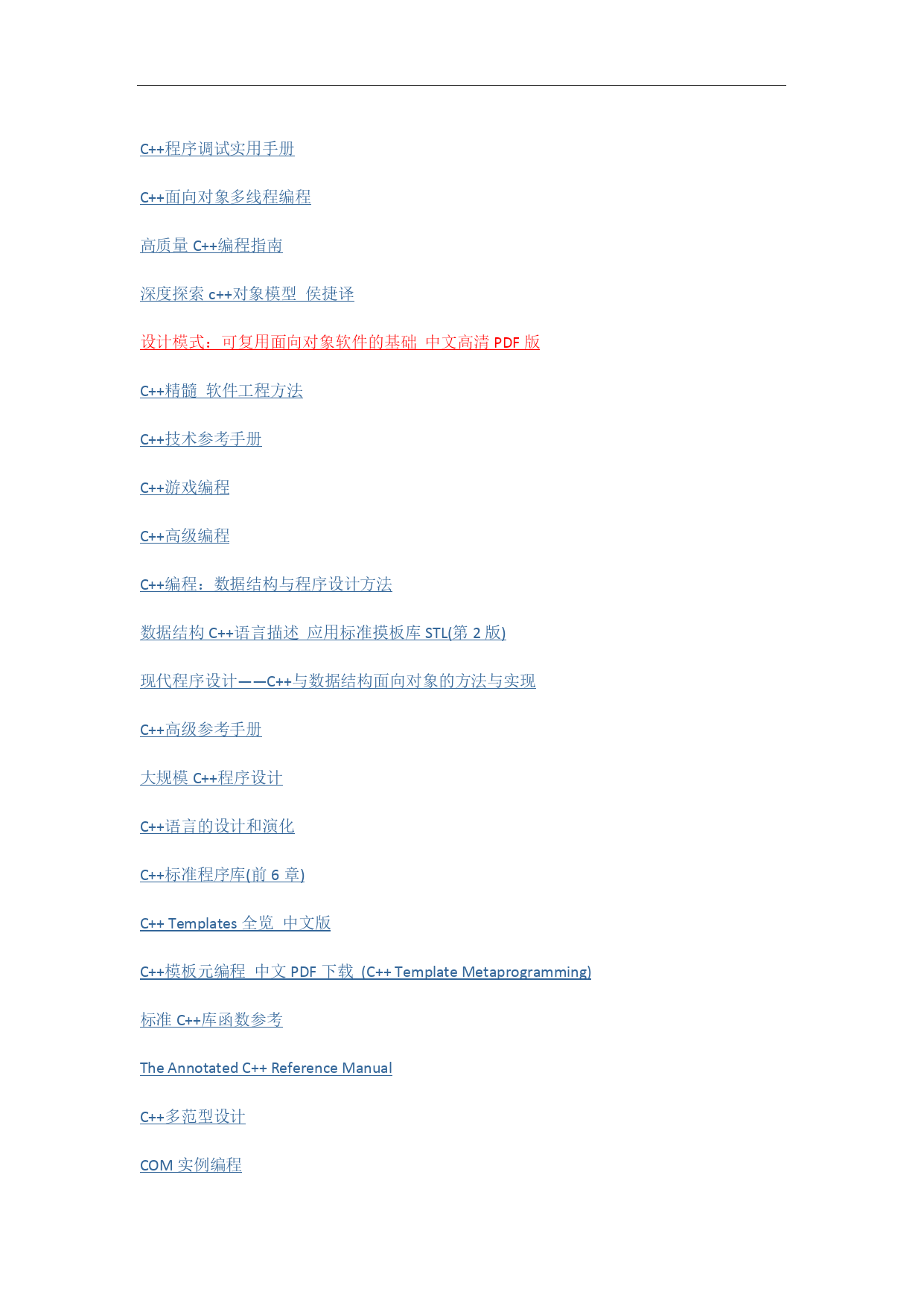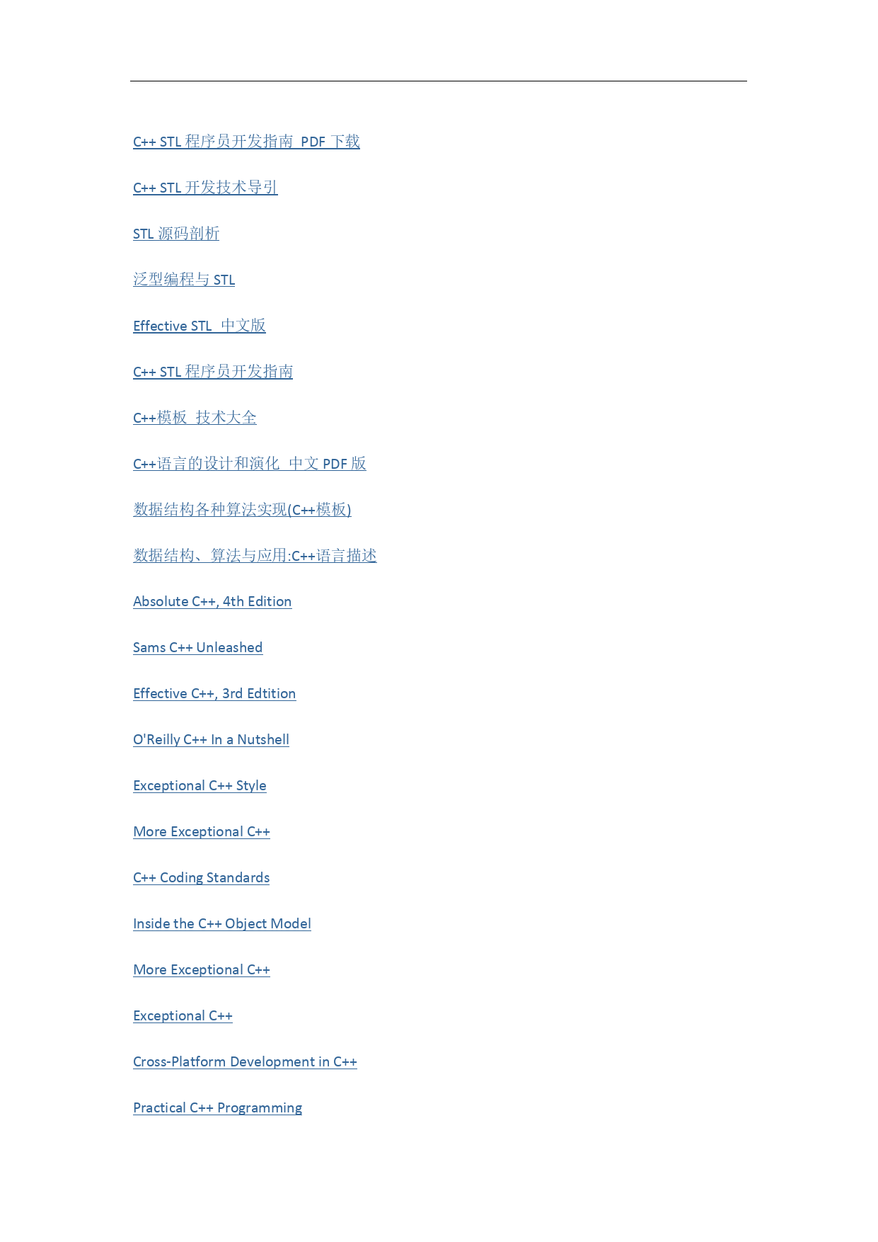 史无前例的网络最全最强C/C++资料索引:HYPERLINK"http://club.topsage.com/thread-361458-1-1.html"\t"_blank"C/C++编程语言学习资料尽收眼底电子书+视频教程HYPERLINK"http://club.topsage.com/thread-361504-1-1.html"\t"_blank"VC++/MFC(VC6)开发技术精品学习资料下载汇总HYPERLINK"http://club.topsage.com/thread-2320565-1-1.html"\t"_blank"VisualC++/MFC数字图像处理学习参考资料下载大全HYPERLINK"http://club.topsage.com/thread-2317042-1-1.html"\t"_blank"C++Builder开发技术相关精品资料下载汇总HYPERLINK"http://club.topsage.com/thread-2227714-1-1.html"\t"_blank"C/C++开发工具/集成开发环境下载汇总HYPERLINK"http://club.topsage.com/thread-2317053-1-1.html"\t"_blank"VC/MFC开发必备VisualC++、VisualStudio、MSDN等下载汇总C++编程语言学习百宝箱(C++ProgrammingLanguage):HYPERLINK"http://club.topsage.com/thread-2261337-1-1.html"\t"_blank"C++HowtoProgram,7/e(C++大学教程第7版)英文原版全彩页HYPERLINK"http://club.topsage.com/thread-2346668-1-1.html"\t"_blank"C++大学教程(第五版)中文版高清PDF下载HYPERLINK"http://club.topsage.com/thread-2170548-1-1.html"\t"_blank"C++大学教程第五版(C++HowtoProgram,5/e)英文版HYPERLINK"http://club.topsage.com/thread-468524-1-1.html"\t"_blank"C++程序设计语言(特别版)中文版HYPERLINK"http://club.topsage.com/thread-2261316-1-1.html"\t"_blank"C++程序设计原理与实践(中文高清版)|HYPERLINK"http://club.topsage.com/thread-2234080-1-1.html"\t"_blank"Programming:PrinciplesandPracticeUsingC++(英文原版)HYPERLINK"http://club.topsage.com/thread-175018-1-1.html"\t"_blank"TheC++ProgrammingLanguage,3rdEditionHYPERLINK"http://club.topsage.com/thread-177763-1-1.html"\t"_blank"C++Primer第四版中文版HYPERLINK"http://club.topsage.com/thread-533186-1-1.html"\t"_blank"C++Primer第四版中英文对照文字版HYPERLINK"http://club.topsage.com/thread-2224208-1-1.html"\t"_blank"C++Primer第三版中文版HYPERLINK"http://club.topsage.com/thread-2278817-1-1.html"\t"_blank"C++Cookbook中文版高清PDF下载|HYPERLINK"http://club.topsage.com/thread-2262664-1-1.html"\t"_blank"O'ReillyC++CookbookHYPERLINK"http://club.topsage.com/thread-2281575-1-1.html"\t"_blank"C++PrimerPlus(第五版)中文版+习题解答+代码|HYPERLINK"http://club.topsage.com/thread-252671-1-1.html"\t"_blank"英文原版HYPERL