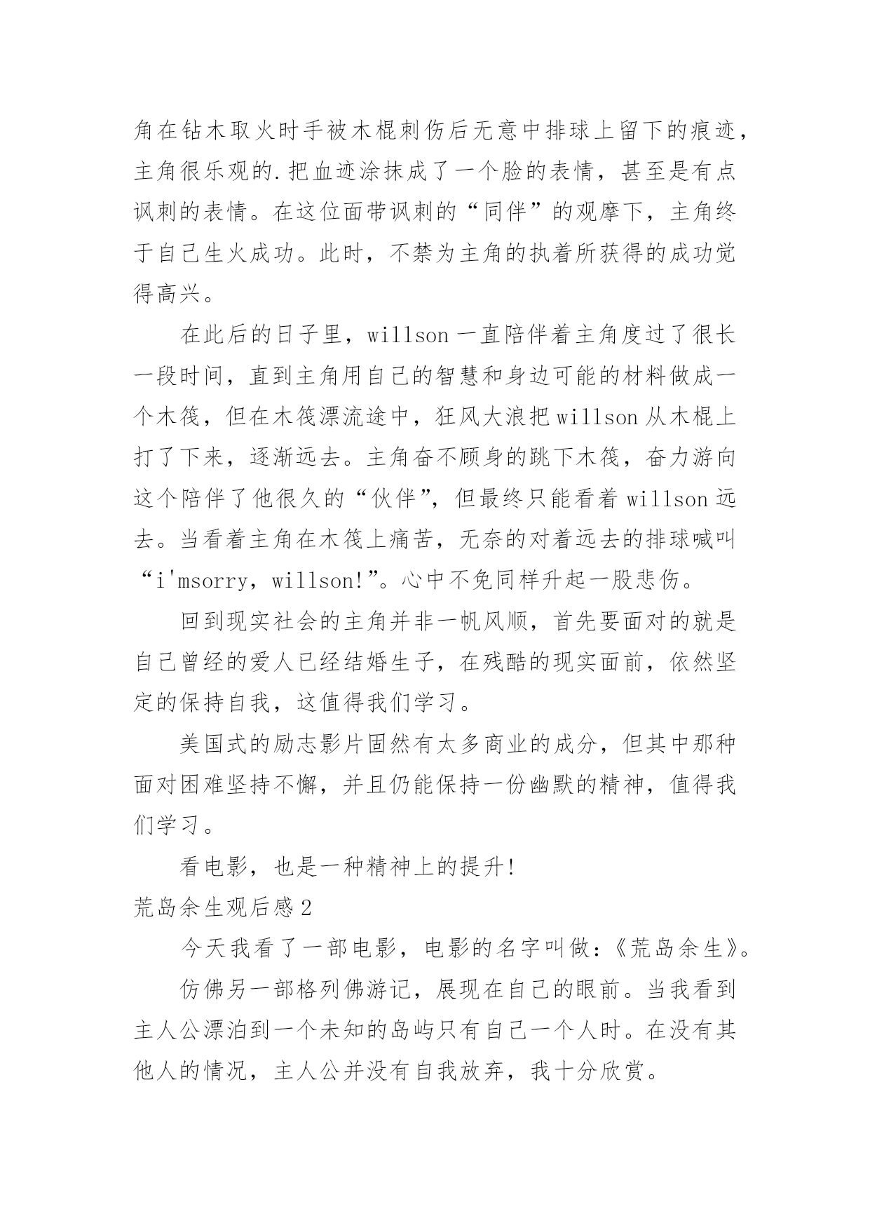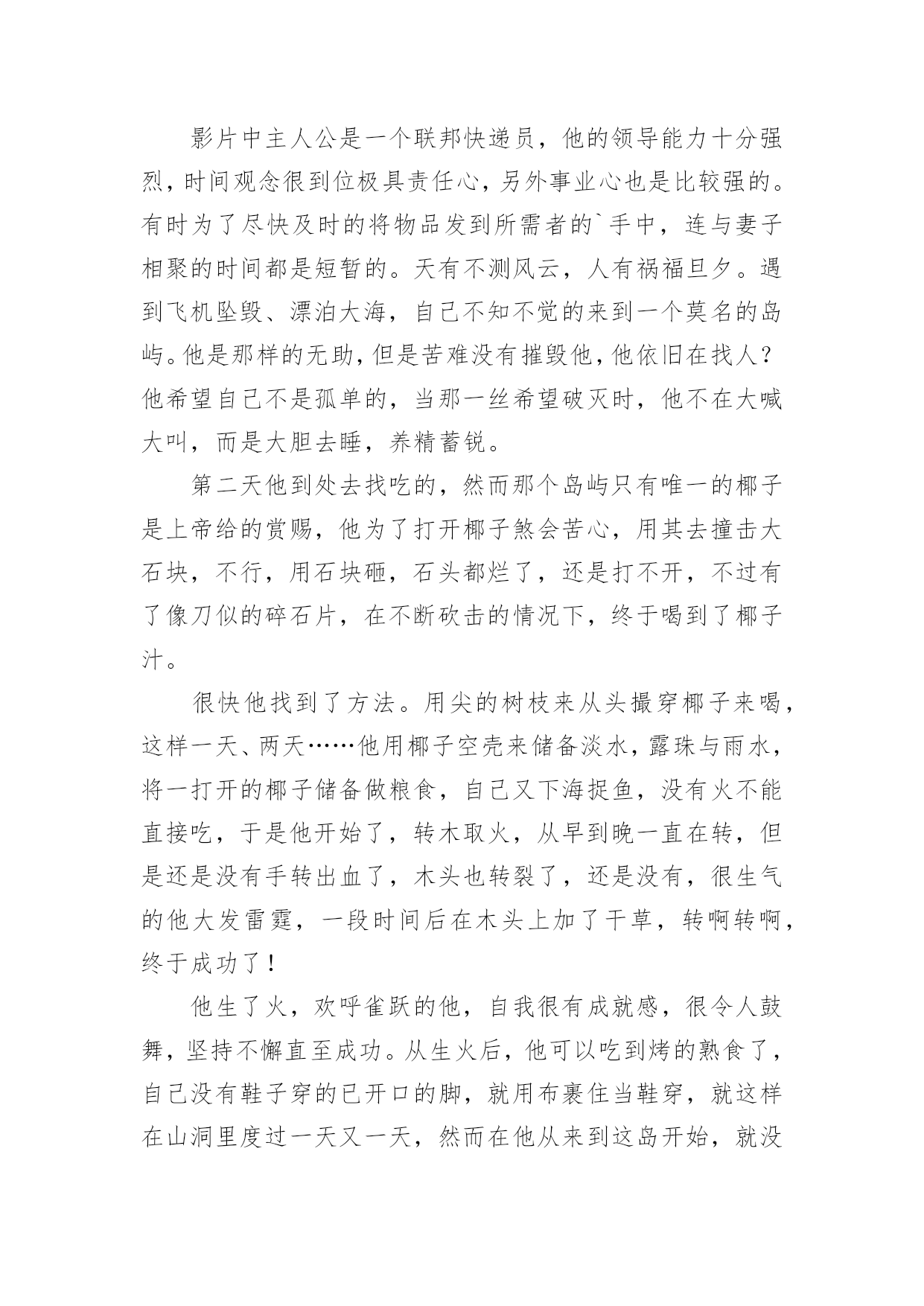 荒岛余生观后感荒岛余生观后感当我们观看最新的高水平影片时,能够给我们不少启示,为此就要认真思考观后感如何写了。千万不能认为观后感随便应付就可以,下面是小编为大家收集的荒岛余生观后感,希望对大家有所帮助。荒岛余生观后感1虽然从初中毕业之后就基本没写过观后感,但是遇到好电影还是要值得感悟一番。之前也有类似的片子,、,外加本次的,都是典型的美国式的励志影片。都是主人公因为意外的原因,被滞留在一个陌生的场所,被迫去适应这样的地方,生存下来,直至最后离开。从某个角度上来说,和很像,而且主演都是tom·hanks,不过里的飞机场可比中的无人居住的小岛好多了。主人公作为一名联邦快递的职员,因为飞机失事而漂流到了无人小岛上,在无人的岛上,独自想办法维持自己的生存,坚持不懈,利用身边可能利用的一切事物来帮助自己活下去,因为他心中有着一个信念,自己一定要回去,要回到自己心爱的人的身边。当自己气馁时,就用那个willson品牌的排球做了一个自己的伙伴-willson,willson的脸是主角在钻木取火时手被木棍刺伤后无意中排球上留下的痕迹,主角很乐观的.把血迹涂抹成了一个脸的表情,甚至是有点讽刺的表情。在这位面带讽刺的“同伴”的观摩下,主角终于自己生火成功。此时,不禁为主角的执着所获得的成功觉得高兴。在此后的日子里,willson一直陪伴着主角度过了很长一段时间,直到主角用自己的智慧和身边可能的材料做成一个木筏,但在木筏漂流途中,狂风大浪把willson从木棍上打了下来,逐渐远去。主角奋不顾身的跳下木筏,奋力游向这个陪伴了他很久的“伙伴”,但最终只能看着willson远去。当看着主角在木筏上痛苦,无奈的对着远去的排球喊叫“i'msorry,willson!”。心中不免同样升起一股悲伤。回到现实社会的主角并非一帆风顺,首先要面对的就是自己曾经的爱人已经结婚生子,在残酷的现实面前,依然坚定的保持自我,这值得我们学习。美国式的励志影片固然有太多商业的成分,但其中那种面对困难坚持不懈,并且仍能保持一份幽默的精神,值得我们学习。看电影,也是一种精神上的提升!荒岛余生观后感2今天我看了一部电影,电影的名字叫做:《荒岛余生》。仿佛另一部格列佛游记,展现在自己的眼前。当我看到主人公漂泊到一个未知的岛屿只有自己一个人时。在没有其他人的情况,主人公并没有自我放弃,我十分欣赏。影片中主人公是一个联邦快递员,他的领导能力十分强烈,时间观念很到位极具责任心,另外事业心也是比较强的。有时为了尽快及时的将物品发到所需者的`手中,连与妻子相聚的时间都是短暂的。天有不测风云,人有祸福旦夕。遇到飞机坠毁、漂泊大海,自己不知不觉的来到一个莫名的岛屿。他是那样的无助,但是苦难没有摧毁他,他依旧在找人?他希望自己不是孤单的,当那一丝希望破灭时,他不在大喊大叫,而是大胆去睡,养精蓄锐。第二天他到处去找吃的,然而那个岛屿只有唯一的椰子是上帝给的赏赐,他为了打开椰子煞会苦心,用其去撞击大石块,不行,用石块砸,石头都烂了,还是打不开,不过有了像刀似的碎石片,在不断砍击的情况下,终于喝到了椰子汁。很快他找到了方法。用尖的树枝来从头撮穿椰子来喝,这样一天、两天……他用椰子空壳来储备淡水,露珠与雨水,将一打开的椰子储备做粮食,自己又下海捉鱼,没有火不能直接吃,于是他开始了,转木取火,从早到晚一直在转,但是还是没有手转出血了,木头也转裂了,还是没有,很生气的他大发雷霆,一段时间后在木头上加了干草,转啊转啊,终于成功了!他生了火,欢呼雀跃的他,自我很有成就感,很令人鼓舞,坚持不懈直至成功。从生火后,他可以吃到烤的熟食了,自己没有鞋子穿的已开口的脚,就用布裹住当鞋穿,就这样在山洞里度过一天又一天,然而在他从来到这岛开始,就没有放弃自己的求生欲望,因为自己的爱人在人世间等着他。他的责任心,勇气、坚强与耐压力量是值得我们学习与领悟的。他的放开与大度也是没有经历死亡的人难以达到的,总之我很欣赏这个主人公。这一个故事告诉了我们,不管做什么事情都不能放弃,要坚持下去,这样,这一件事情才会成功!