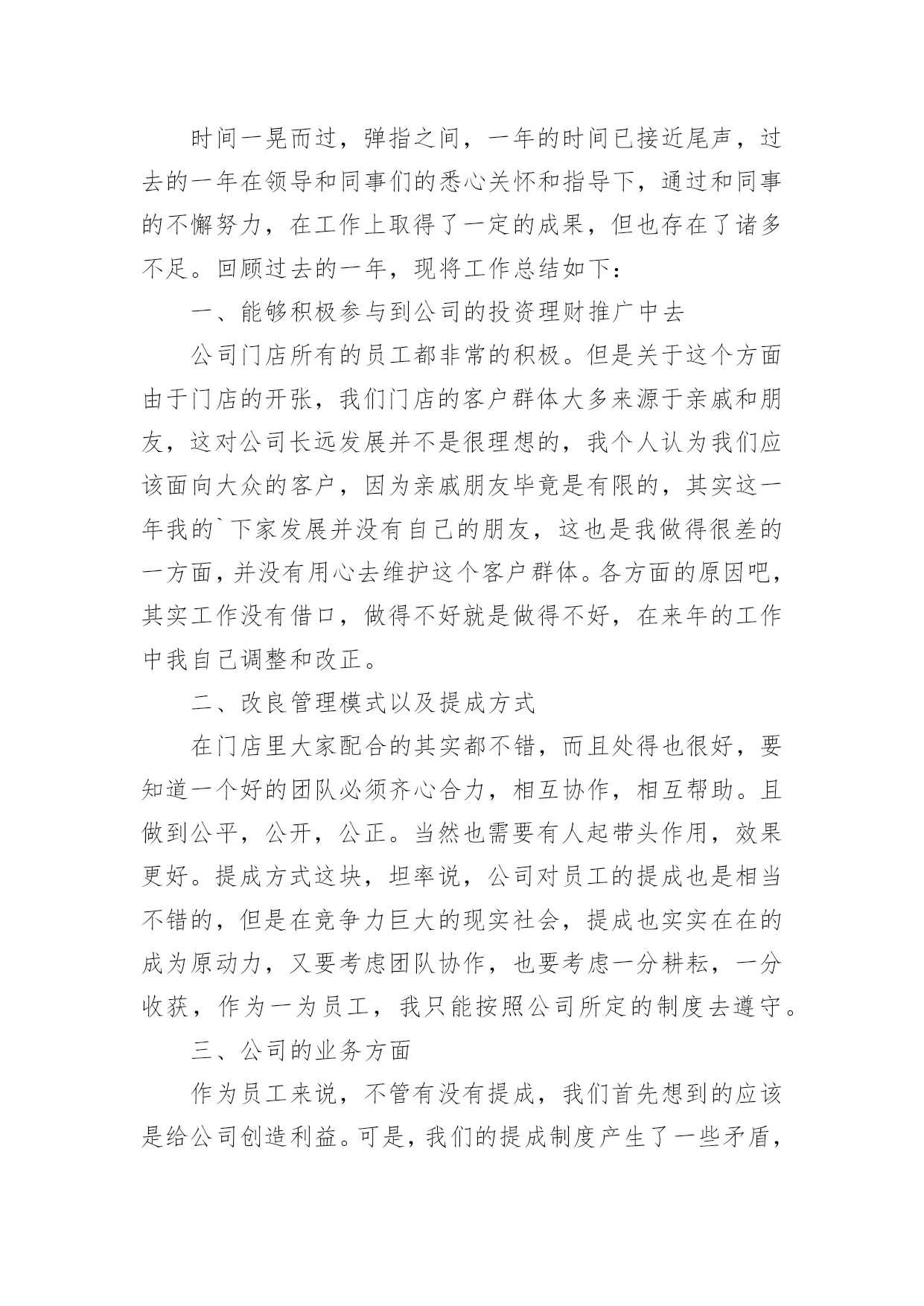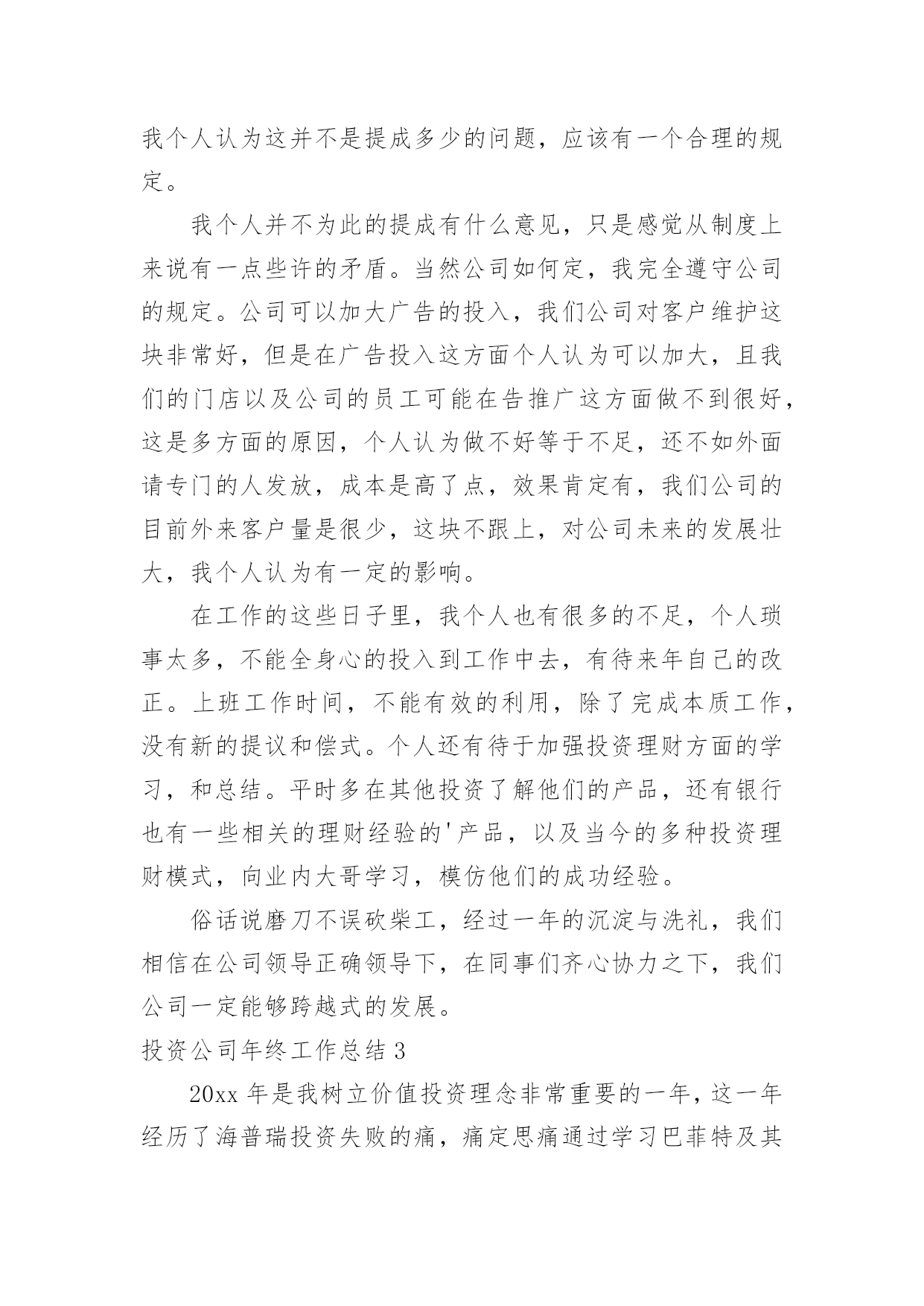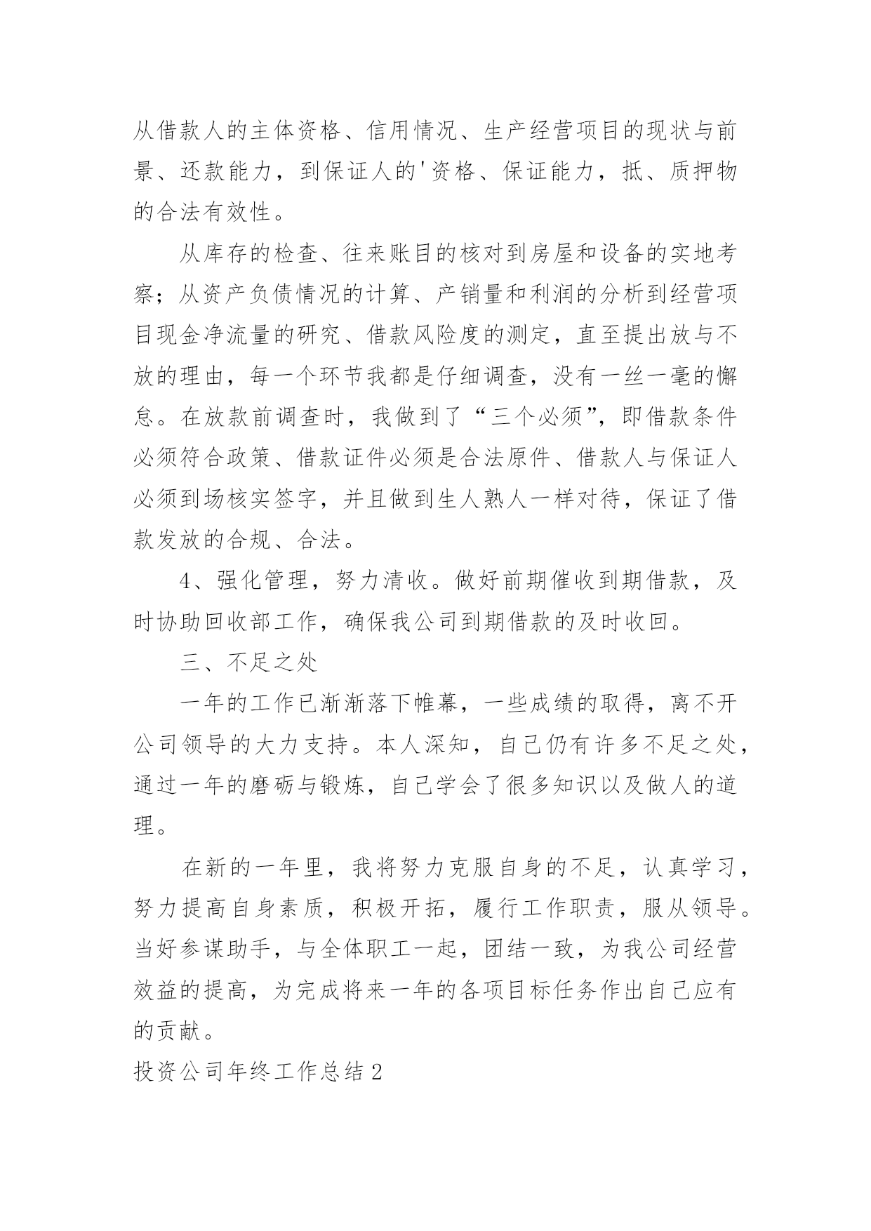 投资公司年终工作总结投资公司年终工作总结总结是对某一阶段的工作、学习或思想中的经验或情况进行分析研究的书面材料,它能够使头脑更加清醒,目标更加明确,为此我们要做好回顾,写好总结。总结怎么写才是正确的呢?下面是小编精心整理的投资公司年终工作总结,欢迎大家分享。投资公司年终工作总结1伴随着20xx年尾声的悄悄临近,我走上信贷员岗位一年多了,从刚开始对业务技能的不自信,到现在可以独自分析授信业务,真的是受益匪浅。回顾这一年的工作,在公司领导的关心及全体同事的帮助下,我认真学习业务知识和技能,积极主动地履行工作职责,及时总结工作中的不足,努力提高业务素质,较好地完成了个人的工作任务,在思想觉悟、业务素质、操作技能、优质服务方面都有了一定的提高。现将这一年的经历总结如下:一、人无论从事什么职业,都需要不断学习面对信贷员这个岗位,开始我还有些不自信。实地了解客户的基本情况、经营信息,调查掌握客户的居间借款用途、还款意愿,分析客户的还款能力等等,这些对于我来说,有很大难度。通过和领导沟通及自己思考总结。让我对放款业务工作有了新的认识,也增加了自己的信心。我深深感觉到只从实践中学习是不够的,还需要理论知识的补充,于是我积极利用工余时间加强金融理论及业务知识的学习,各种学习资料能够融会贯通,学以致用,业余时间,翻看金融书籍,参考成功信贷案例。不断充实自己。通过实践中的经验积累、专业化的培训和自学,我渐渐地掌握了贷款业务和操作流程。业务工作能力、综合分析能力、协调办事能力、文字语言表达能力等方面,都有了很大的提高。二、认真遵守规章制度,积极主动地开展业务1、团结守纪,为提高经营效益尽心尽力。一年来,我与同事们团结一致,服从领导的安排,积极主动地做好本职工作。2、强化意识,积极主动。慢慢接触居间借款工作后,我不断强化自己贷款营销的意识,破除“惧贷”的思想,寻求效益好的客户,在保证信贷资产质量的前提下,主动做好客户的市场调查,对于那些有市场、讲信用的个体工商户给予借款支持。对于以恐吓手段申请借款的,免谈,一律不办。原因很简单,他不会为贷不到款而使用卑劣手段。但如果你给他放了借款,到期收不回起诉,他在压力下可能会做出意向不到的事情。现在拒绝申请借款面临的风险,远小于以后还不上面临的风险。3、坚持借款原则,做好借款调查。我深知:信贷资产的质量事关我公司经营发展大计,责任重于泰山,丝毫马虎不得。一年来,坚持对每一笔借款都一丝不苟地认真调查,从借款人的主体资格、信用情况、生产经营项目的现状与前景、还款能力,到保证人的'资格、保证能力,抵、质押物的合法有效性。从库存的检查、往来账目的核对到房屋和设备的实地考察;从资产负债情况的计算、产销量和利润的分析到经营项目现金净流量的研究、借款风险度的测定,直至提出放与不放的理由,每一个环节我都是仔细调查,没有一丝一毫的懈怠。在放款前调查时,我做到了“三个必须”,即借款条件必须符合政策、借款证件必须是合法原件、借款人与保证人必须到场核实签字,并且做到生人熟人一样对待,保证了借款发放的合规、合法。4、强化管理,努力清收。做好前期催收到期借款,及时协助回收部工作,确保我公司到期借款的及时收回。三、不足之处一年的工作已渐渐落下帷幕,一些成绩的取得,离不开公司领导的大力支持。本人深知,自己仍有许多不足之处,通过一年的磨砺与锻炼,自己学会了很多知识以及做人的道理。在新的一年里,我将努力克服自身的不足,认真学习,努力提高自身素质,积极开拓,履行工作职责,服从领导。当好参谋助手,与全体职工一起,团结一致,为我公司经营效益的提高,为完成将来一年的各项目标任务作出自己应有的贡献。投资公司年终工作总结2时间一晃而过,弹指之间,一年的时间已接近尾声,过去的一年在领导和同事们的悉心关怀和指导下,通过和同事的不懈努力,在工作上取得了一定的成果,但也存在了诸多不足。回顾过去的一年,现将工作总结如下:一、能够积极参与到公司的投资理财推广中去公司门店所有的员工都非常的积极。但是关于这个方面由于门店的开张,我们门店的客户群体大多来源于亲戚和朋友,这对公司长远发展并不是很理想的,我个人认为我们应该面向大众的客户,因为亲戚朋友毕竟是有限的,其实这一年我的`下家发展并没有自己的朋友,这也是我做得很差的一方面,并没有用心去维护这个客户群体。各方面的原因吧,其实工作没有借口,做得不好就是做得不好,在来年的工作中我自己调整和改正。二、改良管理模式以及提成方式在门店里大家配合的其实都不错,而且处得也很好,要知道一个好的团队必须齐心合力,相互协作,相互帮助。且做到公平,公开,公正。当然也需要有人起带头作用,效果更好。提成方式这块,坦率说,公司对员工的提成也是相当不错的,但是在竞争力巨大的现实社会,提成也实实在在的成为原动力,又要考虑团队协作,也要考虑一分耕耘,一分收获