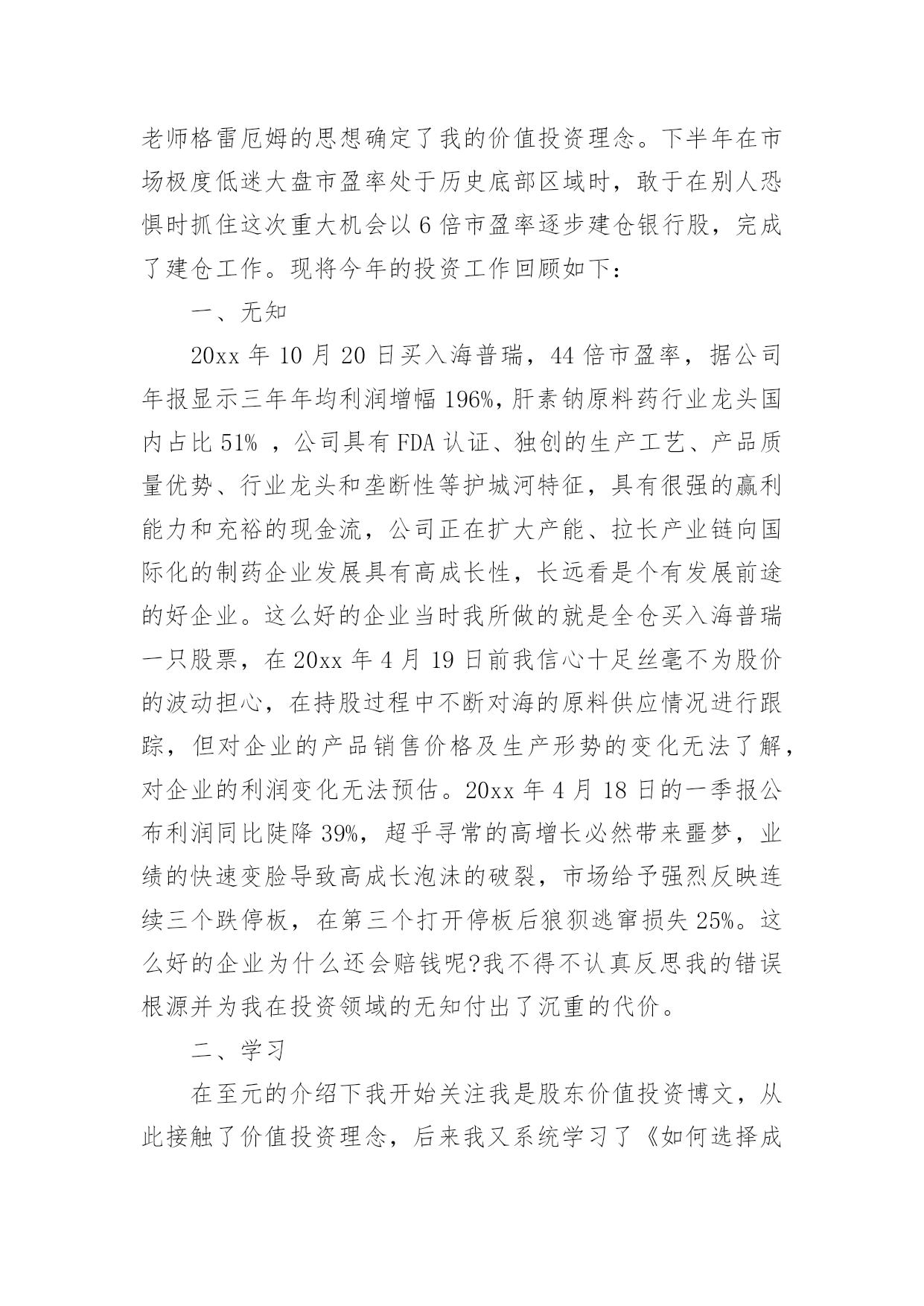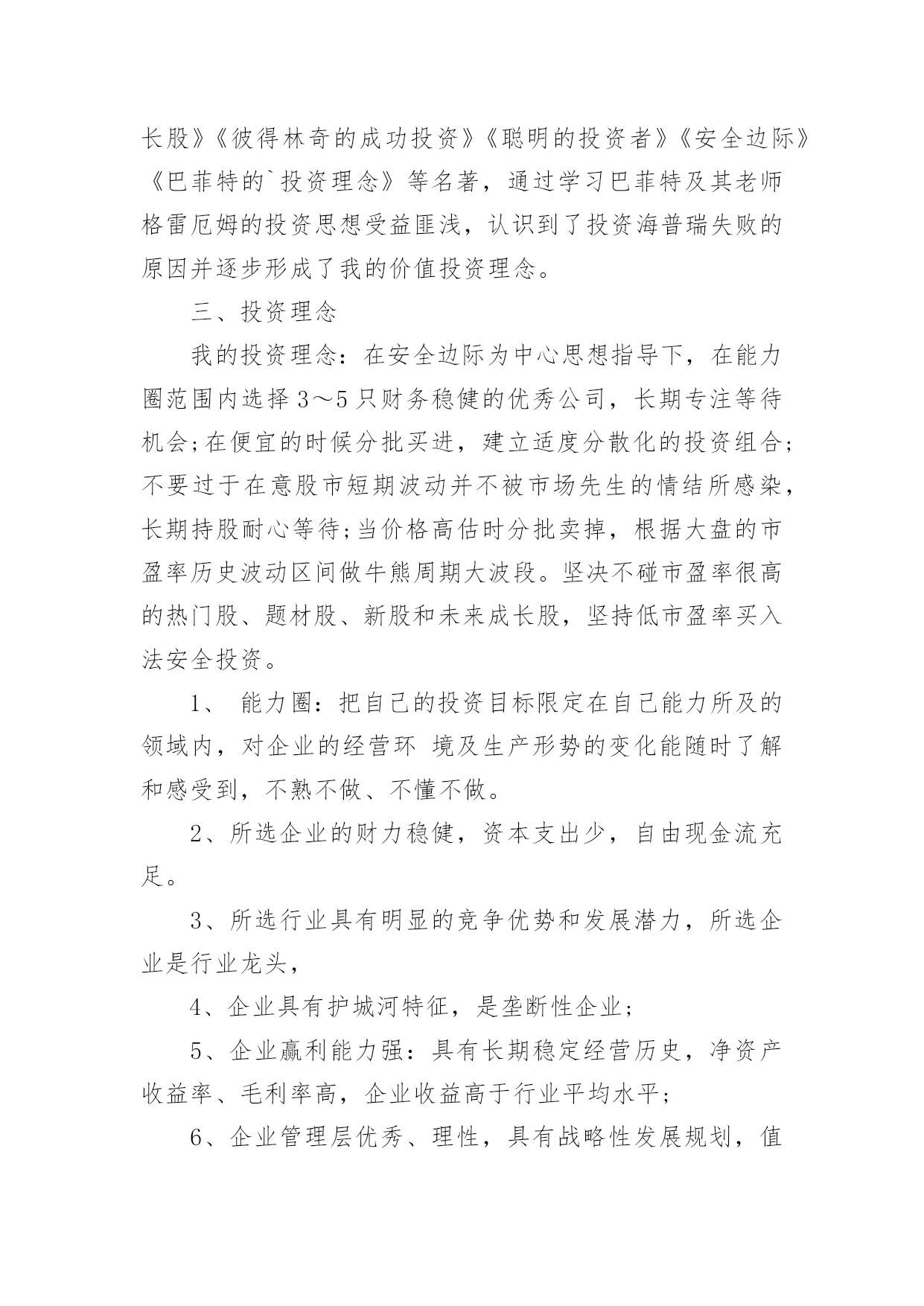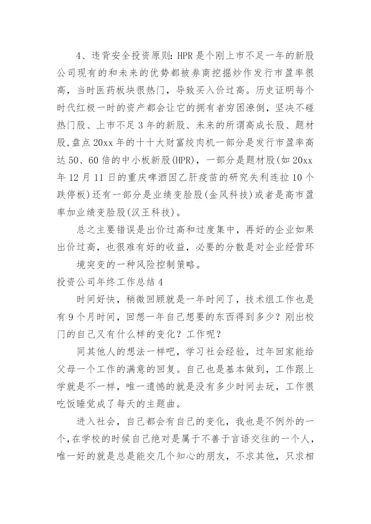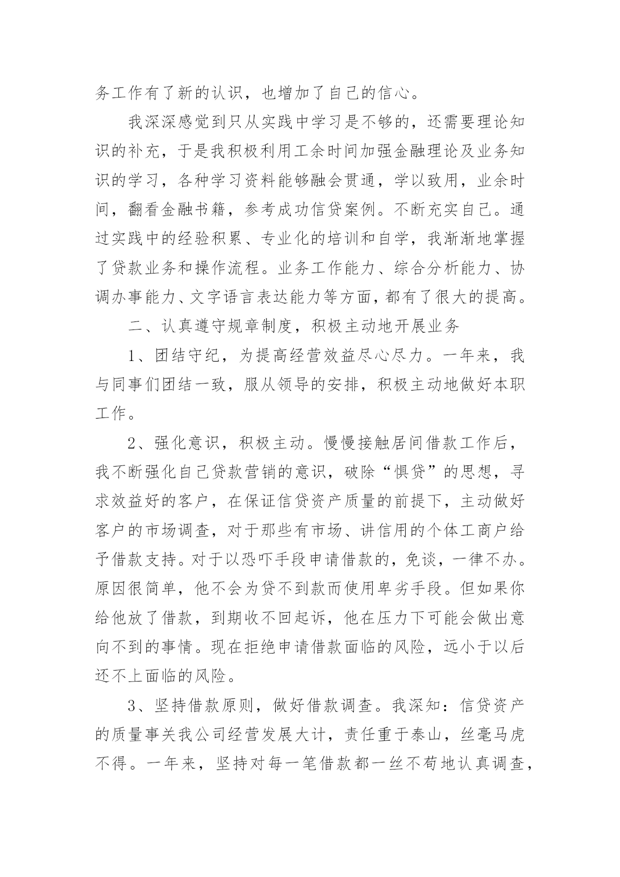 投资公司年终工作总结投资公司年终工作总结总结是对某一阶段的工作、学习或思想中的经验或情况进行分析研究的书面材料,它能够使头脑更加清醒,目标更加明确,为此我们要做好回顾,写好总结。总结怎么写才是正确的呢?下面是小编精心整理的投资公司年终工作总结,欢迎大家分享。投资公司年终工作总结1伴随着20xx年尾声的悄悄临近,我走上信贷员岗位一年多了,从刚开始对业务技能的不自信,到现在可以独自分析授信业务,真的是受益匪浅。回顾这一年的工作,在公司领导的关心及全体同事的帮助下,我认真学习业务知识和技能,积极主动地履行工作职责,及时总结工作中的不足,努力提高业务素质,较好地完成了个人的工作任务,在思想觉悟、业务素质、操作技能、优质服务方面都有了一定的提高。现将这一年的经历总结如下:一、人无论从事什么职业,都需要不断学习面对信贷员这个岗位,开始我还有些不自信。实地了解客户的基本情况、经营信息,调查掌握客户的居间借款用途、还款意愿,分析客户的还款能力等等,这些对于我来说,有很大难度。通过和领导沟通及自己思考总结。让我对放款业务工作有了新的认识,也增加了自己的信心。我深深感觉到只从实践中学习是不够的,还需要理论知识的补充,于是我积极利用工余时间加强金融理论及业务知识的学习,各种学习资料能够融会贯通,学以致用,业余时间,翻看金融书籍,参考成功信贷案例。不断充实自己。通过实践中的经验积累、专业化的培训和自学,我渐渐地掌握了贷款业务和操作流程。业务工作能力、综合分析能力、协调办事能力、文字语言表达能力等方面,都有了很大的提高。二、认真遵守规章制度,积极主动地开展业务1、团结守纪,为提高经营效益尽心尽力。一年来,我与同事们团结一致,服从领导的安排,积极主动地做好本职工作。2、强化意识,积极主动。慢慢接触居间借款工作后,我不断强化自己贷款营销的意识,破除“惧贷”的思想,寻求效益好的客户,在保证信贷资产质量的前提下,主动做好客户的市场调查,对于那些有市场、讲信用的个体工商户给予借款支持。对于以恐吓手段申请借款的,免谈,一律不办。原因很简单,他不会为贷不到款而使用卑劣手段。但如果你给他放了借款,到期收不回起诉,他在压力下可能会做出意向不到的事情。现在拒绝申请借款面临的风险,远小于以后还不上面临的风险。3、坚持借款原则,做好借款调查。我深知:信贷资产的质量事关我公司经营发展大计,责任重于泰山,丝毫马虎不得。一年来,坚持对每一笔借款都一丝不苟地认真调查,从借款人的主体资格、信用情况、生产经营项目的现状与前景、还款能力,到保证人的'资格、保证能力,抵、质押物的合法有效性。从库存的检查、往来账目的核对到房屋和设备的实地考察;从资产负债情况的计算、产销量和利润的分析到经营项目现金净流量的研究、借款风险度的测定,直至提出放与不放的理由,每一个环节我都是仔细调查,没有一丝一毫的懈怠。在放款前调查时,我做到了“三个必须”,即借款条件必须符合政策、借款证件必须是合法原件、借款人与保证人必须到场核实签字,并且做到生人熟人一样对待,保证了借款发放的合规、合法。4、强化管理,努力清收。做好前期催收到期借款,及时协助回收部工作,确保我公司到期借款的及时收回。三、不足之处一年的工作已渐渐落下帷幕,一些成绩的取得,离不开公司领导的大力支持。本人深知,自己仍有许多不足之处,通过一年的磨砺与锻炼,自己学会了很多知识以及做人的道理。在新的一年里,我将努力克服自身的不足,认真学习,努力提高自身素质,积极开拓,履行工作职责,服从领导。当好参谋助手,与全体职工一起,团结一致,为我公司经营效益的提高,为完成将来一年的各项目标任务作出自己应有的贡献。投资公司年终工作总结2时间一晃而过,弹指之间,一年的时间已接近尾声,过去的一年在领导和同事们的悉心关怀和指导下,通过和同事的不懈努力,在工作上取得了一定的成果,但也存在了诸多不足。回顾过去的一年,现将工作总结如下:一、能够积极参与到公司的投资理财推广中去公司门店所有的员工都非常的积极。但是关于这个方面由于门店的开张,我们门店的客户群体大多来源于亲戚和朋友,这对公司长远发展并不是很理想的,我个人认为我们应该面向大众的客户,因为亲戚朋友毕竟是有限的,其实这一年我的`下家发展并没有自己的朋友,这也是我做得很差的一方面,并没有用心去维护这个客户群体。各方面的原因吧,其实工作没有借口,做得不好就是做得不好,在来年的工作中我自己调整和改正。二、改良管理模式以及提成方式在门店里大家配合的其实都不错,而且处得也很好,要知道一个好的团队必须齐心合力,相互协作,相互帮助。且做到公平,公开,公正。当然也需要有人起带头作用,效果更好。提成方式这块,坦率说,公司对员工的提成也是相当不错的,但是在竞争力巨大的现实社会,提成也实实在在的成为原动力,又要考虑团队协作,也要考虑一分耕耘,一分收获
