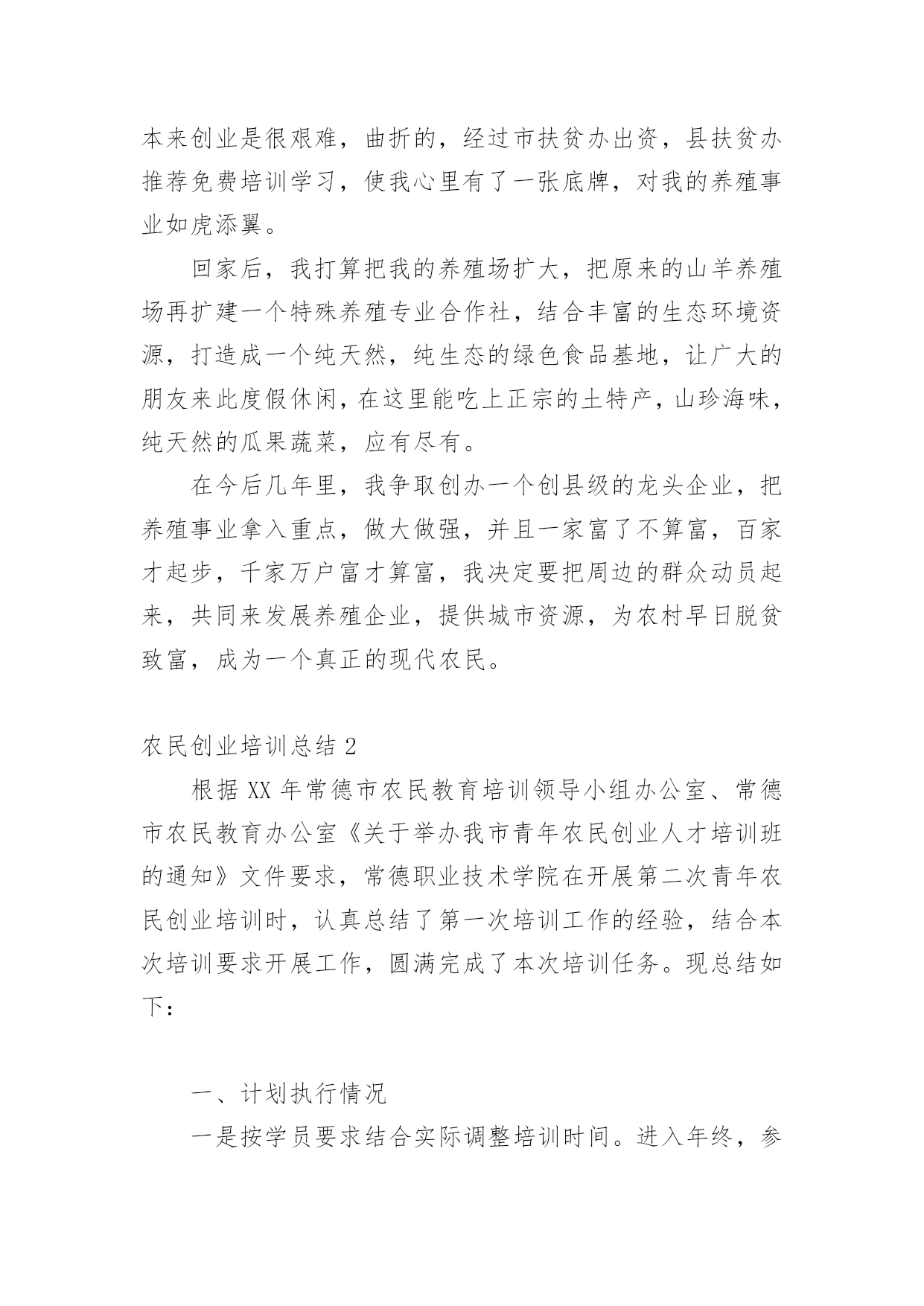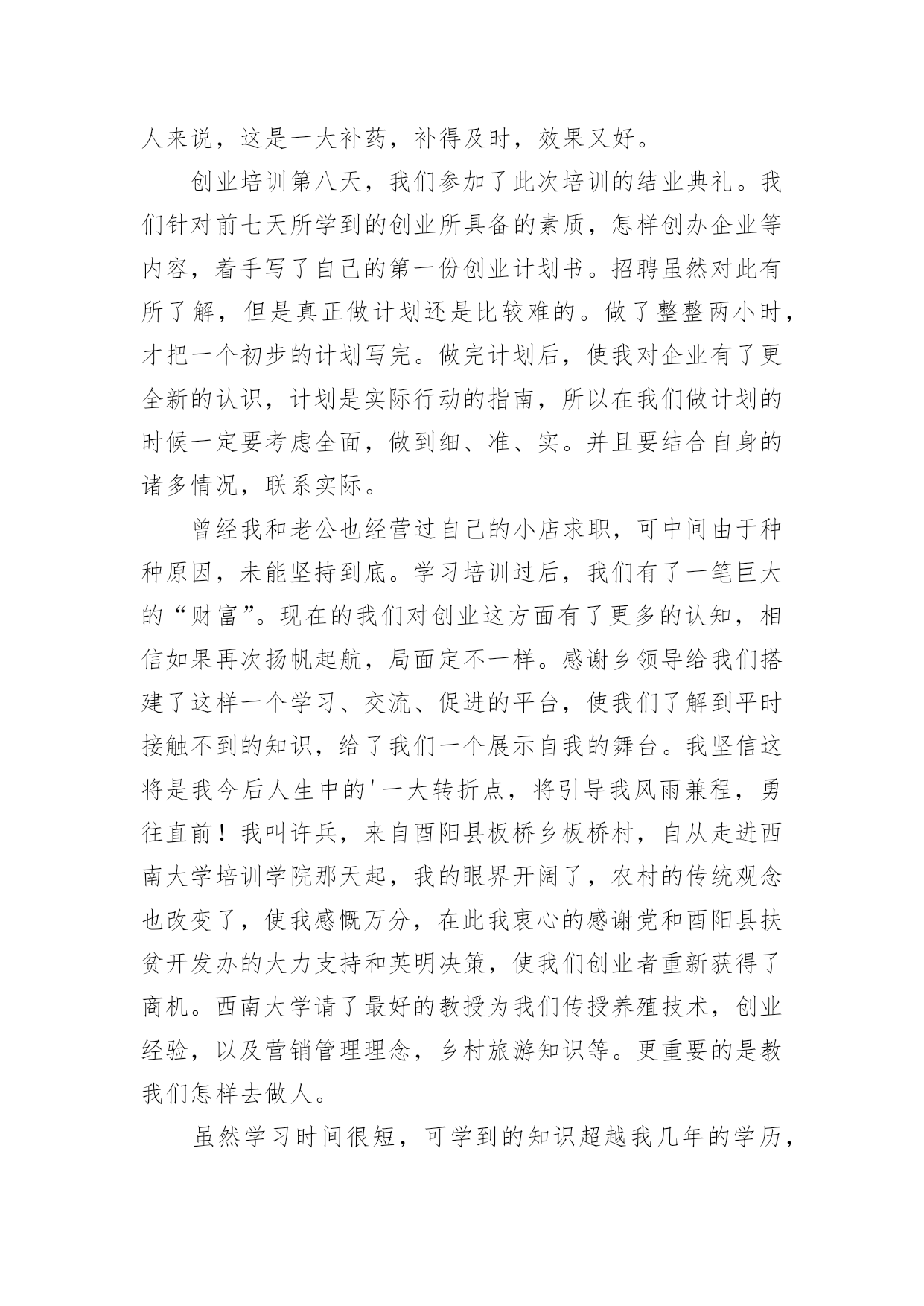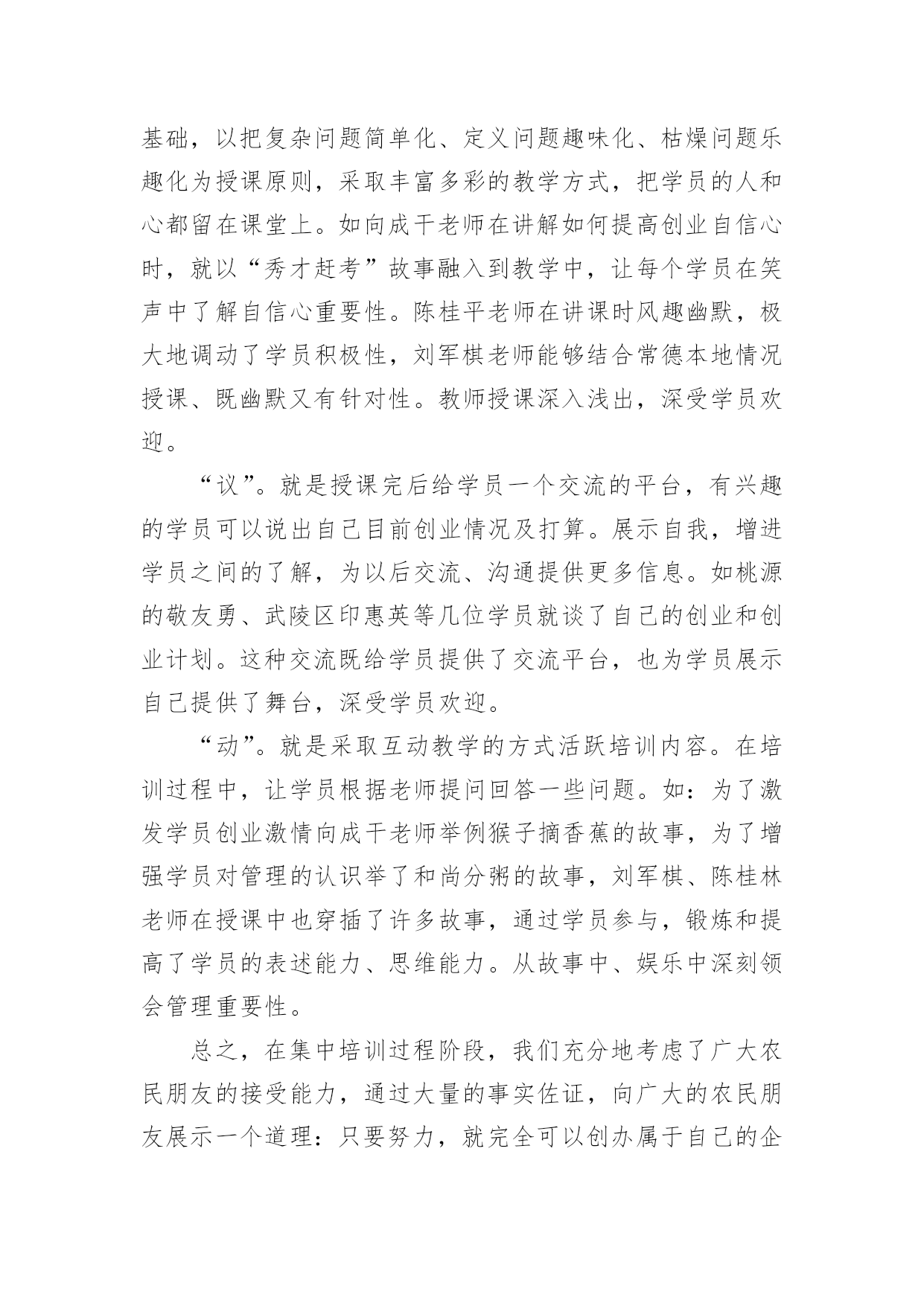 农民创业培训总结总结是指对某一阶段的工作、学习或思想中的经验或情况进行分析研究,做出带有规律性结论的书面材料,它可以提升我们发现问题的能力,让我们抽出时间写写总结吧。但是却发现不知道该写些什么,以下是小编为大家整理的农民创业培训总结,希望对大家有所帮助。农民创业培训总结120xx年7月,一股股创业热潮相继开始,我们村也不例外。在昭潭乡社会事务办的组织与号召下,我们参加了一连串的创业知识培训讲座。由于现工作原因,我没能天天当场,但我老公却坚持不懈积极参加。每当他听完讲课回来,就立马同我一起分享他的感受和心得。他说:“近几天的创业培训班学习,使我对创业有了更多理性的认识,使我学到了很多创业准备的知识,使我对创业更有激情。听完课后我感觉自己的神经思维活跃了,看待现今如何创业,创业中的一些难题都有了初步的领悟与认识。现场和老师模拟应聘,对我今后参加工作也是一种磨练和挑战。参加完这次创业培训,我的性格也发生了些许变化,以前,碰到这样的场面,我大多比较怯场,从不多言。但此次,我却非常开朗大方,积极发言。我想正因是这样的课对我而言是正中下怀吧……”听他一席话,我感觉他骨子里的血液都沸腾了,这几堂课确实令他受益匪浅,而我也倍感欣慰。对于目前一个失业在家的人来说,这是一大补药,补得及时,效果又好。创业培训第八天,我们参加了此次培训的结业典礼。我们针对前七天所学到的创业所具备的素质,怎样创办企业等内容,着手写了自己的第一份创业计划书。招聘虽然对此有所了解,但是真正做计划还是比较难的。做了整整两小时,才把一个初步的计划写完。做完计划后,使我对企业有了更全新的认识,计划是实际行动的指南,所以在我们做计划的时候一定要考虑全面,做到细、准、实。并且要结合自身的诸多情况,联系实际。曾经我和老公也经营过自己的小店求职,可中间由于种种原因,未能坚持到底。学习培训过后,我们有了一笔巨大的“财富”。现在的我们对创业这方面有了更多的认知,相信如果再次扬帆起航,局面定不一样。感谢乡领导给我们搭建了这样一个学习、交流、促进的平台,使我们了解到平时接触不到的知识,给了我们一个展示自我的舞台。我坚信这将是我今后人生中的'一大转折点,将引导我风雨兼程,勇往直前!我叫许兵,来自酉阳县板桥乡板桥村,自从走进西南大学培训学院那天起,我的眼界开阔了,农村的传统观念也改变了,使我感慨万分,在此我衷心的感谢党和酉阳县扶贫开发办的大力支持和英明决策,使我们创业者重新获得了商机。西南大学请了最好的教授为我们传授养殖技术,创业经验,以及营销管理理念,乡村旅游知识等。更重要的是教我们怎样去做人。虽然学习时间很短,可学到的知识超越我几年的学历,本来创业是很艰难,曲折的,经过市扶贫办出资,县扶贫办推荐免费培训学习,使我心里有了一张底牌,对我的养殖事业如虎添翼。回家后,我打算把我的养殖场扩大,把原来的山羊养殖场再扩建一个特殊养殖专业合作社,结合丰富的生态环境资源,打造成一个纯天然,纯生态的绿色食品基地,让广大的朋友来此度假休闲,在这里能吃上正宗的土特产,山珍海味,纯天然的瓜果蔬菜,应有尽有。在今后几年里,我争取创办一个创县级的龙头企业,把养殖事业拿入重点,做大做强,并且一家富了不算富,百家才起步,千家万户富才算富,我决定要把周边的群众动员起来,共同来发展养殖企业,提供城市资源,为农村早日脱贫致富,成为一个真正的现代农民。农民创业培训总结2根据XX年常德市农民教育培训领导小组办公室、常德市农民教育办公室《关于举办我市青年农民创业人才培训班的通知》文件要求,常德职业技术学院在开展第二次青年农民创业培训时,认真总结了第一次培训工作的经验,结合本次培训要求开展工作,圆满完成了本次培训任务。现总结如下:一、计划执行情况一是按学员要求结合实际调整培训时间。进入年终,参加培训学员工作繁忙,根据学员要求和实际情况,本次采取白天与晚上授课相结合方式。既保证学员授课时间,又没有因临时学习计划的改变而影响授课质量和效果。二是适度调整授课内容,提高学员学习热情,满足学员需求。本次培训授课内容是由农办根据国家农民创业培训内容确定的。在授课时,授课教师根据学员要求和参训学员结构,适度调整了授课内容,使授课内容更加充实、更加具有针对性和实用性,受到学员普片欢迎。学员对授课教师给予了较高评价。二、创造性地开展培训工作1、编制详实的创业培训资料为了使培训工作达到预期目标,在第一次青年农民创业培训讲义基础上,授课老师结合国家有关农业、农村和农民问题的政策,考虑农民的实际情况和学习兴趣,重新编写了《常德市青年农民创业人才培训资料》,内容更加充实、更加完整、更加实用。该资料在实际使用中,受到了参训学员的高度评价,为培训工作的顺利完成,起到了积极的作用。2、科学设置培训内容,激发学员的学习热情让农民从炕头、地头迈进桌头,是一个难题,让他们