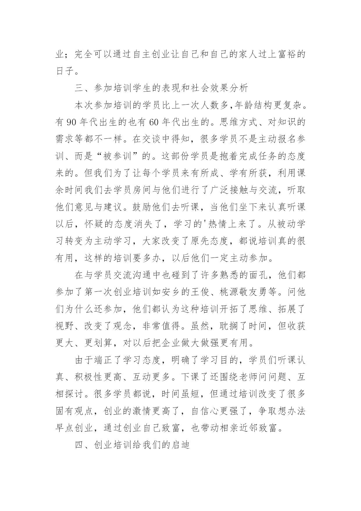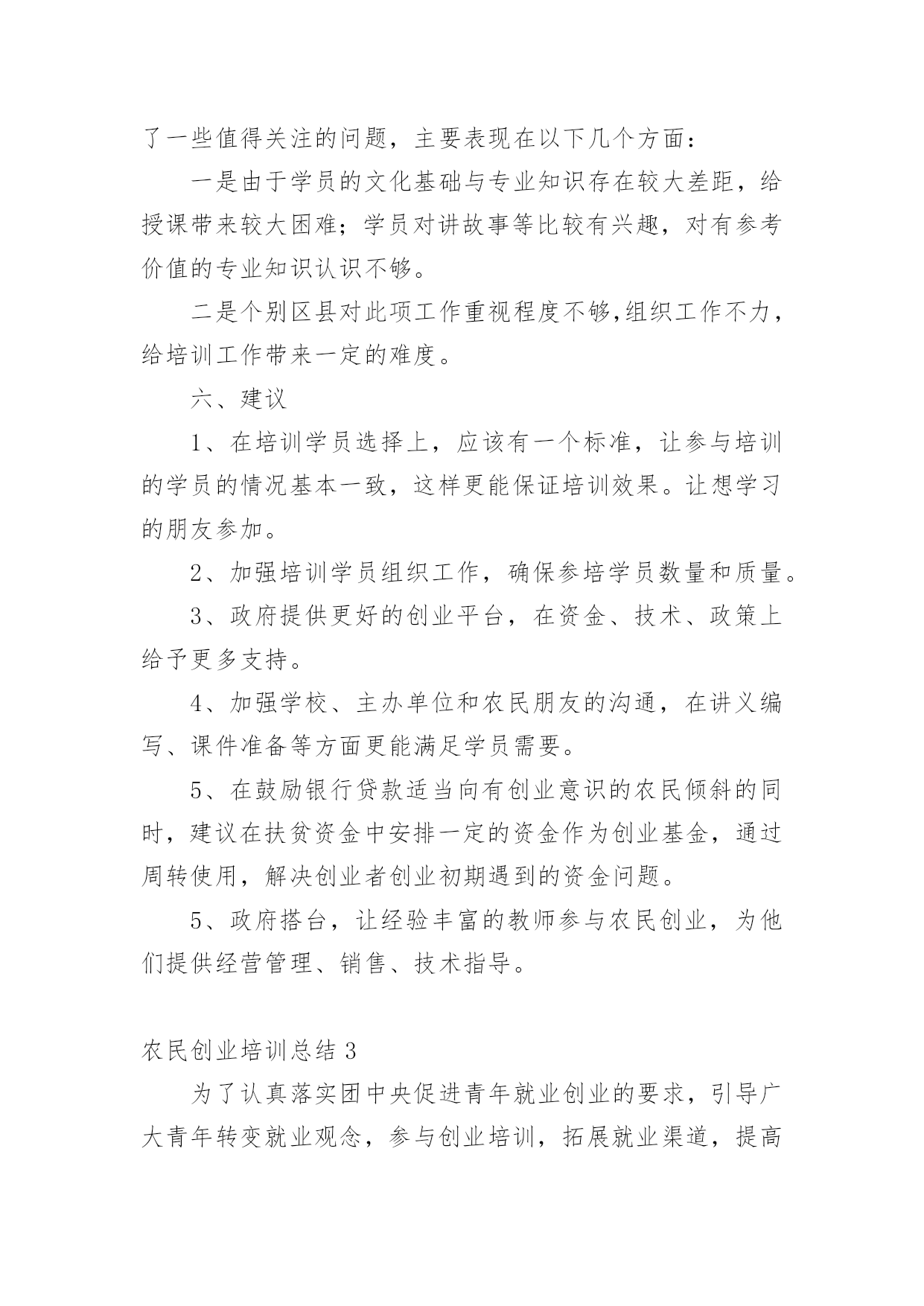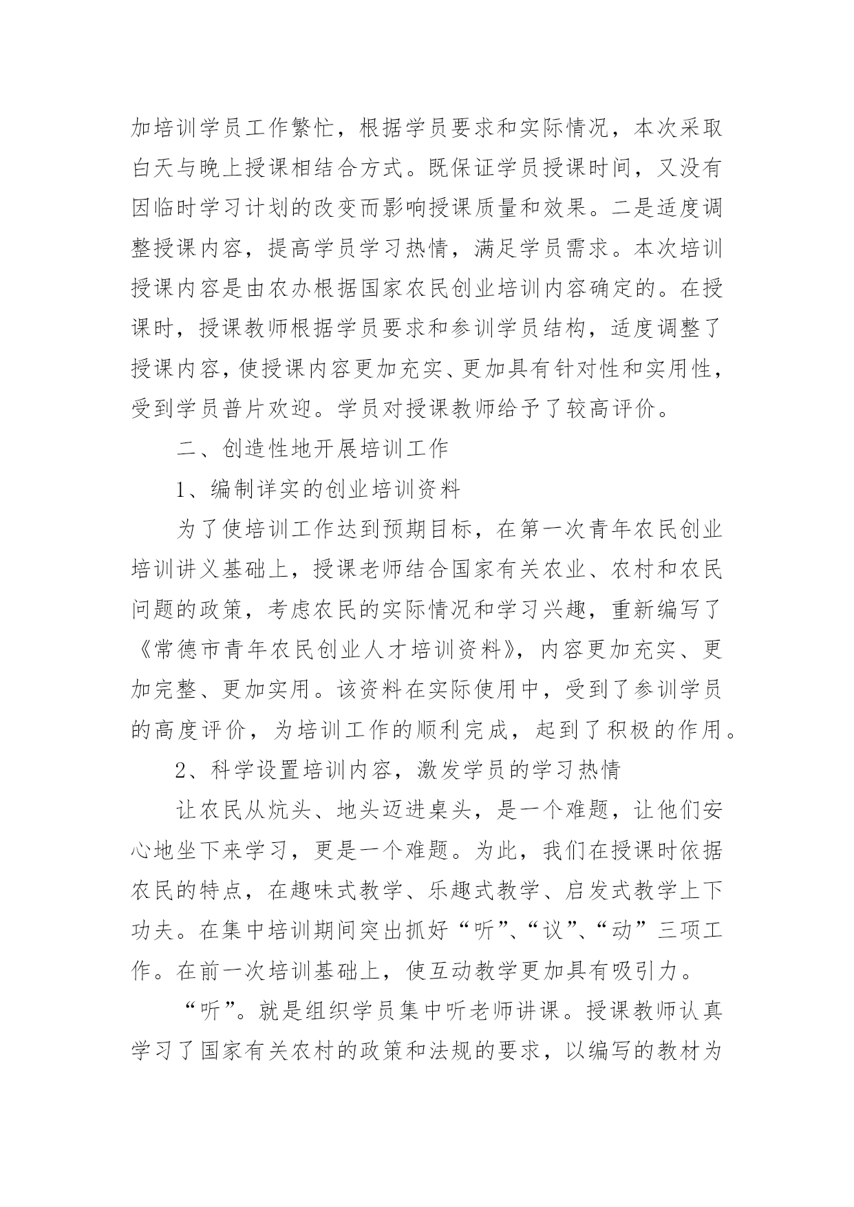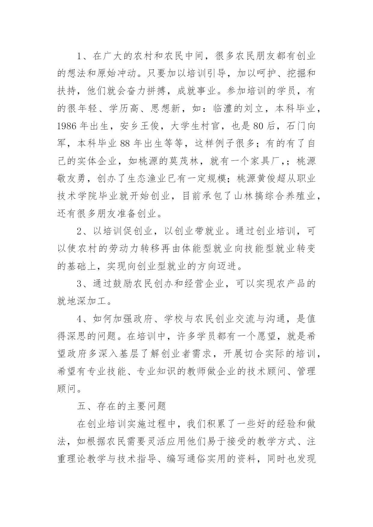 农民创业培训总结总结是指对某一阶段的工作、学习或思想中的经验或情况进行分析研究,做出带有规律性结论的书面材料,它可以提升我们发现问题的能力,让我们抽出时间写写总结吧。但是却发现不知道该写些什么,以下是小编为大家整理的农民创业培训总结,希望对大家有所帮助。农民创业培训总结120xx年7月,一股股创业热潮相继开始,我们村也不例外。在昭潭乡社会事务办的组织与号召下,我们参加了一连串的创业知识培训讲座。由于现工作原因,我没能天天当场,但我老公却坚持不懈积极参加。每当他听完讲课回来,就立马同我一起分享他的感受和心得。他说:“近几天的创业培训班学习,使我对创业有了更多理性的认识,使我学到了很多创业准备的知识,使我对创业更有激情。听完课后我感觉自己的神经思维活跃了,看待现今如何创业,创业中的一些难题都有了初步的领悟与认识。现场和老师模拟应聘,对我今后参加工作也是一种磨练和挑战。参加完这次创业培训,我的性格也发生了些许变化,以前,碰到这样的场面,我大多比较怯场,从不多言。但此次,我却非常开朗大方,积极发言。我想正因是这样的课对我而言是正中下怀吧……”听他一席话,我感觉他骨子里的血液都沸腾了,这几堂课确实令他受益匪浅,而我也倍感欣慰。对于目前一个失业在家的人来说,这是一大补药,补得及时,效果又好。创业培训第八天,我们参加了此次培训的结业典礼。我们针对前七天所学到的创业所具备的素质,怎样创办企业等内容,着手写了自己的第一份创业计划书。招聘虽然对此有所了解,但是真正做计划还是比较难的。做了整整两小时,才把一个初步的计划写完。做完计划后,使我对企业有了更全新的认识,计划是实际行动的指南,所以在我们做计划的时候一定要考虑全面,做到细、准、实。并且要结合自身的诸多情况,联系实际。曾经我和老公也经营过自己的小店求职,可中间由于种种原因,未能坚持到底。学习培训过后,我们有了一笔巨大的“财富”。现在的我们对创业这方面有了更多的认知,相信如果再次扬帆起航,局面定不一样。感谢乡领导给我们搭建了这样一个学习、交流、促进的平台,使我们了解到平时接触不到的知识,给了我们一个展示自我的舞台。我坚信这将是我今后人生中的'一大转折点,将引导我风雨兼程,勇往直前!我叫许兵,来自酉阳县板桥乡板桥村,自从走进西南大学培训学院那天起,我的眼界开阔了,农村的传统观念也改变了,使我感慨万分,在此我衷心的感谢党和酉阳县扶贫开发办的大力支持和英明决策,使我们创业者重新获得了商机。西南大学请了最好的教授为我们传授养殖技术,创业经验,以及营销管理理念,乡村旅游知识等。更重要的是教我们怎样去做人。虽然学习时间很短,可学到的知识超越我几年的学历,本来创业是很艰难,曲折的,经过市扶贫办出资,县扶贫办推荐免费培训学习,使我心里有了一张底牌,对我的养殖事业如虎添翼。回家后,我打算把我的养殖场扩大,把原来的山羊养殖场再扩建一个特殊养殖专业合作社,结合丰富的生态环境资源,打造成一个纯天然,纯生态的绿色食品基地,让广大的朋友来此度假休闲,在这里能吃上正宗的土特产,山珍海味,纯天然的瓜果蔬菜,应有尽有。在今后几年里,我争取创办一个创县级的龙头企业,把养殖事业拿入重点,做大做强,并且一家富了不算富,百家才起步,千家万户富才算富,我决定要把周边的群众动员起来,共同来发展养殖企业,提供城市资源,为农村早日脱贫致富,成为一个真正的现代农民。农民创业培训总结2根据XX年常德市农民教育培训领导小组办公室、常德市农民教育办公室《关于举办我市青年农民创业人才培训班的通知》文件要求,常德职业技术学院在开展第二次青年农民创业培训时,认真总结了第一次培训工作的经验,结合本次培训要求开展工作,圆满完成了本次培训任务。现总结如下:一、计划执行情况一是按学员要求结合实际调整培训时间。进入年终,参加培训学员工作繁忙,根据学员要求和实际情况,本次采取白天与晚上授课相结合方式。既保证学员授课时间,又没有因临时学习计划的改变而影响授课质量和效果。二是适度调整授课内容,提高学员学习热情,满足学员需求。本次培训授课内容是由农办根据国家农民创业培训内容确定的。在授课时,授课教师根据学员要求和参训学员结构,适度调整了授课内容,使授课内容更加充实、更加具有针对性和实用性,受到学员普片欢迎。学员对授课教师给予了较高评价。二、创造性地开展培训工作1、编制详实的创业培训资料为了使培训工作达到预期目标,在第一次青年农民创业培训讲义基础上,授课老师结合国家有关农业、农村和农民问题的政策,考虑农民的实际情况和学习兴趣,重新编写了《常德市青年农民创业人才培训资料》,内容更加充实、更加完整、更加实用。该资料在实际使用中,受到了参训学员的高度评价,为培训工作的顺利完成,起到了积极的作用。2、科学设置培训内容,激发学员的学习热情让农民从炕头、地头迈进桌头,是一个难题,让他们
