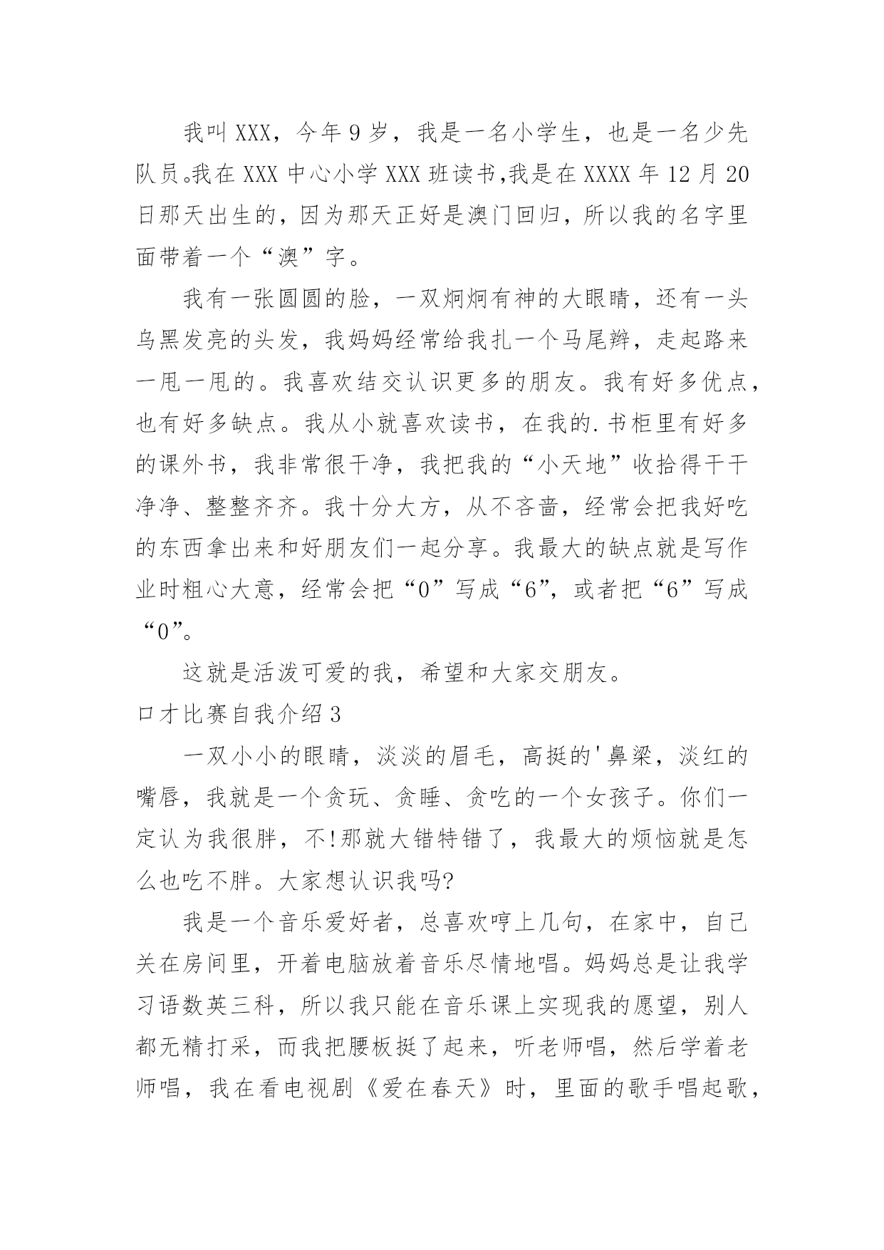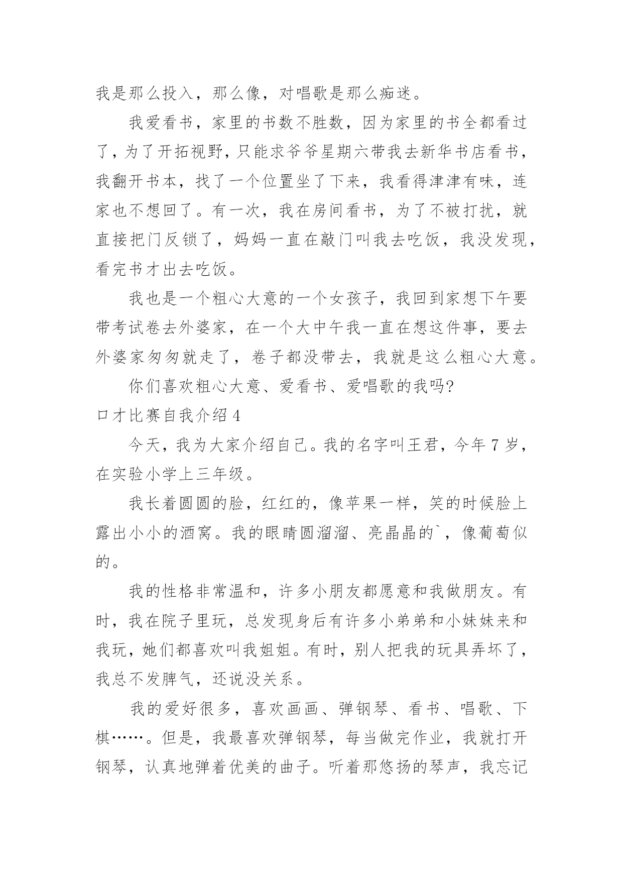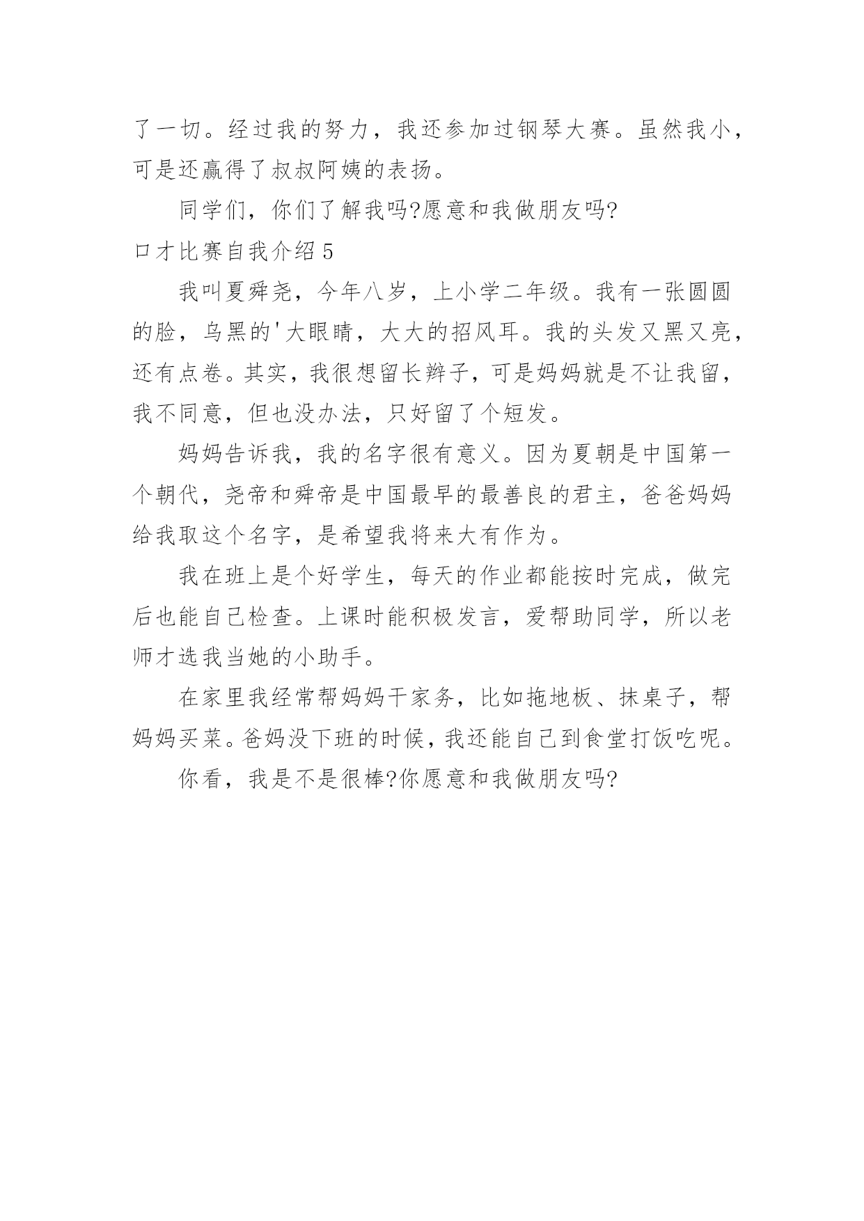 口才比赛自我介绍口才比赛自我介绍当去到一个新环境下,我们难以避免地要作出自我介绍,自我介绍是一展示自己的手段。千万不能认为自我介绍随便应付就可以,下面是小编收集整理的口才比赛自我介绍,希望能够帮助到大家。口才比赛自我介绍1我叫刘澳琪,今年9岁,我是一名小学生,也是一名少先队员。我在松木坪中心小学三(1)班读书,我是在1999年12月20日那天出生的,因为那天正好是澳门回归,所以我的名字里面带着一个“澳”字。我有一张圆圆的脸,一双炯炯有神的'大眼睛,还有一头乌黑发亮的头发,我妈妈经常给我扎一个马尾辫,走起路来一甩一甩的。我喜欢结交认识更多的朋友。我有好多优点,也有好多缺点。我从小就喜欢读书,在我的书柜里有好多的课外书,我非常很干净,我把我的“小天地”收拾得干干净净、整整齐齐。我十分大方,从不吝啬,经常会把我好吃的东西拿出来和好朋友们一起分享。我最大的缺点就是写作业时粗心大意,经常会把“0”写成“6”,或者把“6”写成“0”。这就是活泼可爱的我,希望和大家交朋友。口才比赛自我介绍2我叫XXX,今年9岁,我是一名小学生,也是一名少先队员。我在XXX中心小学XXX班读书,我是在XXXX年12月20日那天出生的,因为那天正好是澳门回归,所以我的名字里面带着一个“澳”字。我有一张圆圆的脸,一双炯炯有神的大眼睛,还有一头乌黑发亮的头发,我妈妈经常给我扎一个马尾辫,走起路来一甩一甩的。我喜欢结交认识更多的朋友。我有好多优点,也有好多缺点。我从小就喜欢读书,在我的.书柜里有好多的课外书,我非常很干净,我把我的“小天地”收拾得干干净净、整整齐齐。我十分大方,从不吝啬,经常会把我好吃的东西拿出来和好朋友们一起分享。我最大的缺点就是写作业时粗心大意,经常会把“0”写成“6”,或者把“6”写成“0”。这就是活泼可爱的我,希望和大家交朋友。口才比赛自我介绍3一双小小的眼睛,淡淡的眉毛,高挺的'鼻梁,淡红的嘴唇,我就是一个贪玩、贪睡、贪吃的一个女孩子。你们一定认为我很胖,不!那就大错特错了,我最大的烦恼就是怎么也吃不胖。大家想认识我吗?我是一个音乐爱好者,总喜欢哼上几句,在家中,自己关在房间里,开着电脑放着音乐尽情地唱。妈妈总是让我学习语数英三科,所以我只能在音乐课上实现我的愿望,别人都无精打采,而我把腰板挺了起来,听老师唱,然后学着老师唱,我在看电视剧《爱在春天》时,里面的歌手唱起歌,我是那么投入,那么像,对唱歌是那么痴迷。我爱看书,家里的书数不胜数,因为家里的书全都看过了,为了开拓视野,只能求爷爷星期六带我去新华书店看书,我翻开书本,找了一个位置坐了下来,我看得津津有味,连家也不想回了。有一次,我在房间看书,为了不被打扰,就直接把门反锁了,妈妈一直在敲门叫我去吃饭,我没发现,看完书才出去吃饭。我也是一个粗心大意的一个女孩子,我回到家想下午要带考试卷去外婆家,在一个大中午我一直在想这件事,要去外婆家匆匆就走了,卷子都没带去,我就是这么粗心大意。你们喜欢粗心大意、爱看书、爱唱歌的我吗?口才比赛自我介绍4今天,我为大家介绍自己。我的名字叫王君,今年7岁,在实验小学上三年级。我长着圆圆的脸,红红的,像苹果一样,笑的时候脸上露出小小的酒窝。我的眼睛圆溜溜、亮晶晶的`,像葡萄似的。我的性格非常温和,许多小朋友都愿意和我做朋友。有时,我在院子里玩,总发现身后有许多小弟弟和小妹妹来和我玩,她们都喜欢叫我姐姐。有时,别人把我的玩具弄坏了,我总不发脾气,还说没关系。我的爱好很多,喜欢画画、弹钢琴、看书、唱歌、下棋……。但是,我最喜欢弹钢琴,每当做完作业,我就打开钢琴,认真地弹着优美的曲子。听着那悠扬的琴声,我忘记了一切。经过我的努力,我还参加过钢琴大赛。虽然我小,可是还赢得了叔叔阿姨的表扬。同学们,你们了解我吗?愿意和我做朋友吗?口才比赛自我介绍5我叫夏舜尧,今年八岁,上小学二年级。我有一张圆圆的脸,乌黑的'大眼睛,大大的招风耳。我的头发又黑又亮,还有点卷。其实,我很想留长辫子,可是妈妈就是不让我留,我不同意,但也没办法,只好留了个短发。妈妈告诉我,我的名字很有意义。因为夏朝是中国第一个朝代,尧帝和舜帝是中国最早的最善良的君主,爸爸妈妈给我取这个名字,是希望我将来大有作为。我在班上是个好学生,每天的作业都能按时完成,做完后也能自己检查。上课时能积极发言,爱帮助同学,所以老师才选我当她的小助手。在家里我经常帮妈妈干家务,比如拖地板、抹桌子,帮妈妈买菜。爸妈没下班的时候,我还能自己到食堂打饭吃呢。你看,我是不是很棒?你愿意和我做朋友吗?