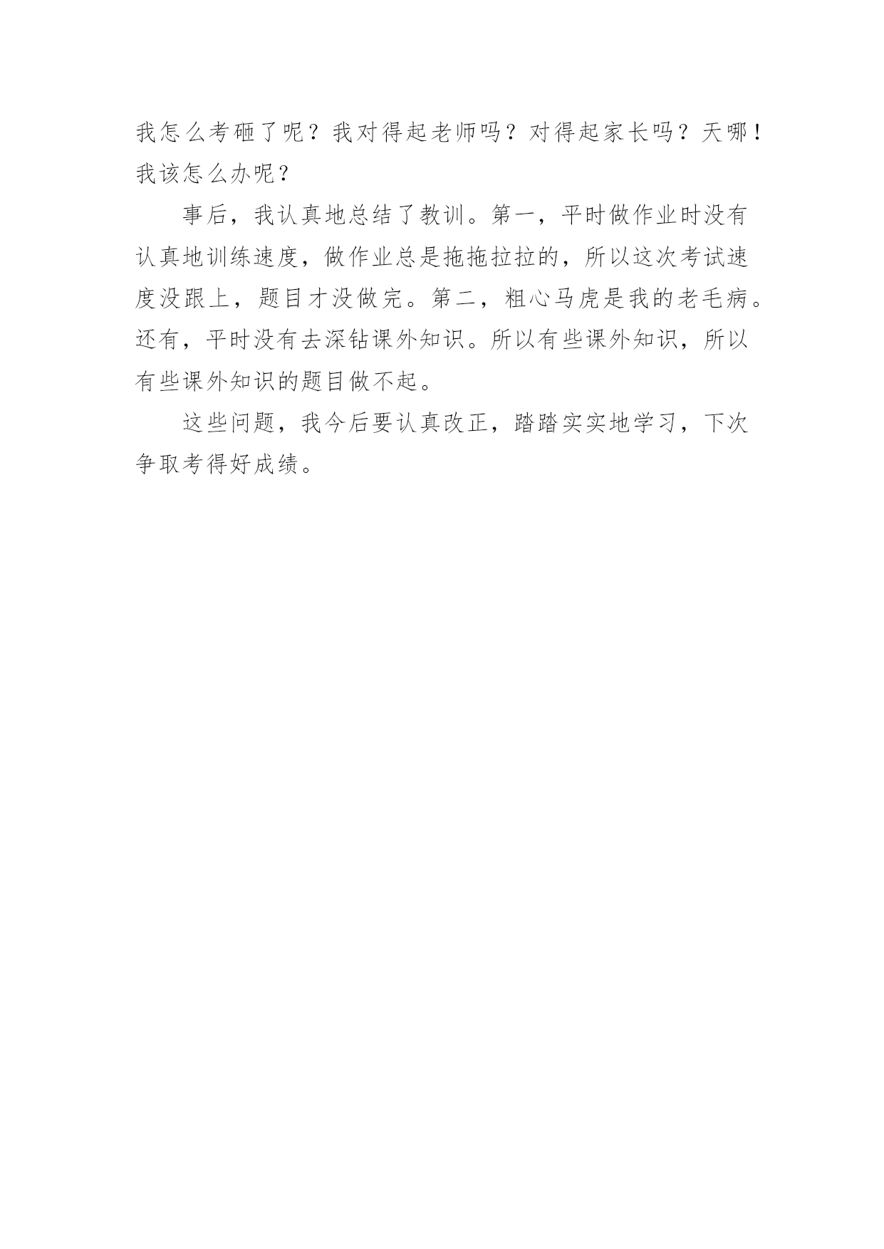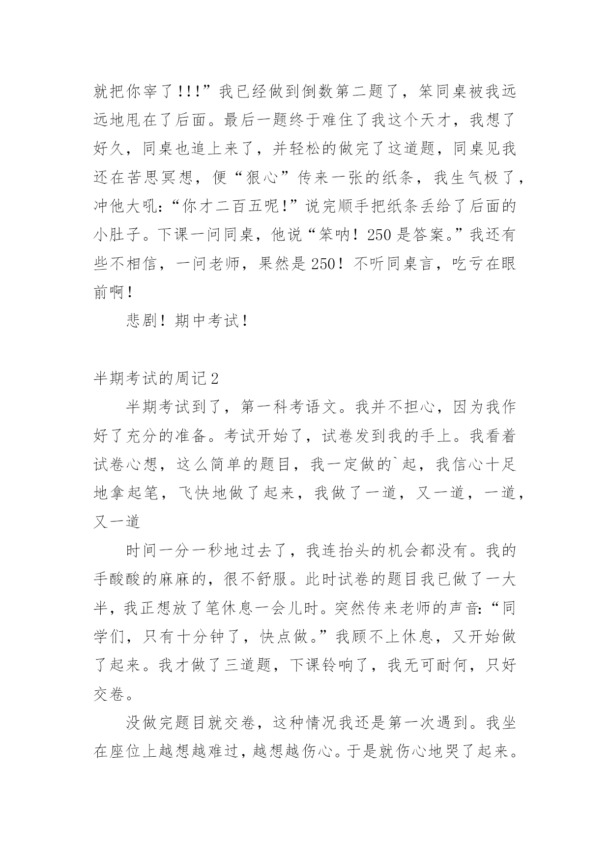 半期考试的周记考试是检验学生近期学习成绩的一种手段,更是对教师心理承受能力的一种挑战,也是督促教师进行教学反思提高教学质量的前提条件。下面小编带来的是半期考试的周记,希望对你有帮助。半期考试的周记1“铃——”上课铃随着同学们的尖叫打响了。有的同学趁现在赶紧复习,有的在悲催地嚎叫。先考的是语文。天,开头就遇到了不幸,嫌疑的“嫌”怎么写?!这个怎么改为述句?完了,悲剧鸟啊……~作文!天哪,你不是折磨俺吧?!这次的作文竟是《一件事情的启示》我左思右想,看来只能用上次老师让我们写的《吹砖头》来凑合凑合了……紧接着才是对我来说最悲剧的——英语!我看了看考卷,“饿啊……”我快晕掉了,算了,随便乱填得了……最讨厌英语了。呜呜呜呜~还没喘过气来,哎,又是数学考试了。不过总算让我轻松了点,因为数学是我最擅长的科目。前几题我轻轻松松就过啦,望着还在仔细琢磨题目的`笨同桌,心里有些飘飘然,便讽刺道:“哎,太简单了。”只见他埋头甩都不甩我,我心里暗暗地骂了几句:“哼,有什么,竟敢不理本恶魔!不想活了,要不是现在是考试的话,我早就把你宰了!!!”我已经做到倒数第二题了,笨同桌被我远远地甩在了后面。最后一题终于难住了我这个天才,我想了好久,同桌也追上来了,并轻松的做完了这道题,同桌见我还在苦思冥想,便“狠心”传来一张的纸条,我生气极了,冲他大吼:“你才二百五呢!”说完顺手把纸条丢给了后面的小肚子。下课一问同桌,他说“笨呐!250是答案。”我还有些不相信,一问老师,果然是250!不听同桌言,吃亏在眼前啊!悲剧!期中考试!半期考试的周记2半期考试到了,第一科考语文。我并不担心,因为我作好了充分的准备。考试开始了,试卷发到我的手上。我看着试卷心想,这么简单的题目,我一定做的`起,我信心十足地拿起笔,飞快地做了起来,我做了一道,又一道,一道,又一道时间一分一秒地过去了,我连抬头的机会都没有。我的手酸酸的麻麻的,很不舒服。此时试卷的题目我已做了一大半,我正想放了笔休息一会儿时。突然传来老师的声音:“同学们,只有十分钟了,快点做。”我顾不上休息,又开始做了起来。我才做了三道题,下课铃响了,我无可耐何,只好交卷。没做完题目就交卷,这种情况我还是第一次遇到。我坐在座位上越想越难过,越想越伤心。于是就伤心地哭了起来。我怎么考砸了呢?我对得起老师吗?对得起家长吗?天哪!我该怎么办呢?事后,我认真地总结了教训。第一,平时做作业时没有认真地训练速度,做作业总是拖拖拉拉的,所以这次考试速度没跟上,题目才没做完。第二,粗心马虎是我的老毛病。还有,平时没有去深钻课外知识。所以有些课外知识,所以有些课外知识的题目做不起。这些问题,我今后要认真改正,踏踏实实地学习,下次争取考得好成绩。